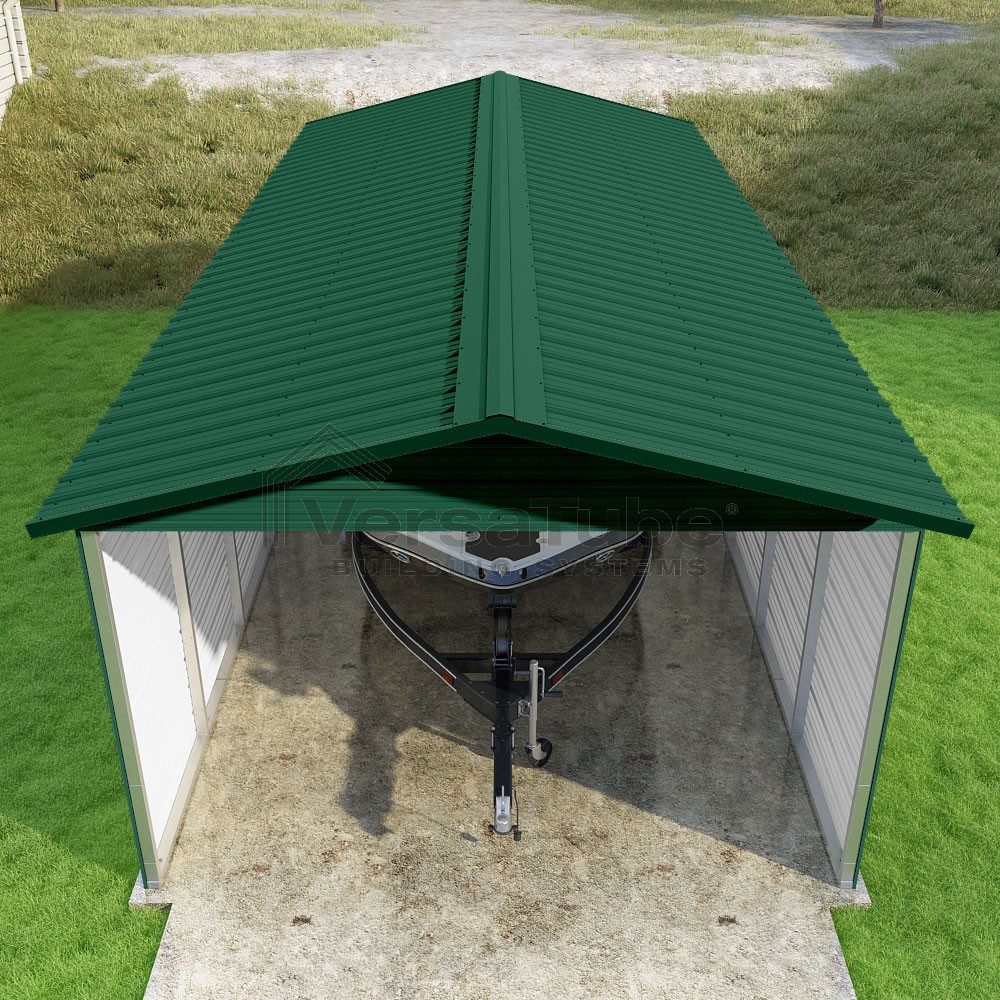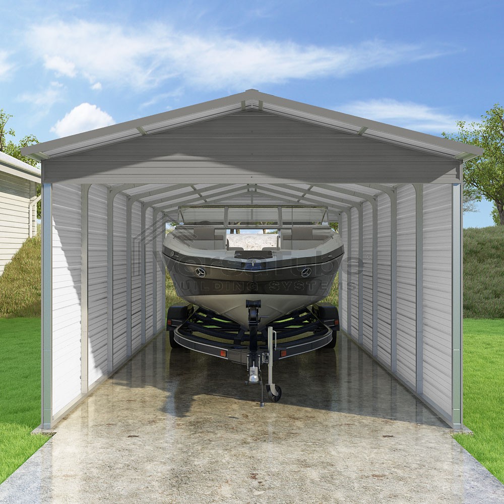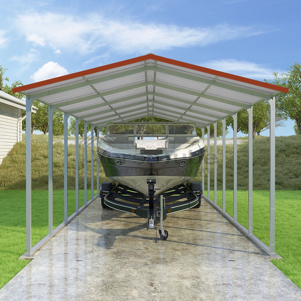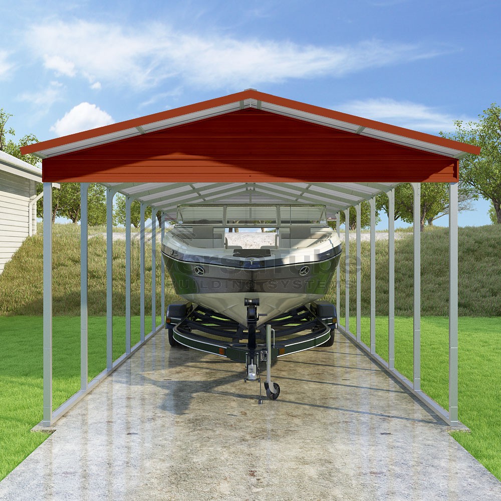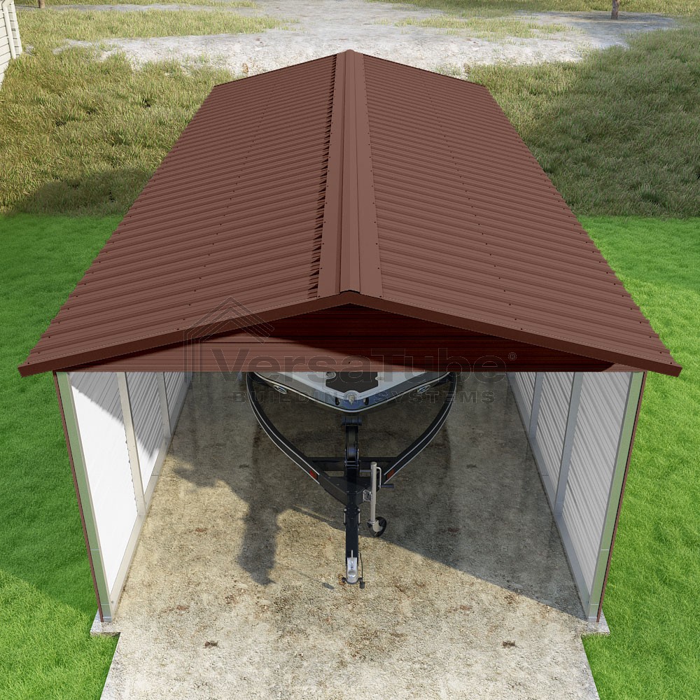 Pinnacle Series DIY carport kit features vertical sheet metal roof panels with ridge cap, gable and eave trim for an A-frame roof style and extended coverage on both ends.