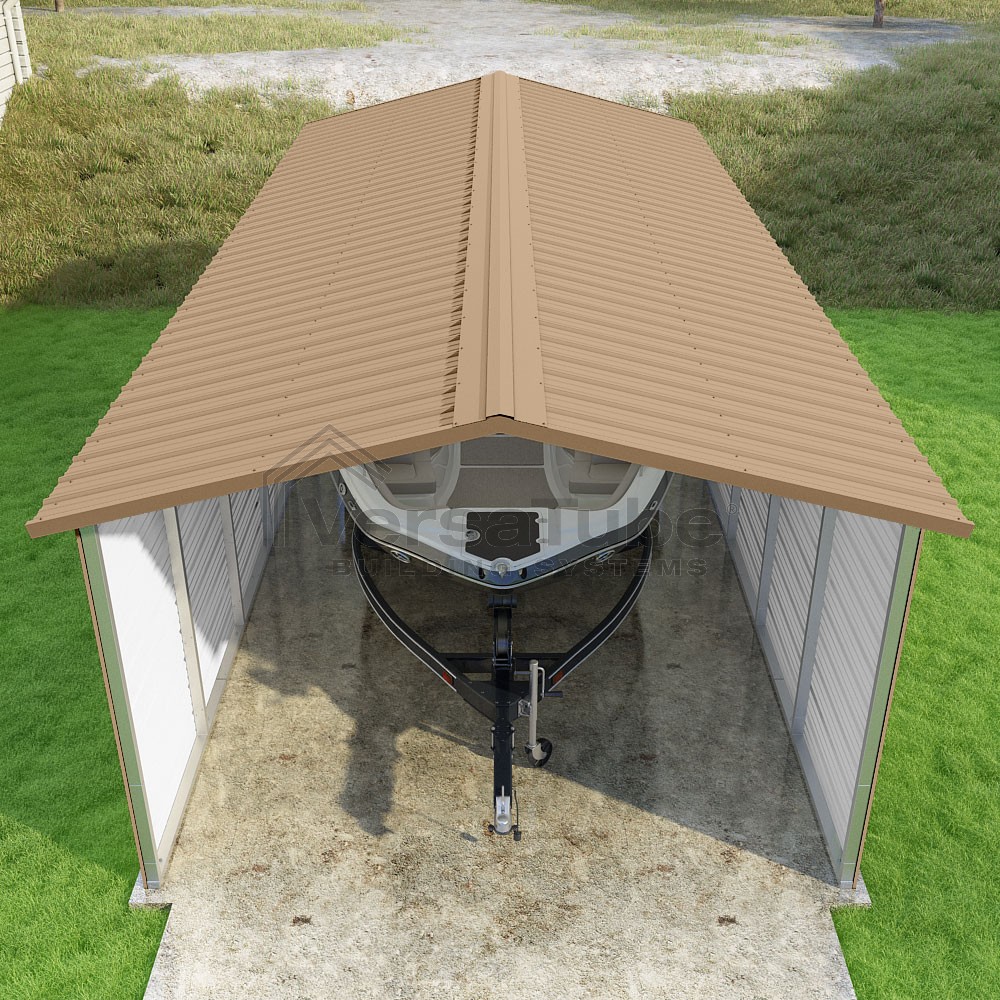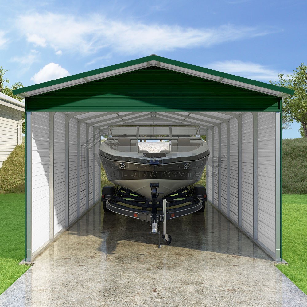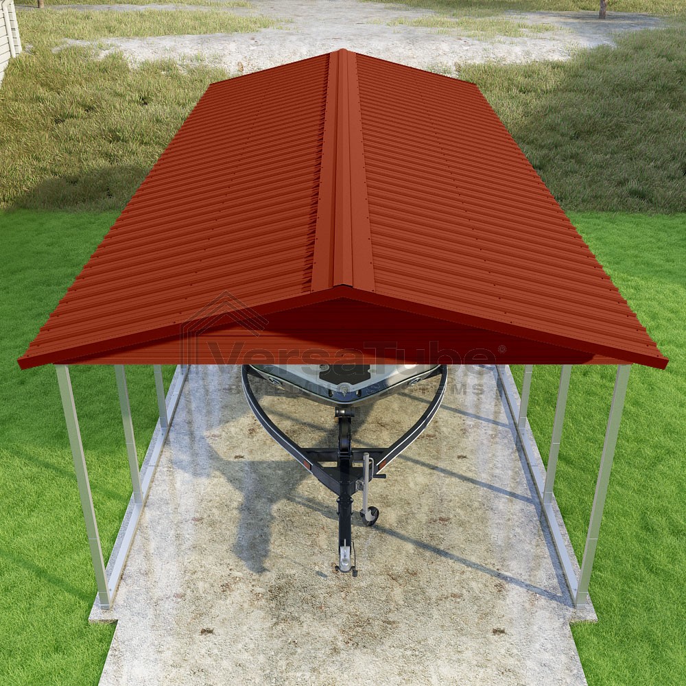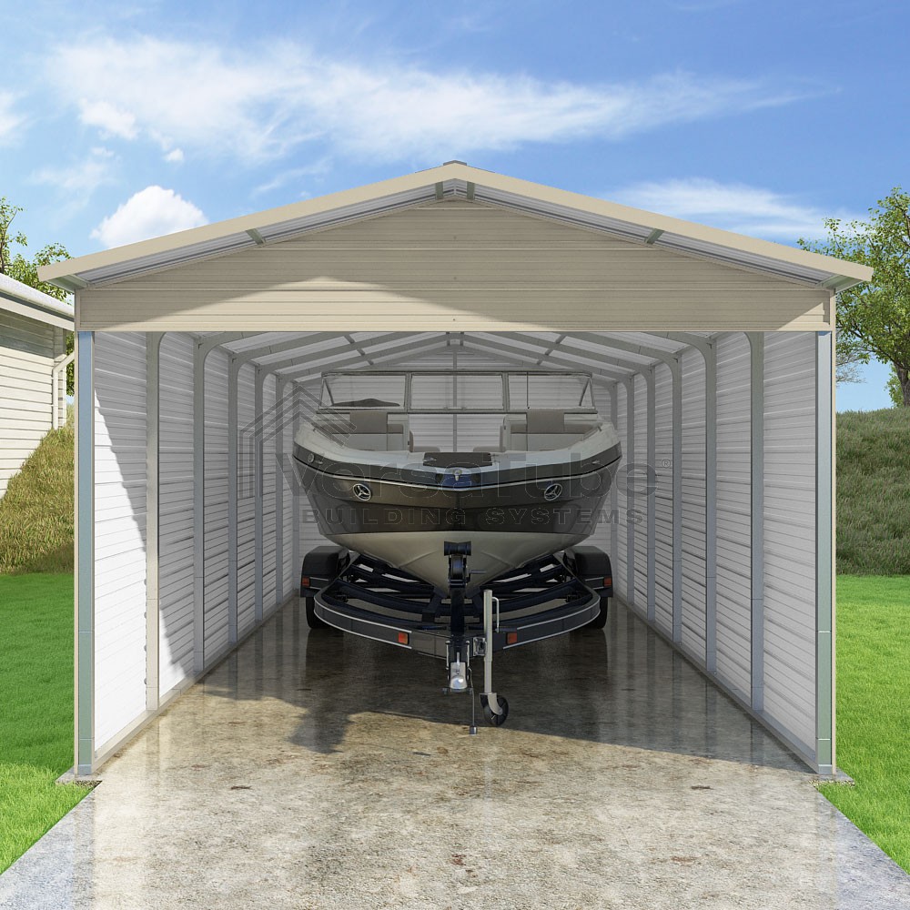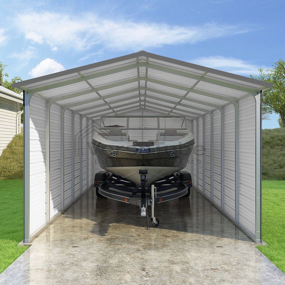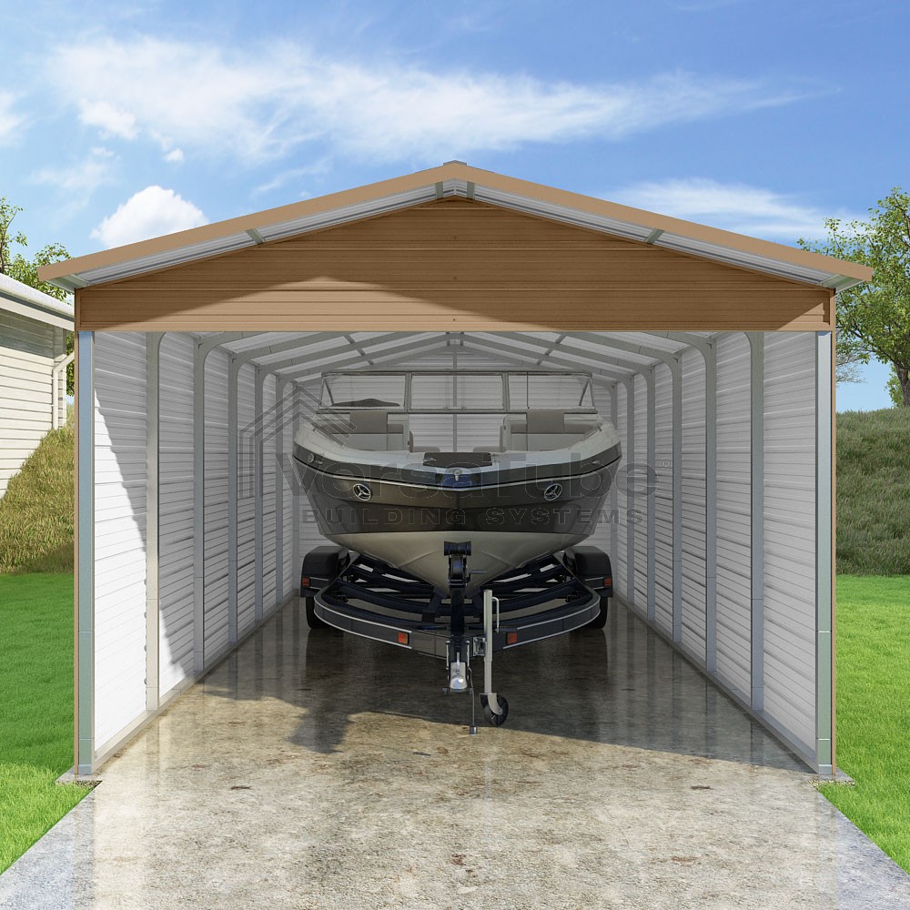 Pinnacle Series DIY carport kit features vertical sheet metal roof panels with ridge cap, gable and eave trim for an A-frame roof style and extended coverage on both ends.