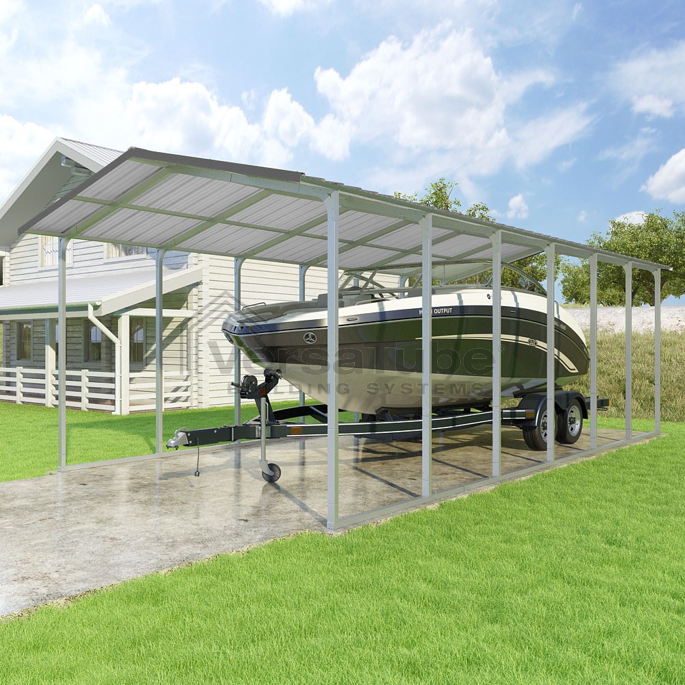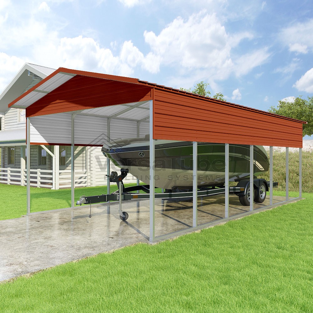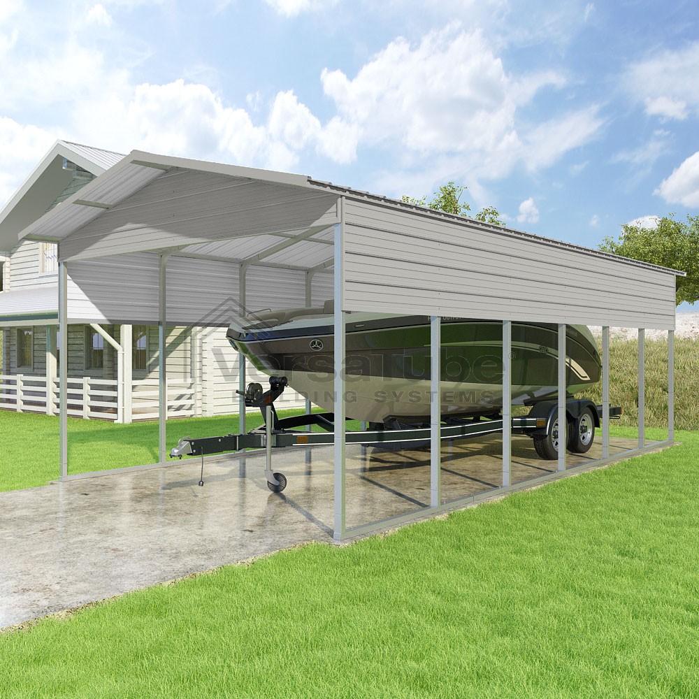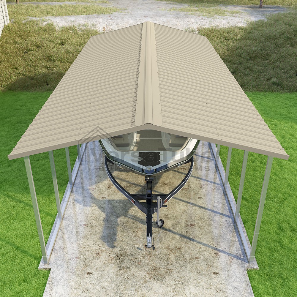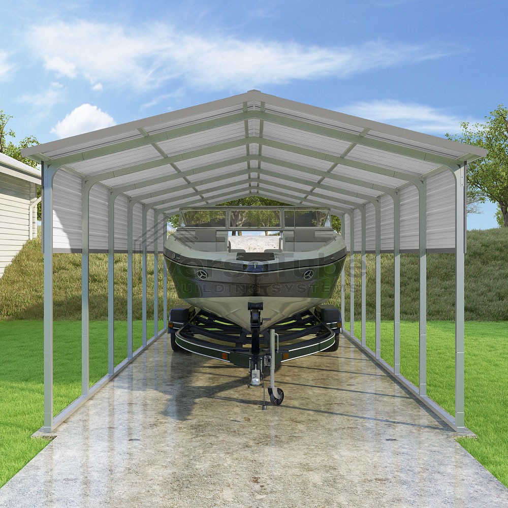 Pinnacle Series DIY carport kit features vertical sheet metal roof panels with ridge cap, gable and eave trim for an A-frame roof style and extended coverage on both ends.