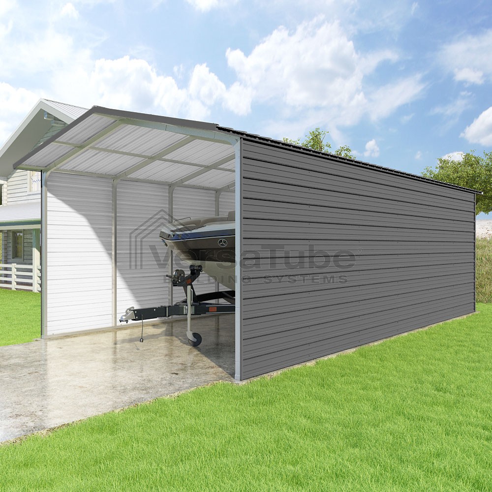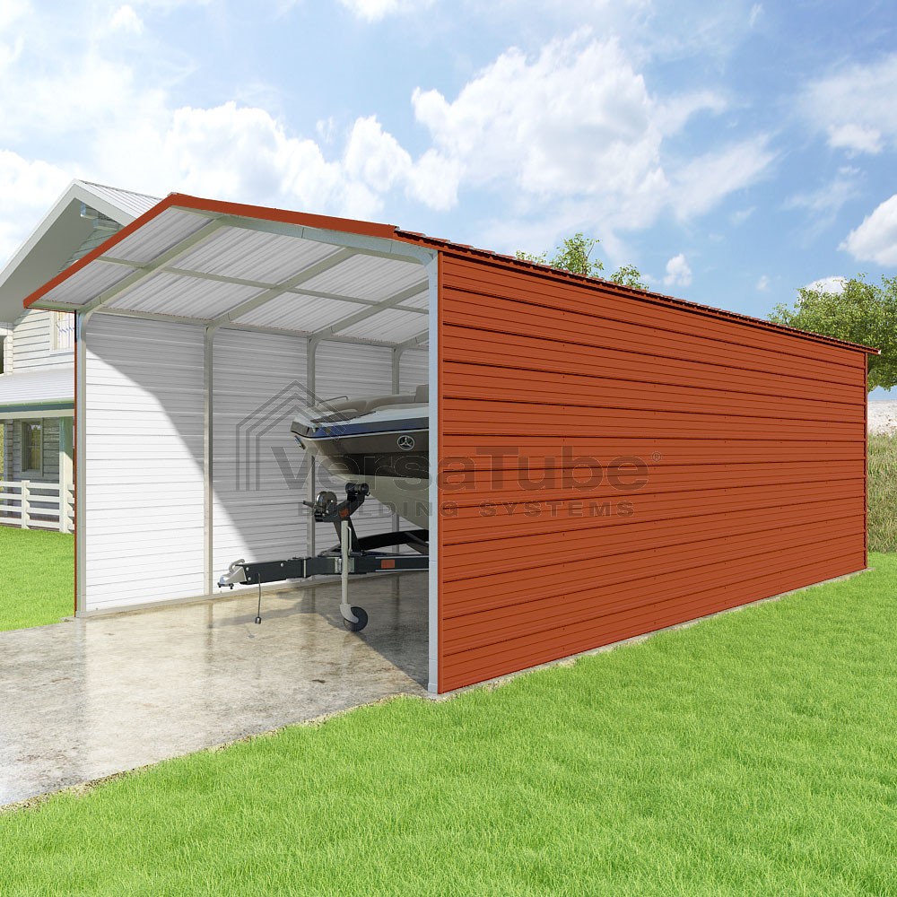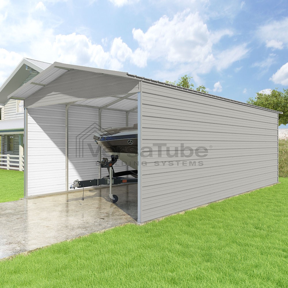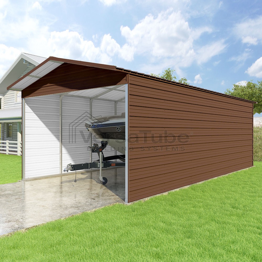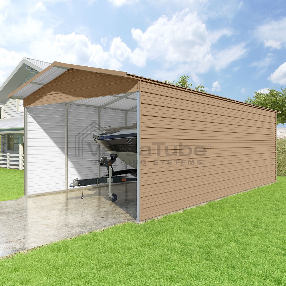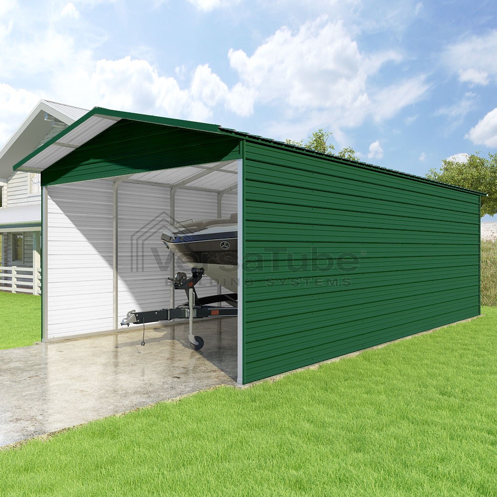 Pinnacle Series DIY carport kit features vertical sheet metal roof panels with ridge cap, gable and eave trim for an A-frame roof style and extended coverage on both ends.