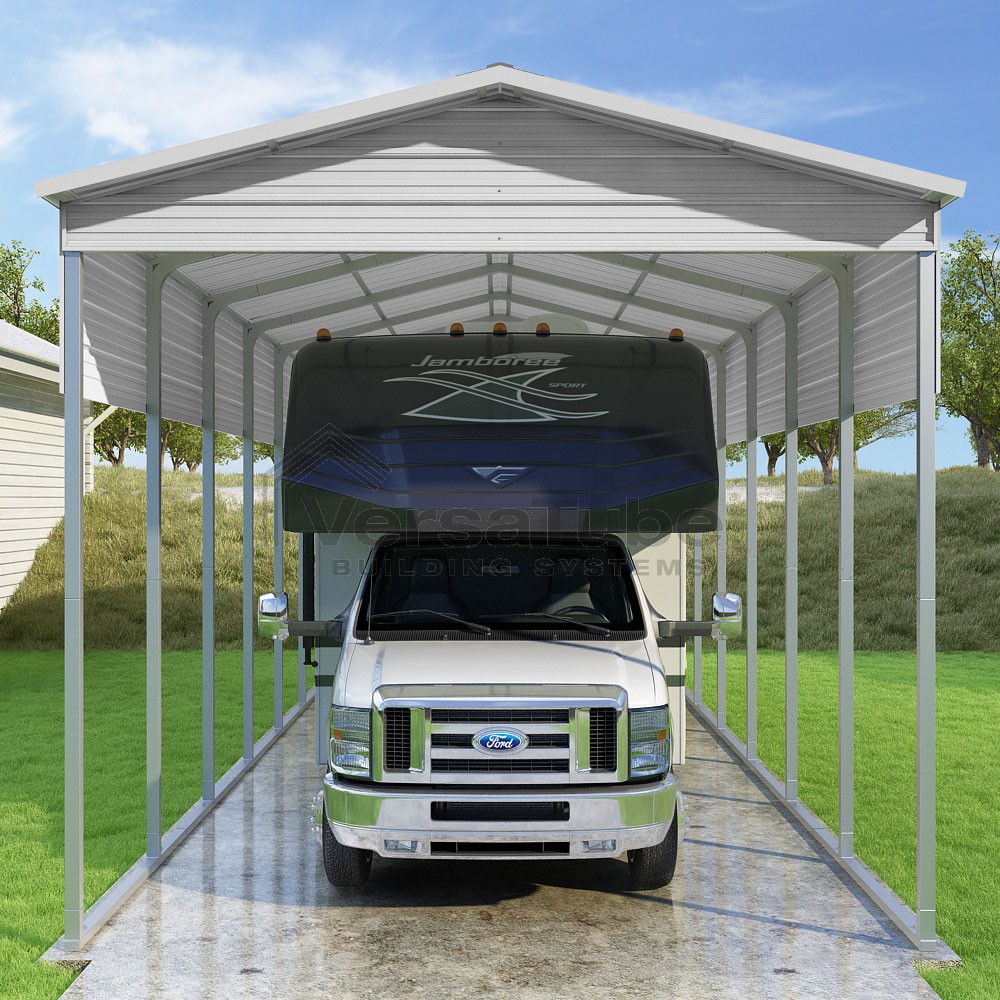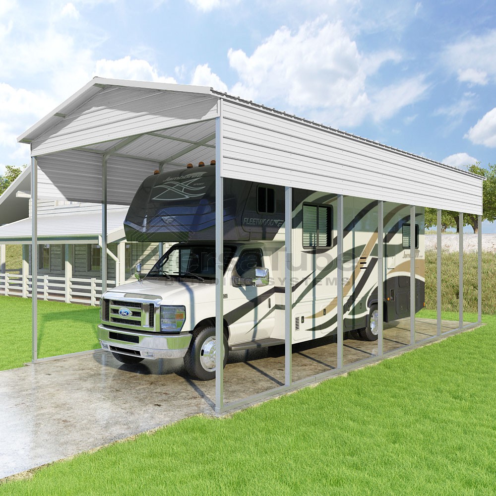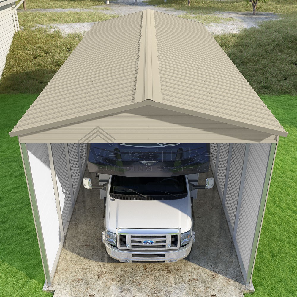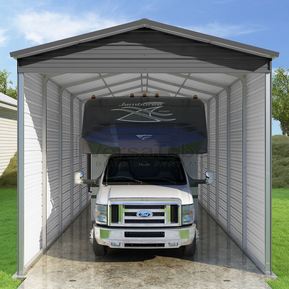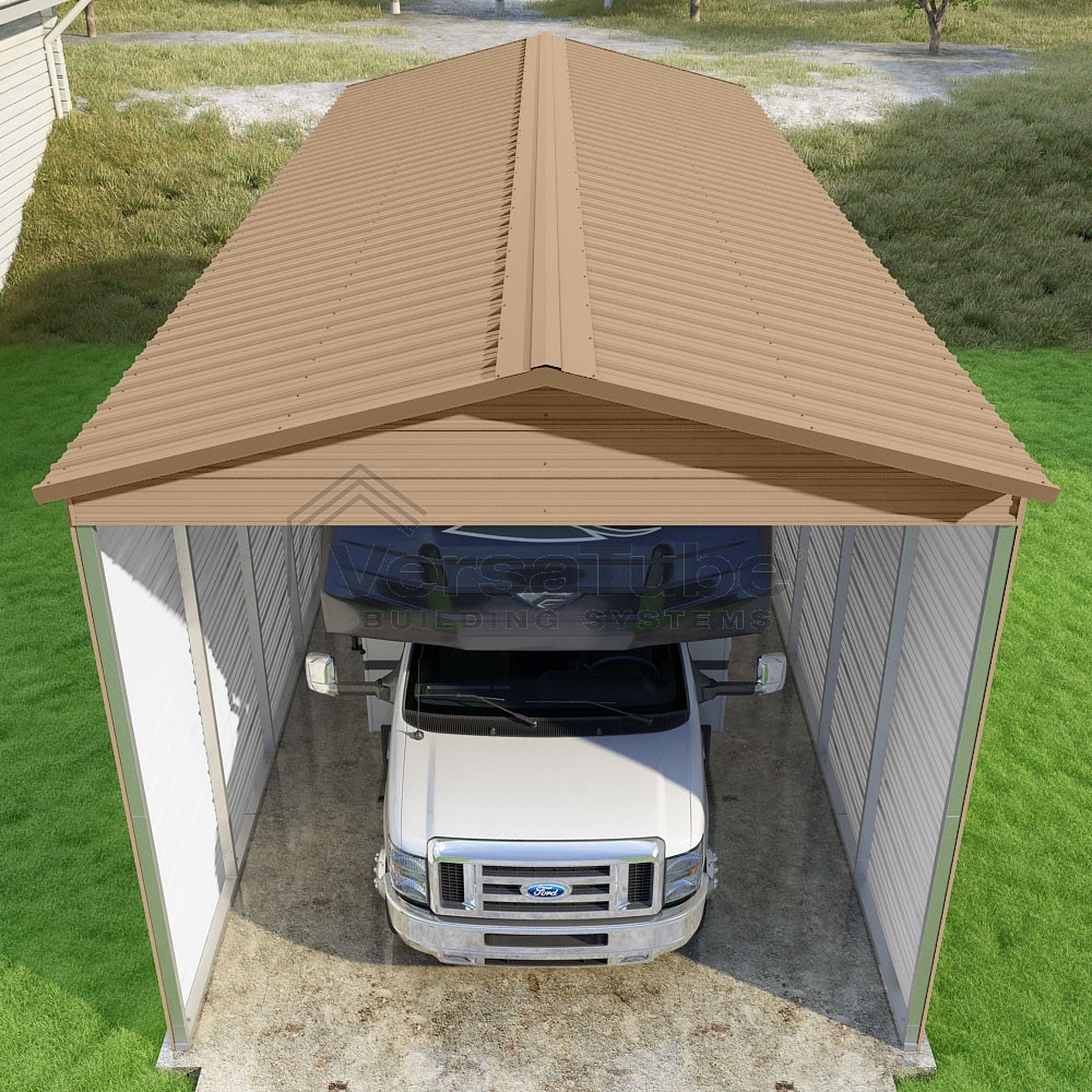 Pinnacle Series DIY carport kit features vertical sheet metal roof panels with ridge cap, gable and eave trim for an A-frame roof style and extended coverage on both ends.