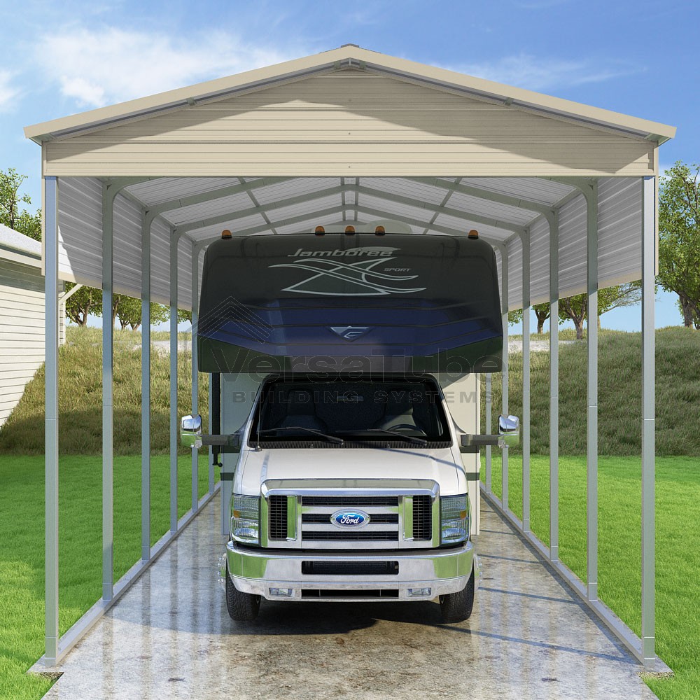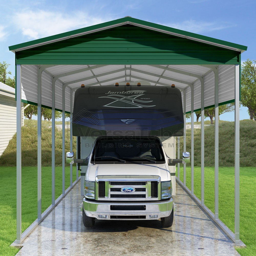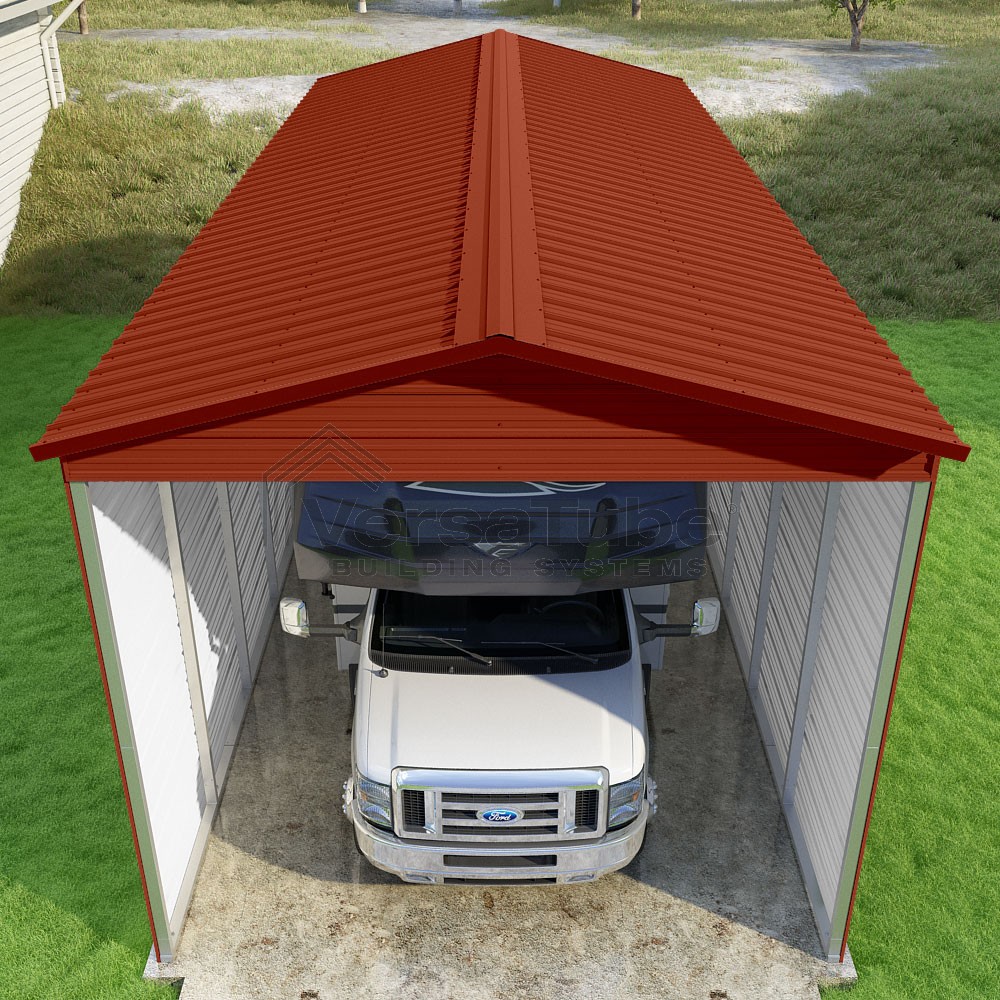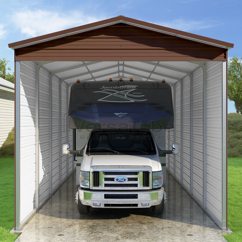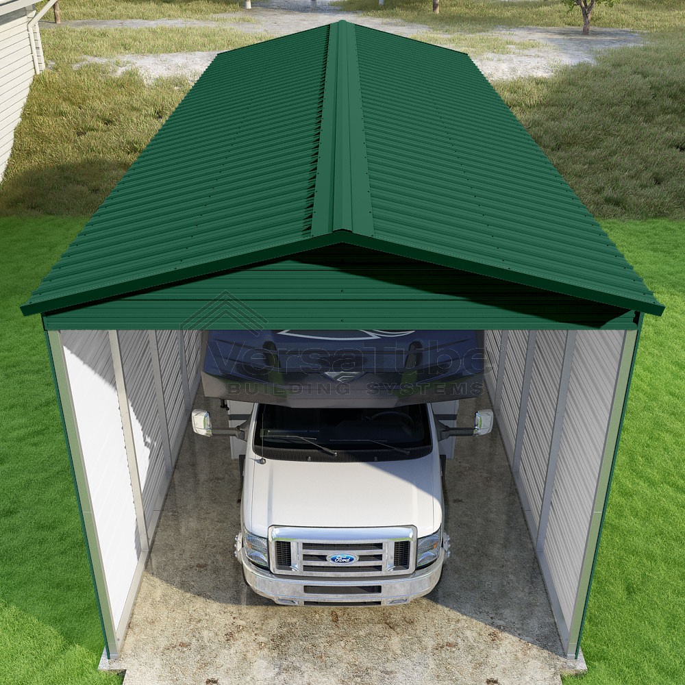 Pinnacle Series DIY carport kit features vertical sheet metal roof panels with ridge cap, gable and eave trim for an A-frame roof style and extended coverage on both ends.