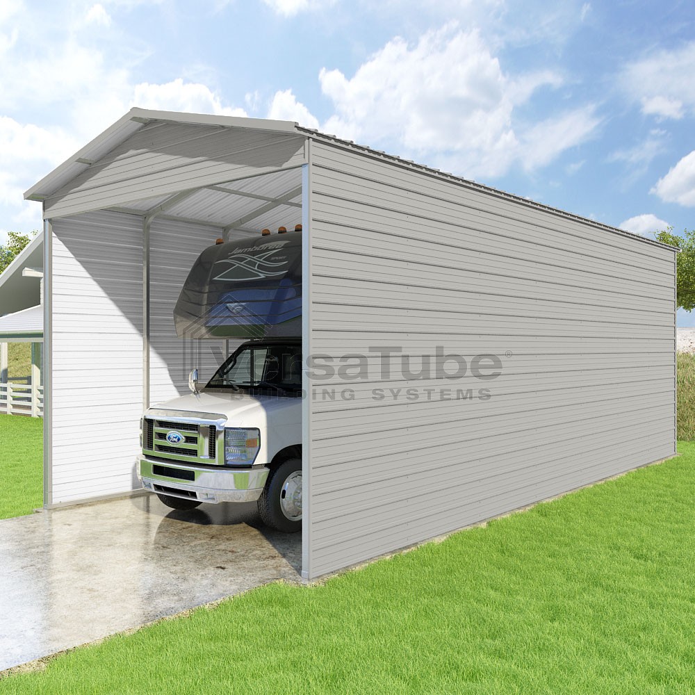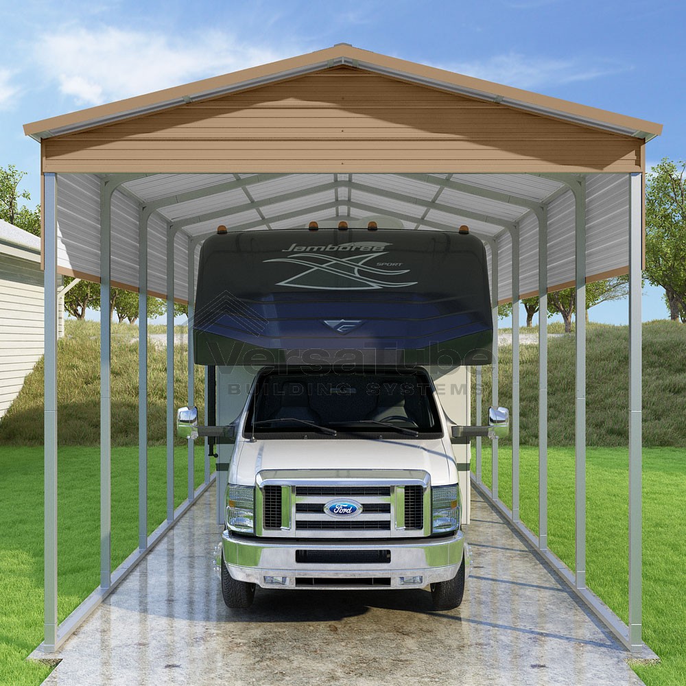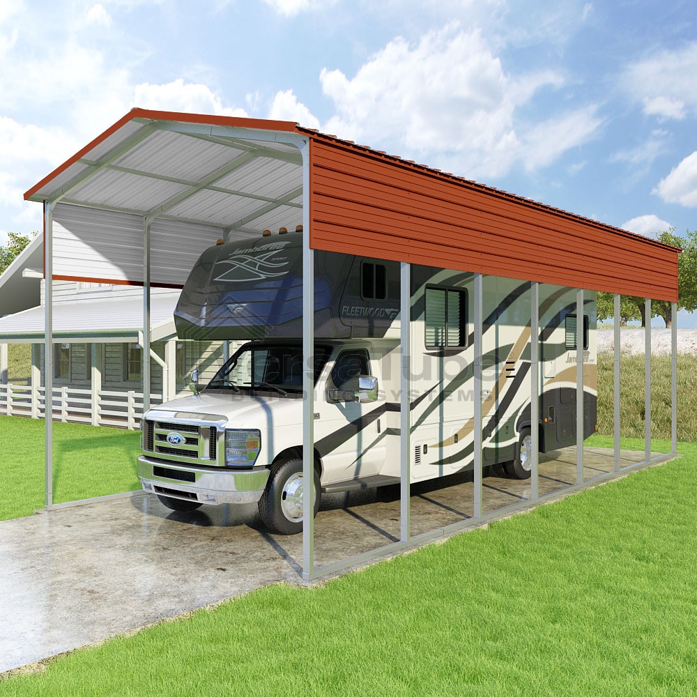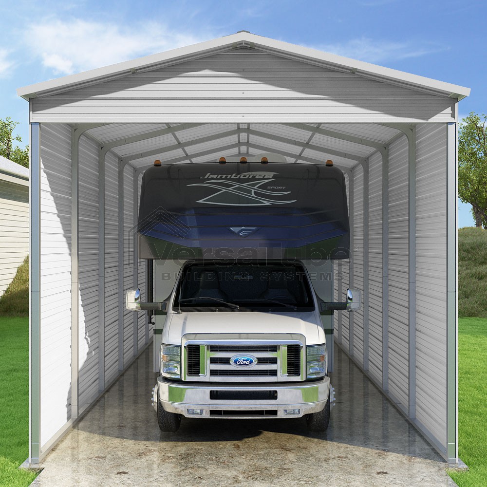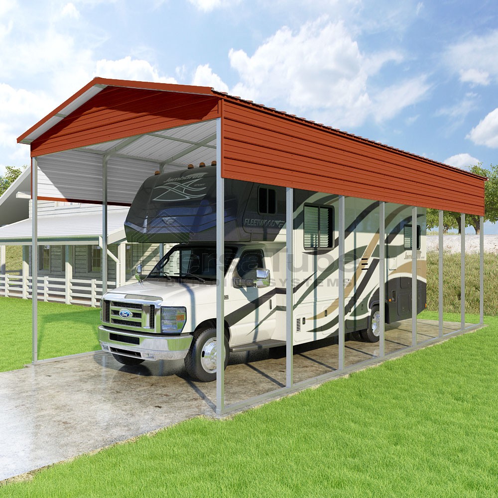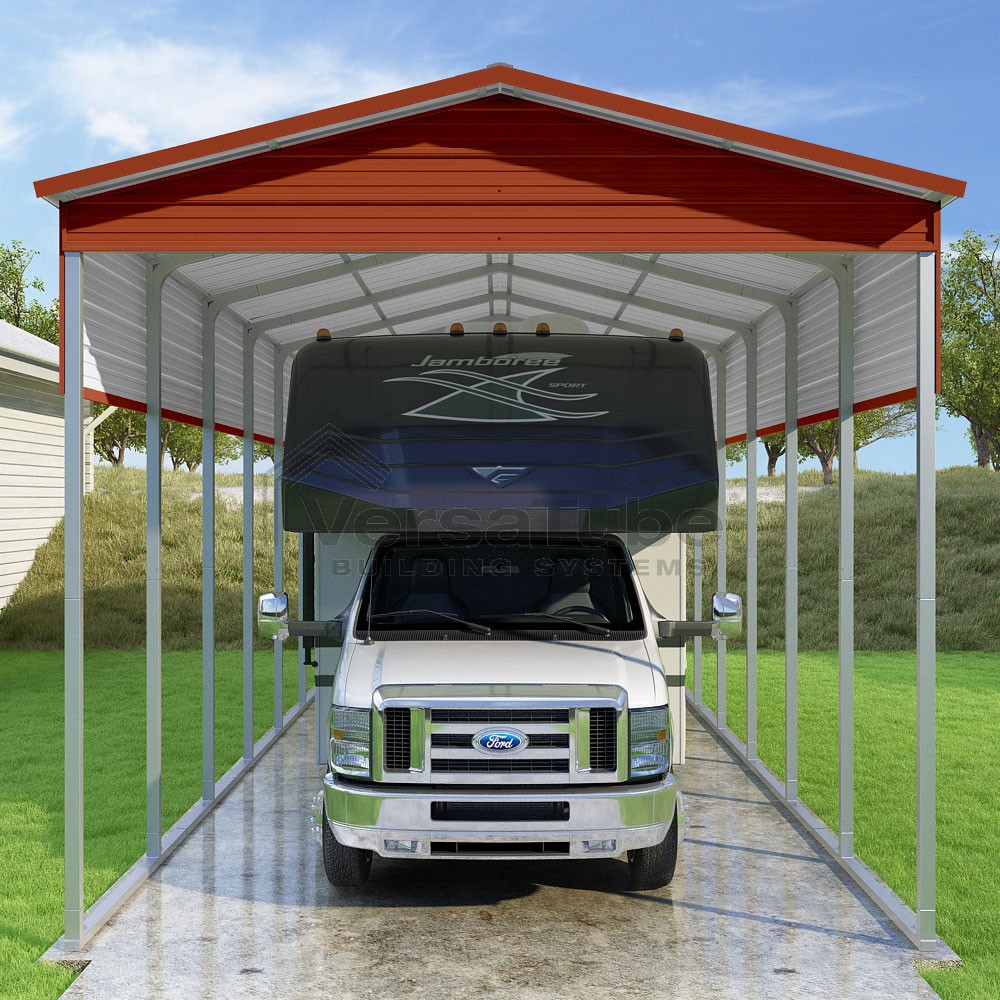 Pinnacle Series DIY carport kit features vertical sheet metal roof panels with ridge cap, gable and eave trim for an A-frame roof style and extended coverage on both ends.