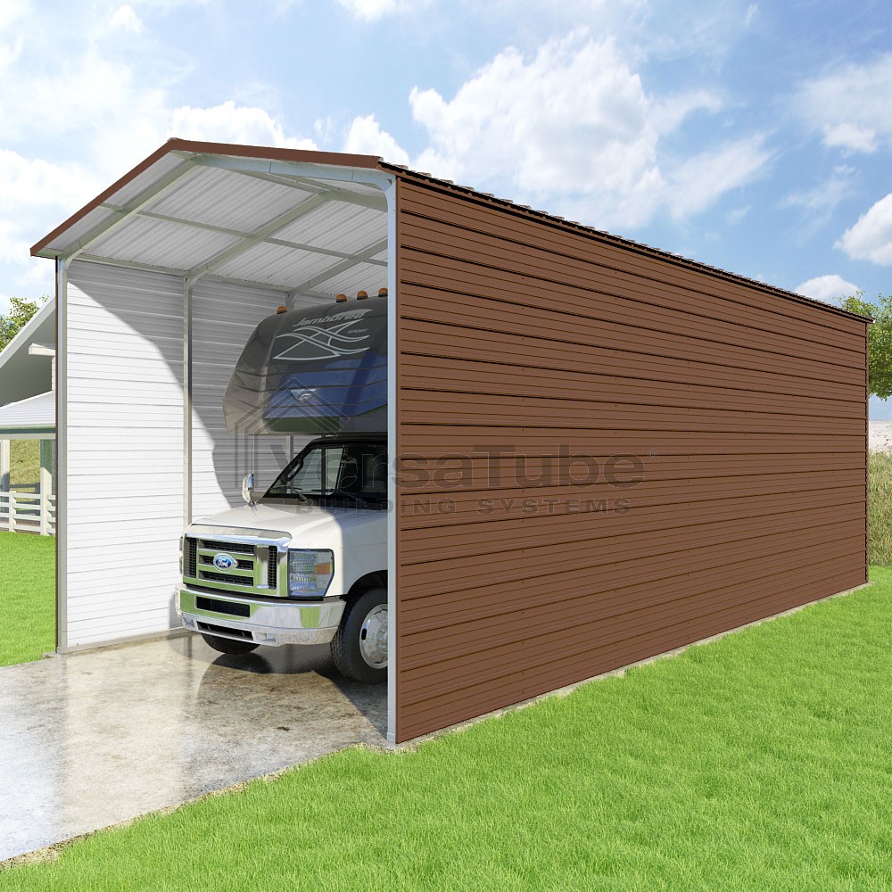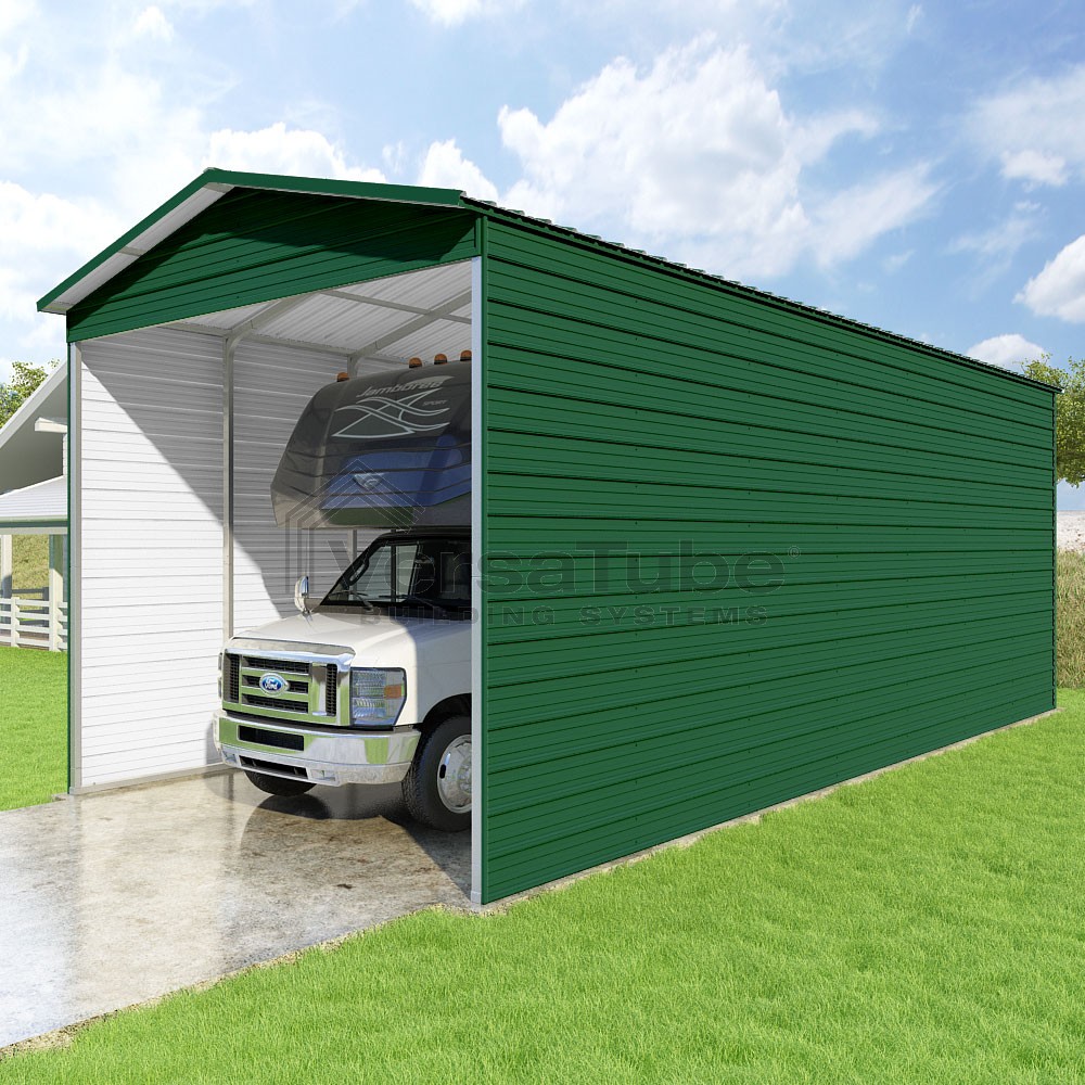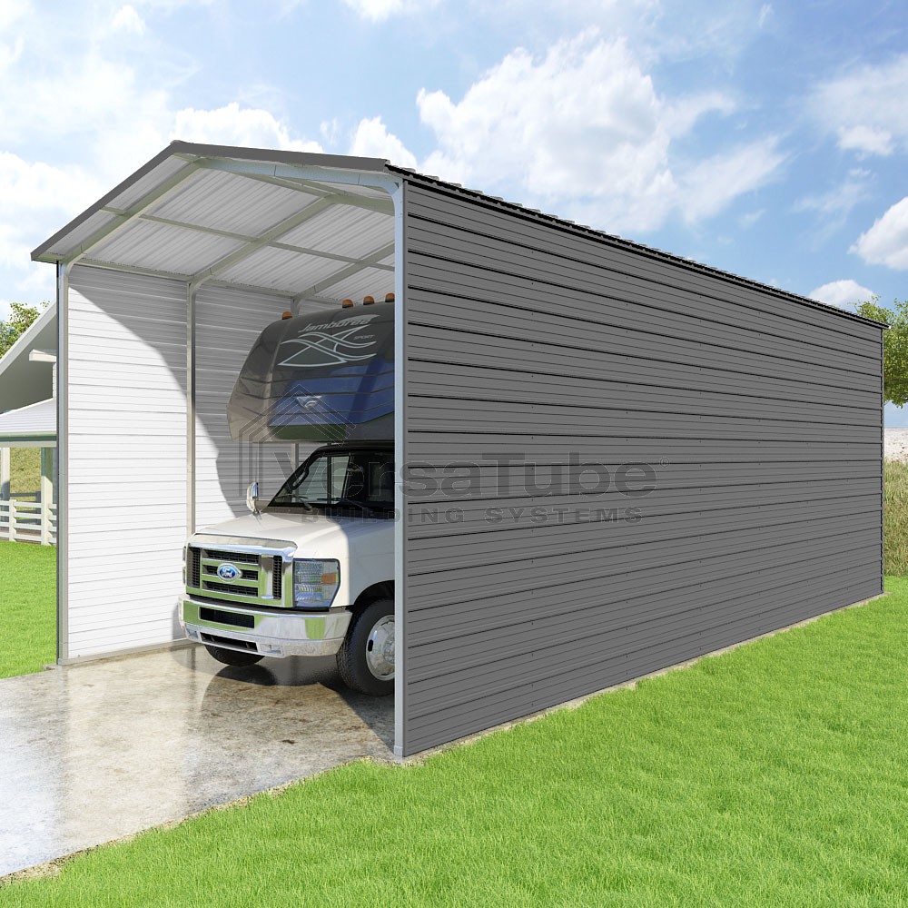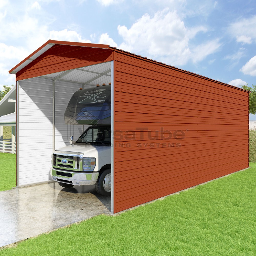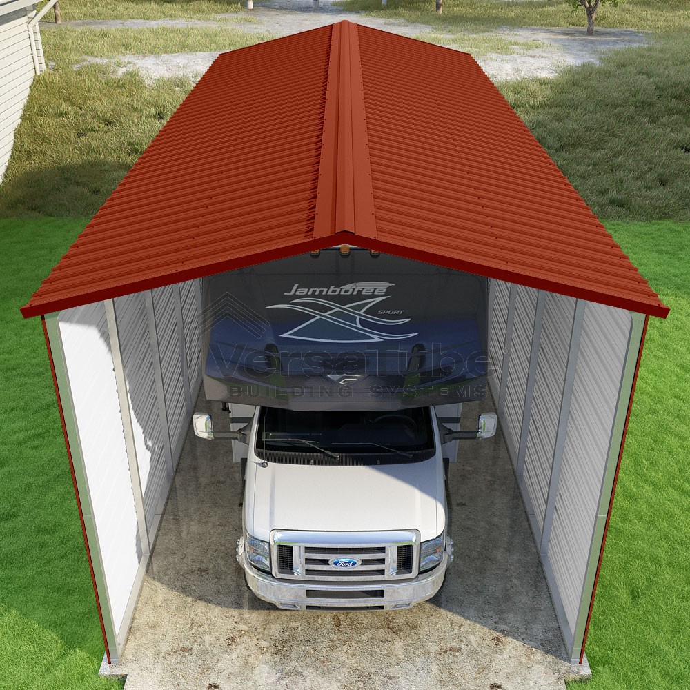 Pinnacle Series DIY carport kit features vertical sheet metal roof panels with ridge cap, gable and eave trim for an A-frame roof style and extended coverage on both ends.