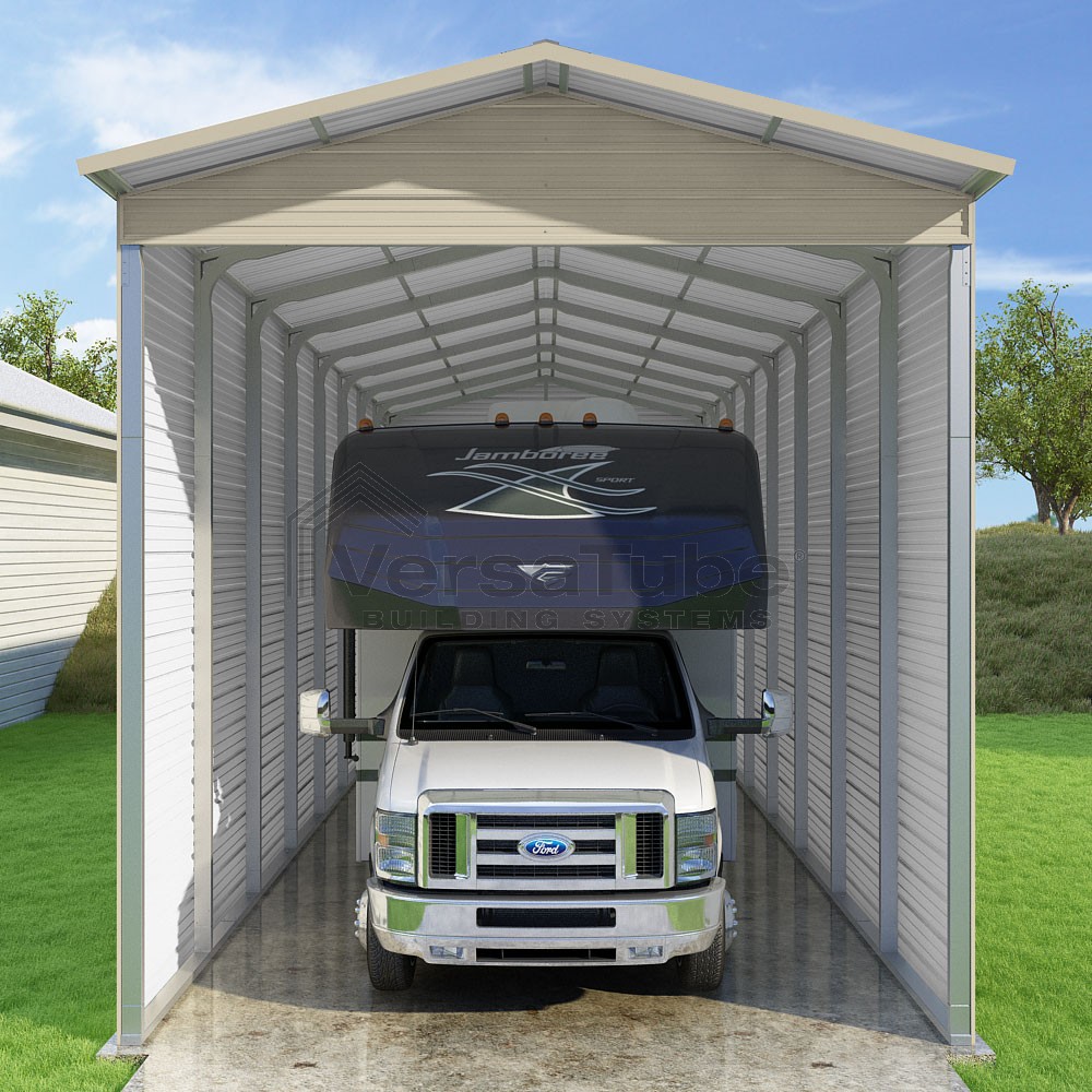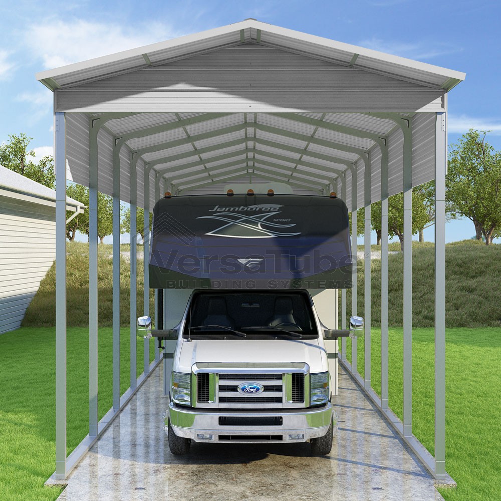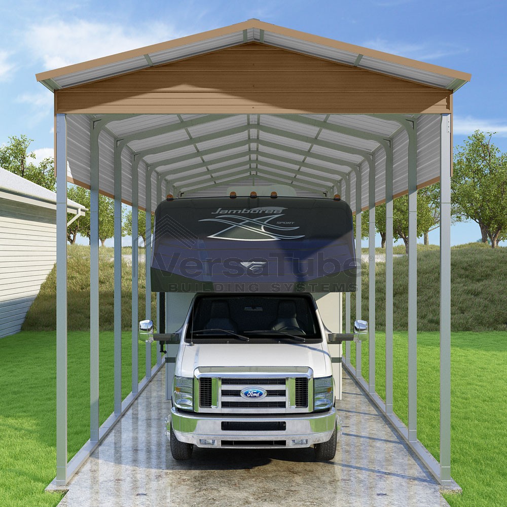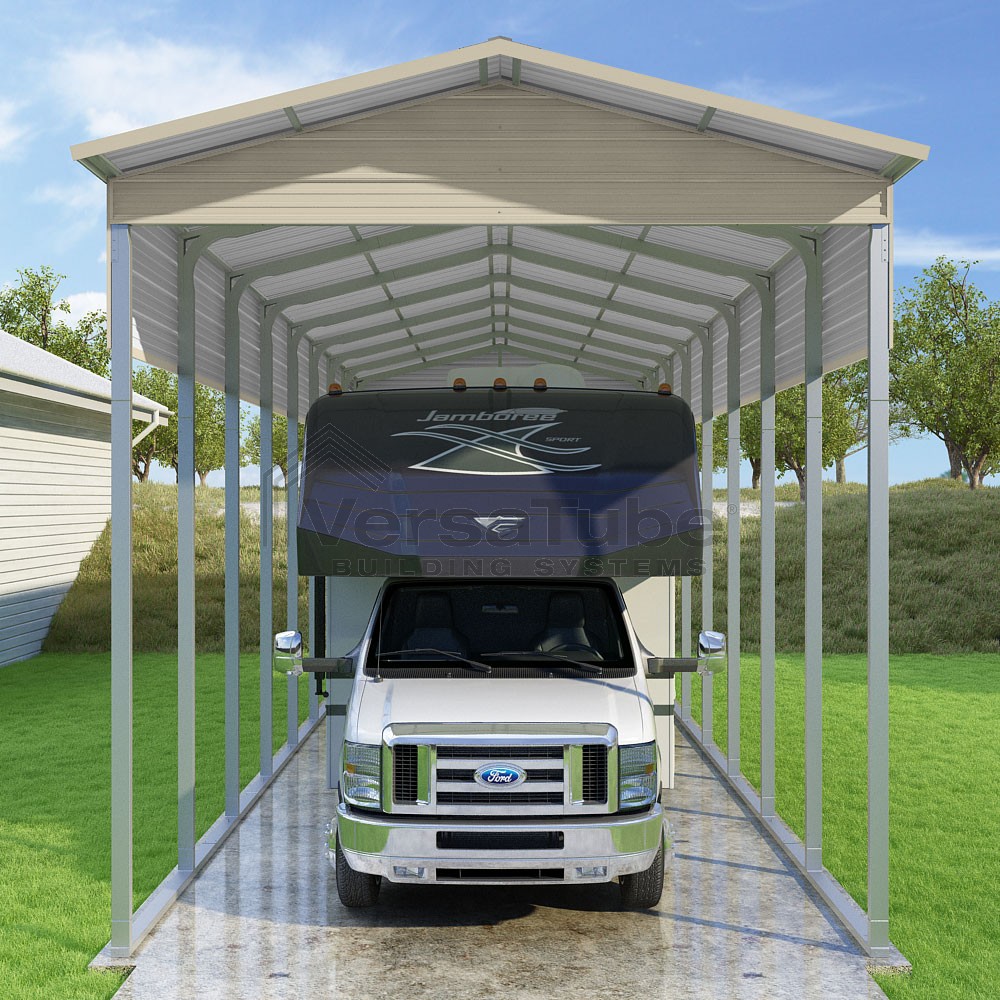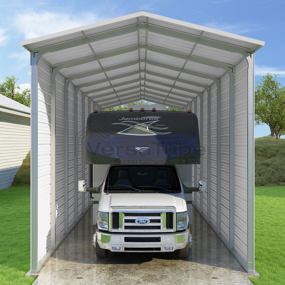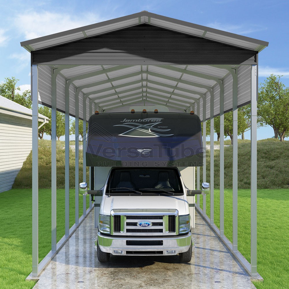 Pinnacle Series DIY carport kit features vertical sheet metal roof panels with ridge cap, gable and eave trim for an A-frame roof style and extended coverage on both ends.
