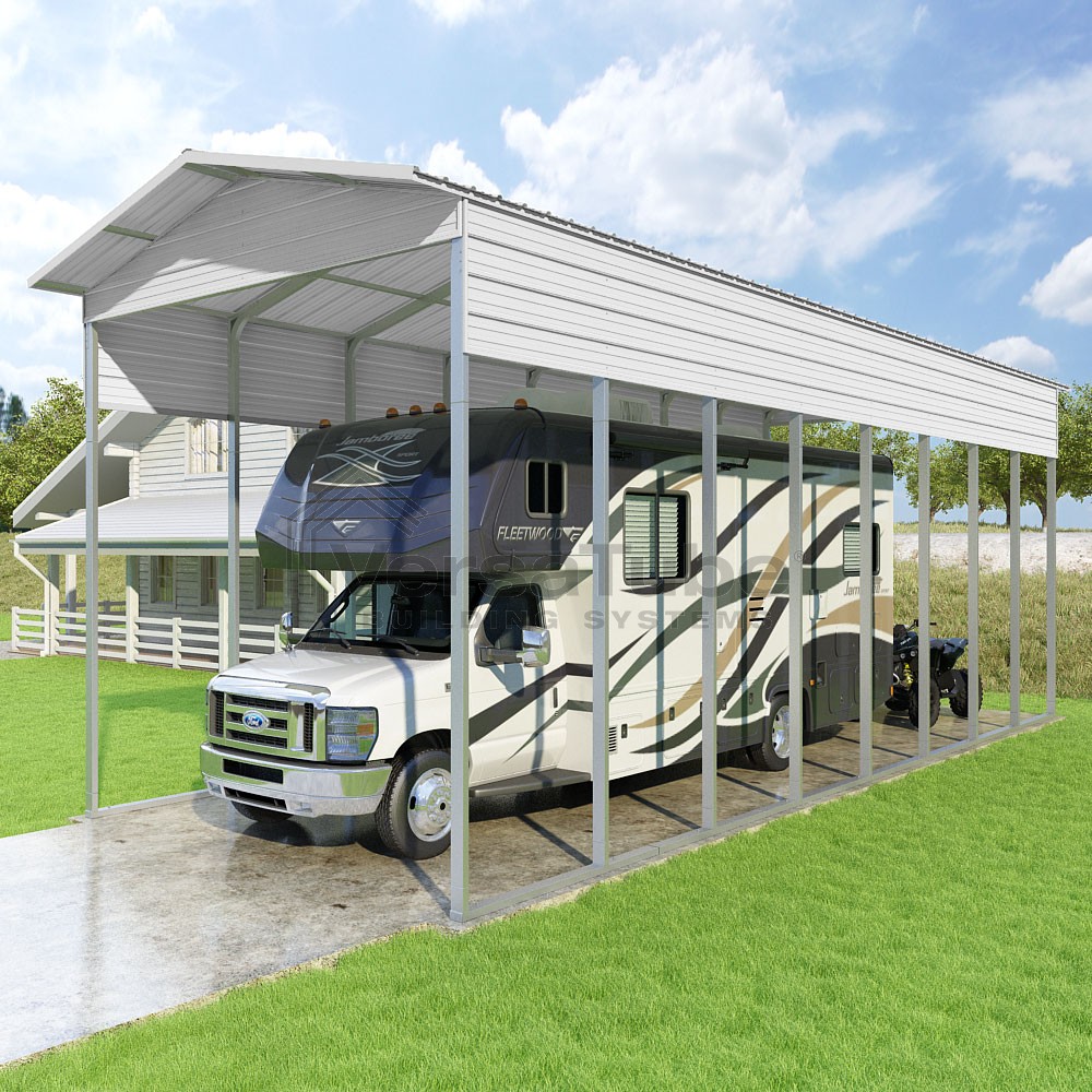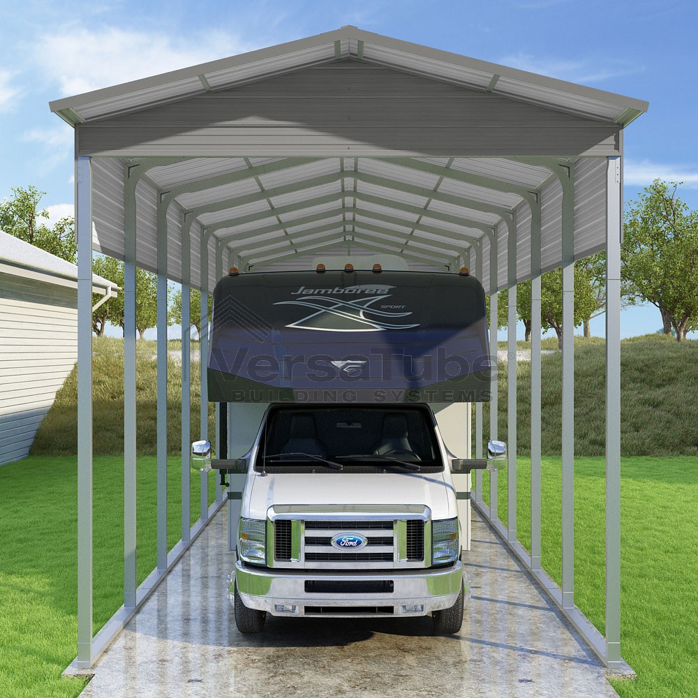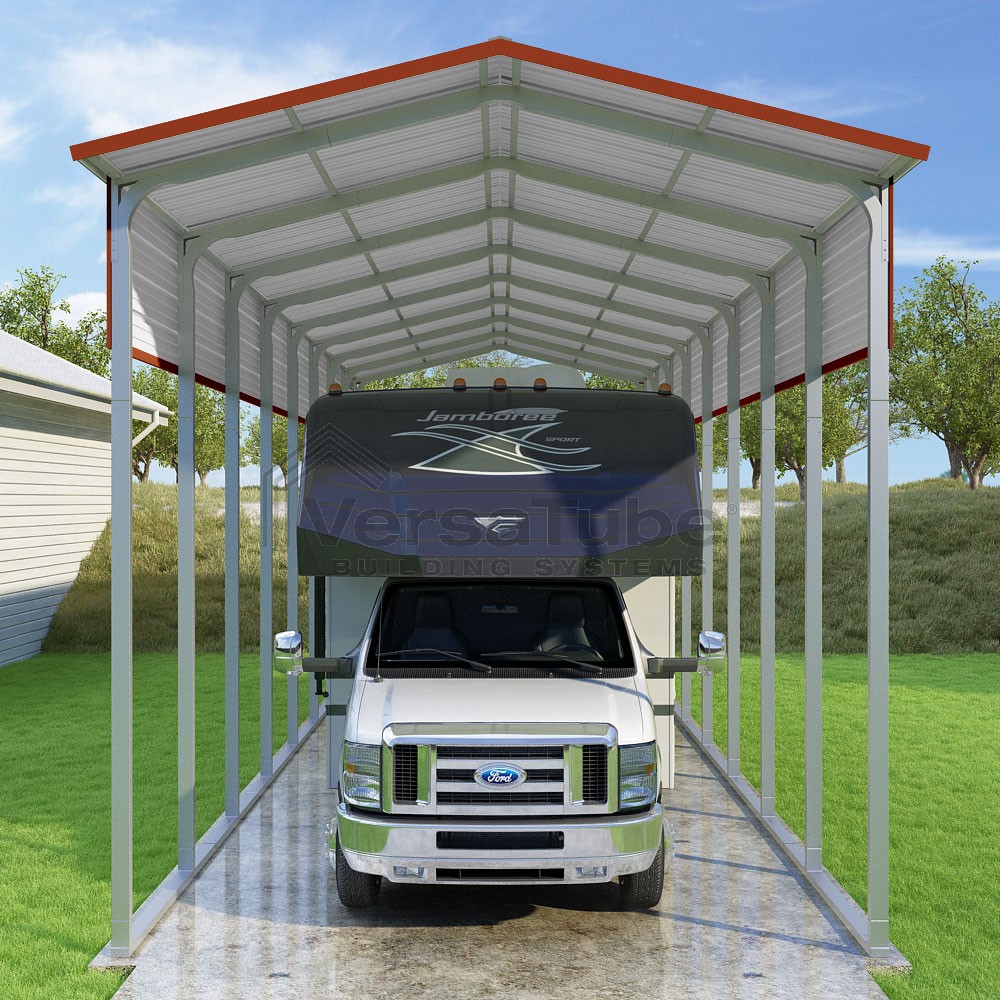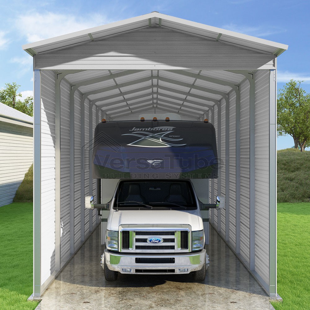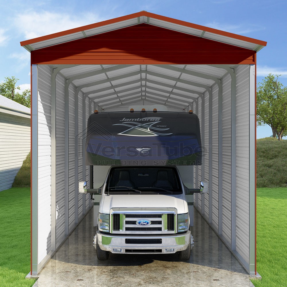 Pinnacle Series DIY carport kit features vertical sheet metal roof panels with ridge cap, gable and eave trim for an A-frame roof style and extended coverage on both ends.