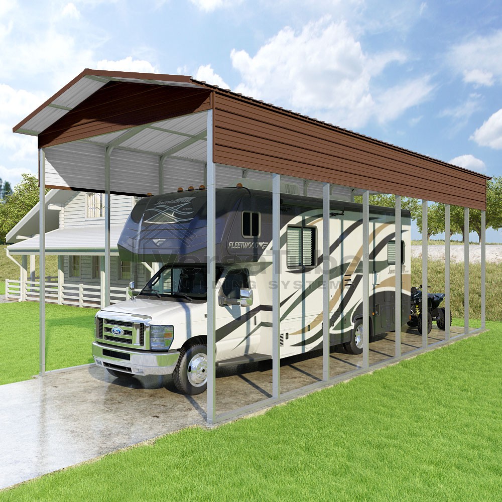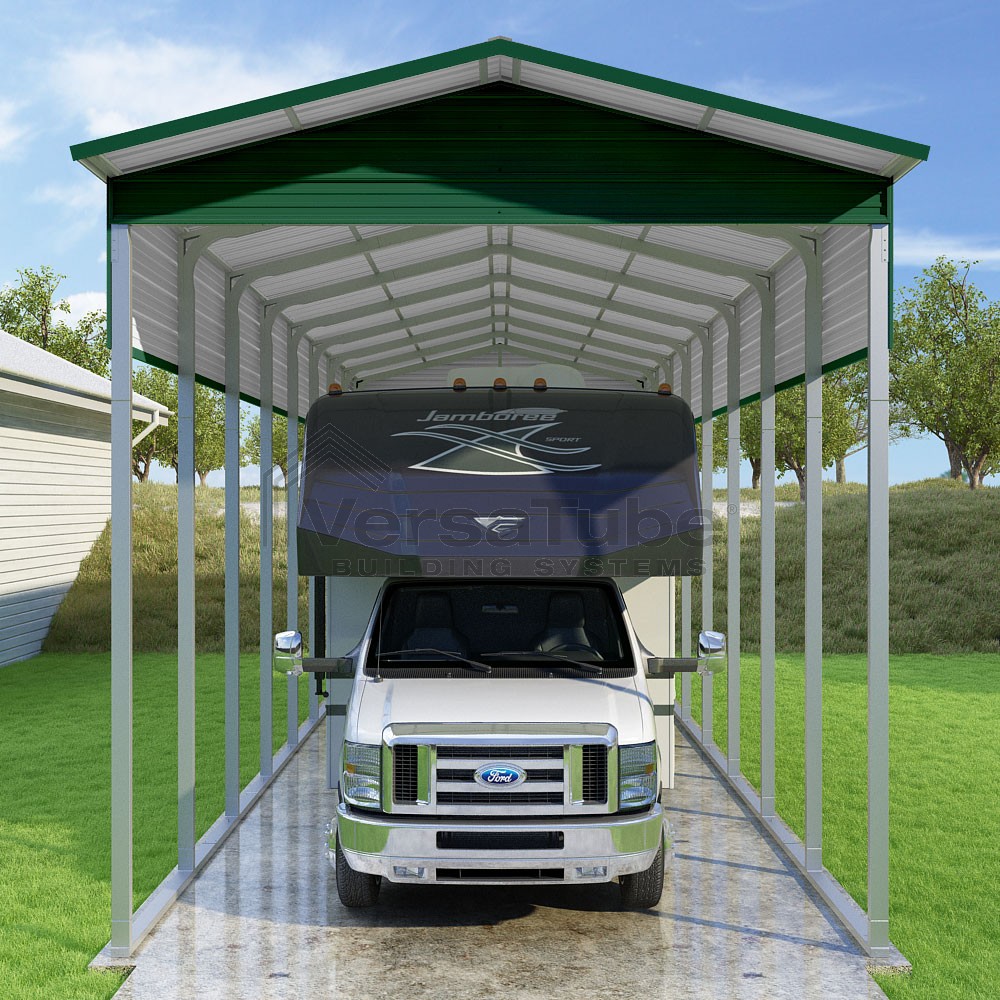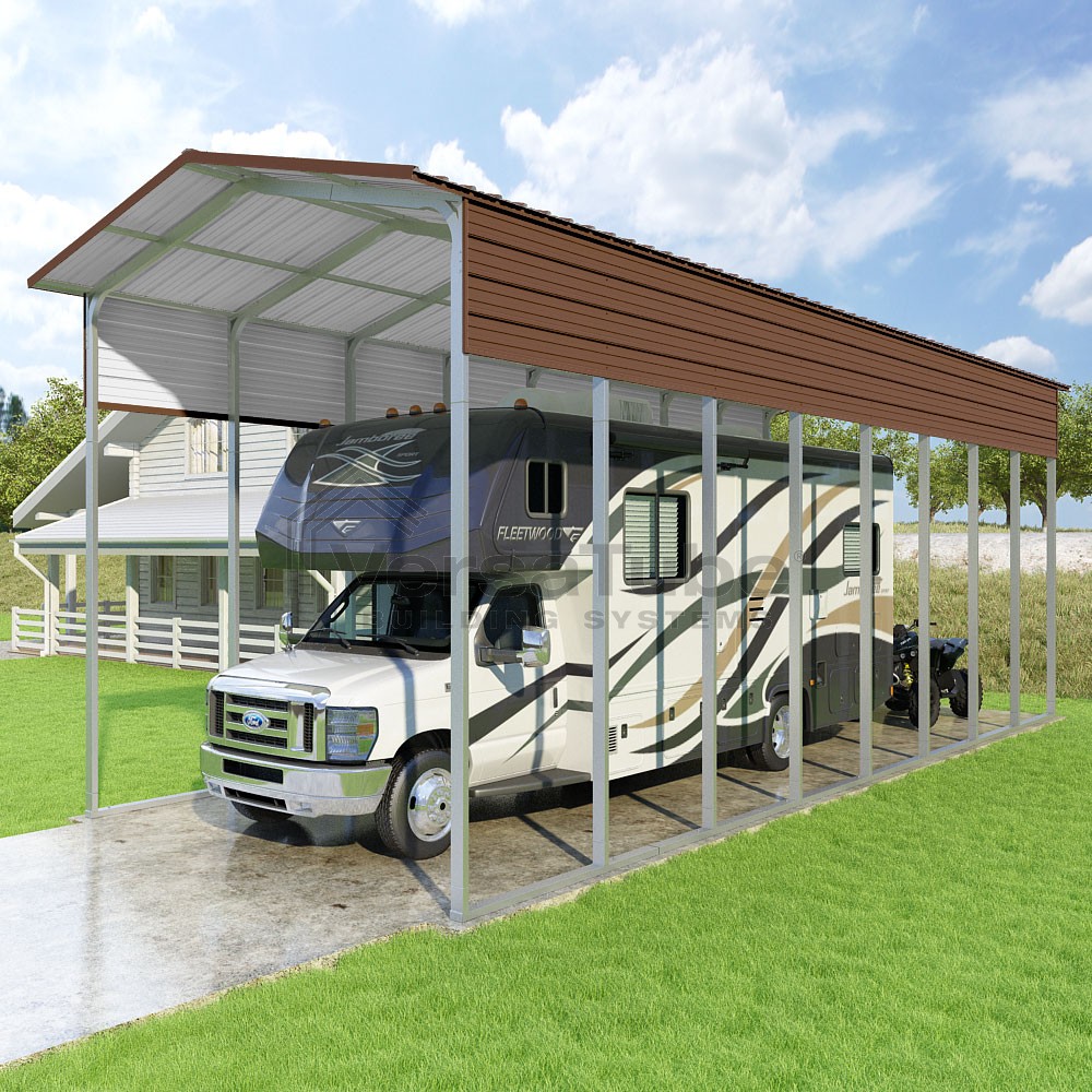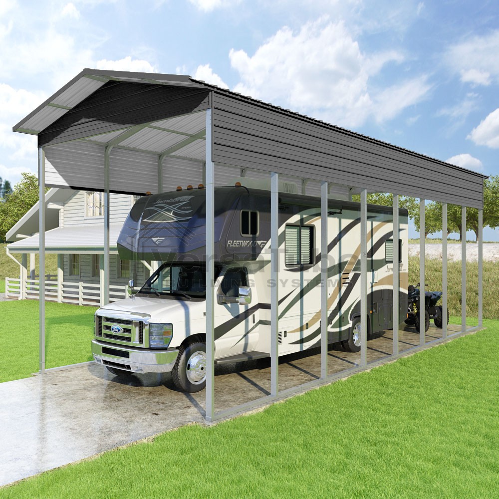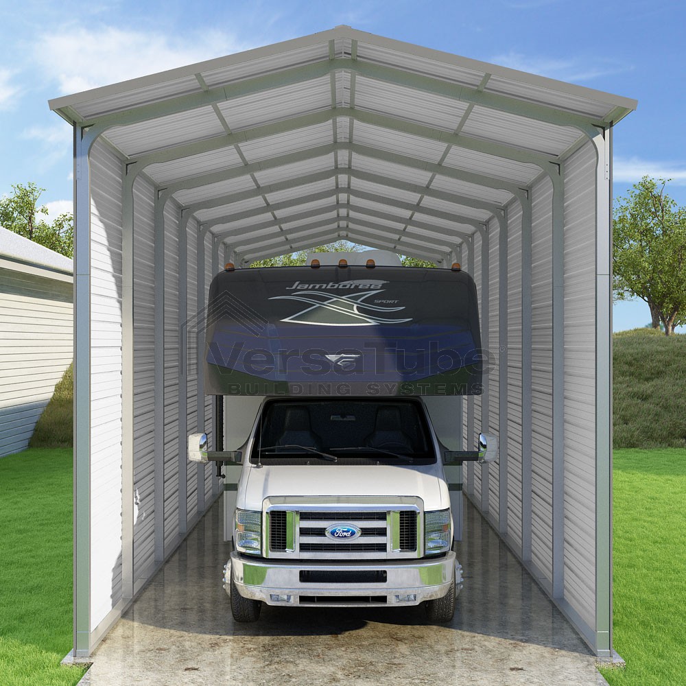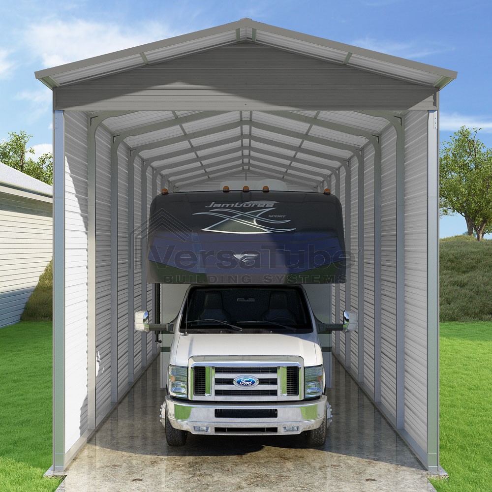 Pinnacle Series DIY carport kit features vertical sheet metal roof panels with ridge cap, gable and eave trim for an A-frame roof style and extended coverage on both ends.