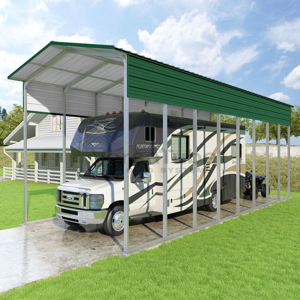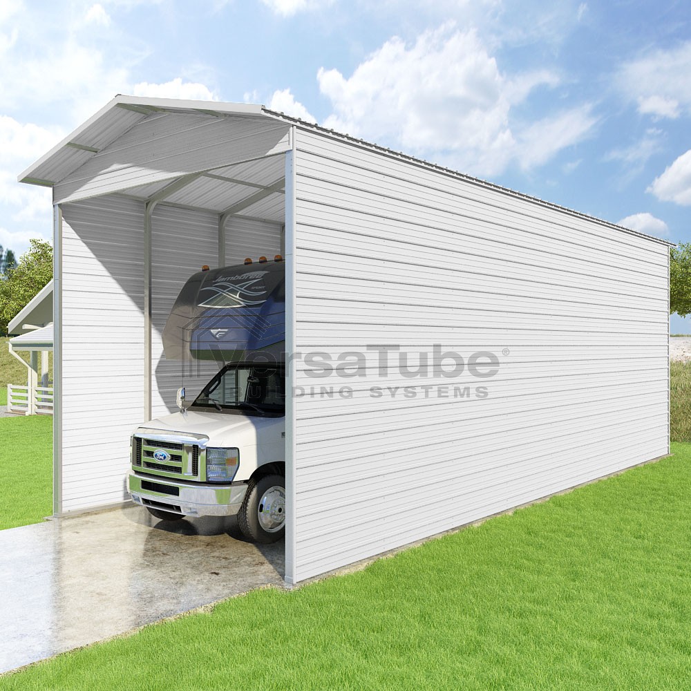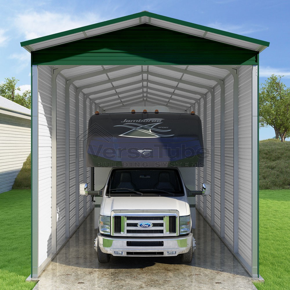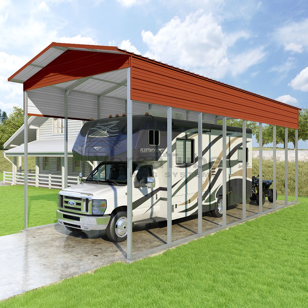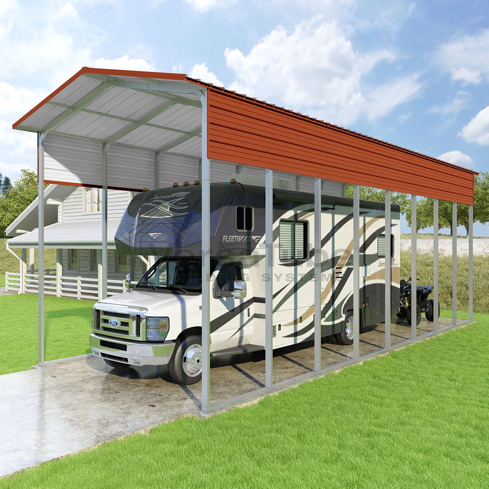Pinnacle Series DIY carport kit features vertical sheet metal roof panels with ridge cap, gable and eave trim for an A-frame roof style and extended coverage on both ends.