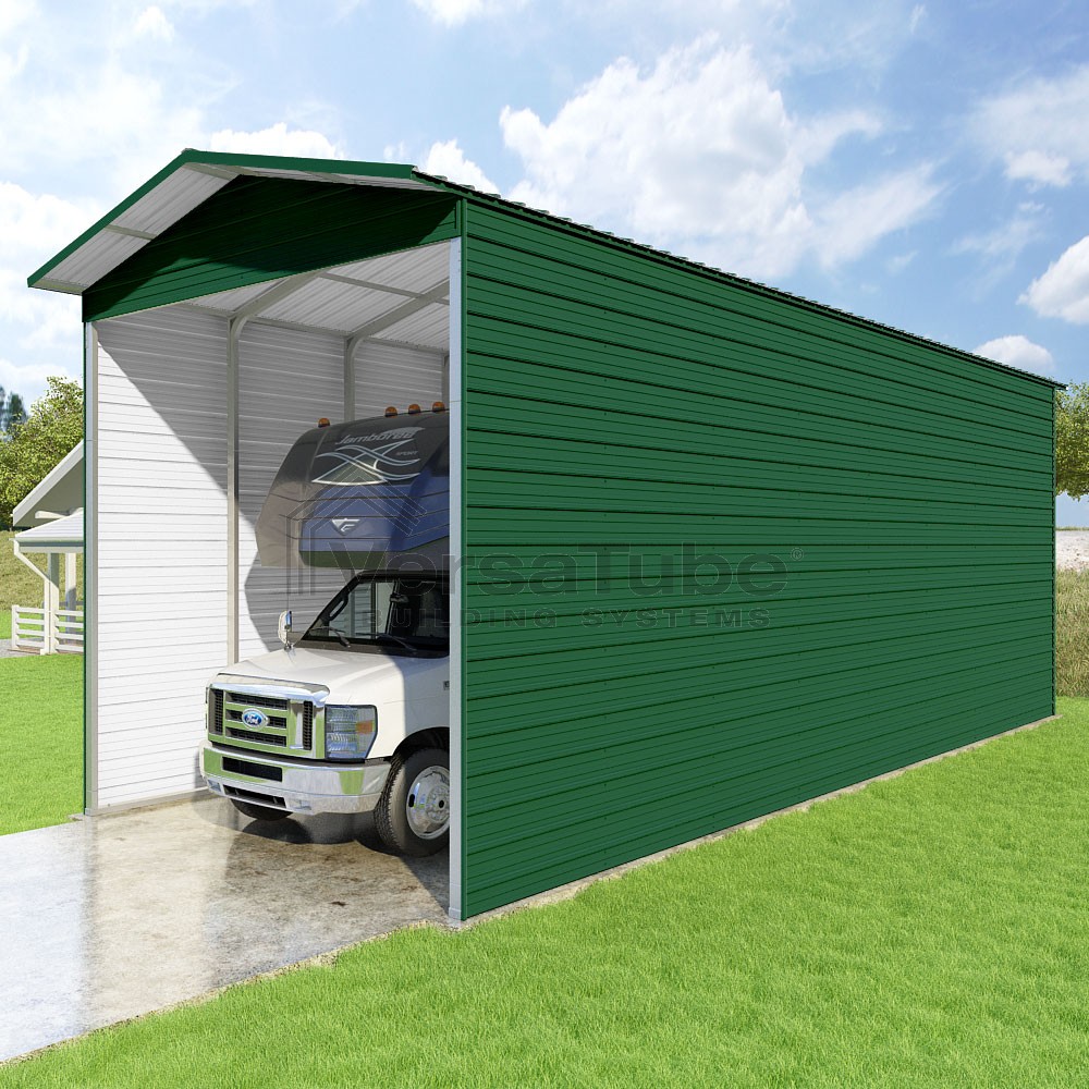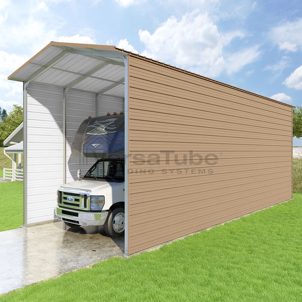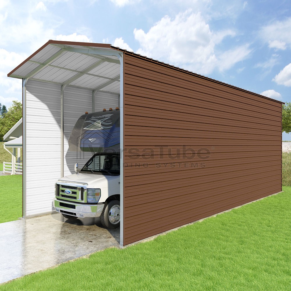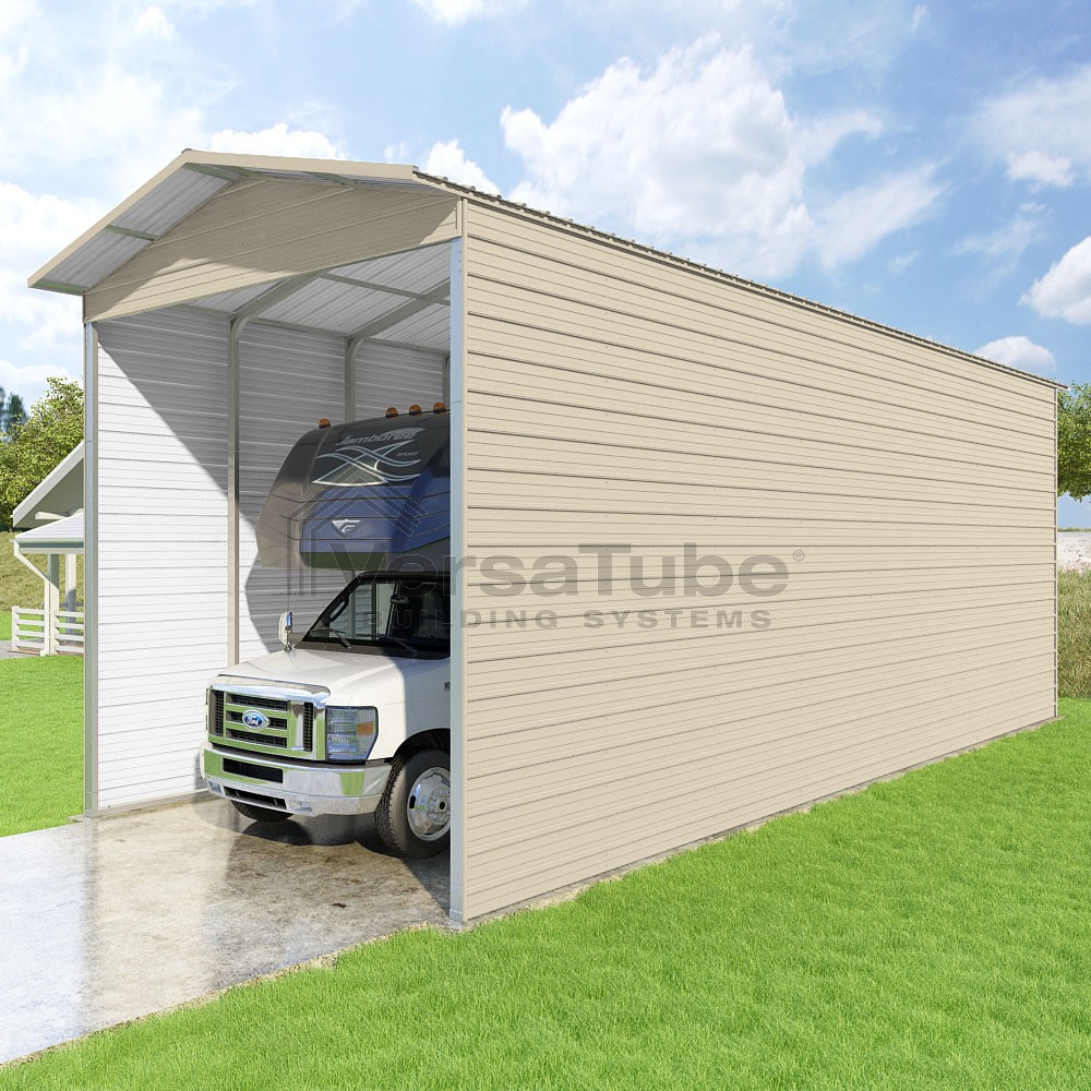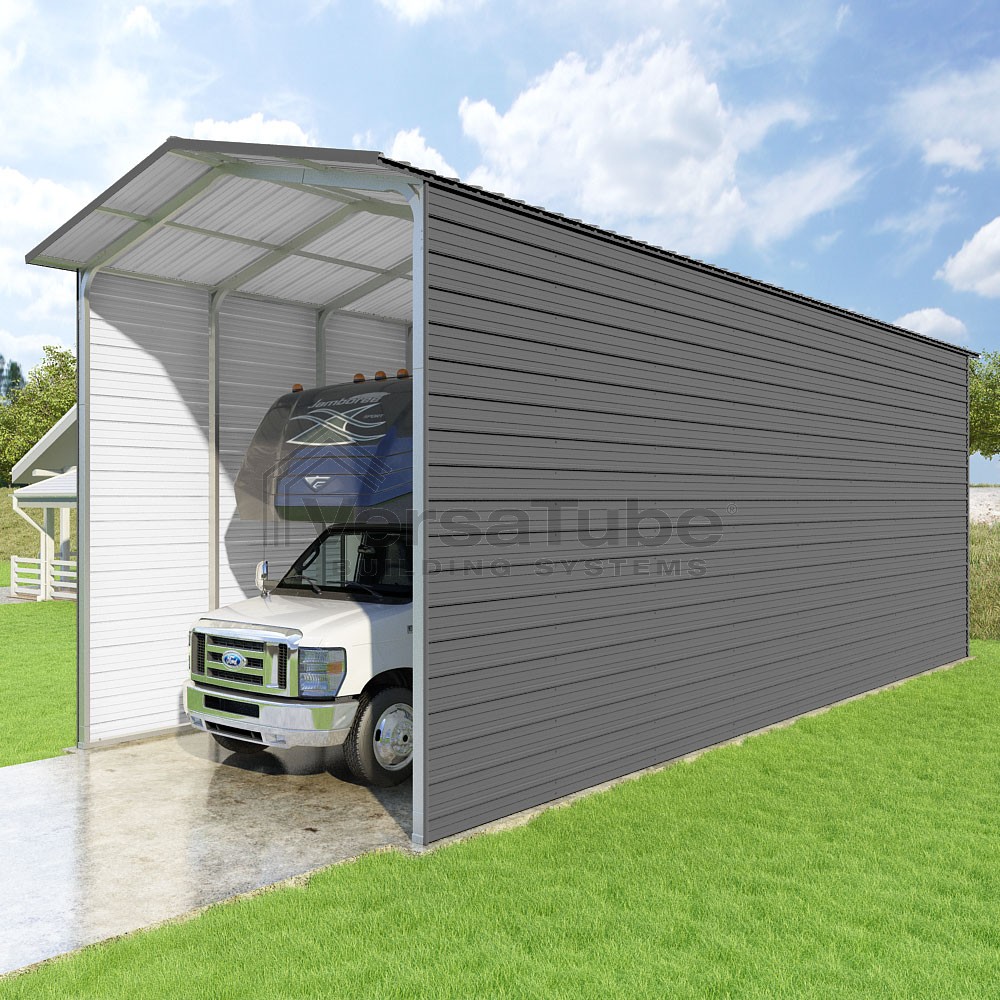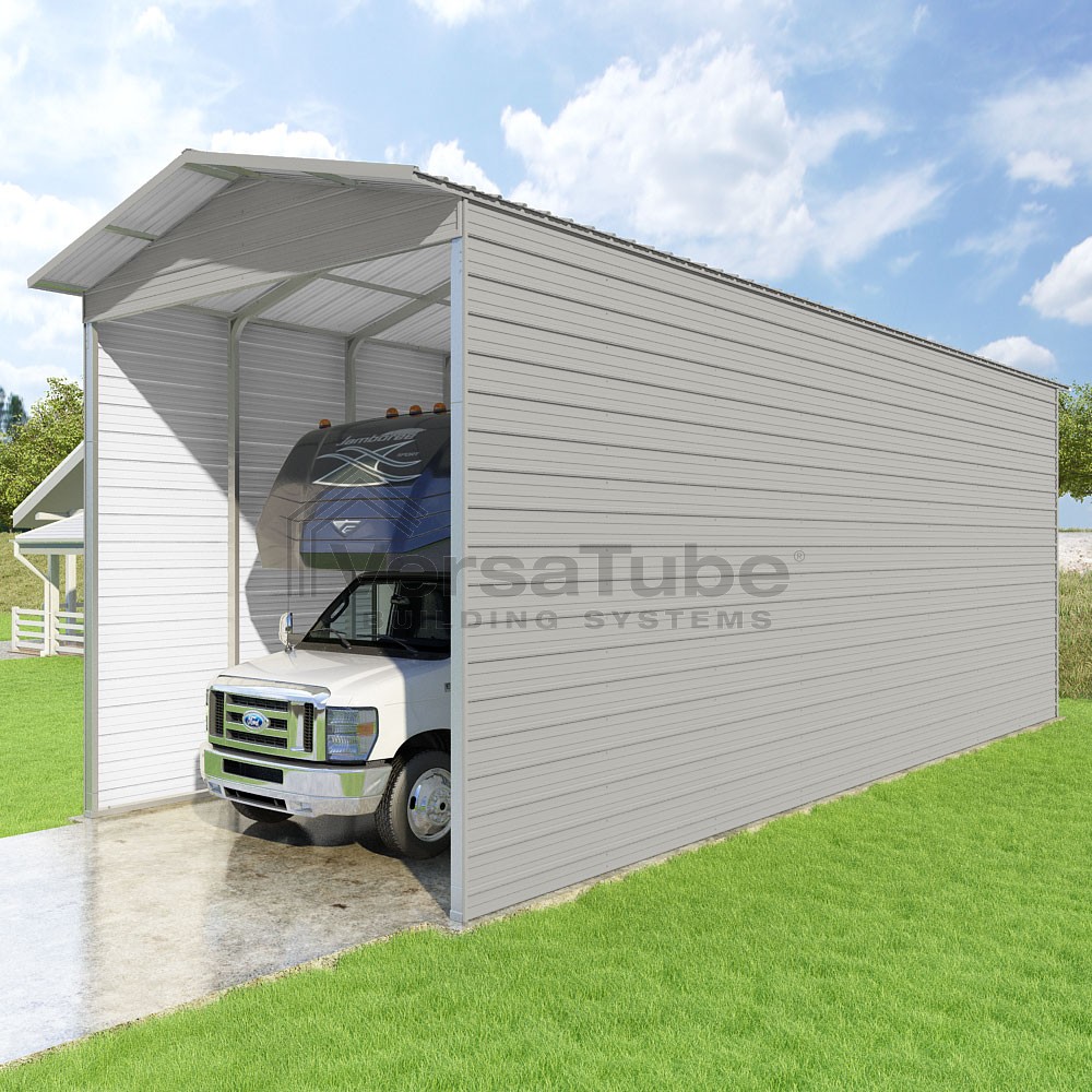Pinnacle Series DIY carport kit features vertical sheet metal roof panels with ridge cap, gable and eave trim for an A-frame roof style and extended coverage on both ends.