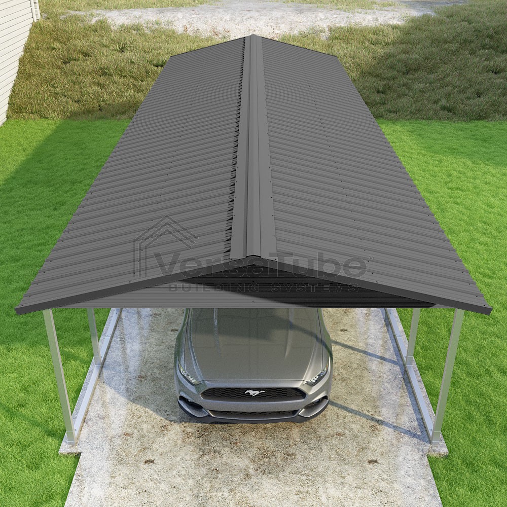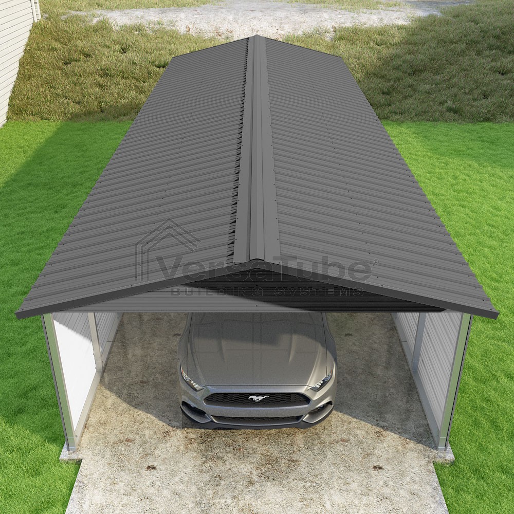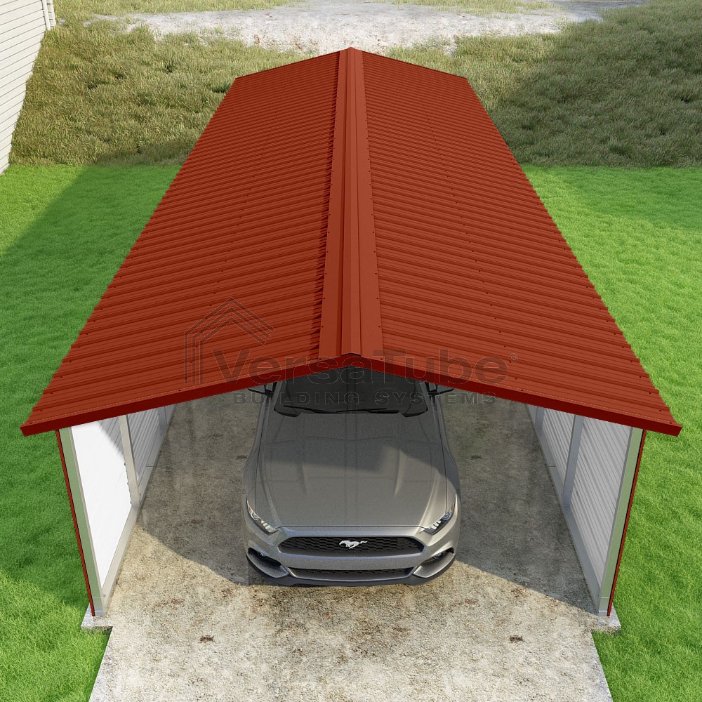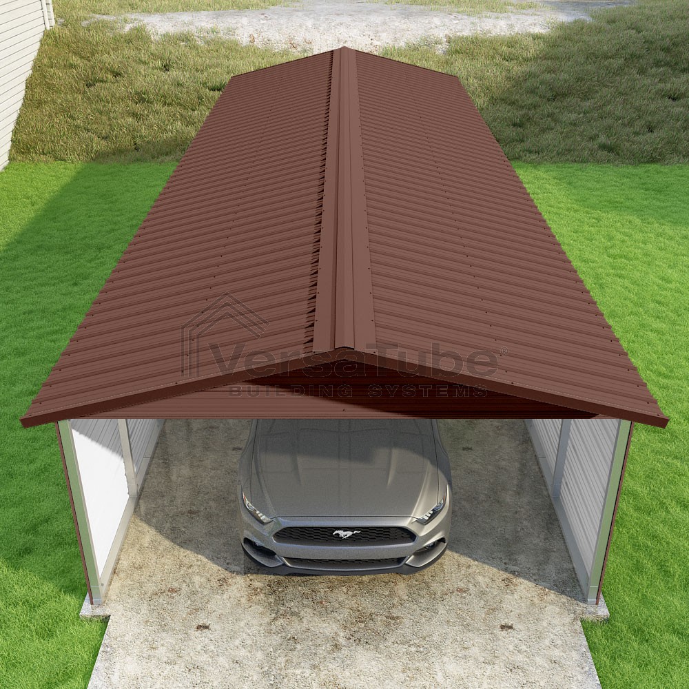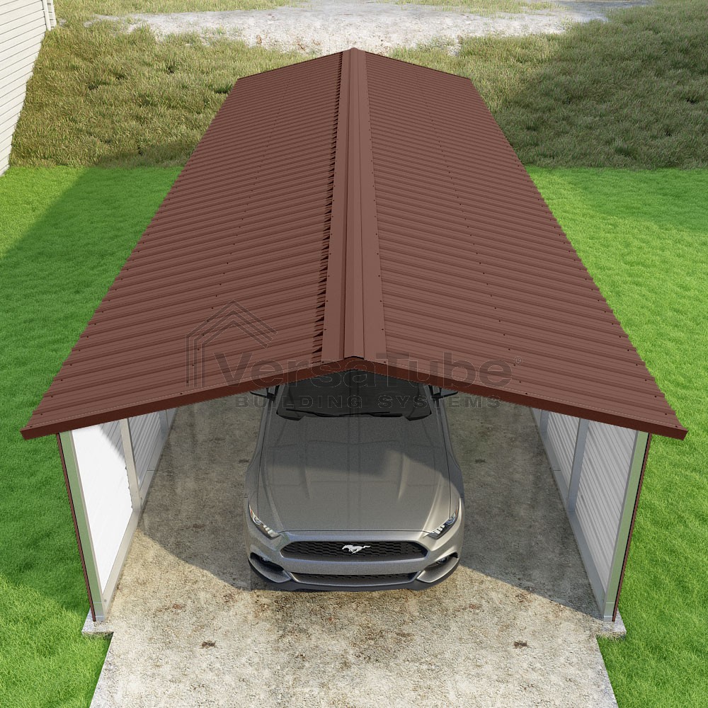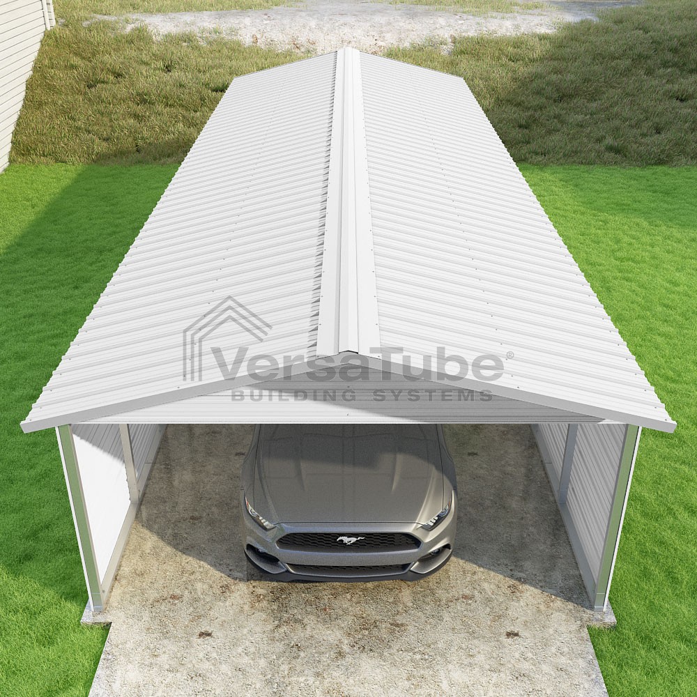 Pinnacle Series DIY carport kit features vertical sheet metal roof panels with ridge cap, gable and eave trim for an A-frame roof style and extended coverage on both ends.