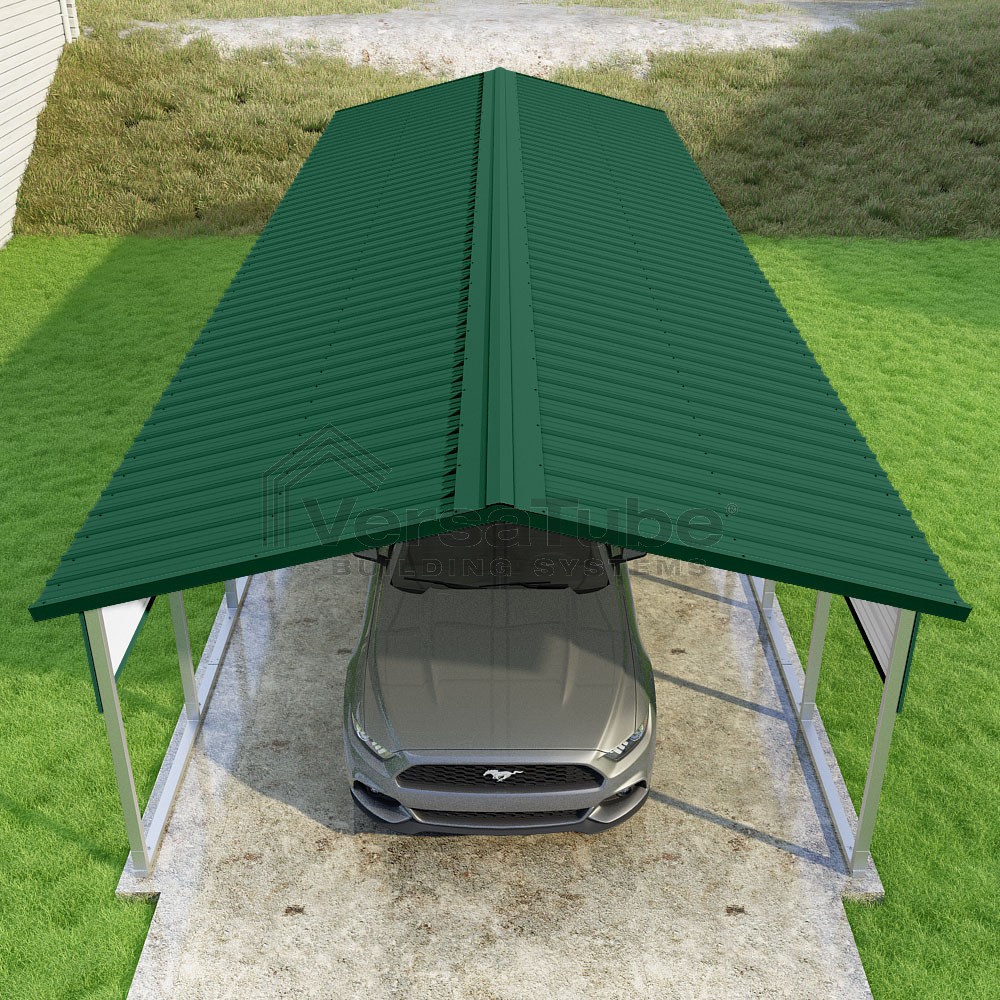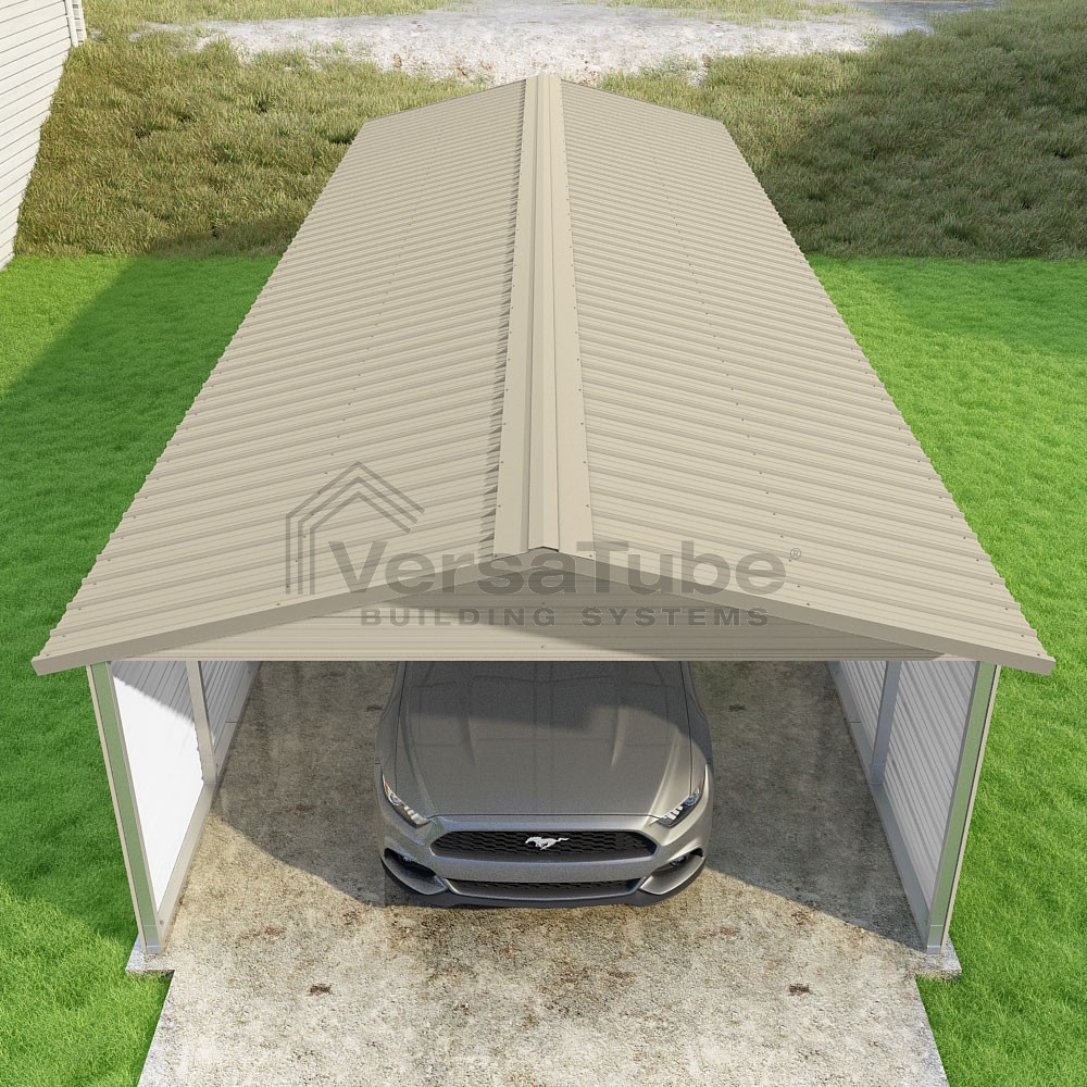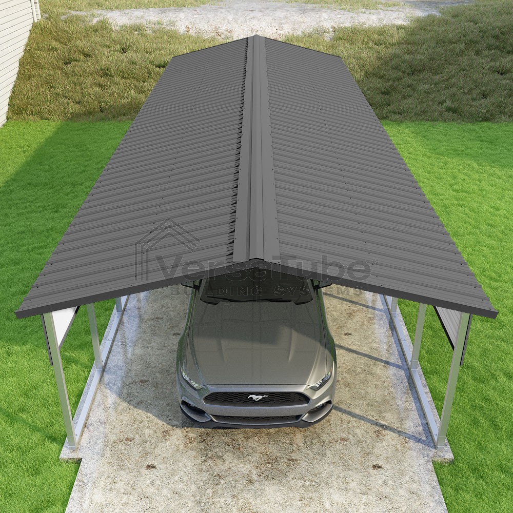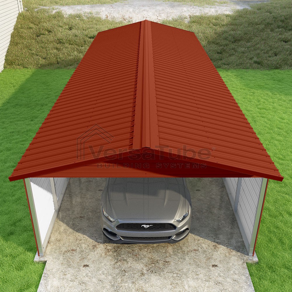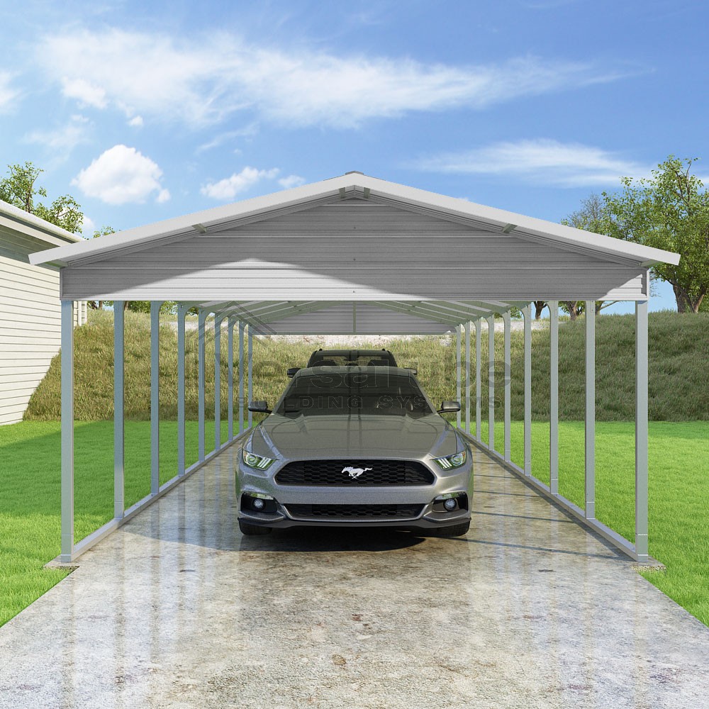 Pinnacle Series DIY carport kit features vertical sheet metal roof panels with ridge cap, gable and eave trim for an A-frame roof style and extended coverage on both ends.