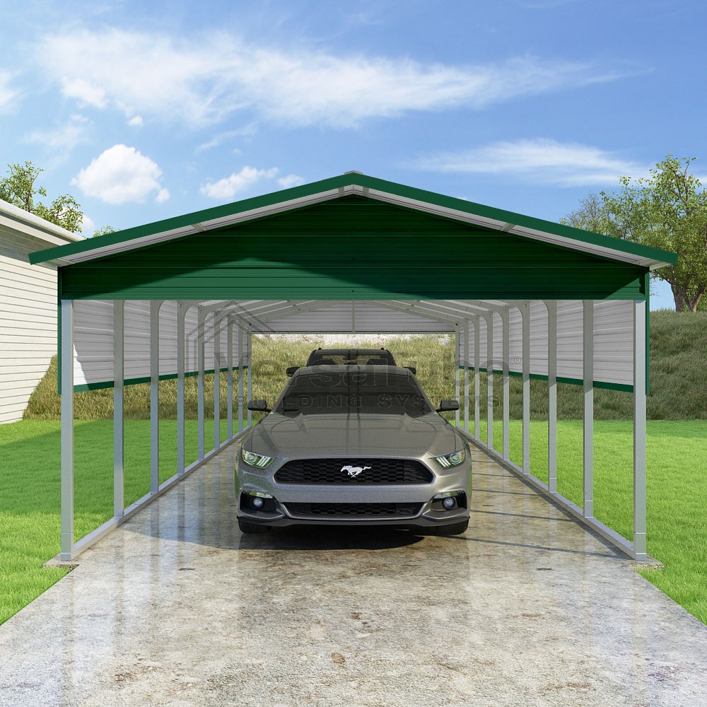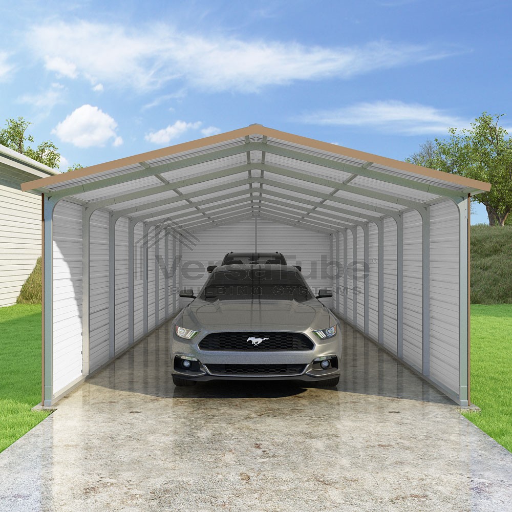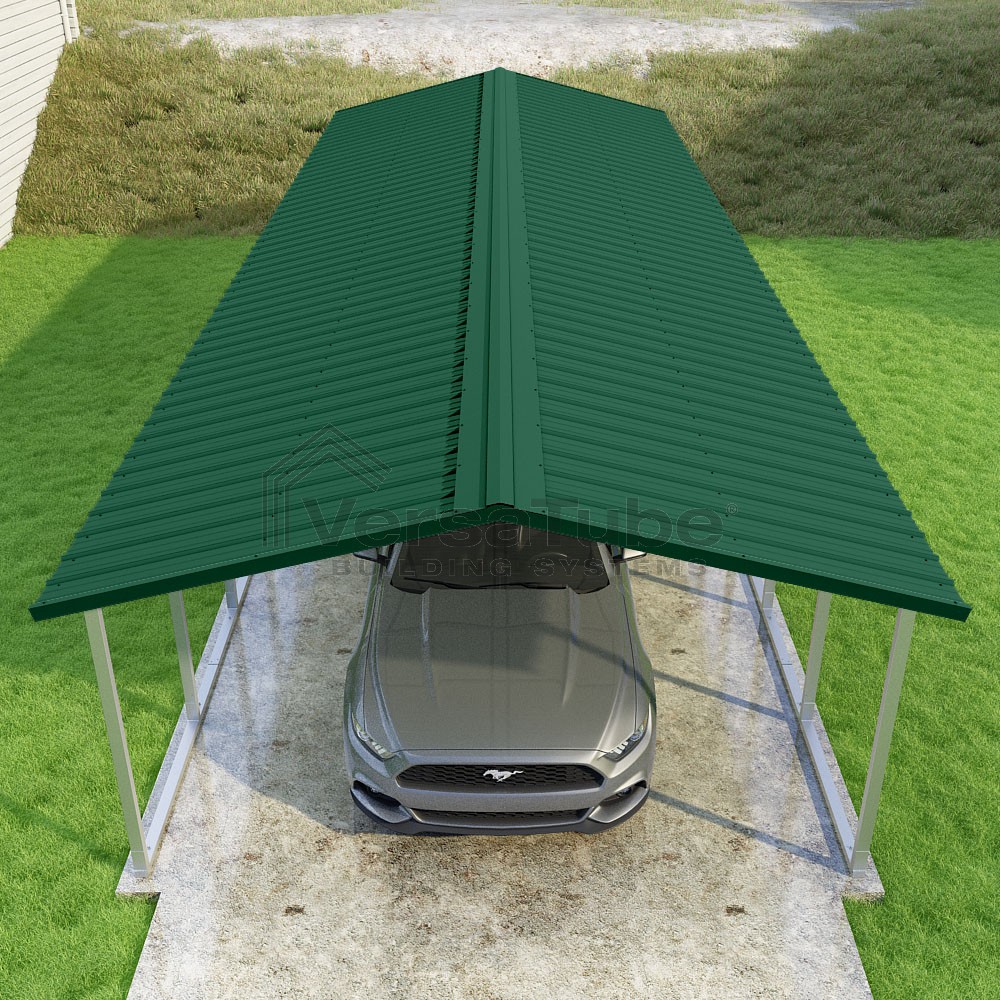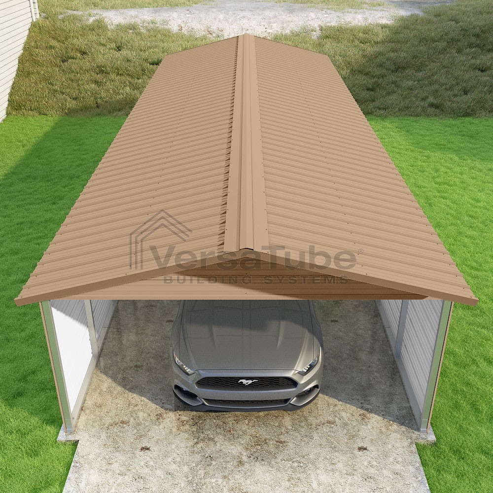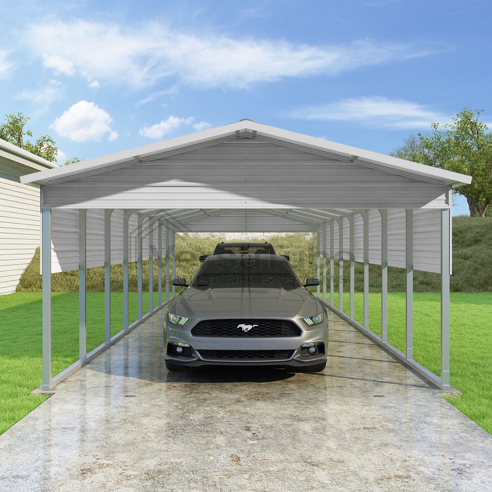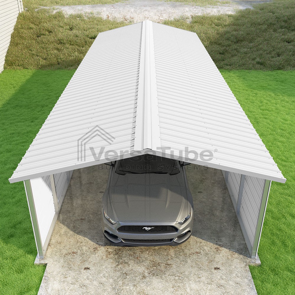 Pinnacle Series DIY carport kit features vertical sheet metal roof panels with ridge cap, gable and eave trim for an A-frame roof style and extended coverage on both ends.