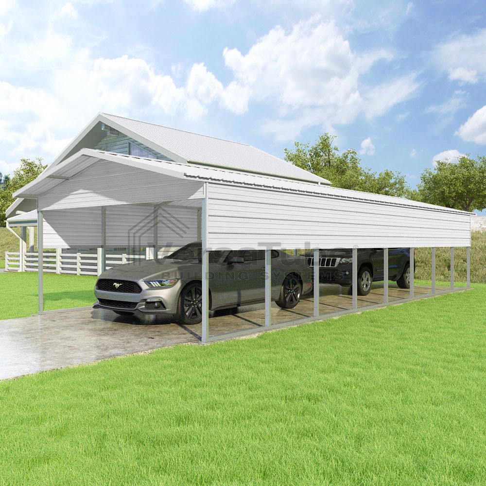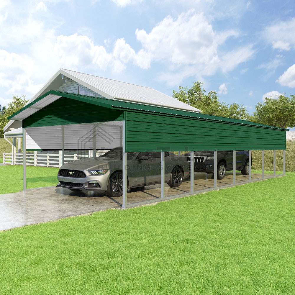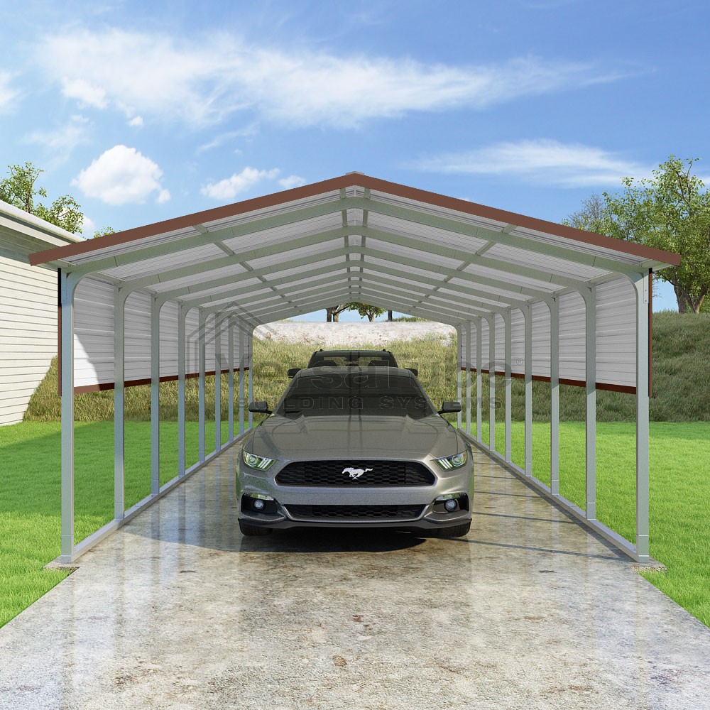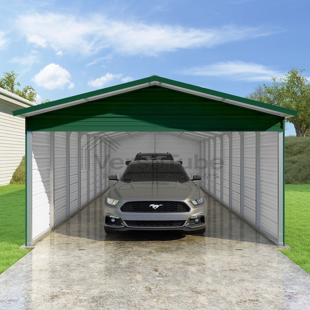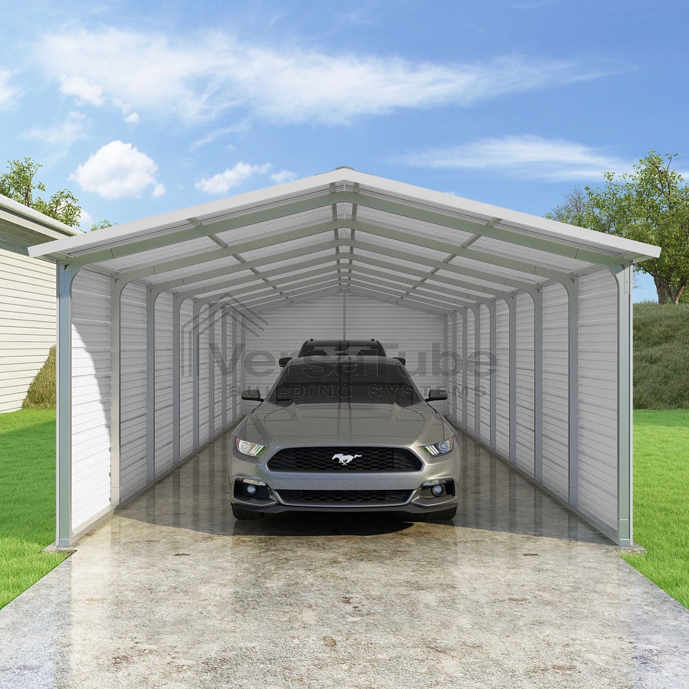 Pinnacle Series DIY carport kit features vertical sheet metal roof panels with ridge cap, gable and eave trim for an A-frame roof style and extended coverage on both ends.