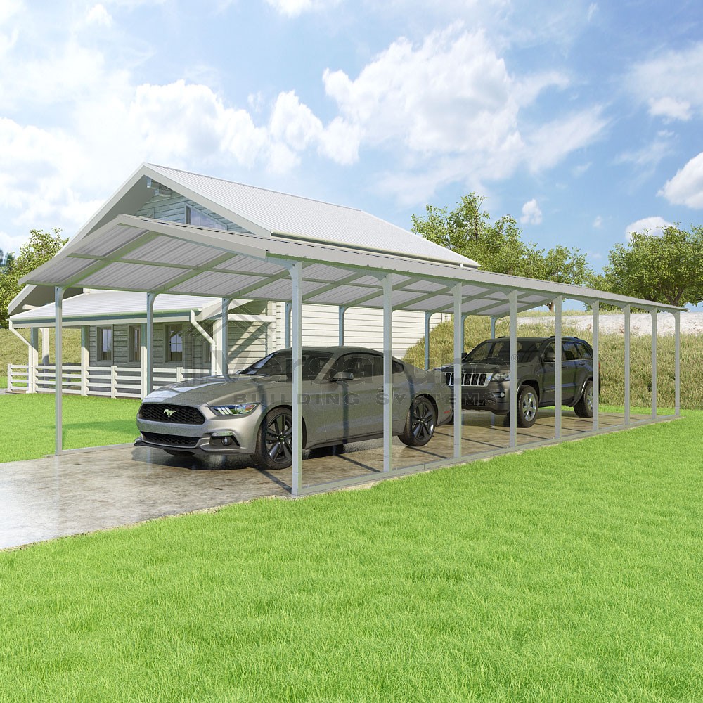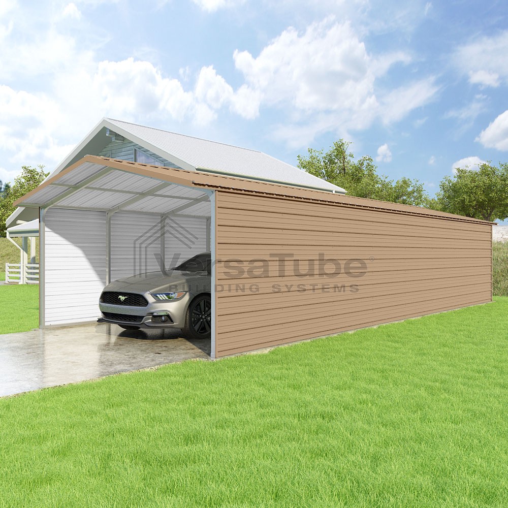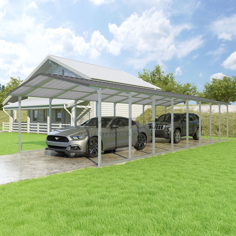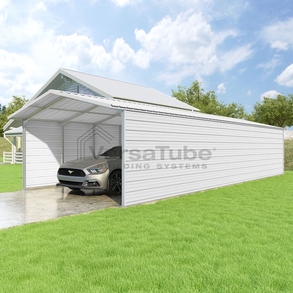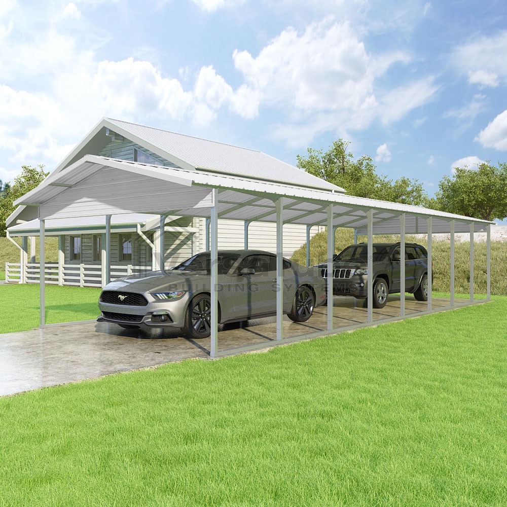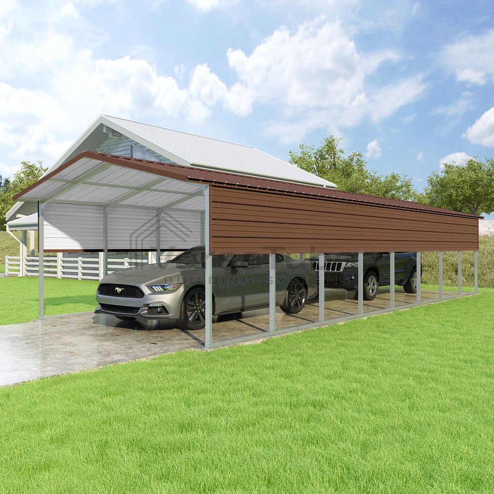 Pinnacle Series DIY carport kit features vertical sheet metal roof panels with ridge cap, gable and eave trim for an A-frame roof style and extended coverage on both ends.
