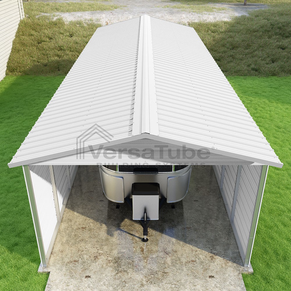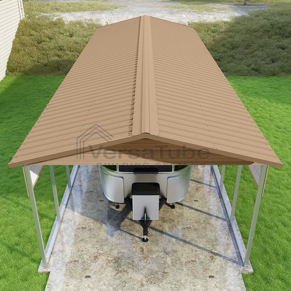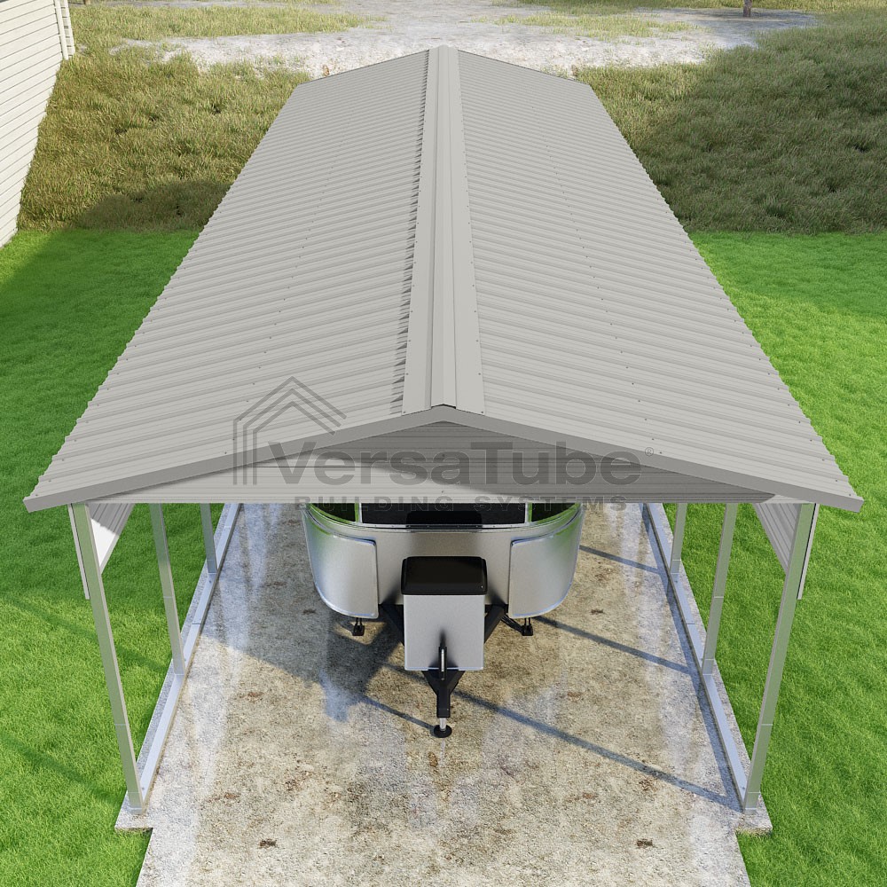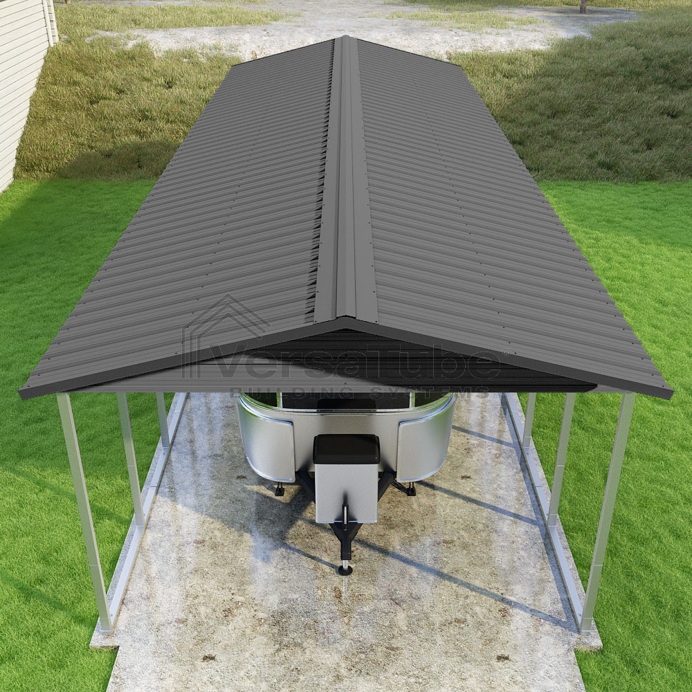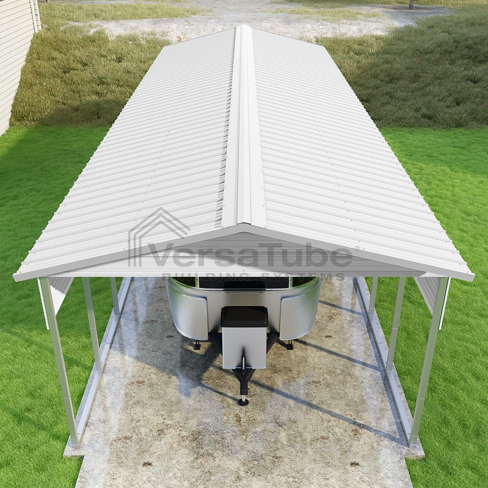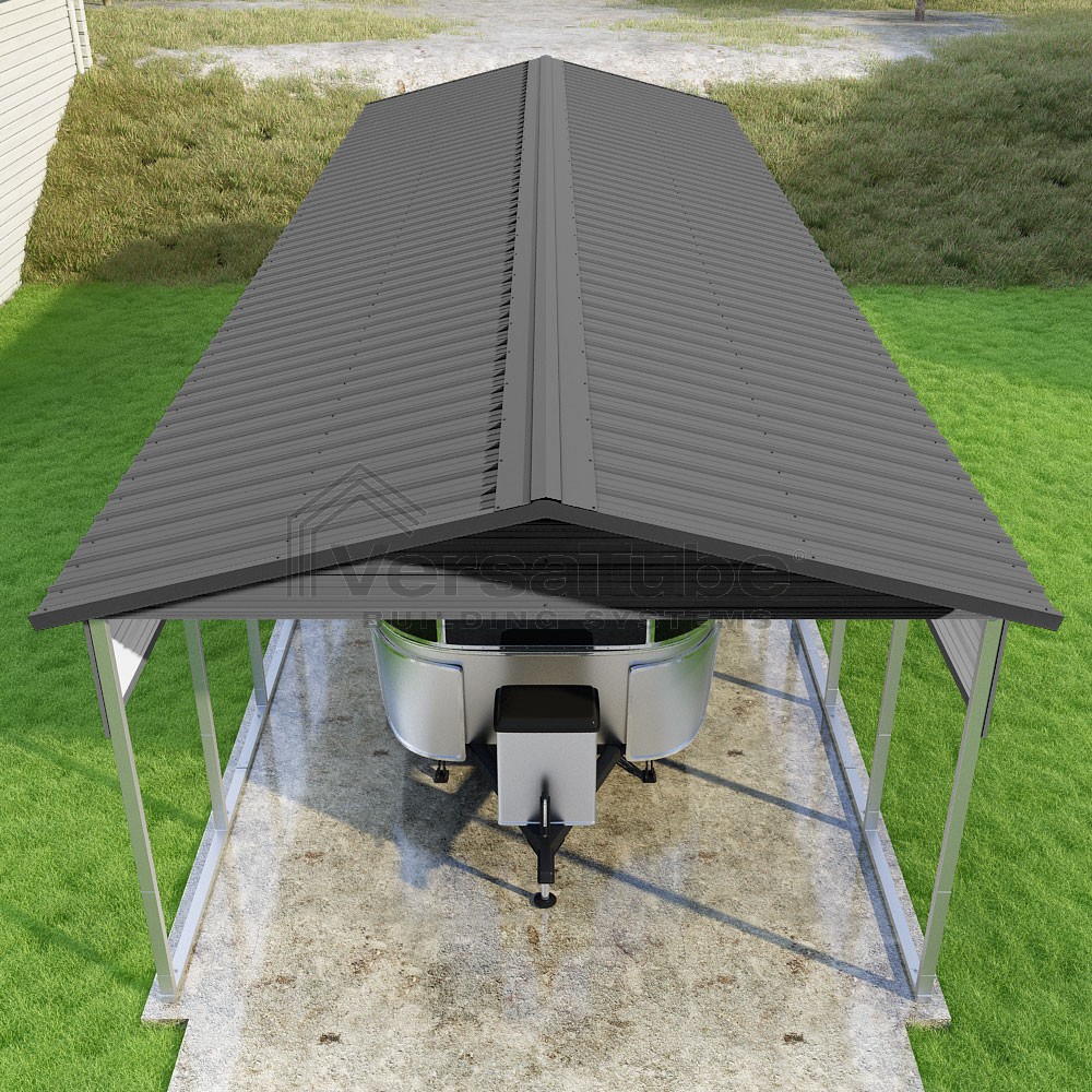 Pinnacle Series DIY carport kit features vertical sheet metal roof panels with ridge cap, gable and eave trim for an A-frame roof style and extended coverage on both ends.