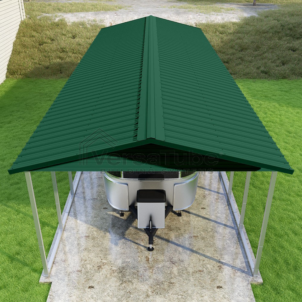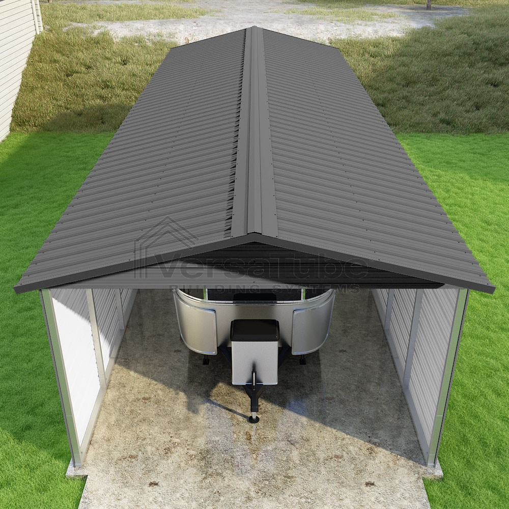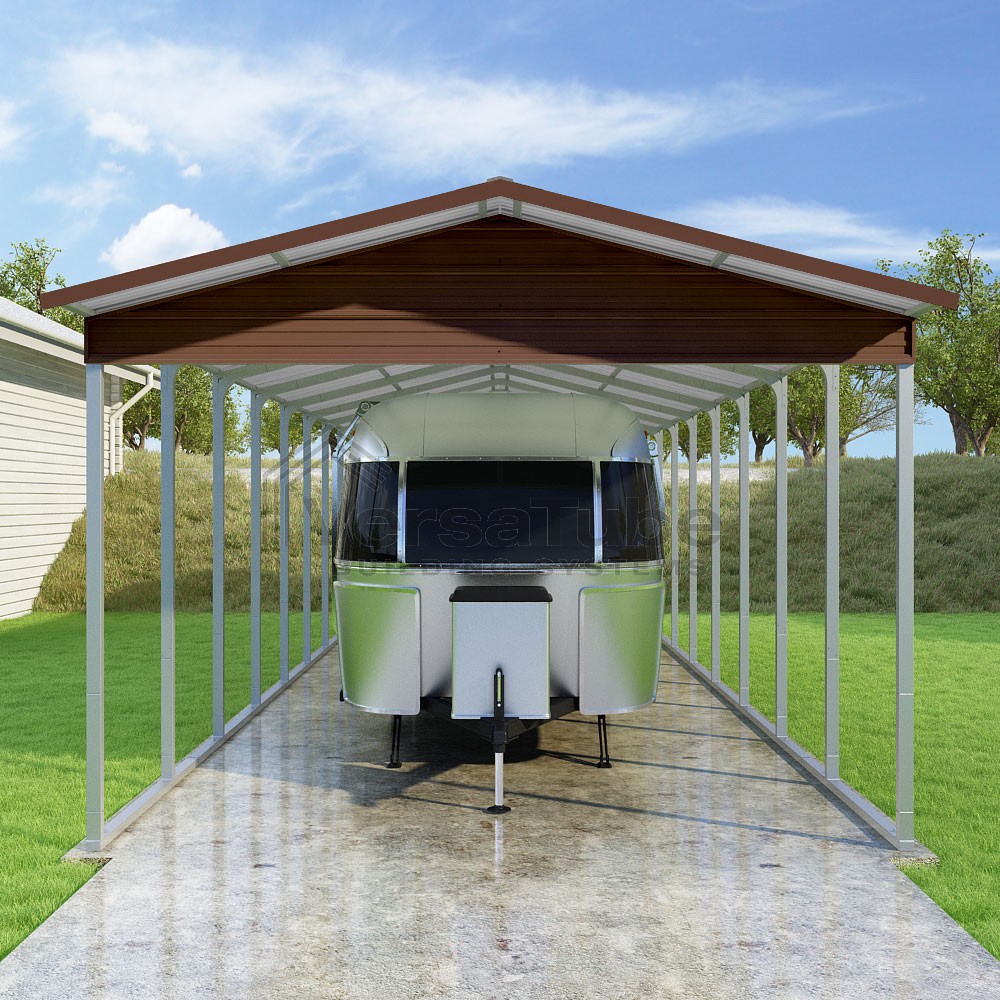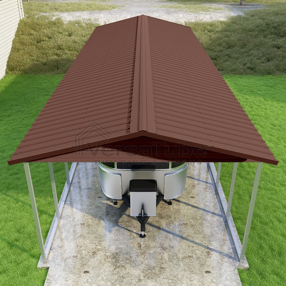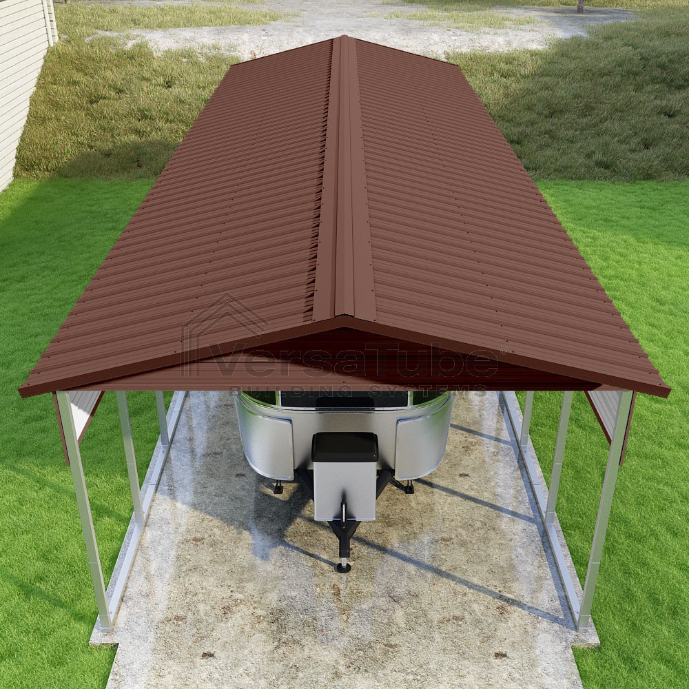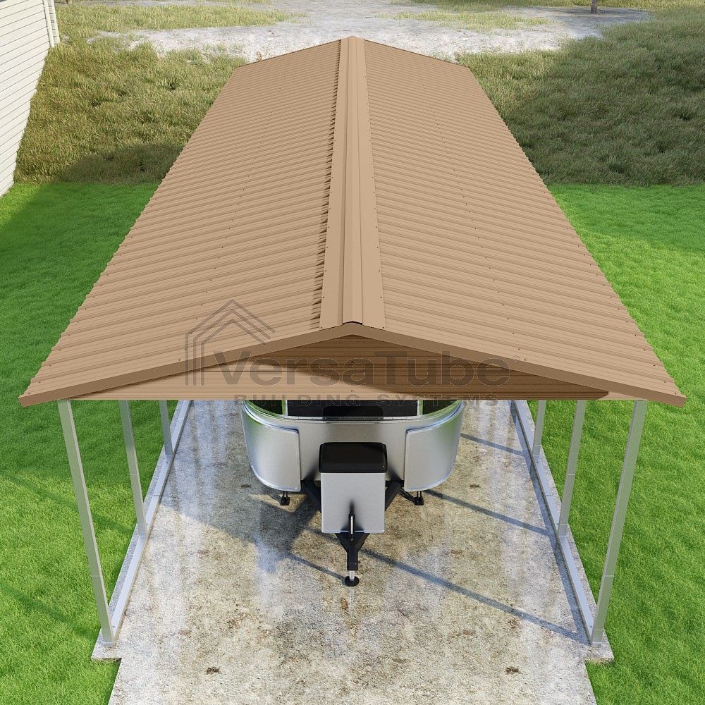 Pinnacle Series DIY carport kit features vertical sheet metal roof panels with ridge cap, gable and eave trim for an A-frame roof style and extended coverage on both ends.
