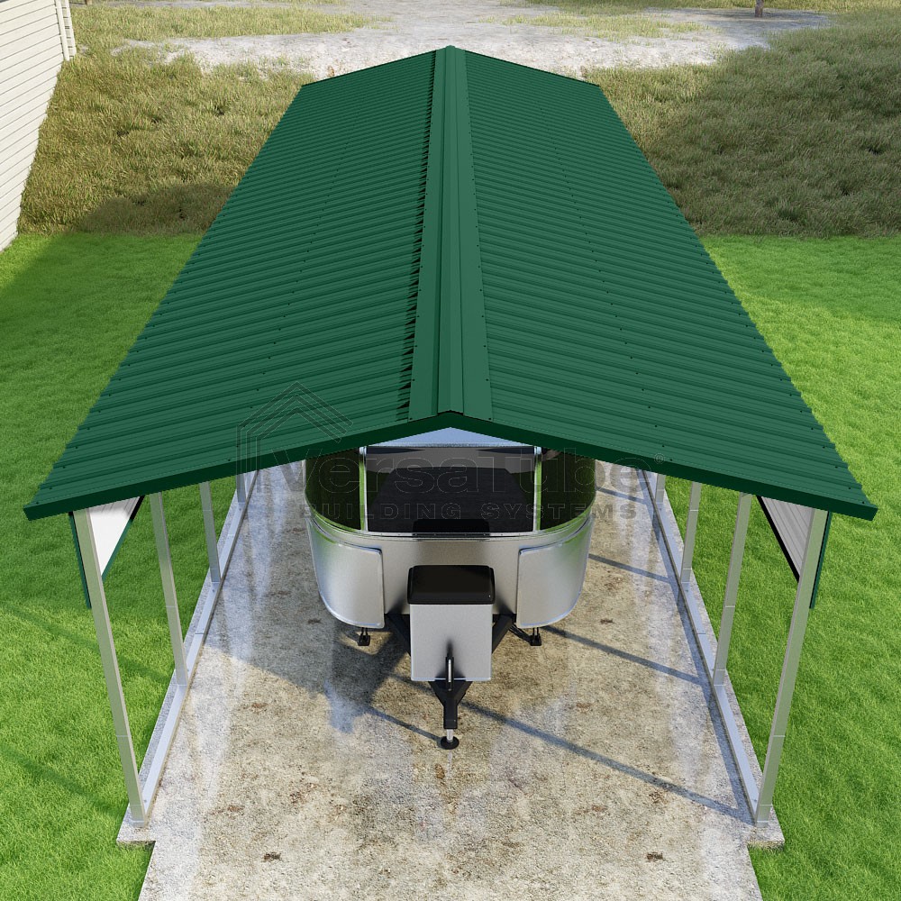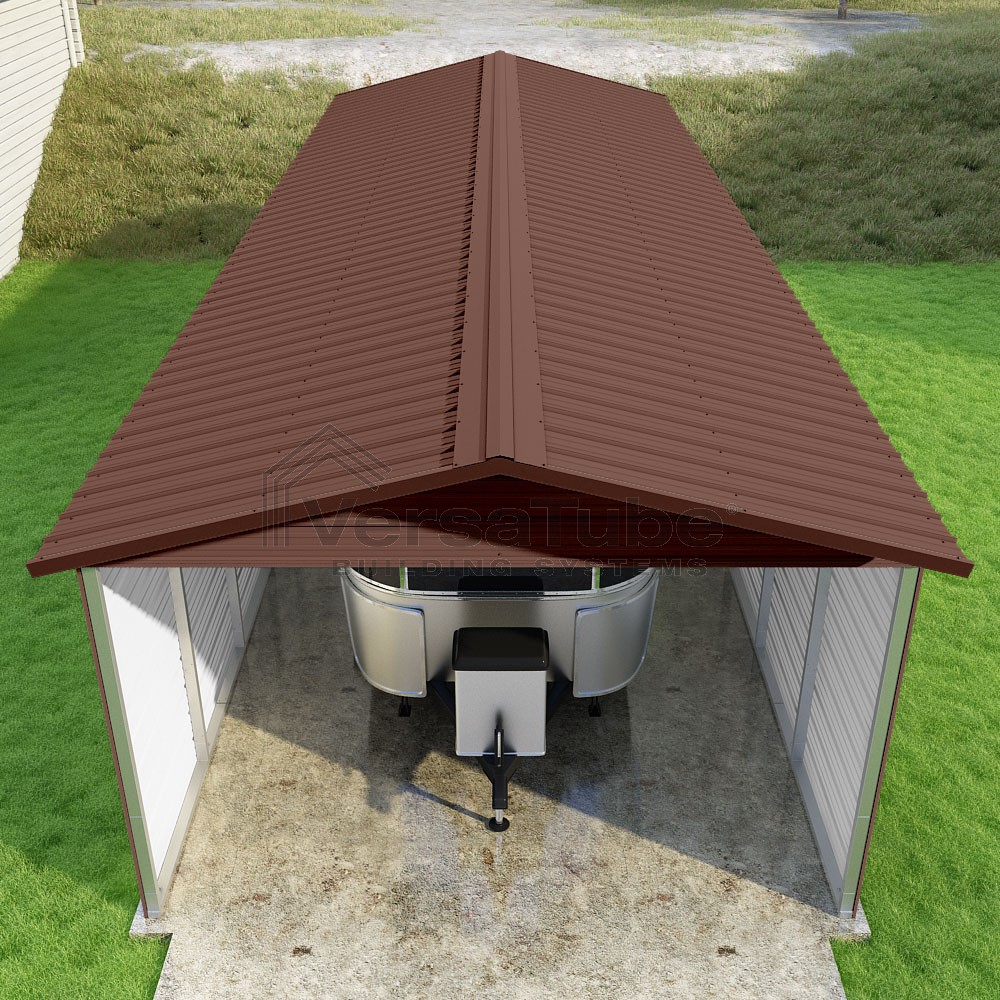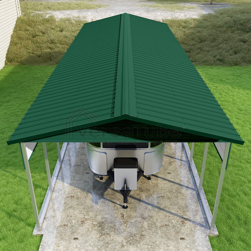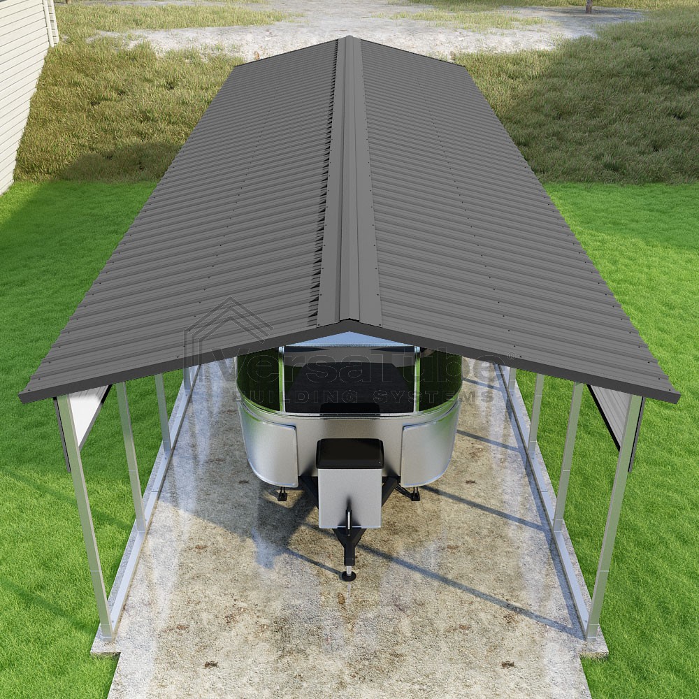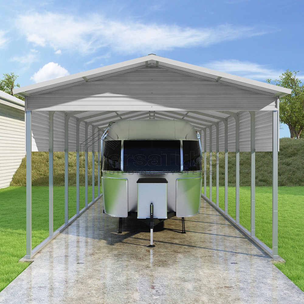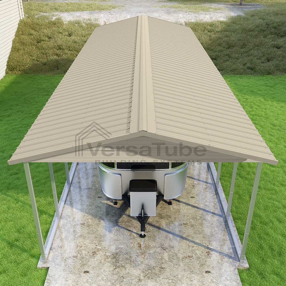 Pinnacle Series DIY carport kit features vertical sheet metal roof panels with ridge cap, gable and eave trim for an A-frame roof style and extended coverage on both ends.
