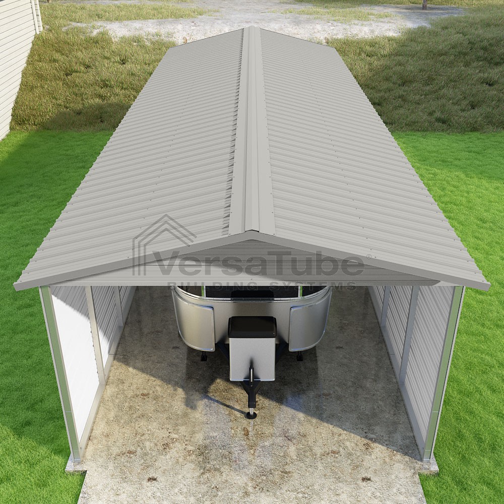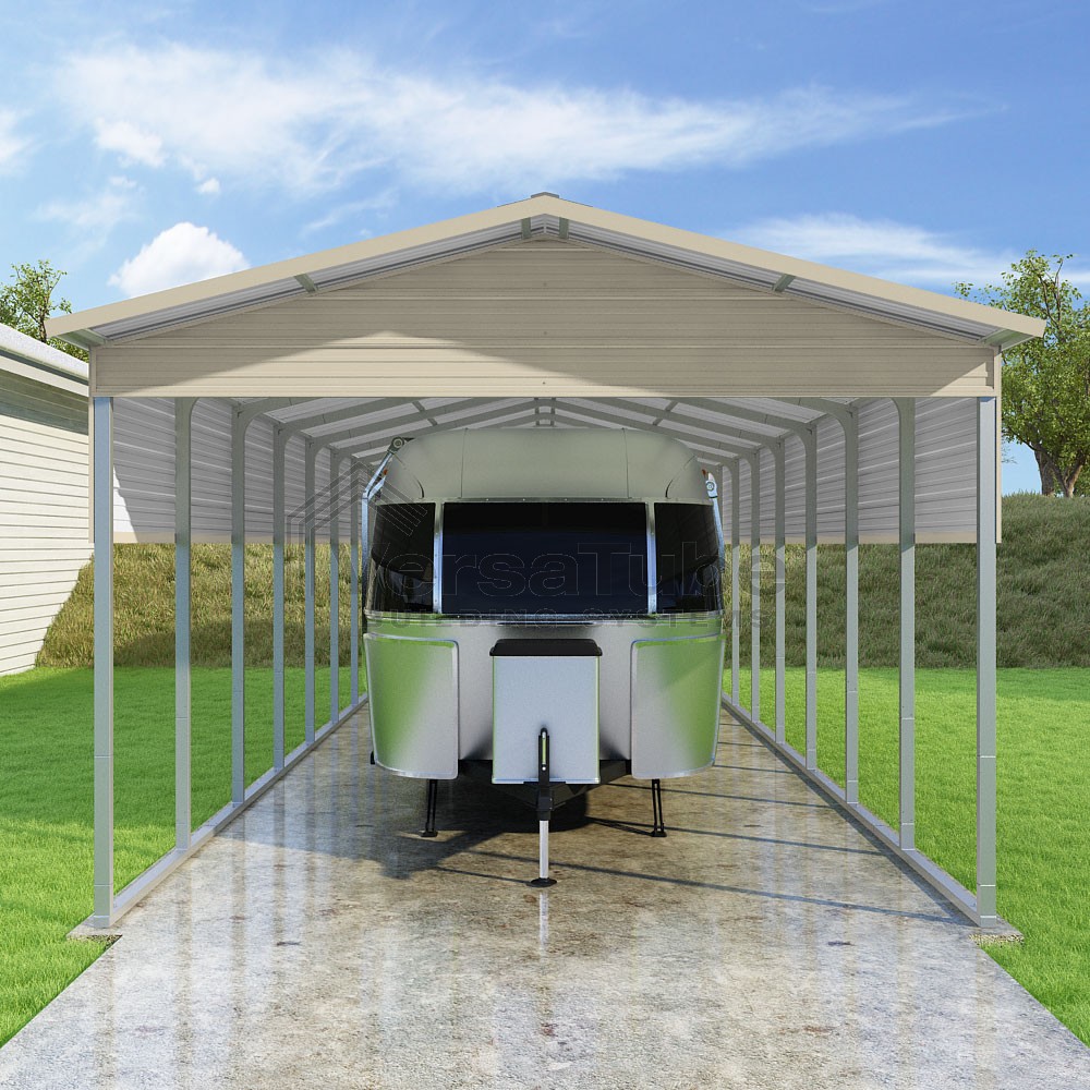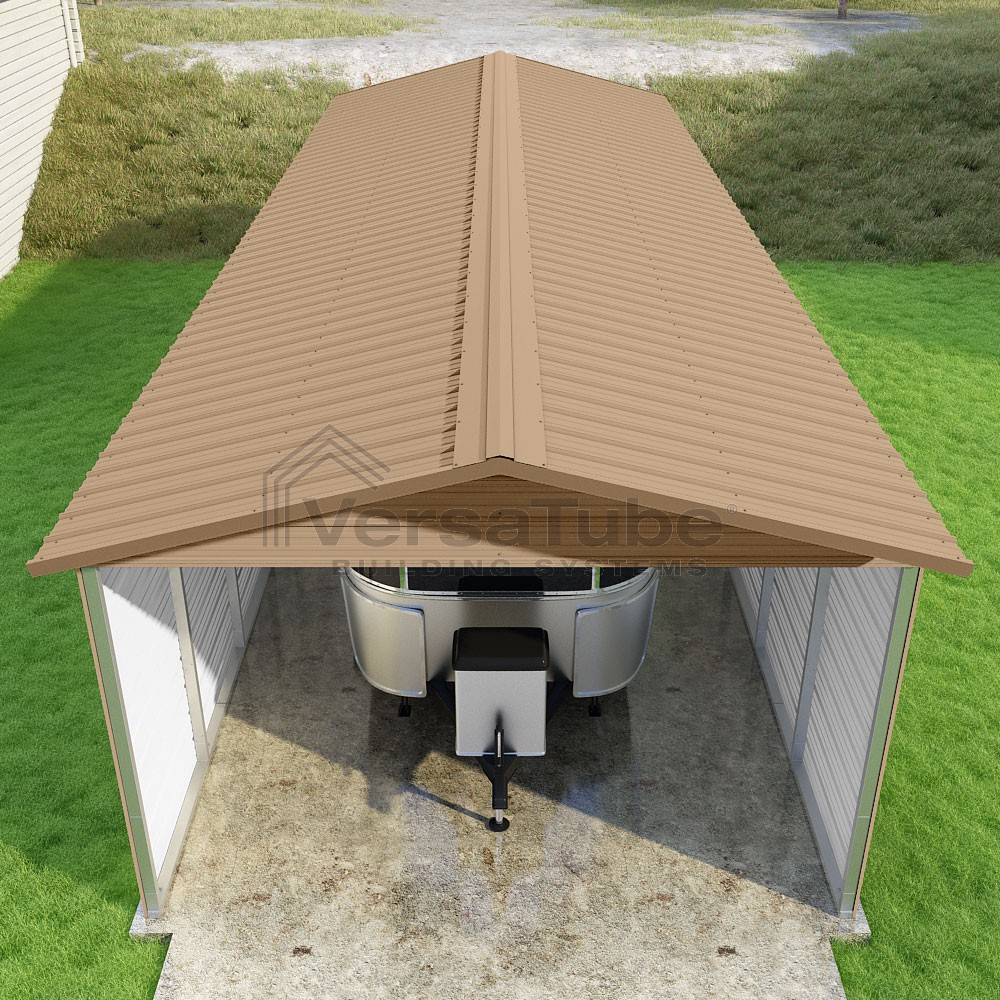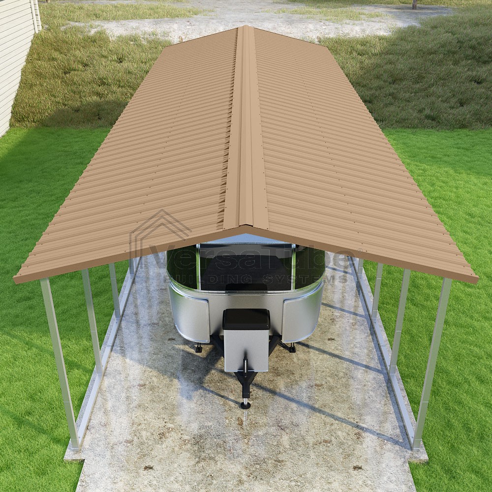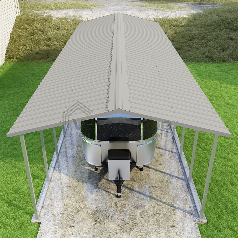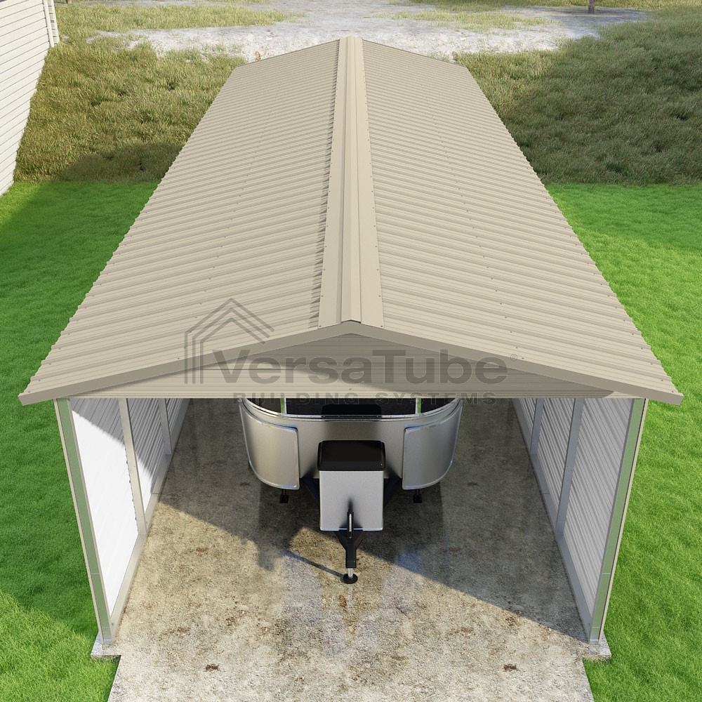 Pinnacle Series DIY carport kit features vertical sheet metal roof panels with ridge cap, gable and eave trim for an A-frame roof style and extended coverage on both ends.
