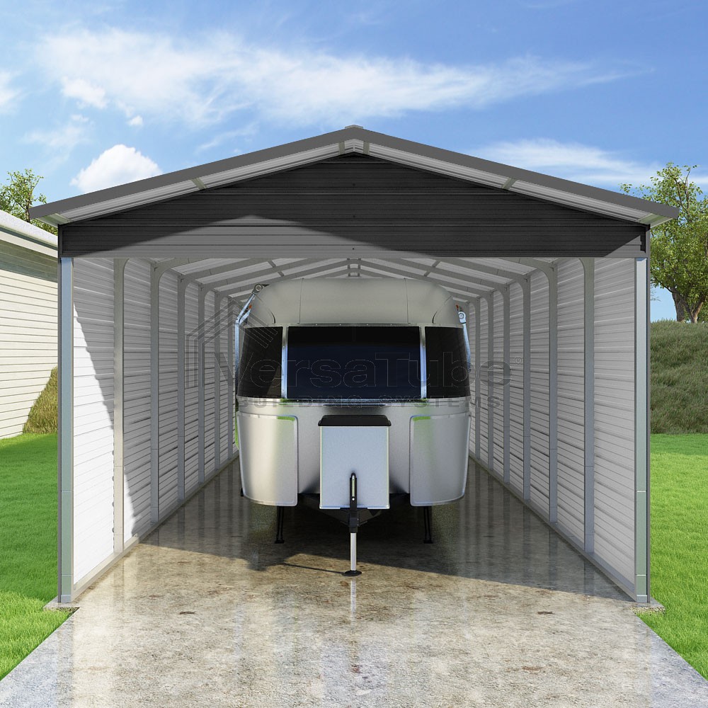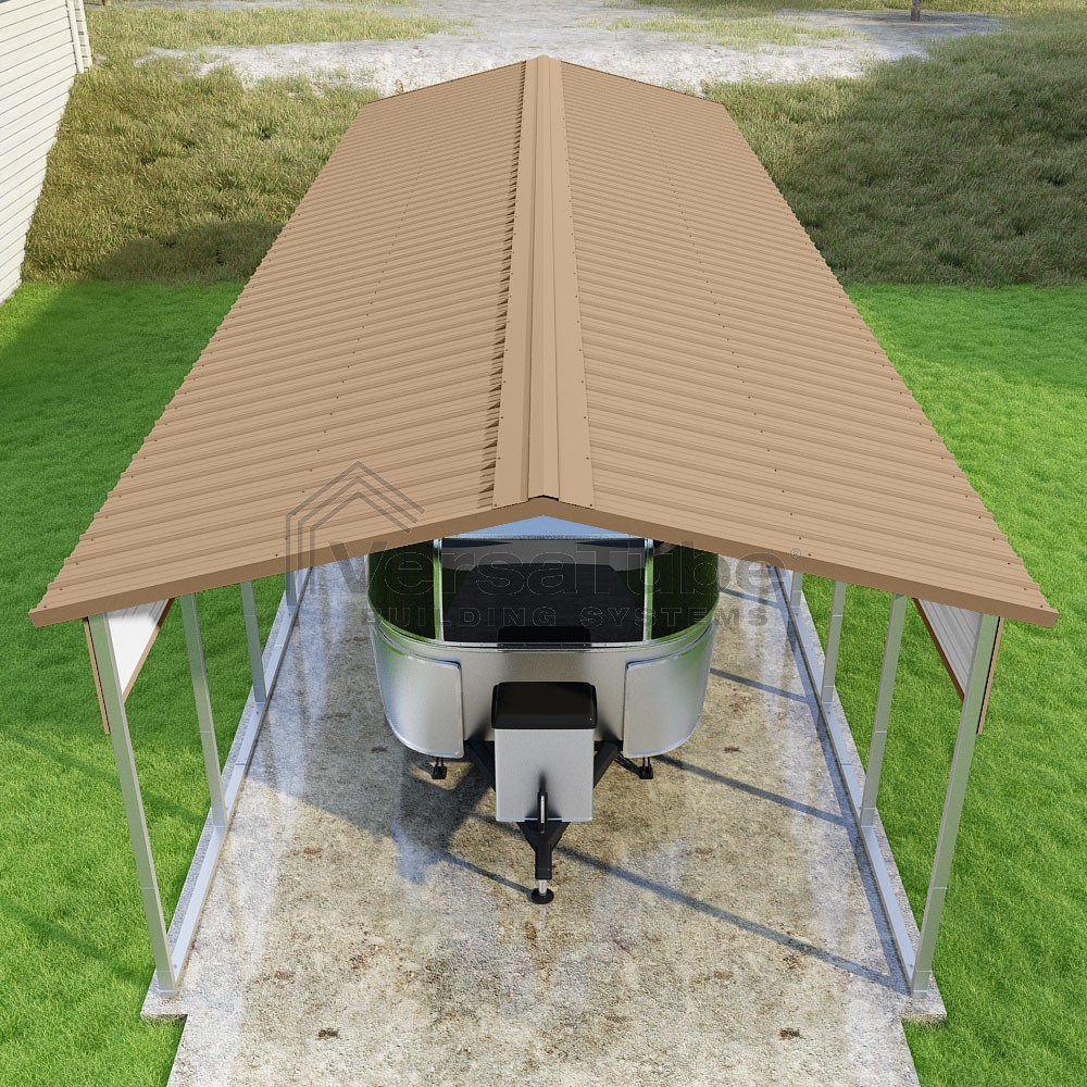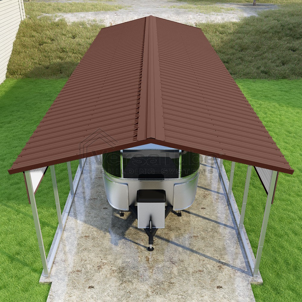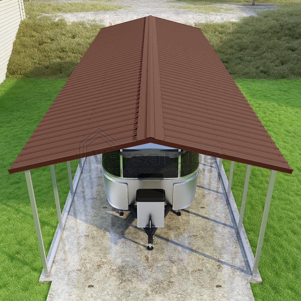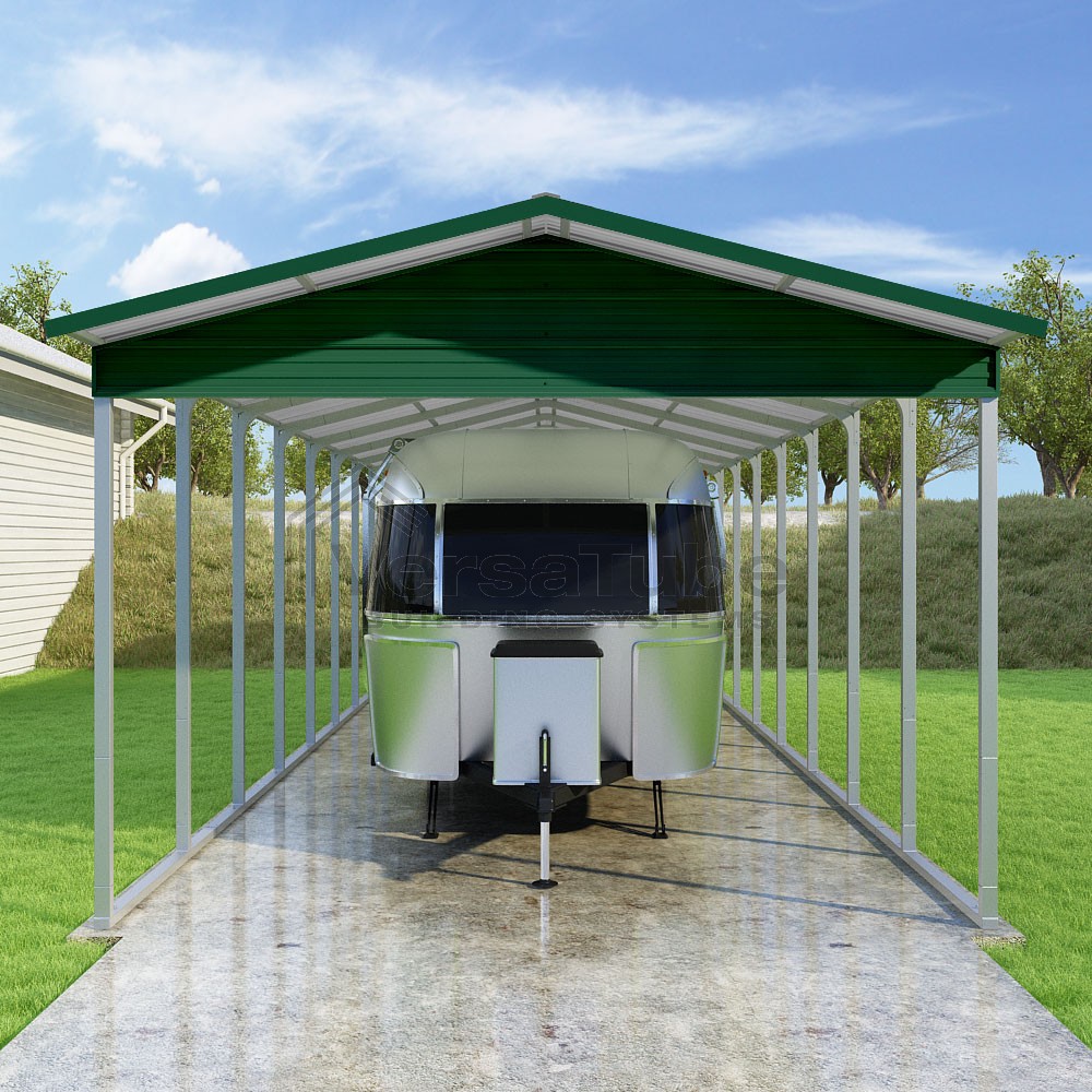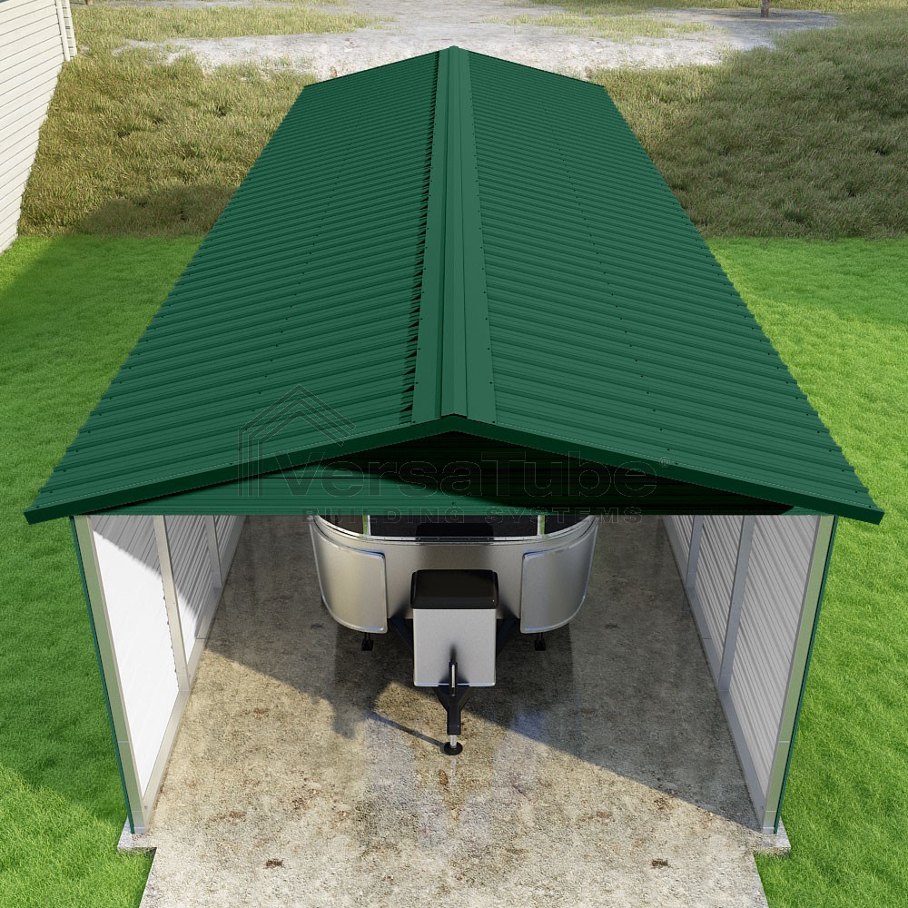 Pinnacle Series DIY carport kit features vertical sheet metal roof panels with ridge cap, gable and eave trim for an A-frame roof style and extended coverage on both ends.