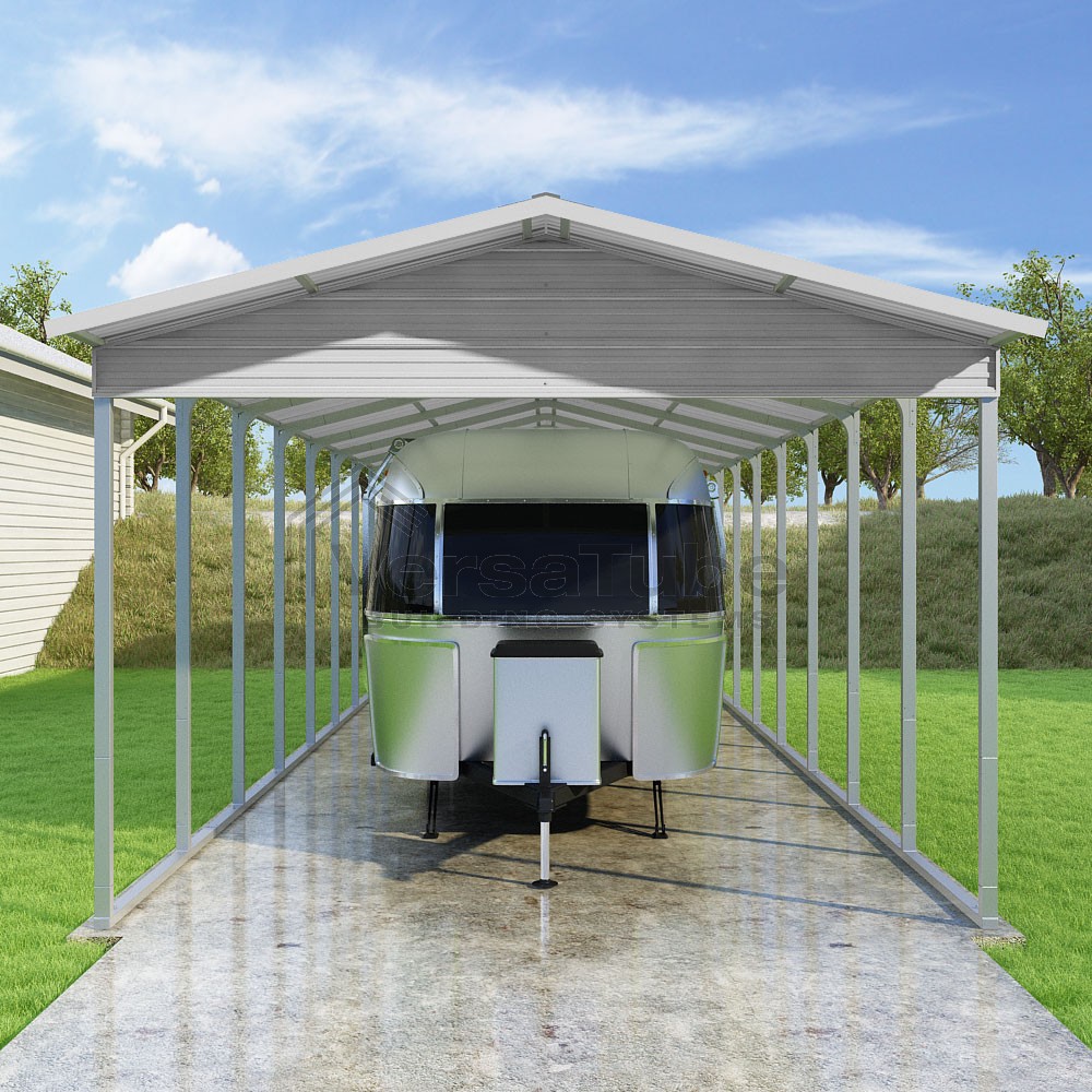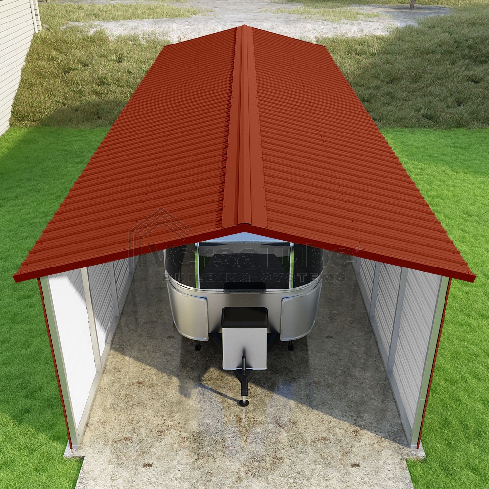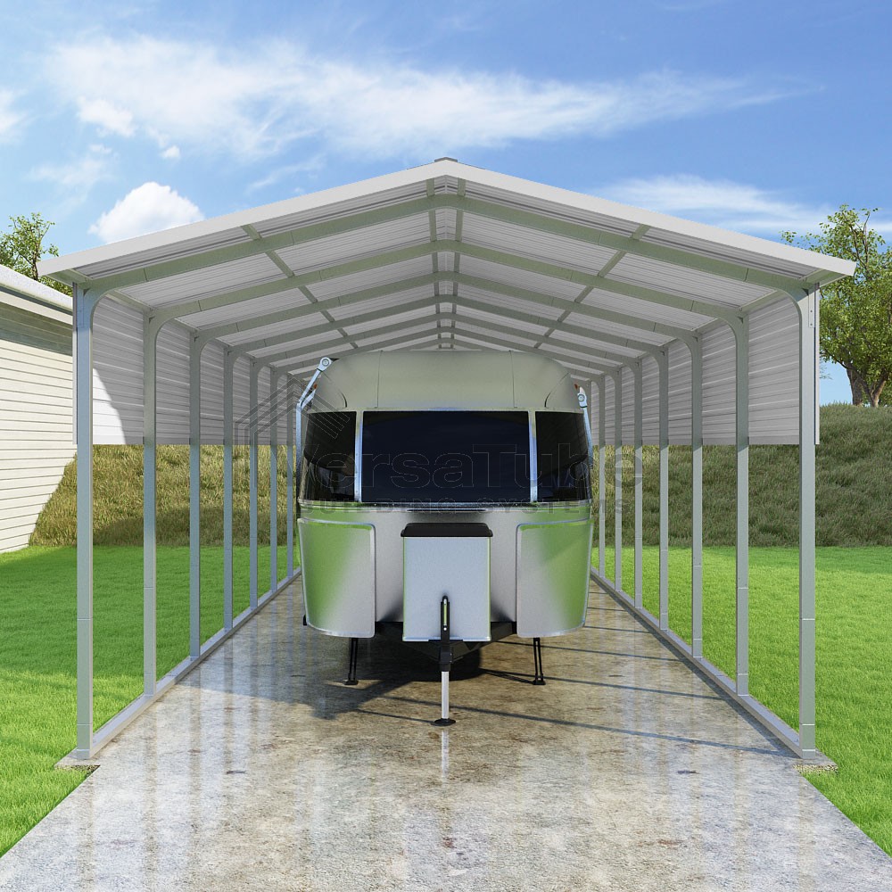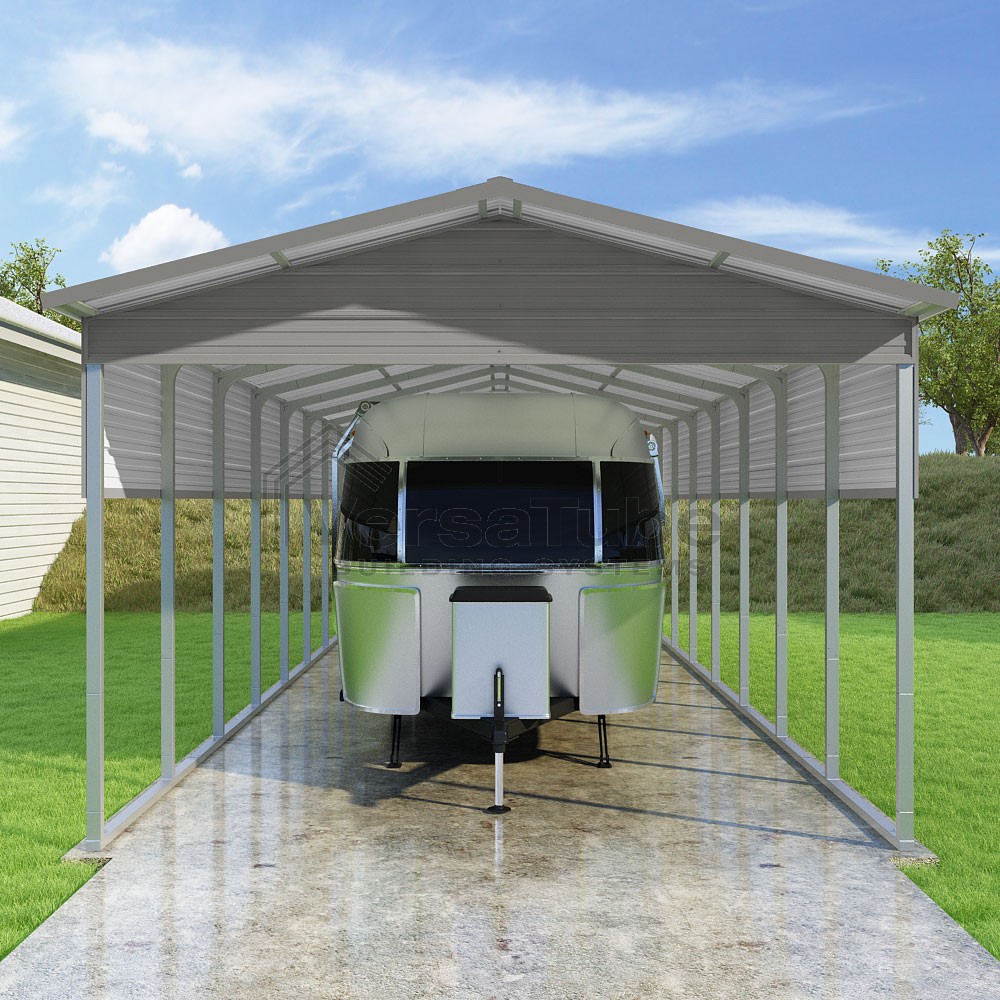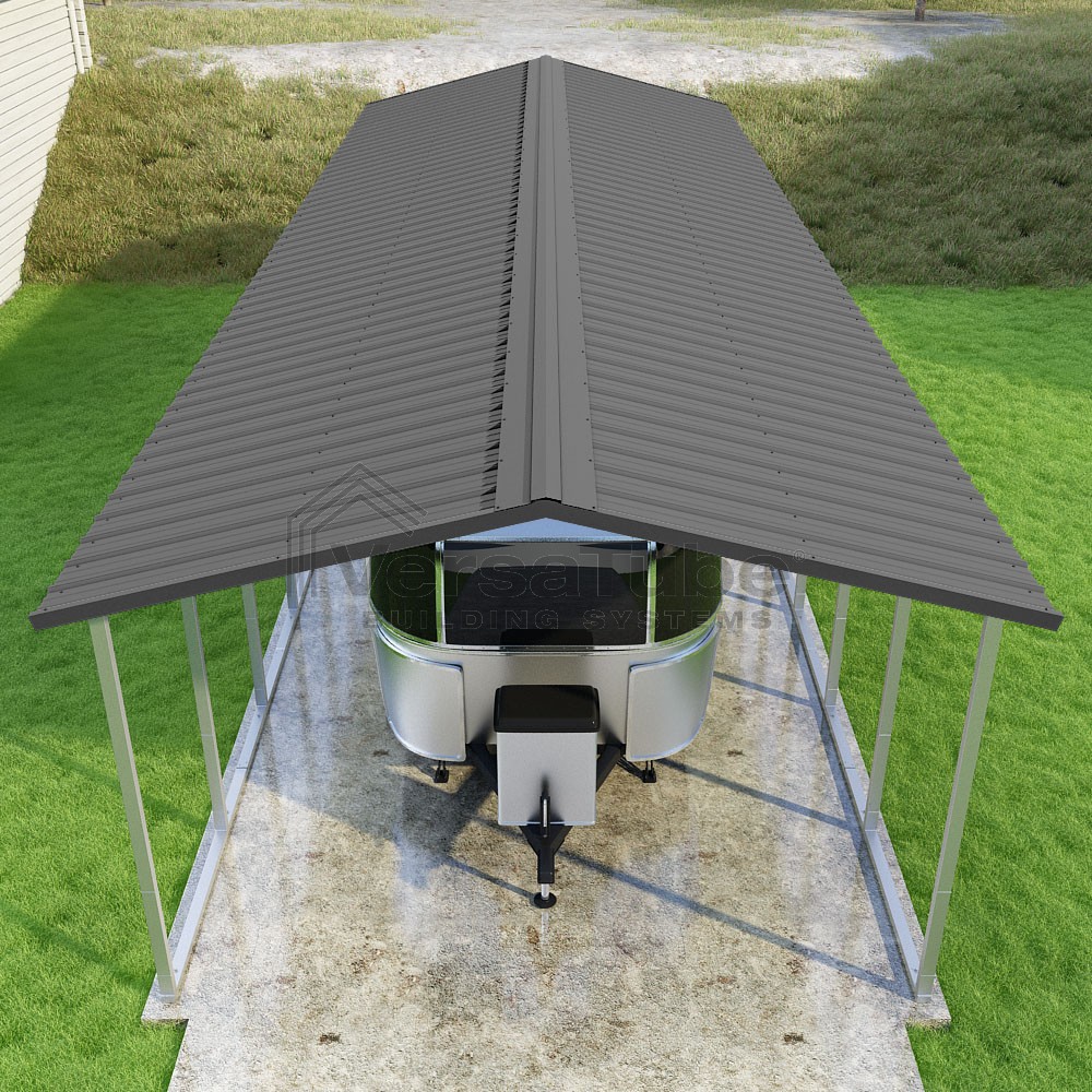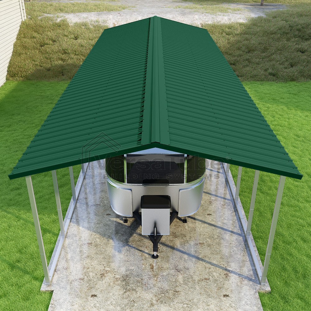Pinnacle Series DIY carport kit features vertical sheet metal roof panels with ridge cap, gable and eave trim for an A-frame roof style and extended coverage on both ends.