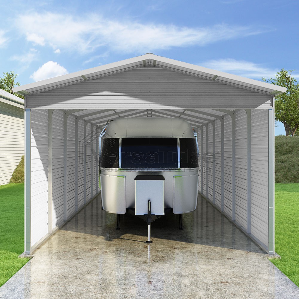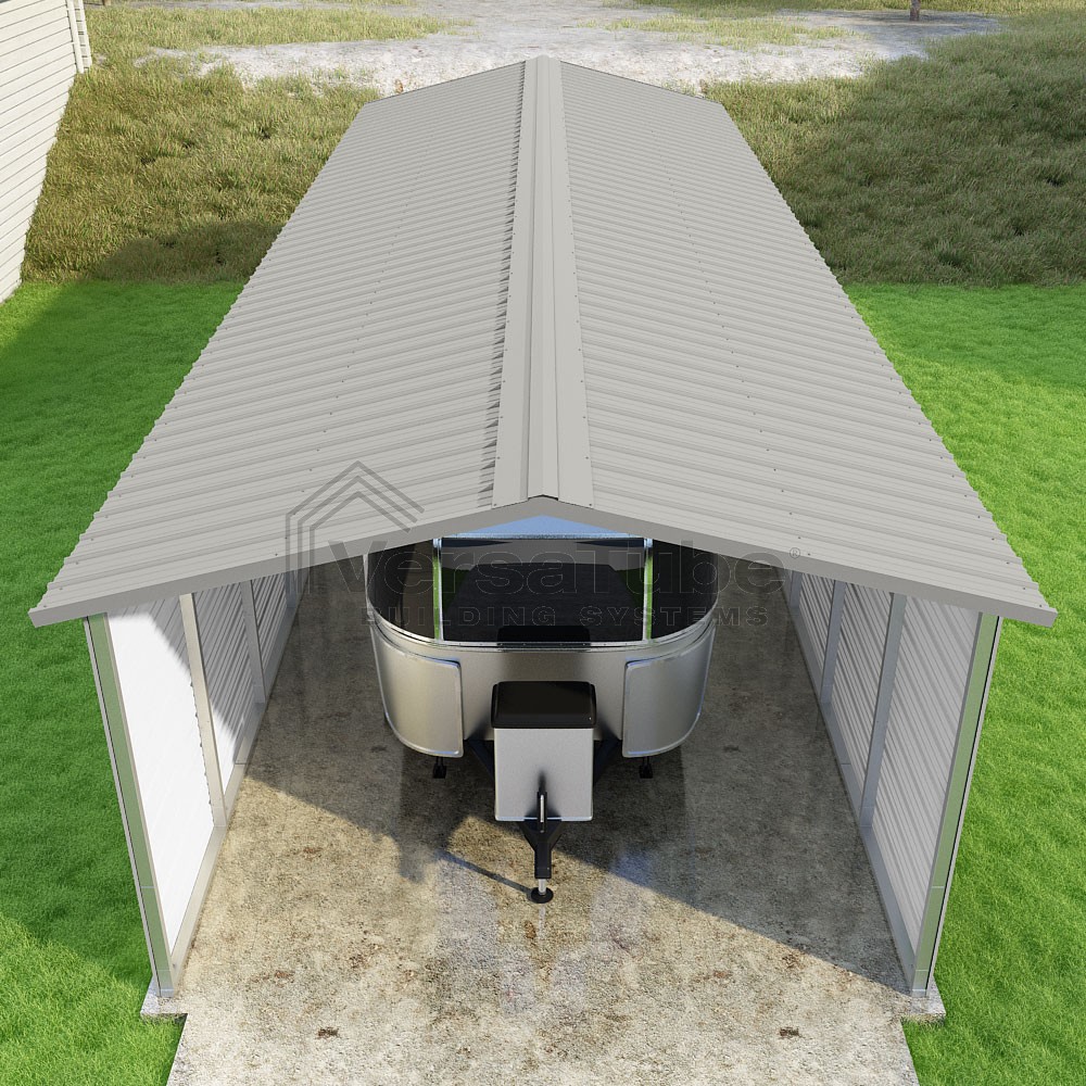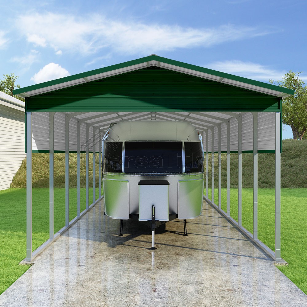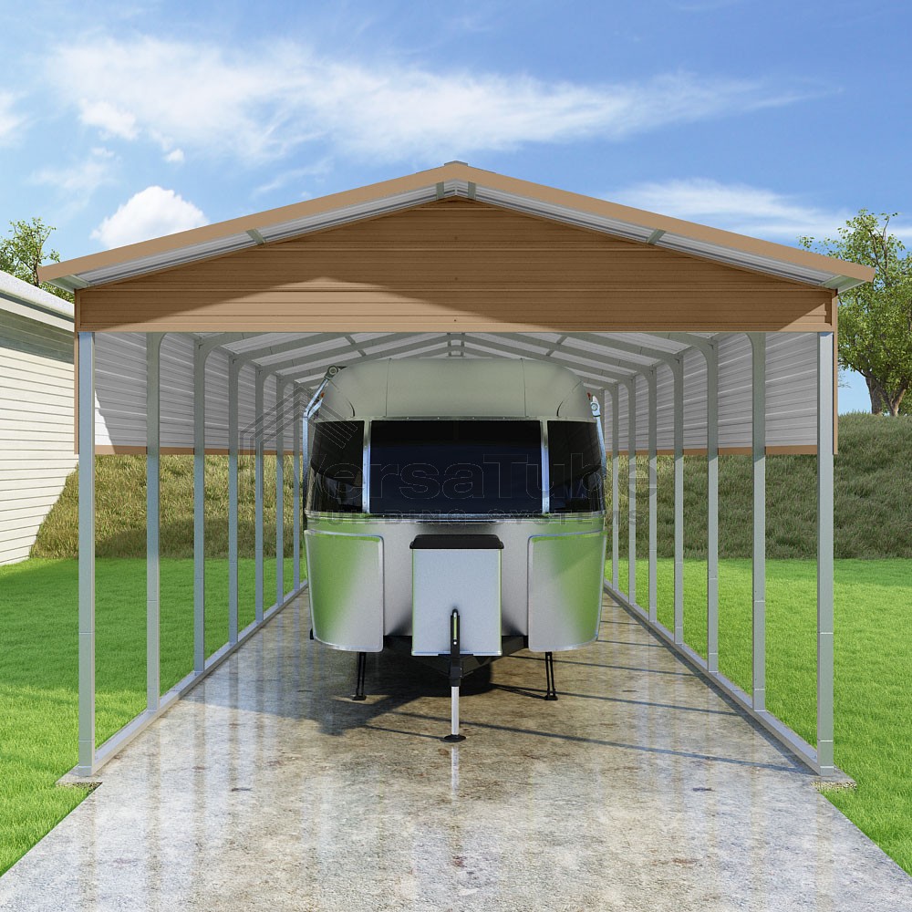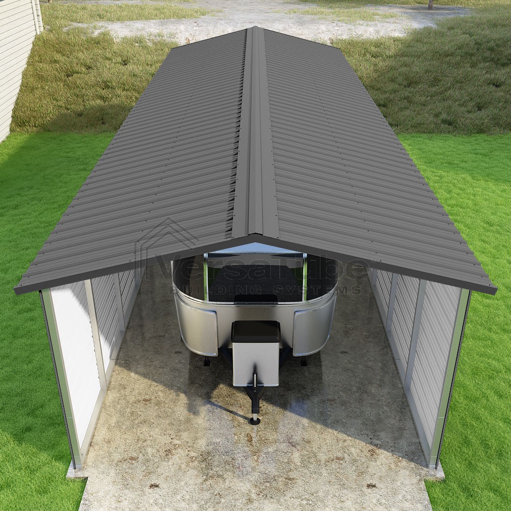 Pinnacle Series DIY carport kit features vertical sheet metal roof panels with ridge cap, gable and eave trim for an A-frame roof style and extended coverage on both ends.