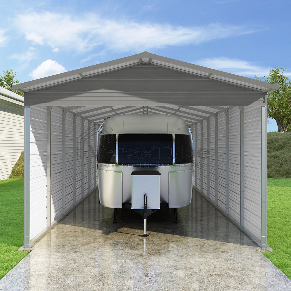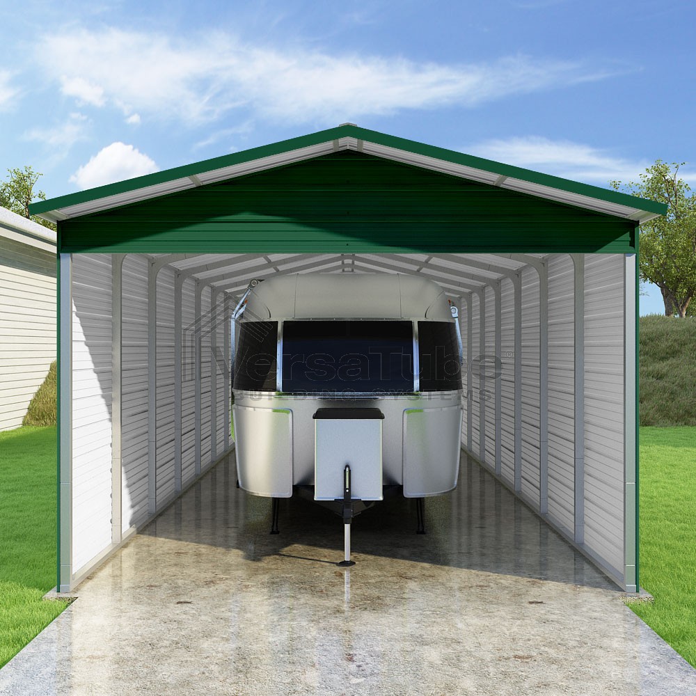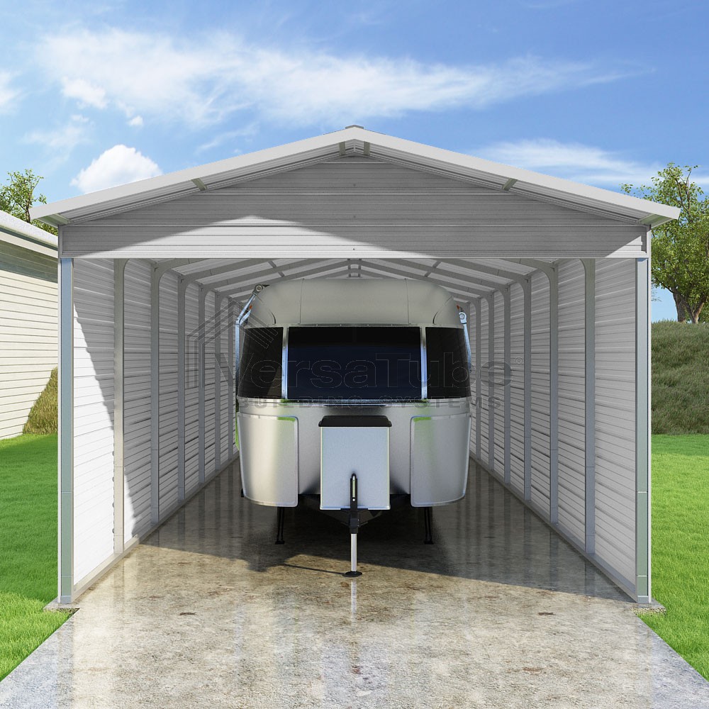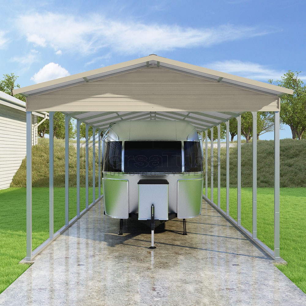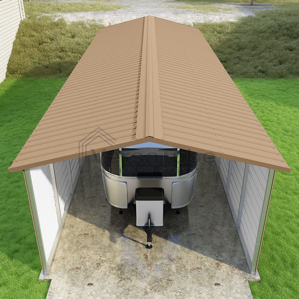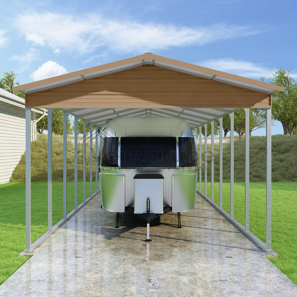 Pinnacle Series DIY carport kit features vertical sheet metal roof panels with ridge cap, gable and eave trim for an A-frame roof style and extended coverage on both ends.