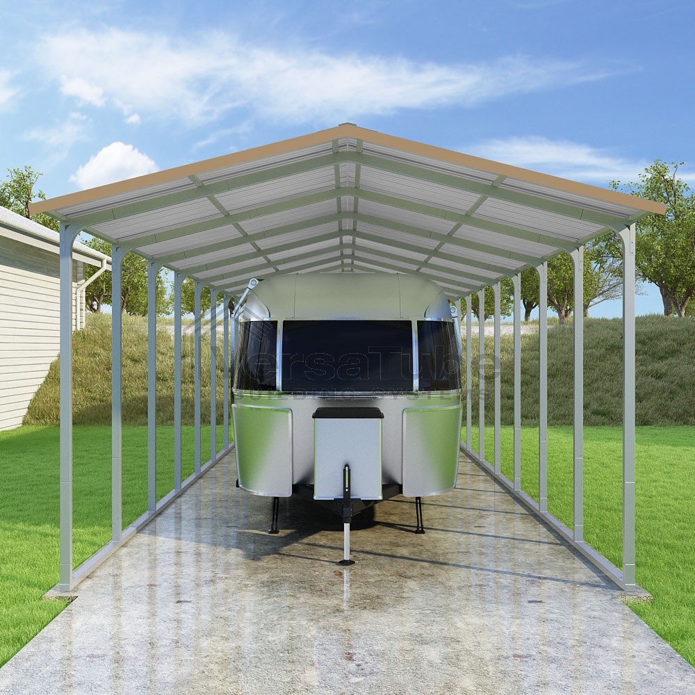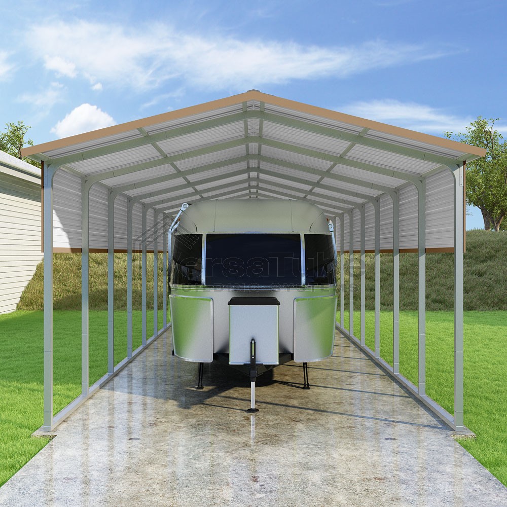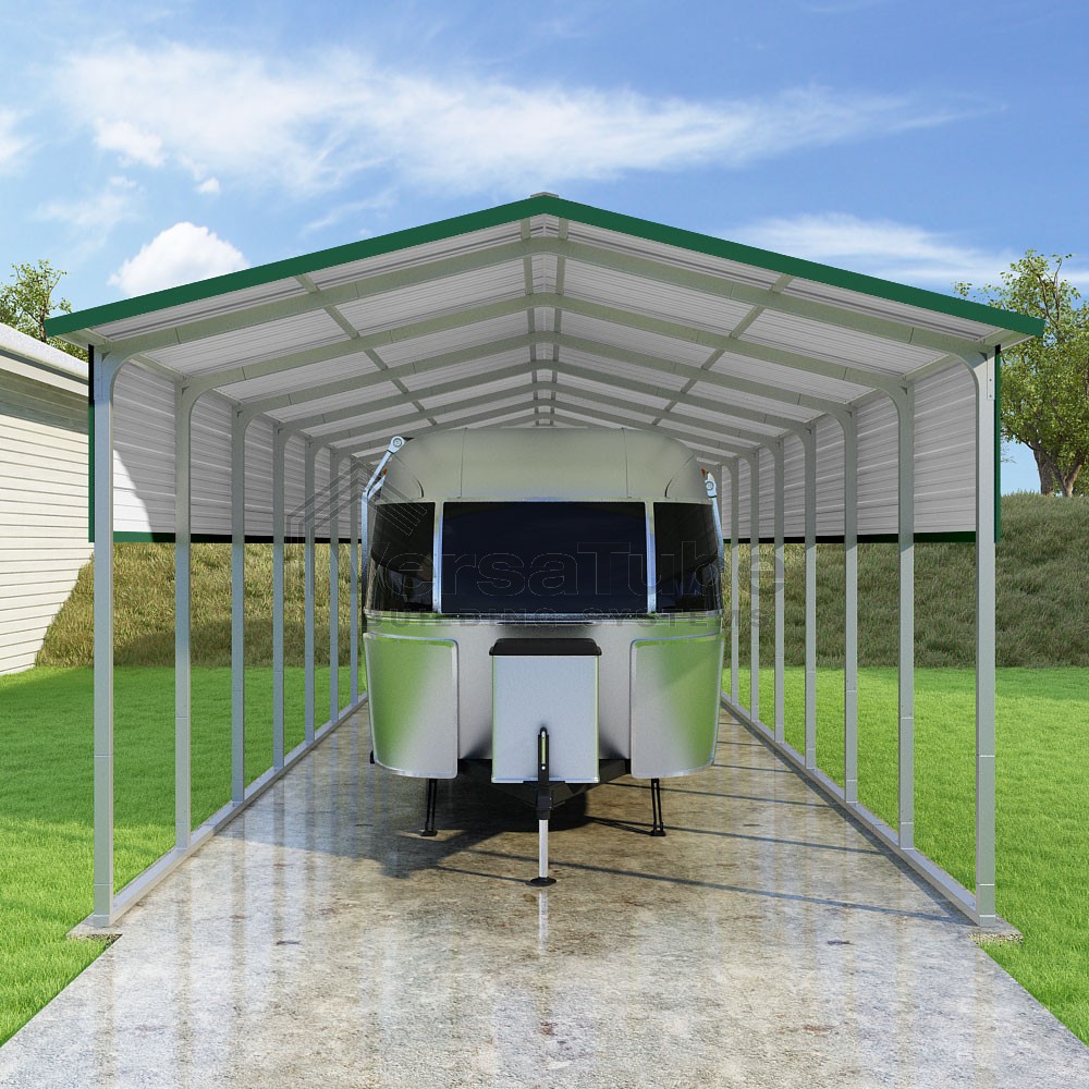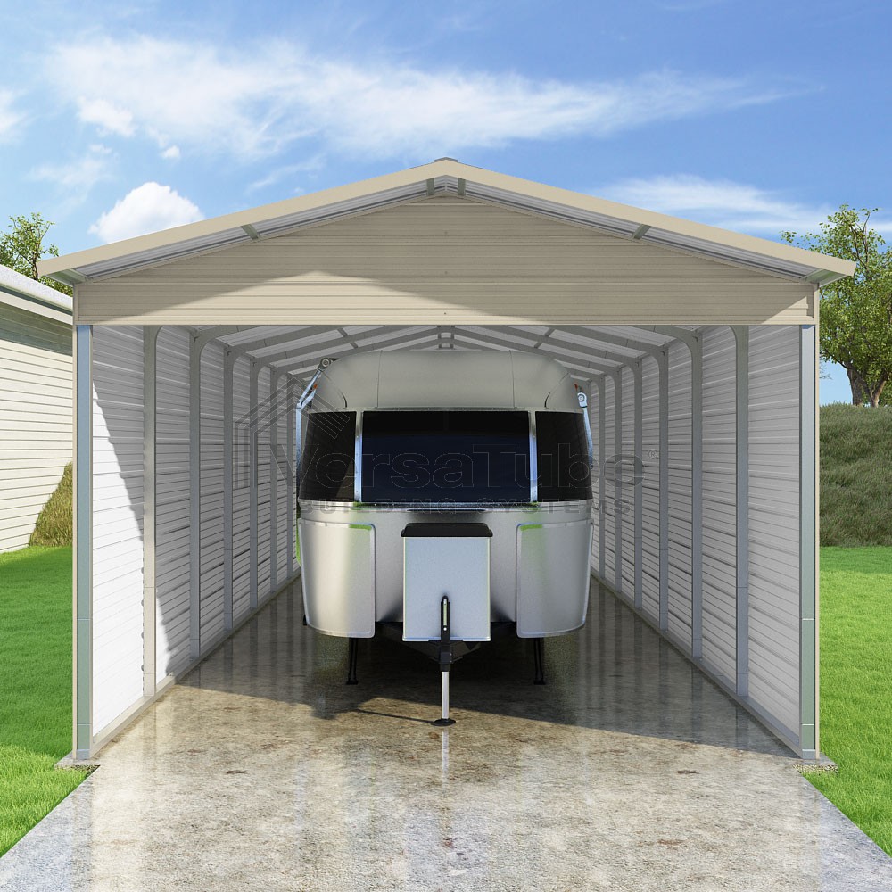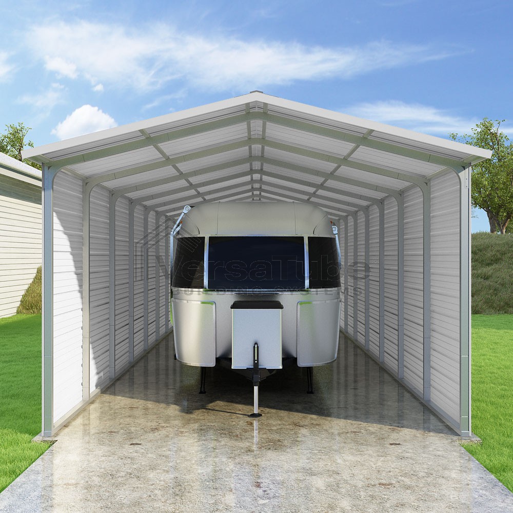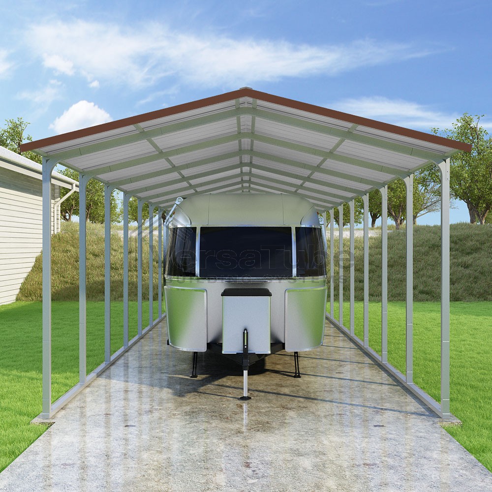Pinnacle Series DIY carport kit features vertical sheet metal roof panels with ridge cap, gable and eave trim for an A-frame roof style and extended coverage on both ends.