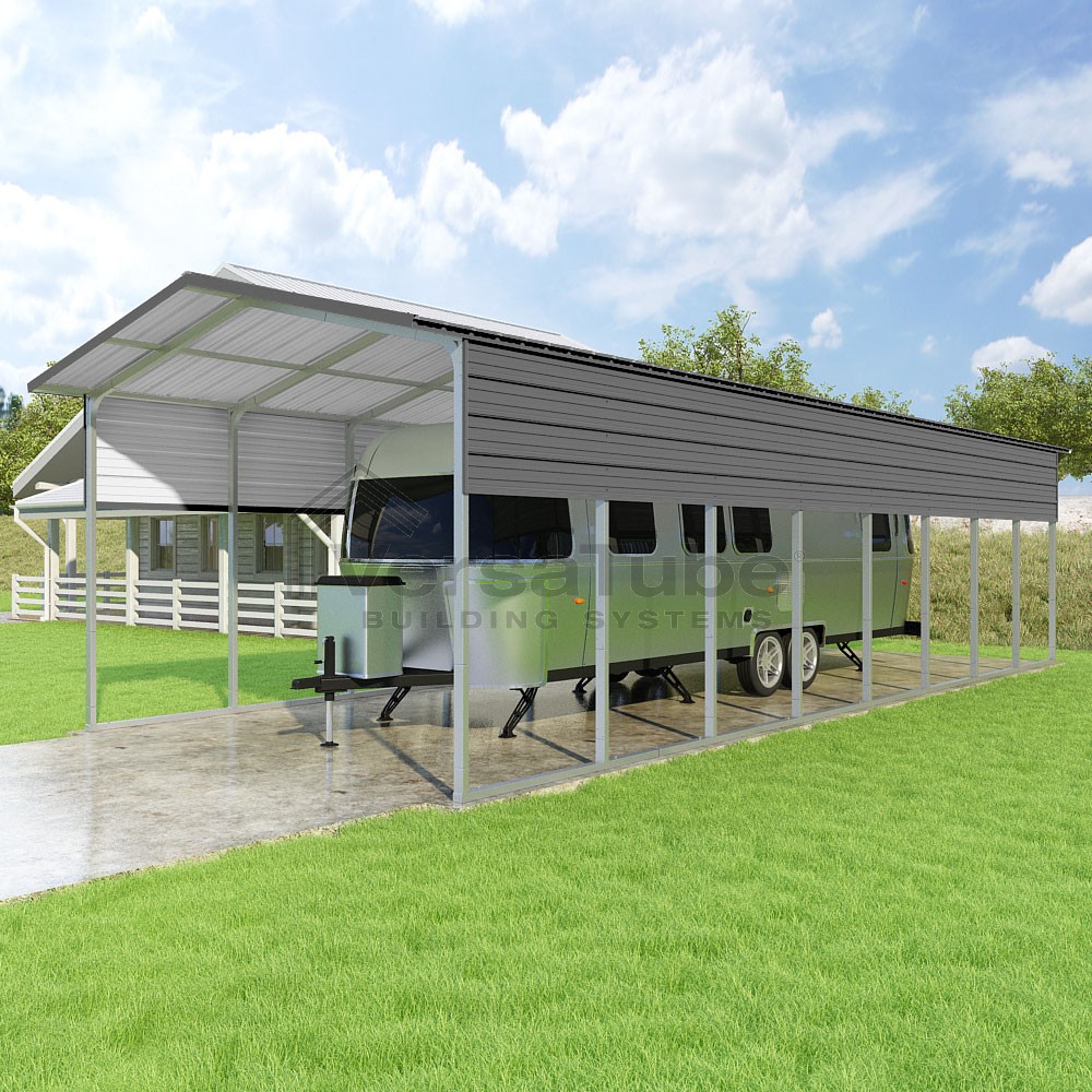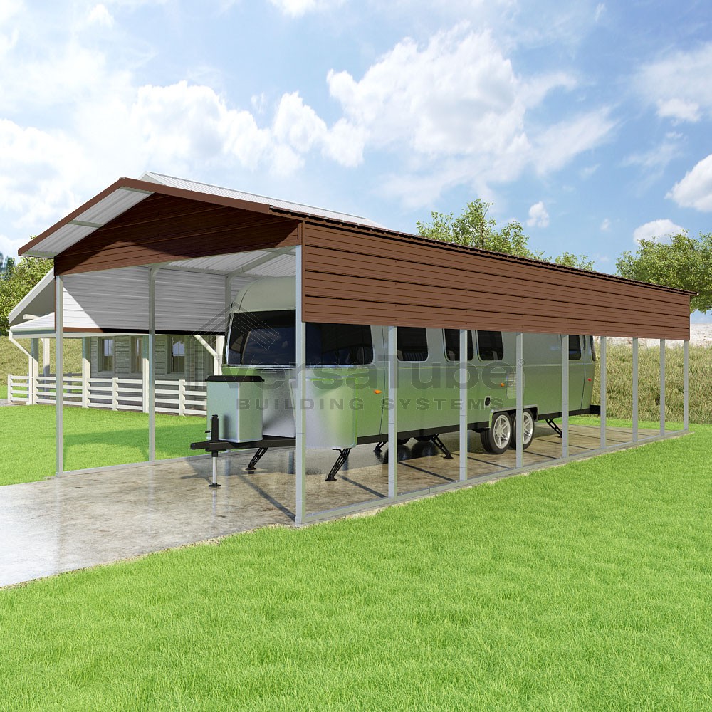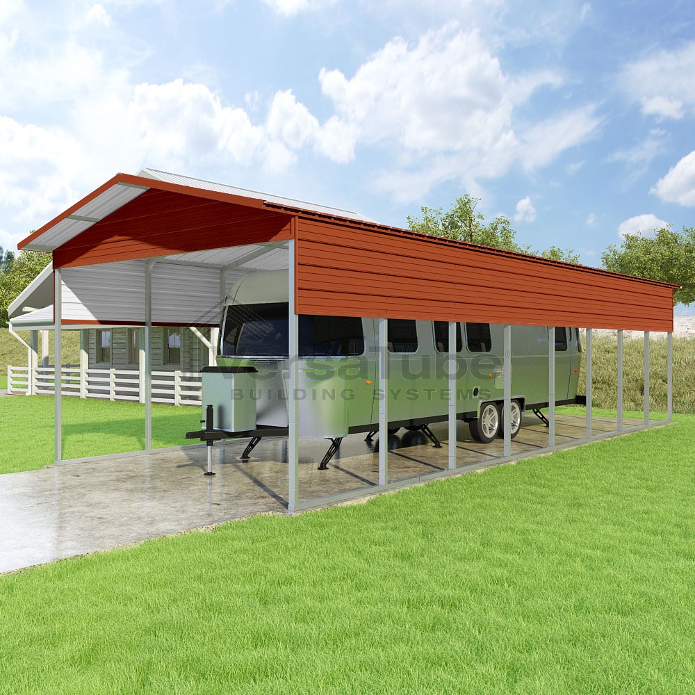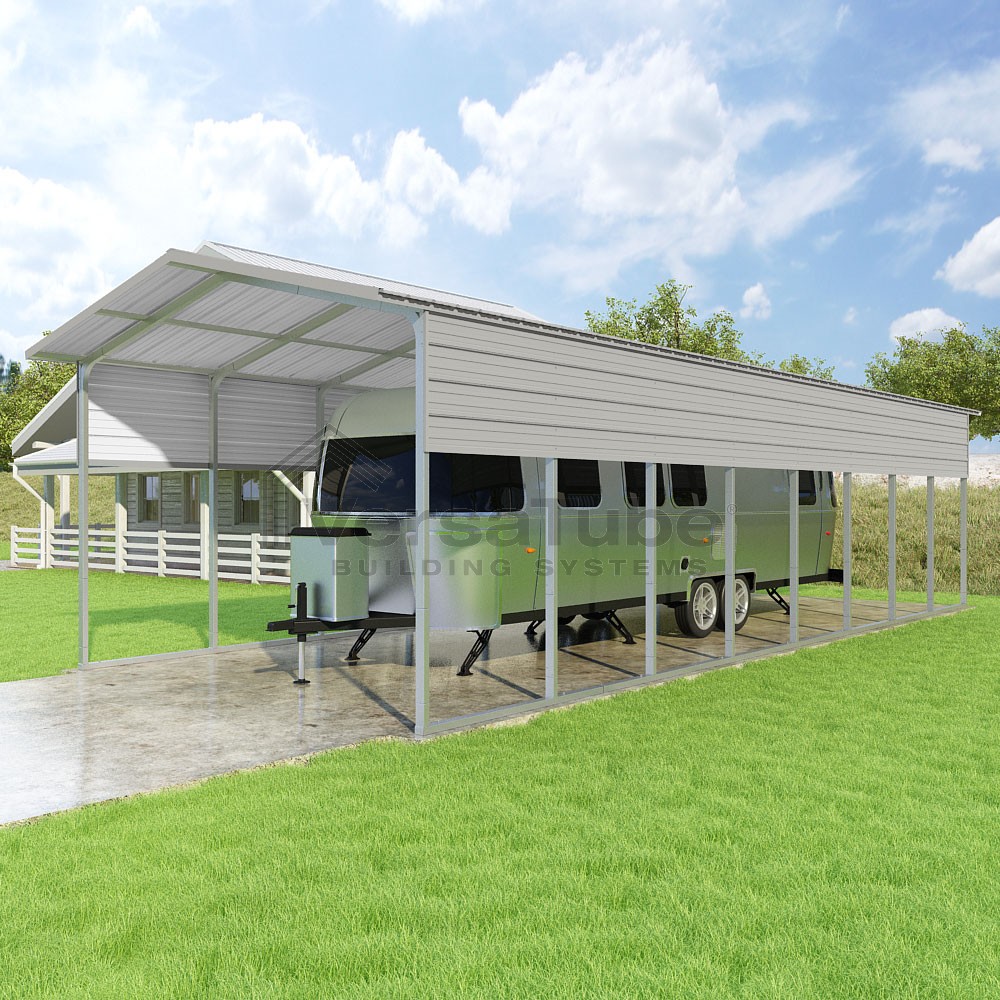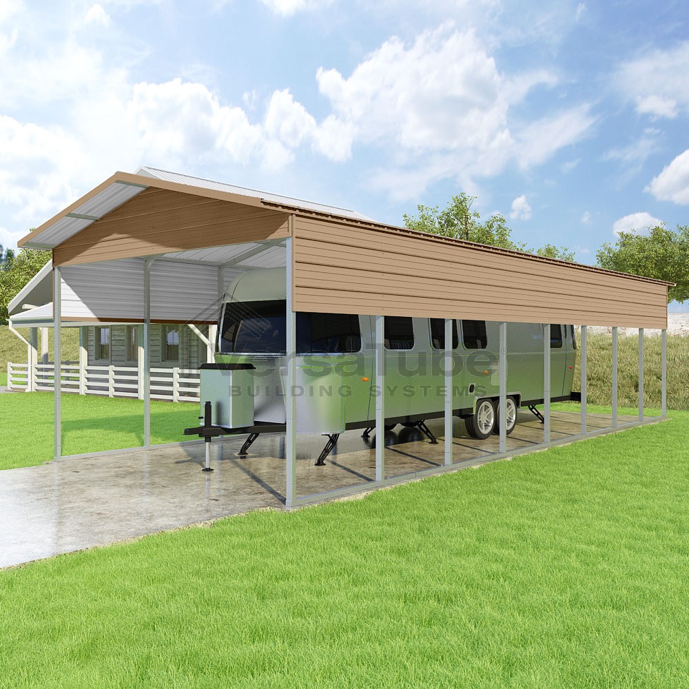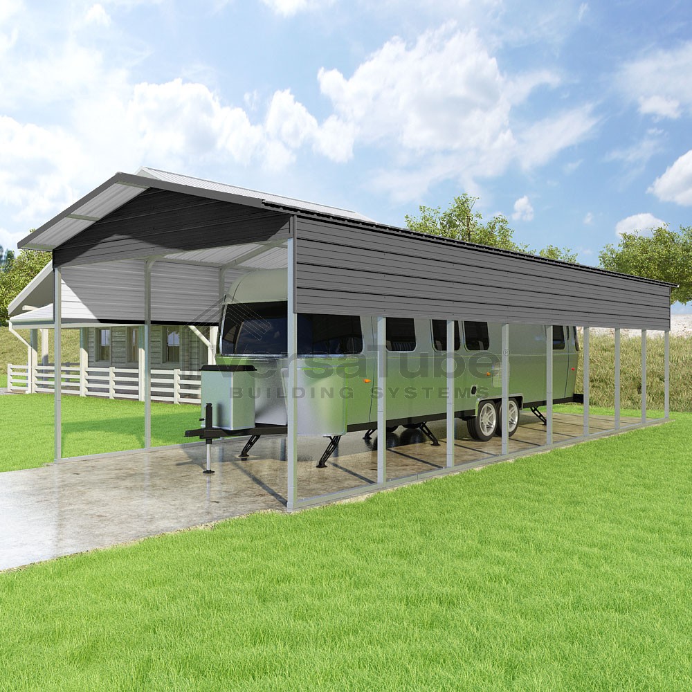 Pinnacle Series DIY carport kit features vertical sheet metal roof panels with ridge cap, gable and eave trim for an A-frame roof style and extended coverage on both ends.