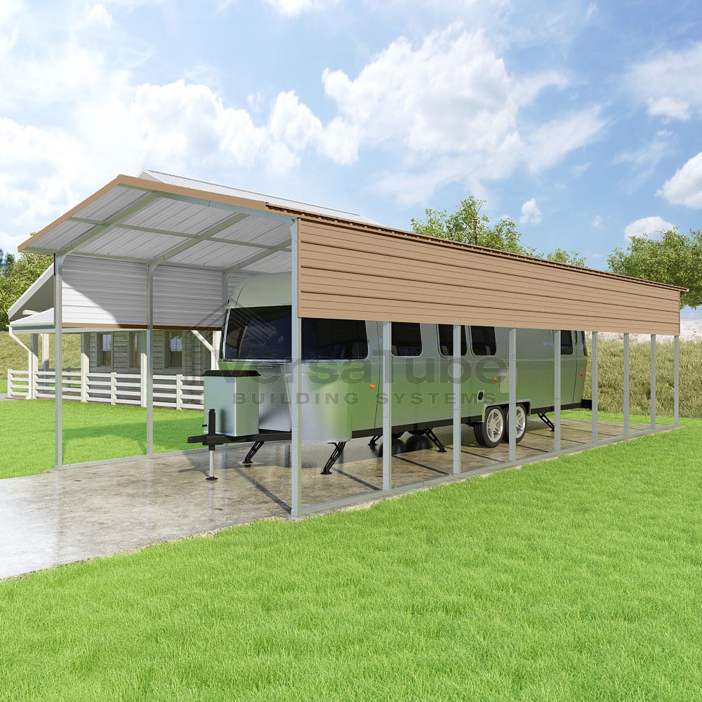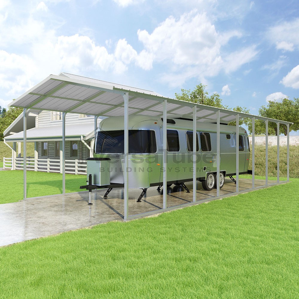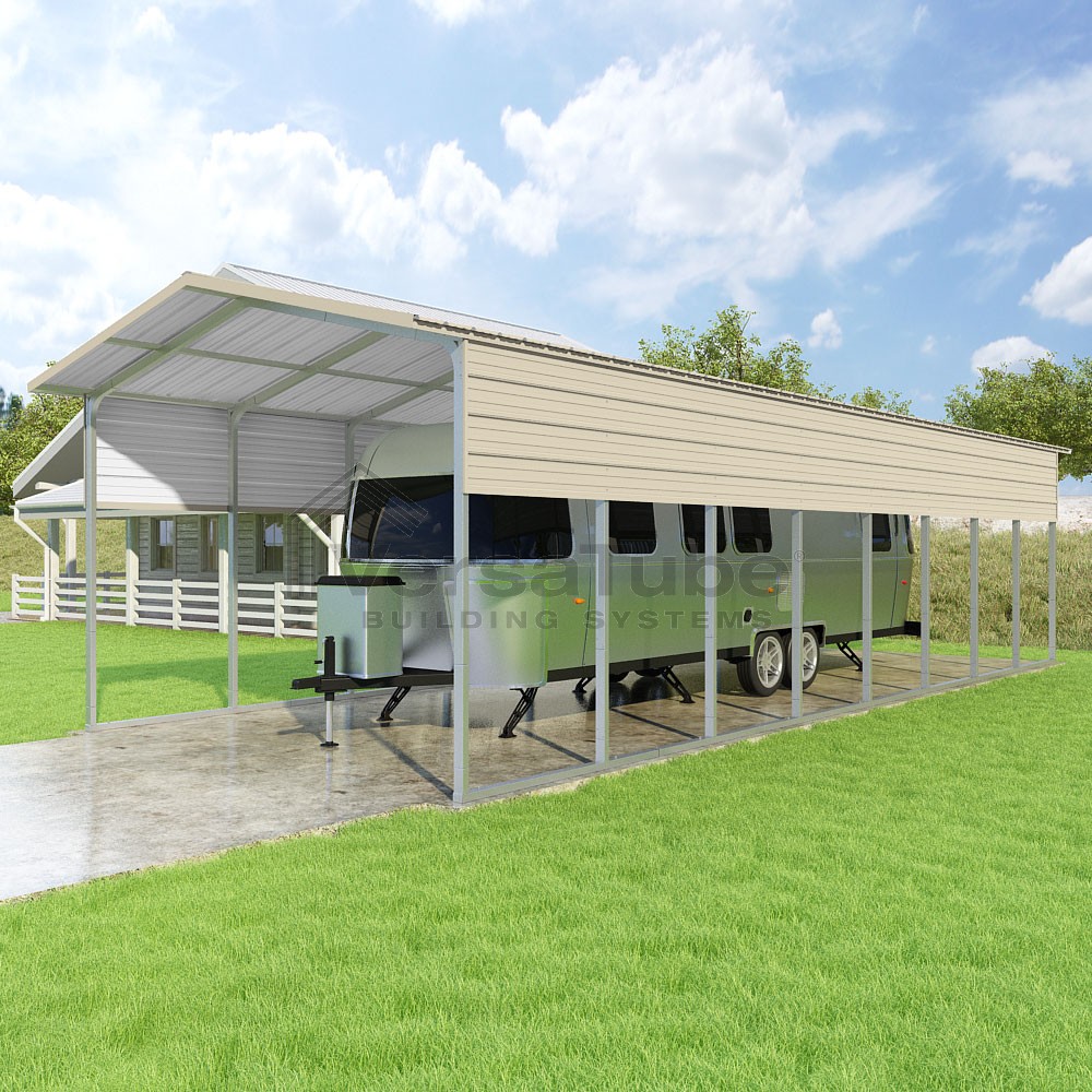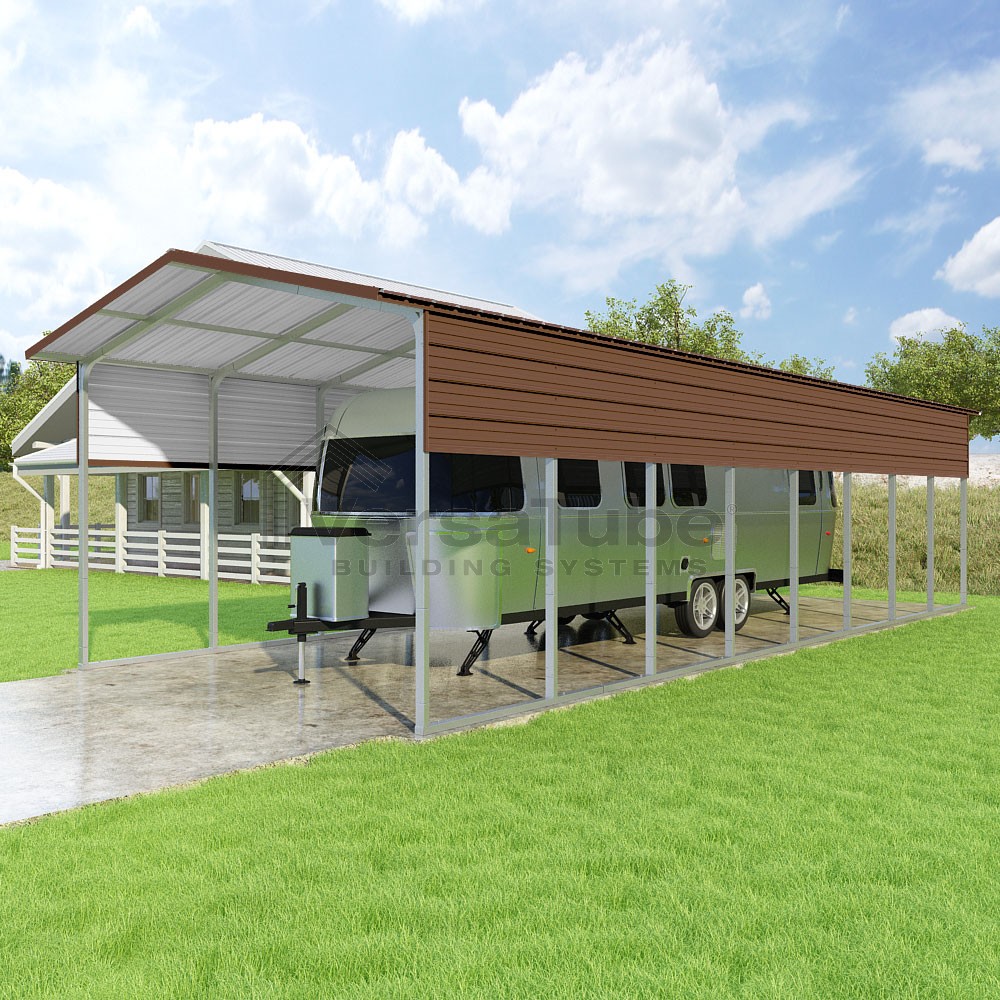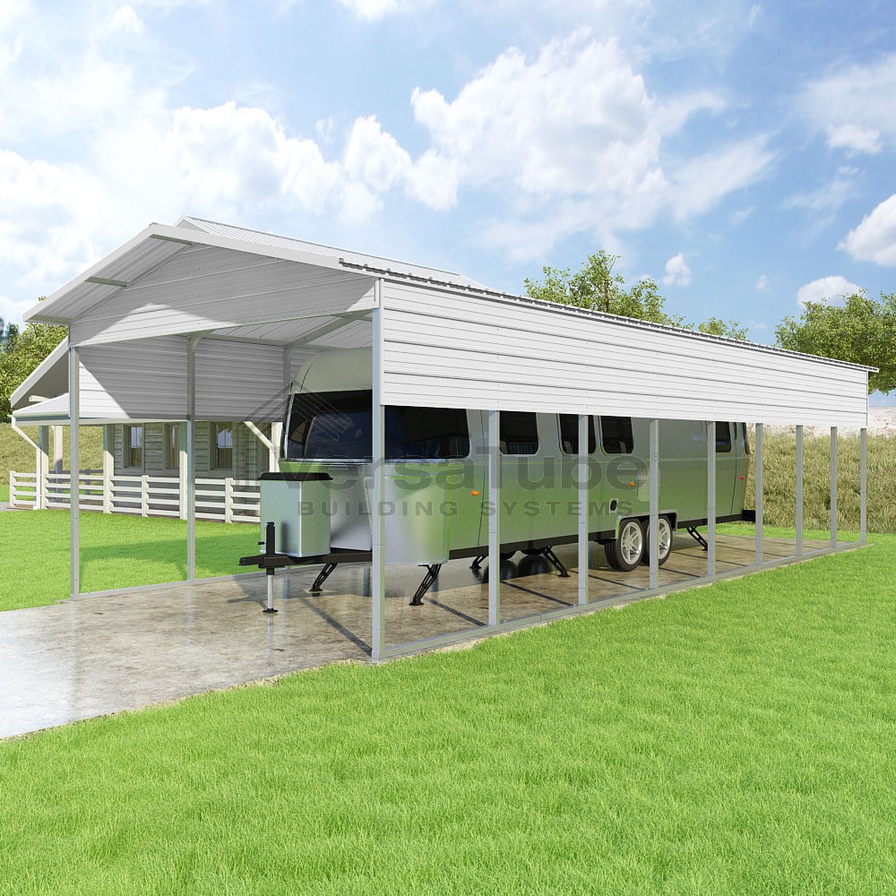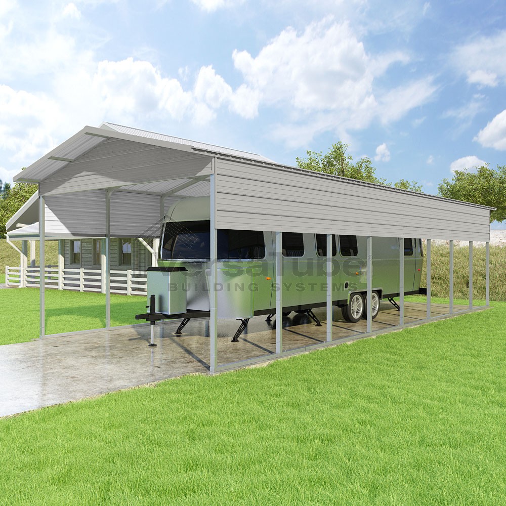 Pinnacle Series DIY carport kit features vertical sheet metal roof panels with ridge cap, gable and eave trim for an A-frame roof style and extended coverage on both ends.