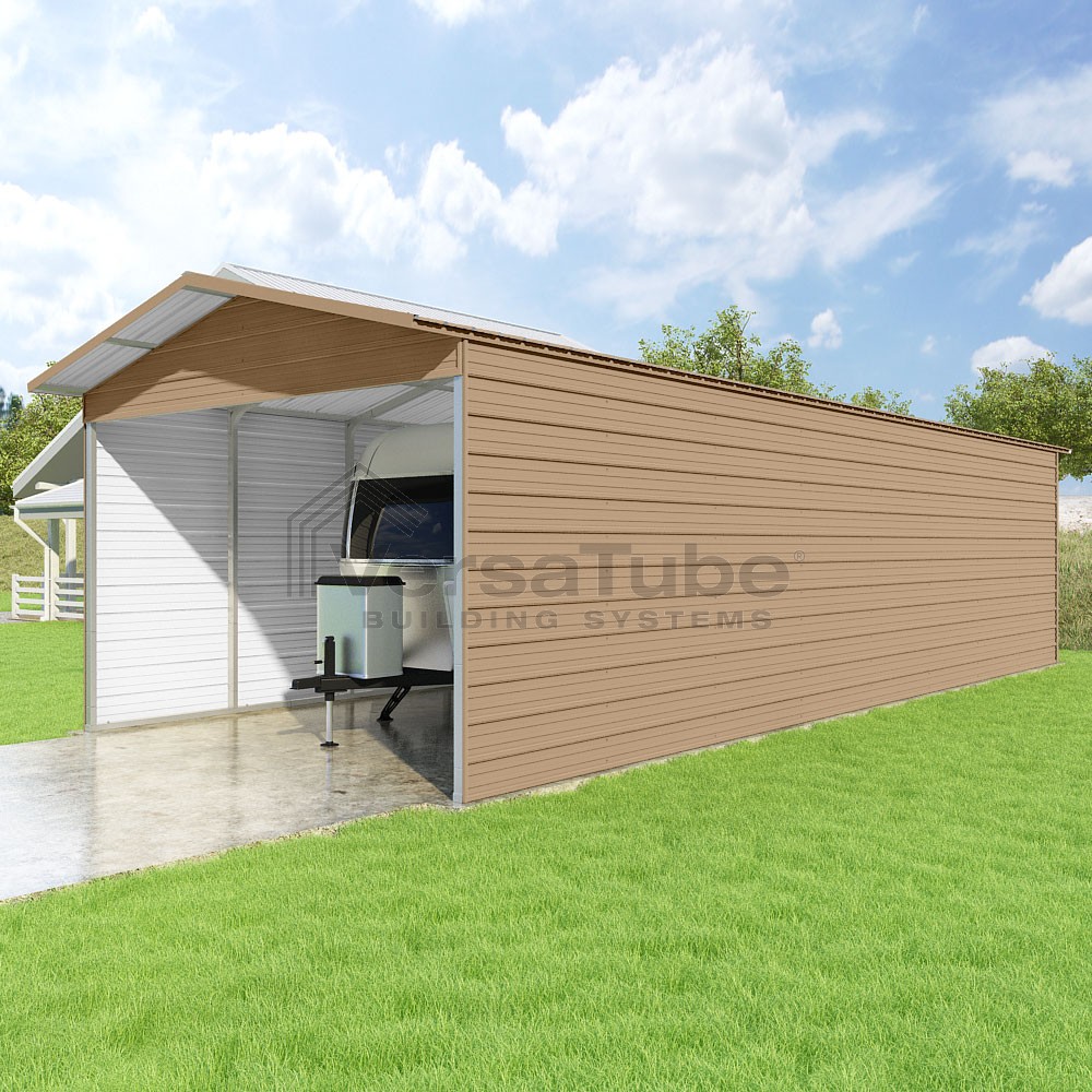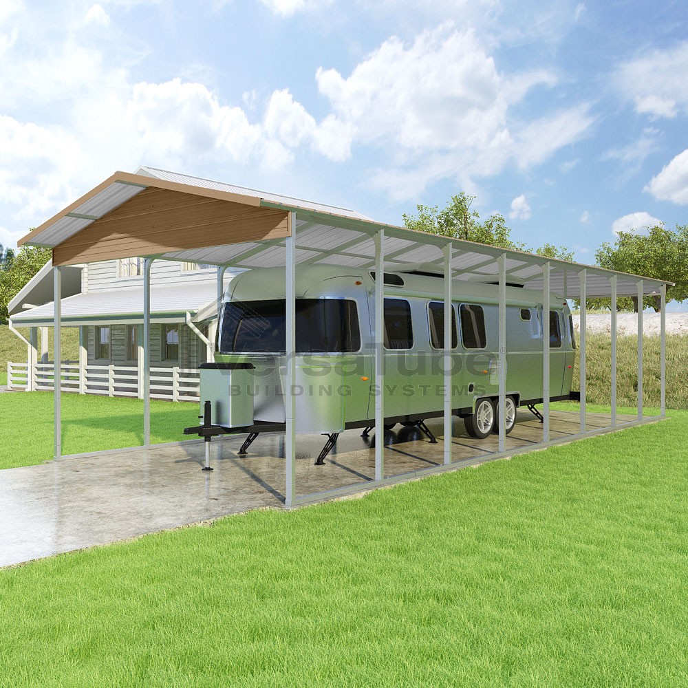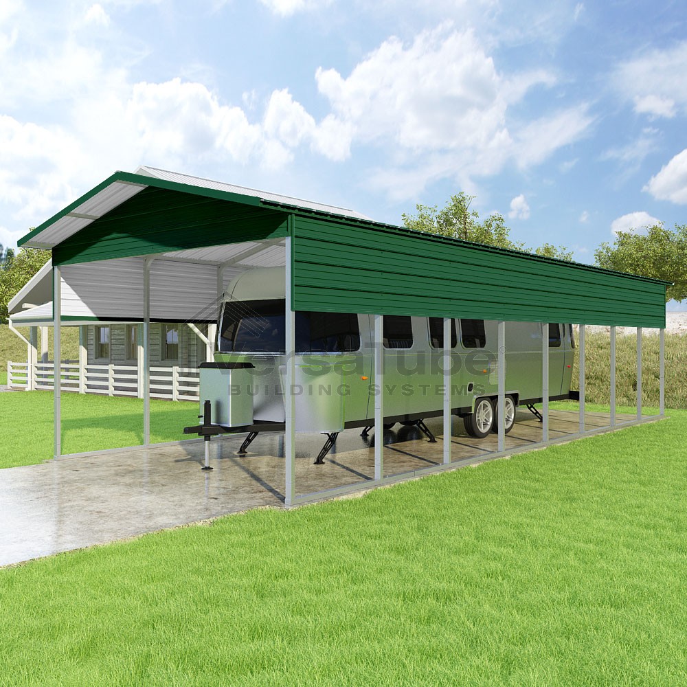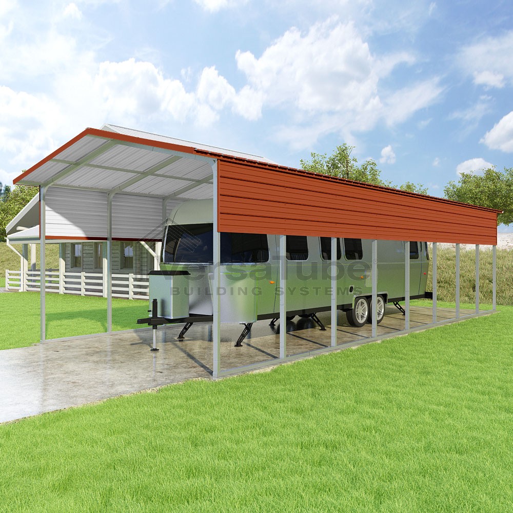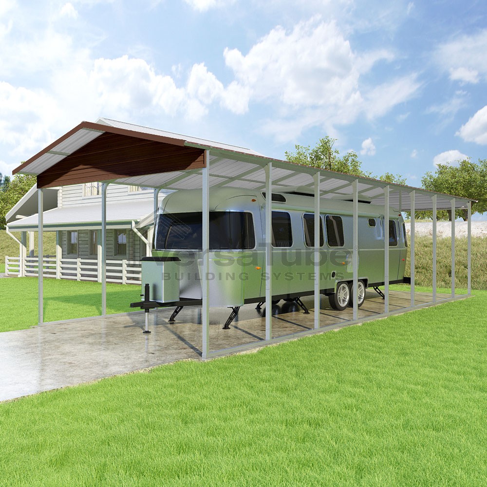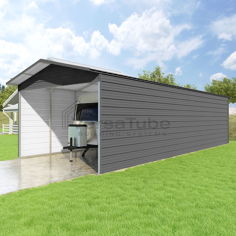 Pinnacle Series DIY carport kit features vertical sheet metal roof panels with ridge cap, gable and eave trim for an A-frame roof style and extended coverage on both ends.