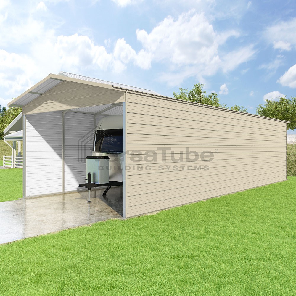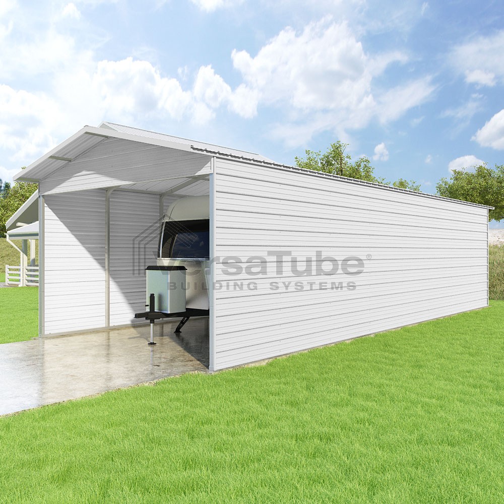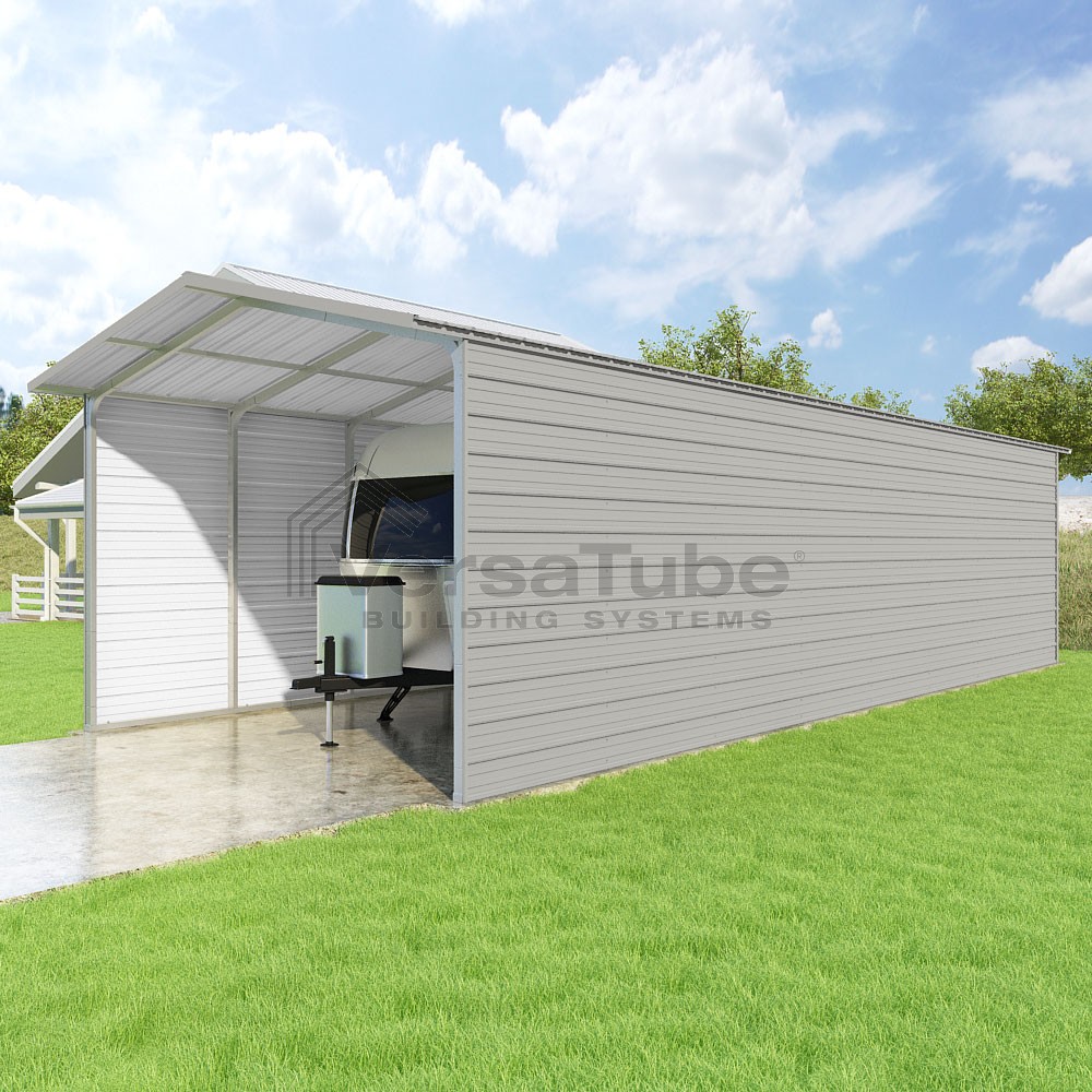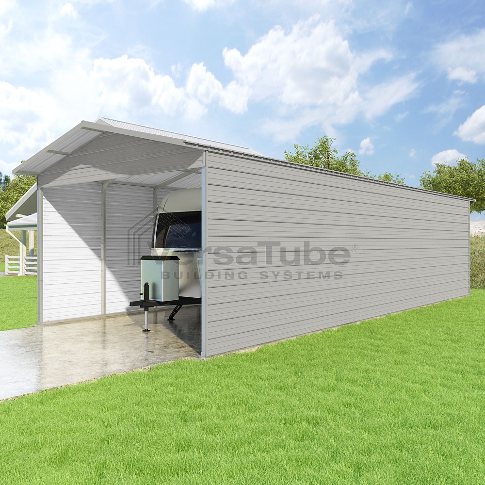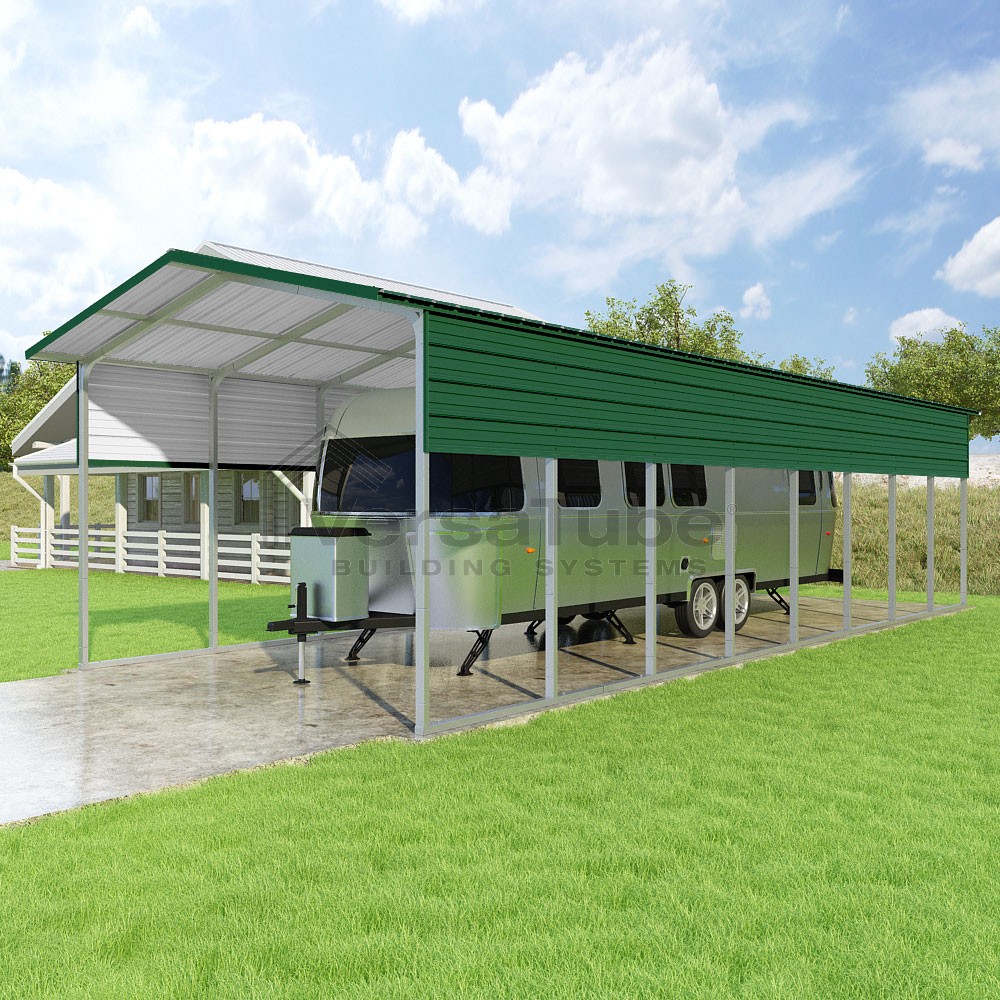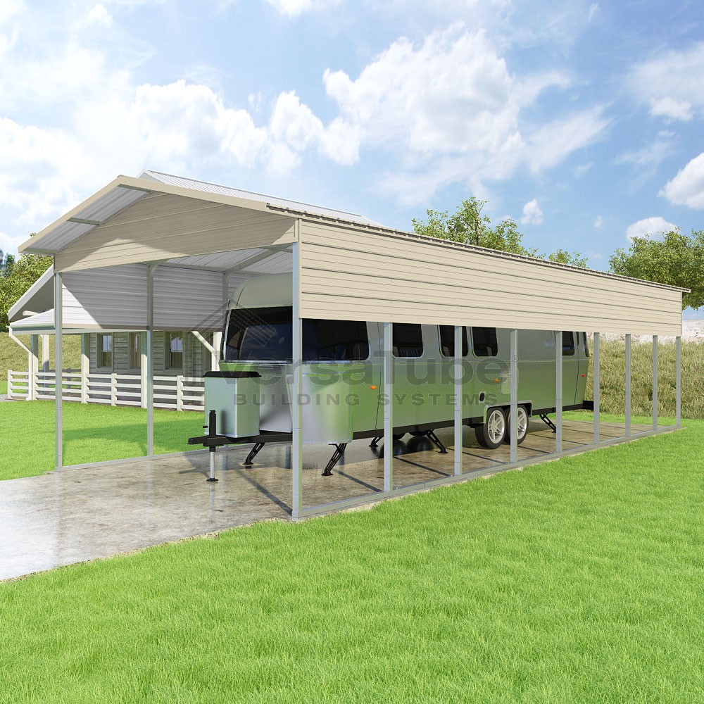 Pinnacle Series DIY carport kit features vertical sheet metal roof panels with ridge cap, gable and eave trim for an A-frame roof style and extended coverage on both ends.
