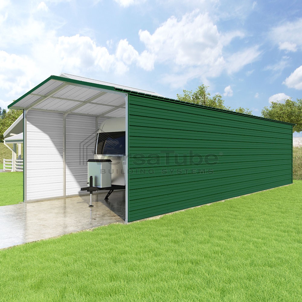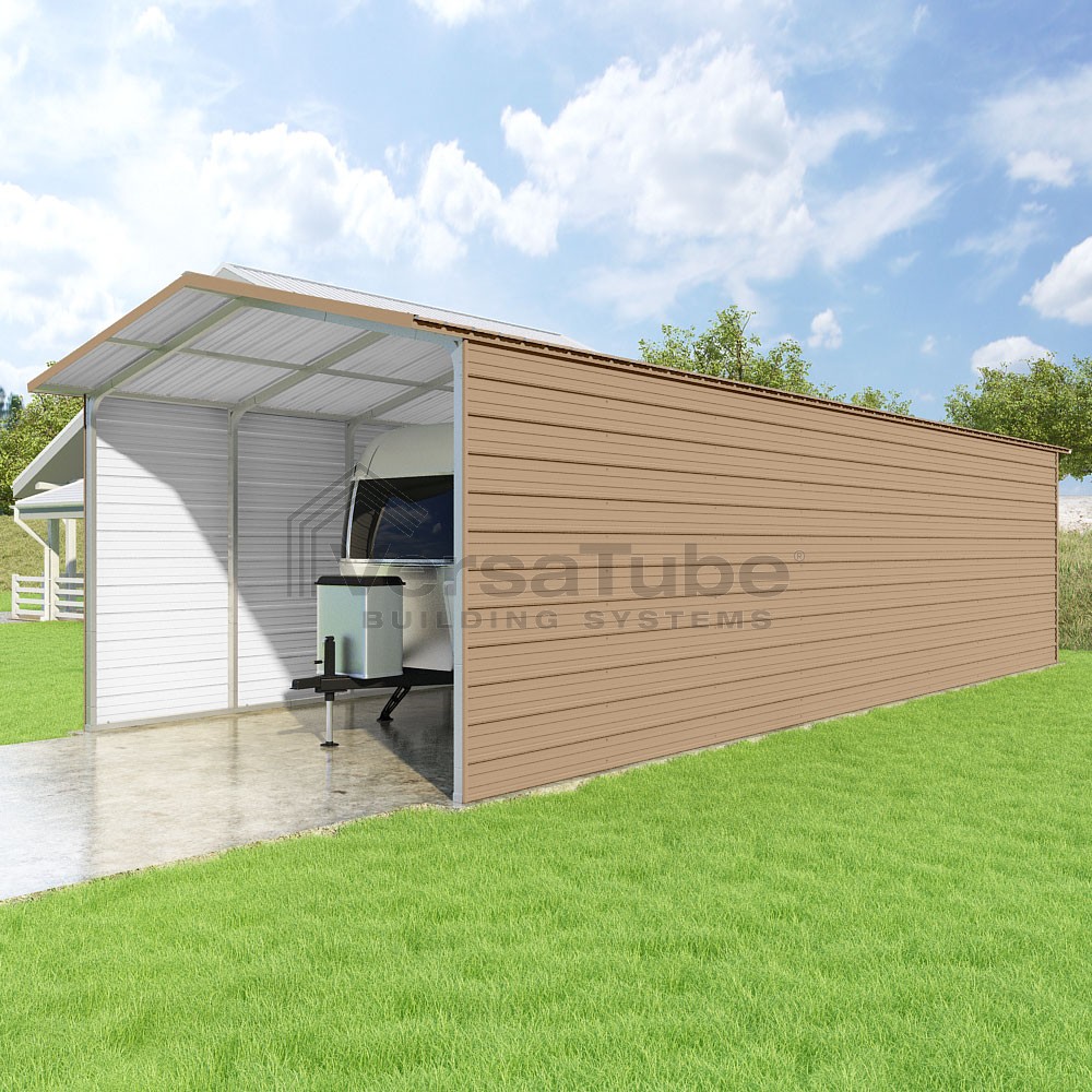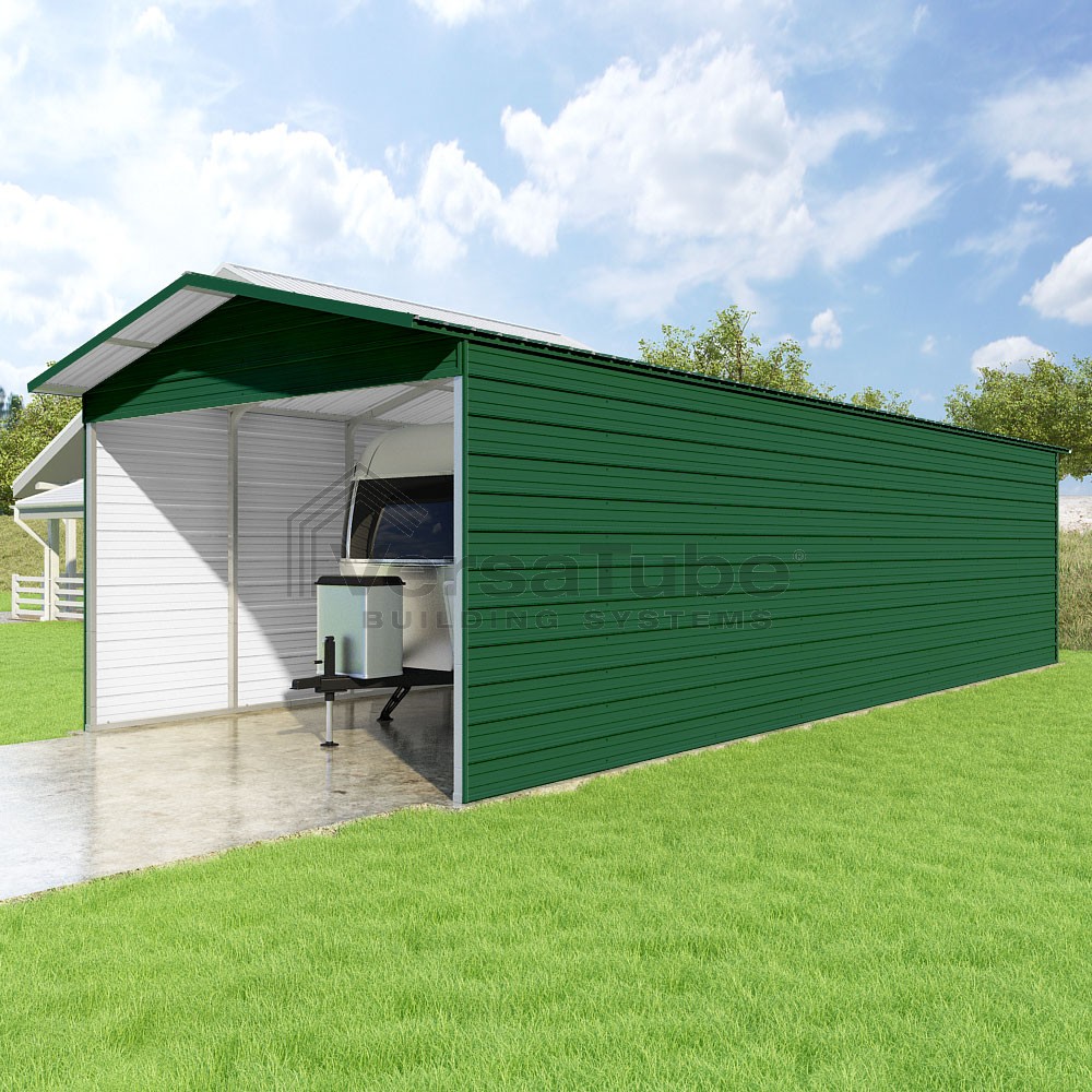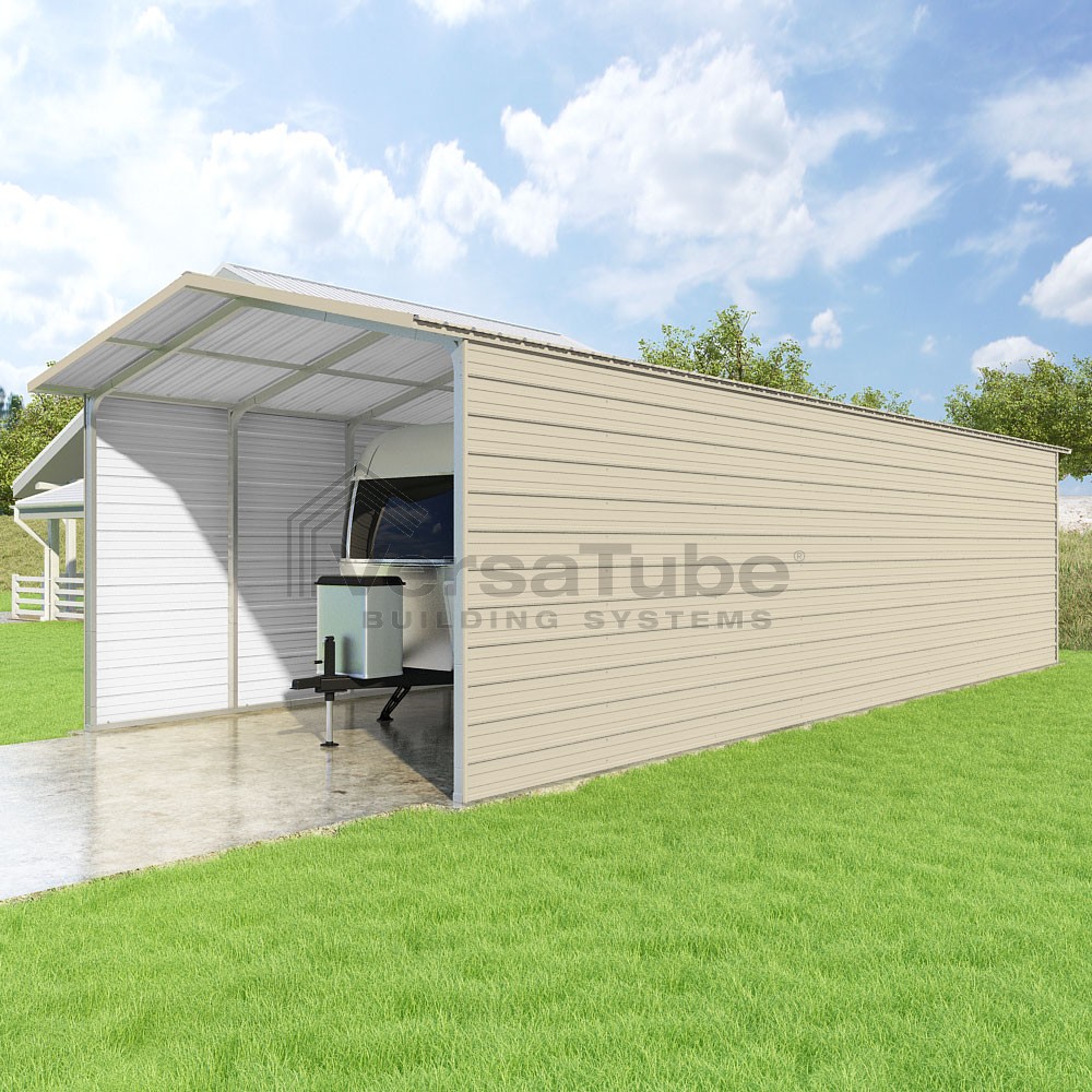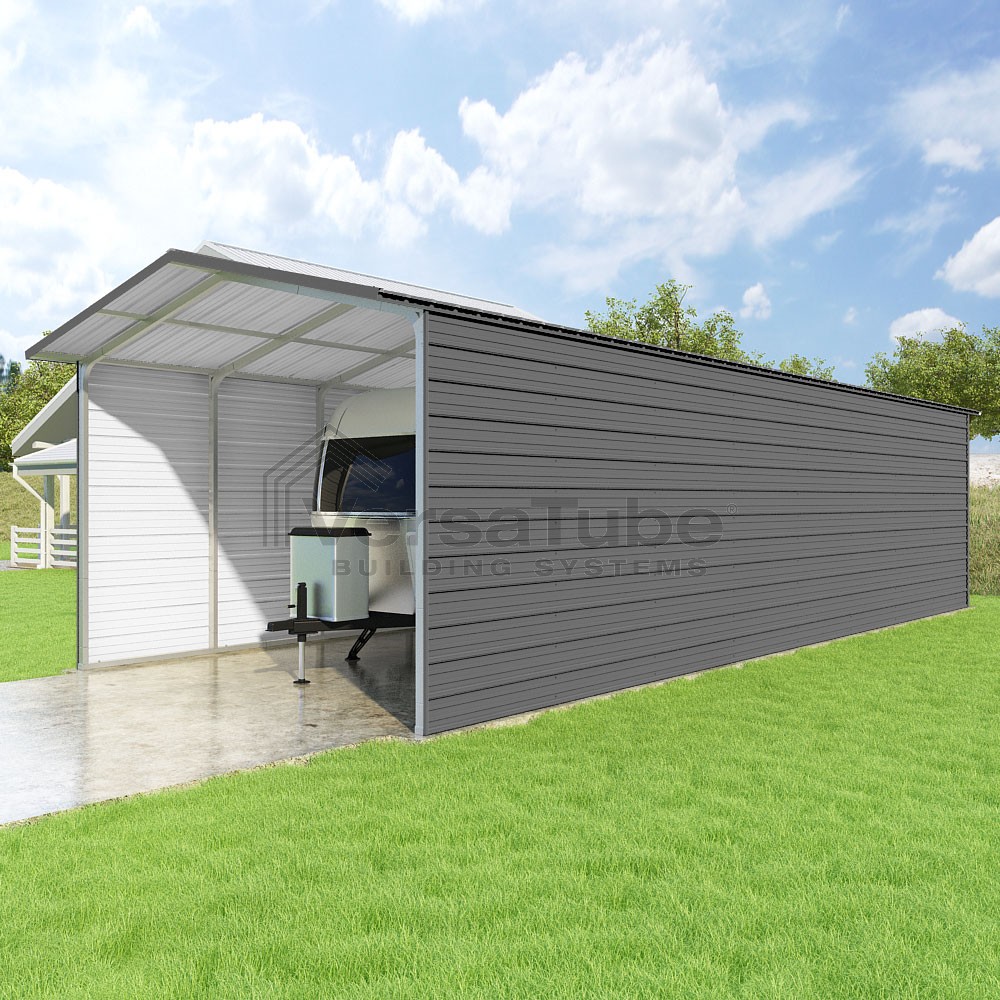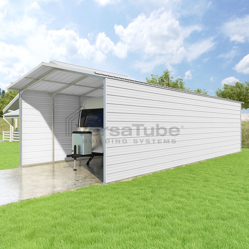 Pinnacle Series DIY carport kit features vertical sheet metal roof panels with ridge cap, gable and eave trim for an A-frame roof style and extended coverage on both ends.