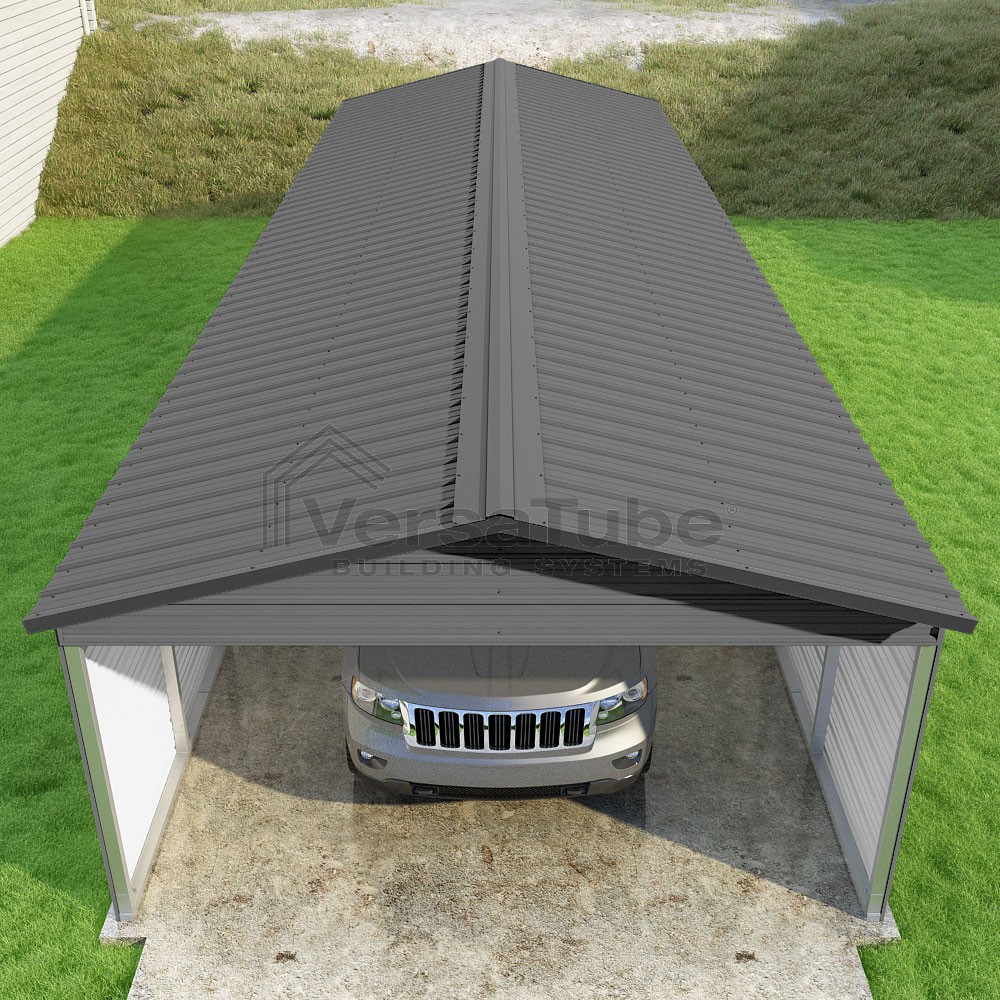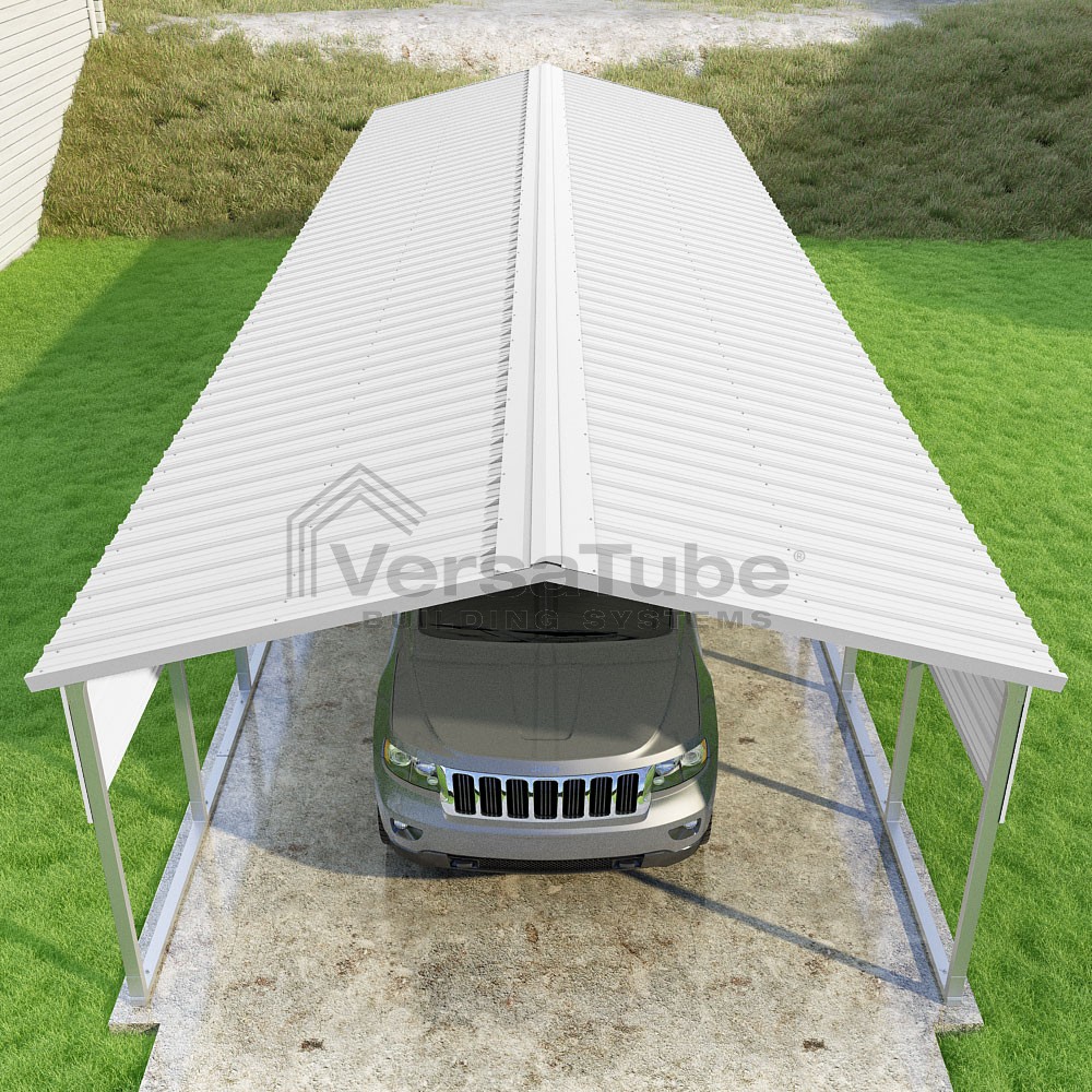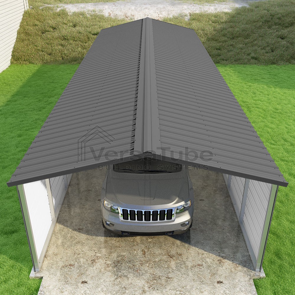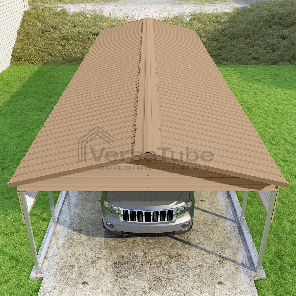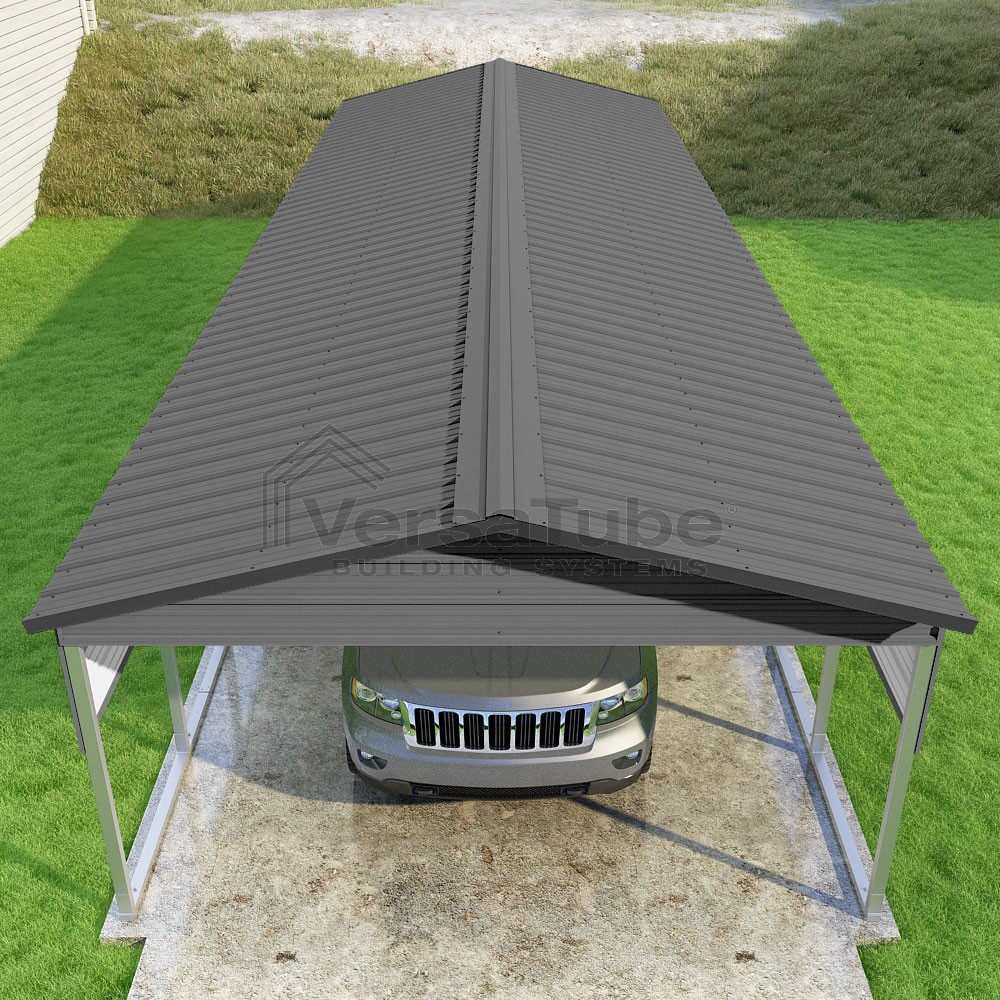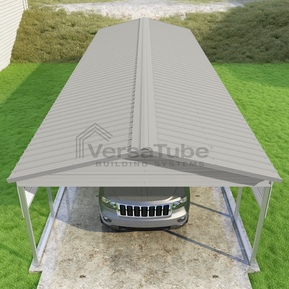 Pinnacle Series DIY carport kit features vertical sheet metal roof panels with ridge cap, gable and eave trim for an A-frame roof style and extended coverage on both ends.