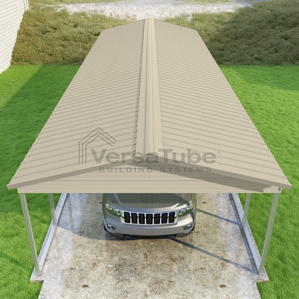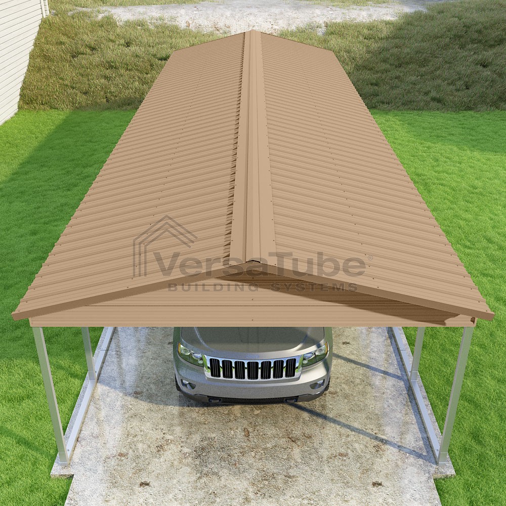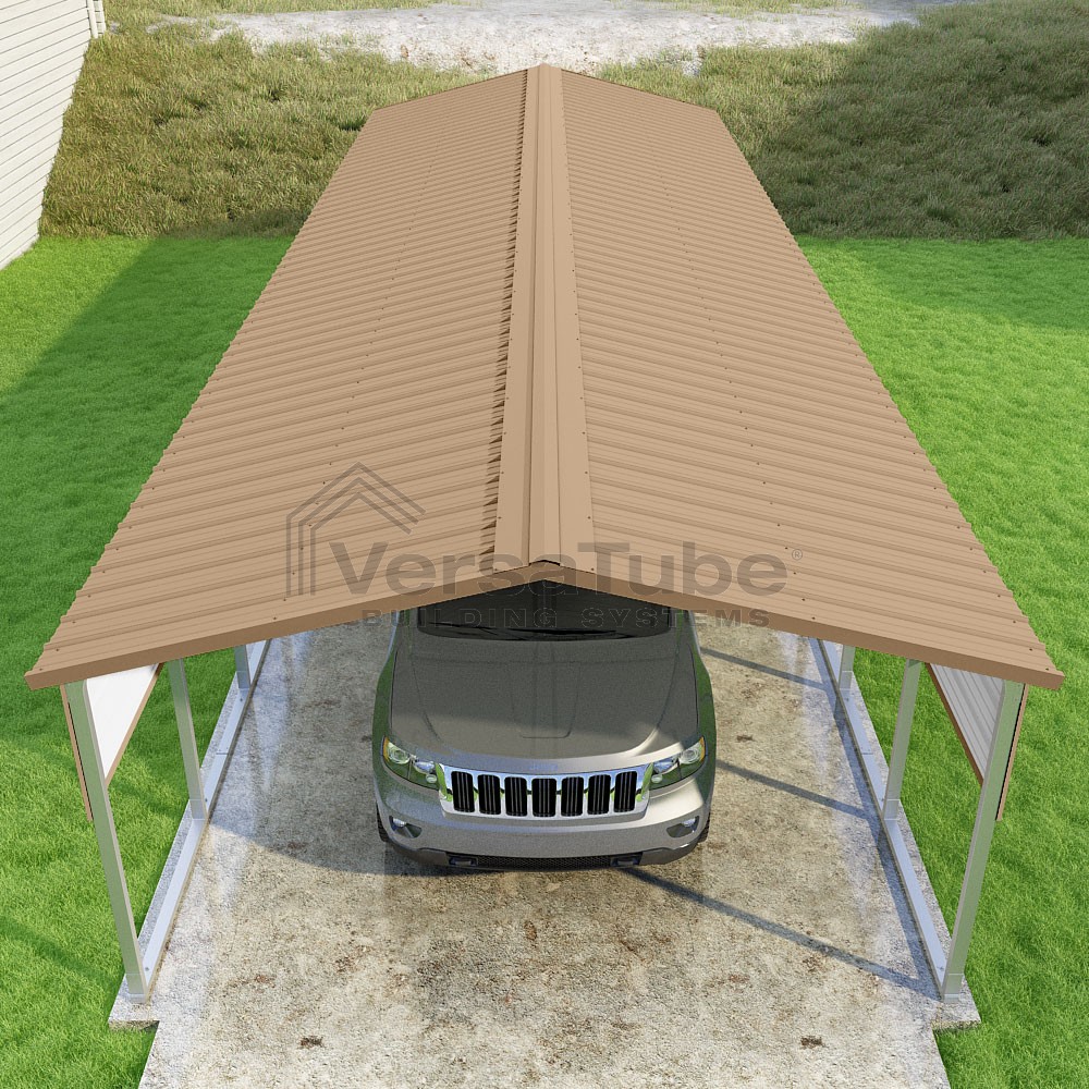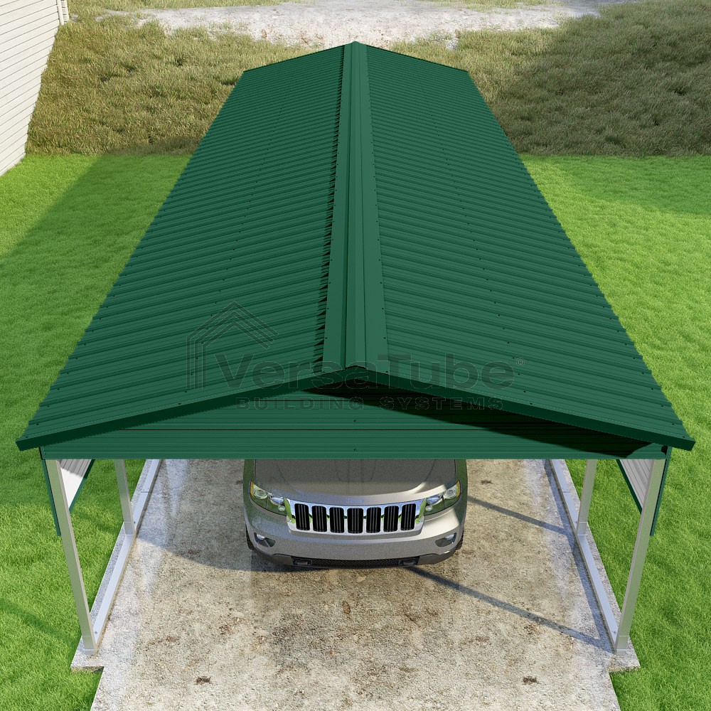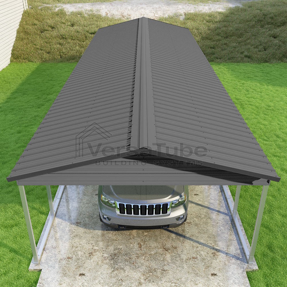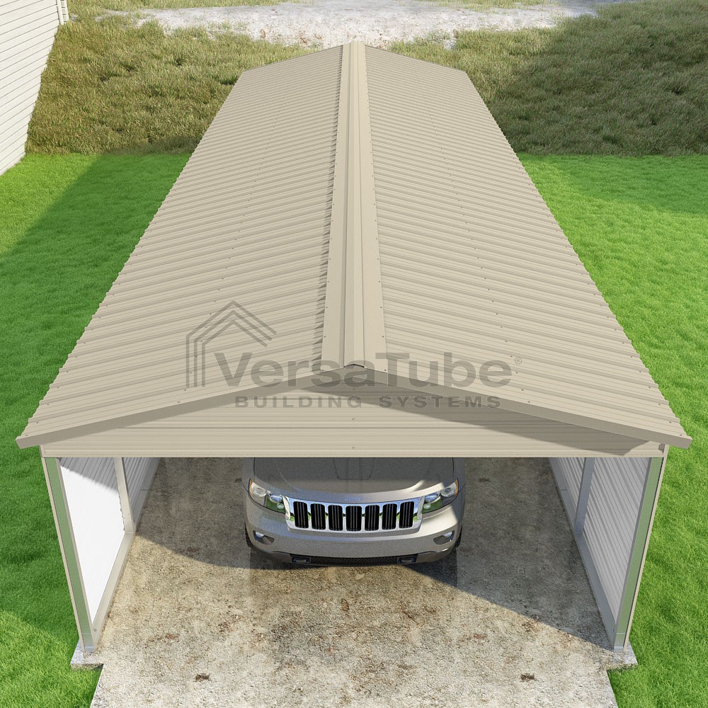Pinnacle Series DIY carport kit features vertical sheet metal roof panels with ridge cap, gable and eave trim for an A-frame roof style and extended coverage on both ends.