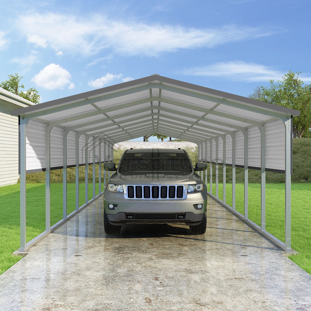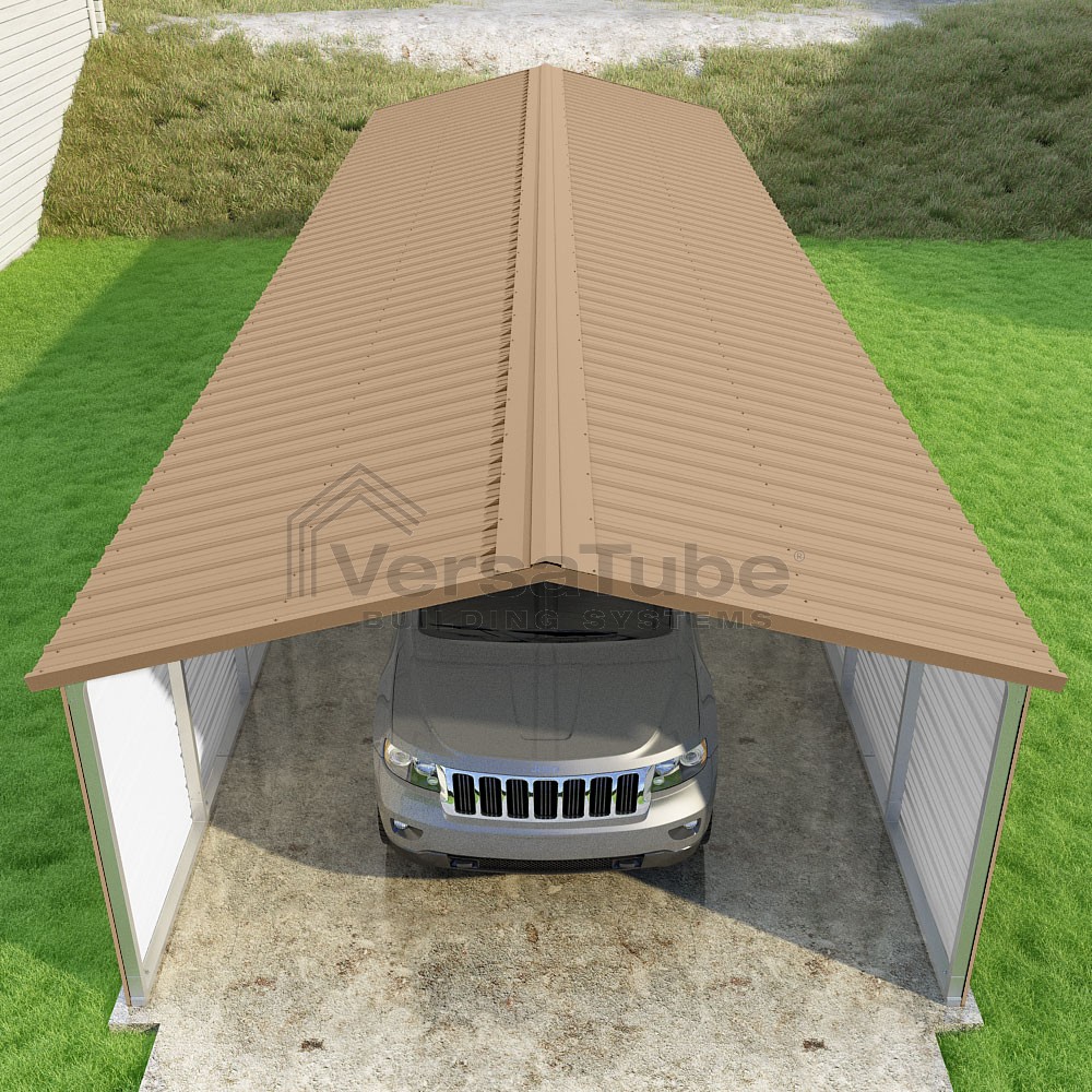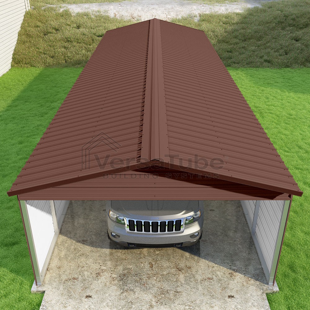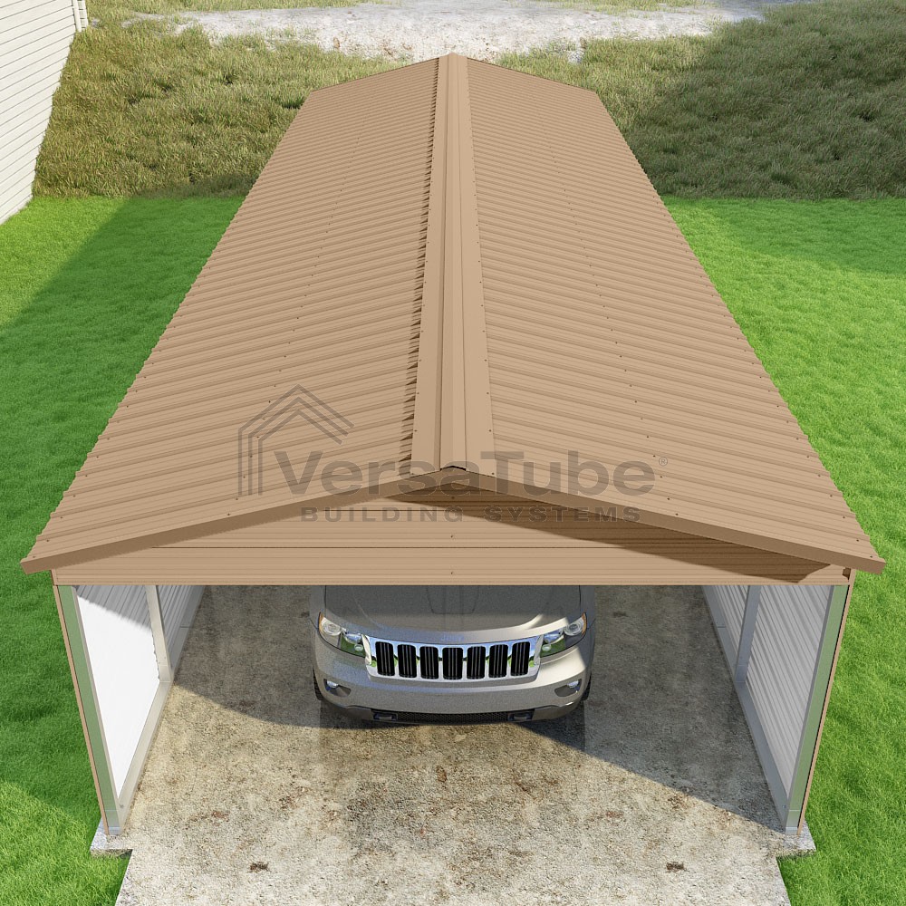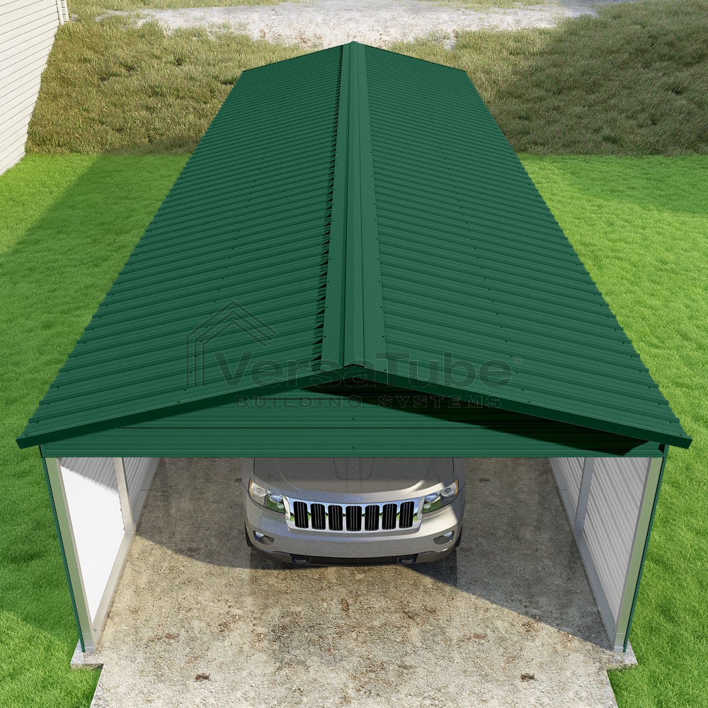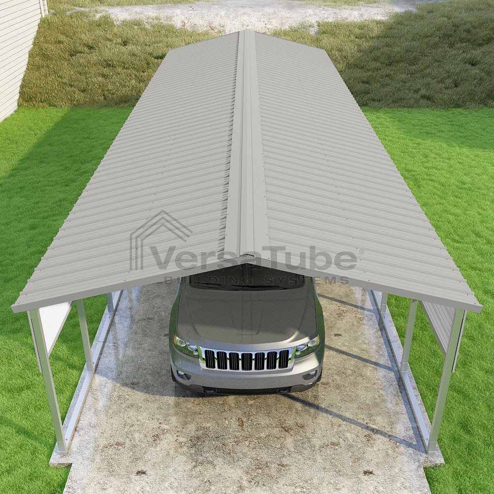 Pinnacle Series DIY carport kit features vertical sheet metal roof panels with ridge cap, gable and eave trim for an A-frame roof style and extended coverage on both ends.