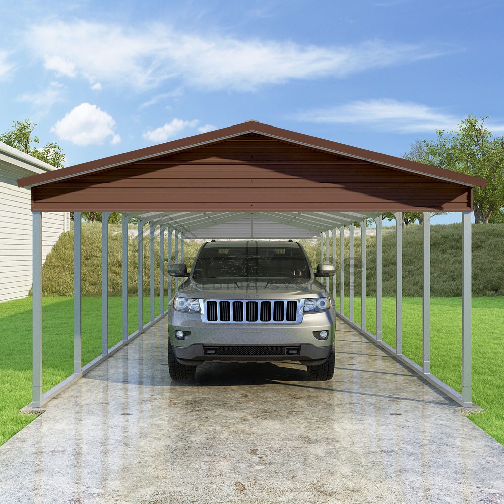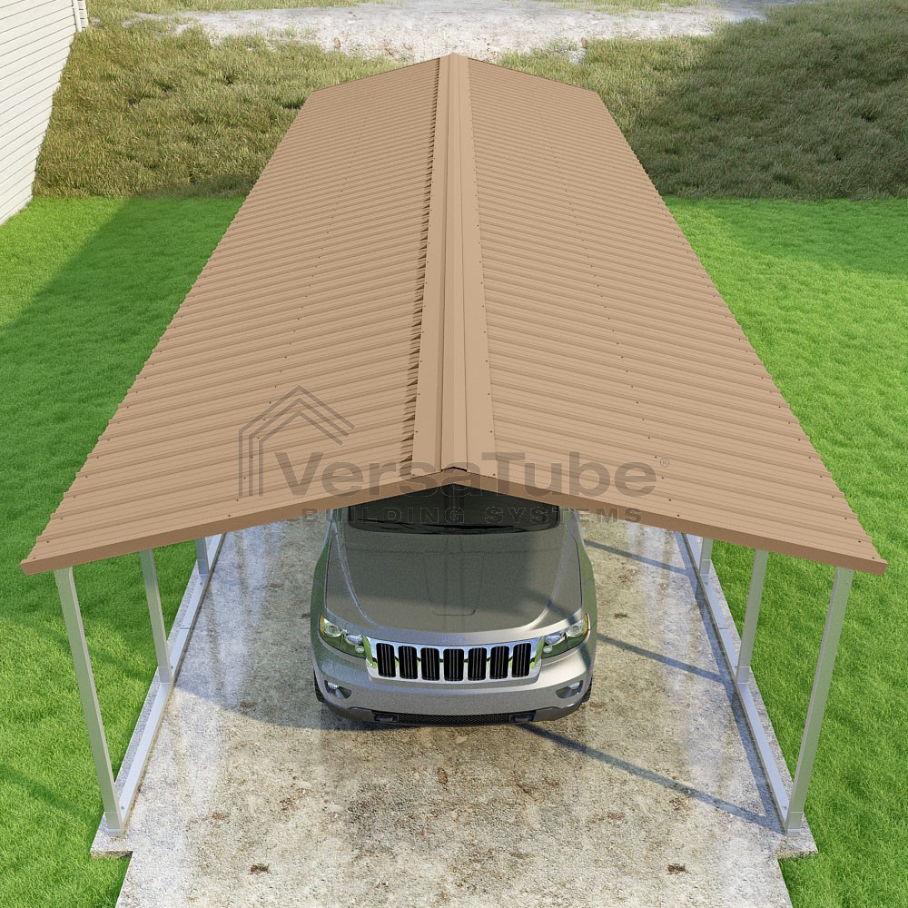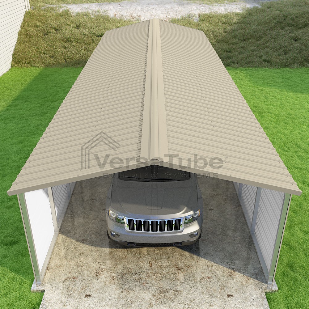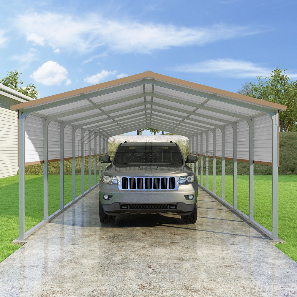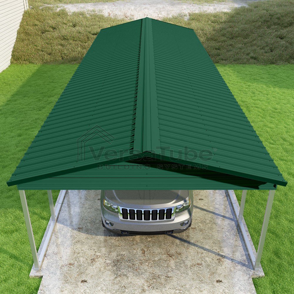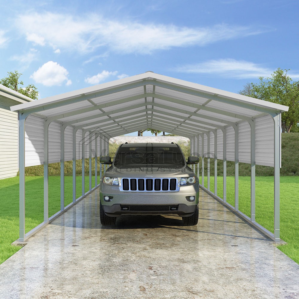 Pinnacle Series DIY carport kit features vertical sheet metal roof panels with ridge cap, gable and eave trim for an A-frame roof style and extended coverage on both ends.