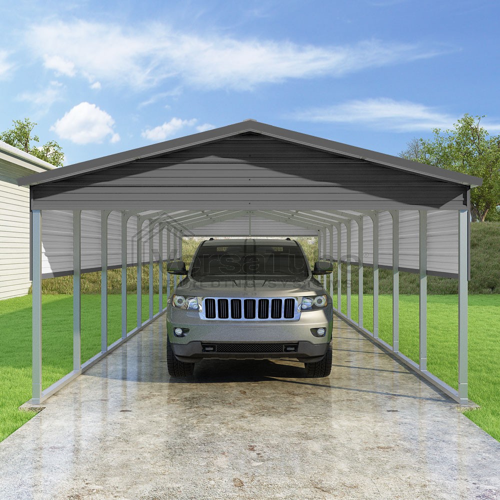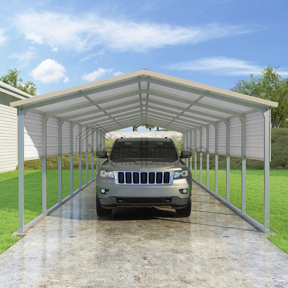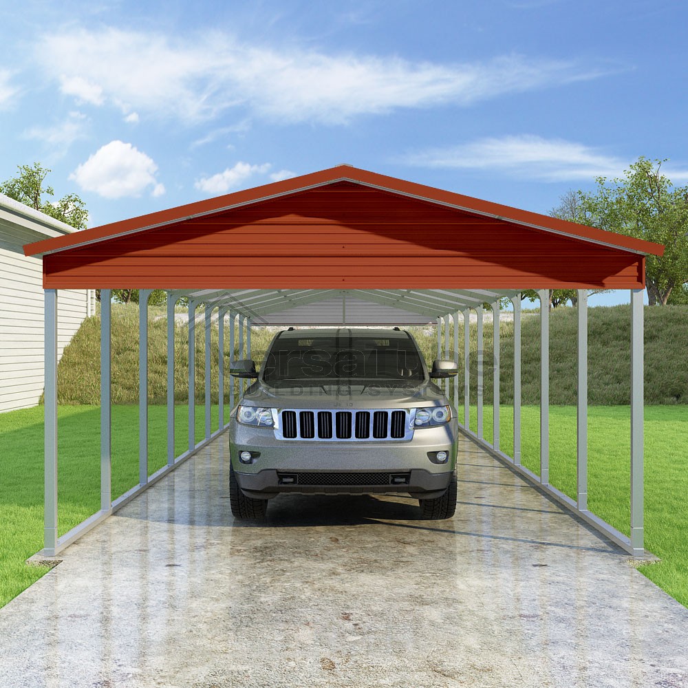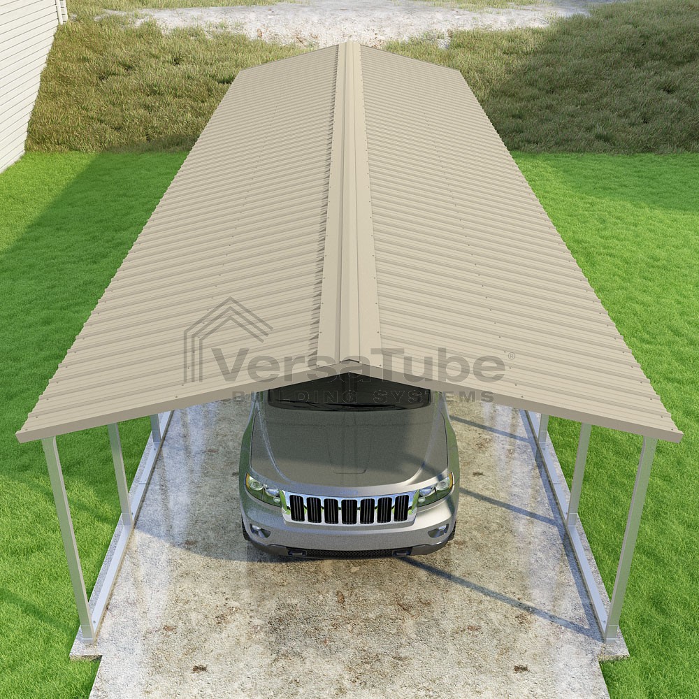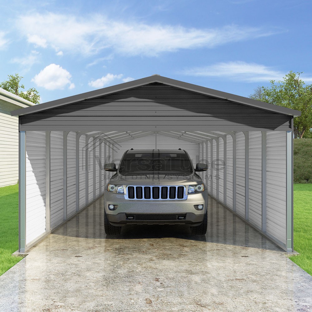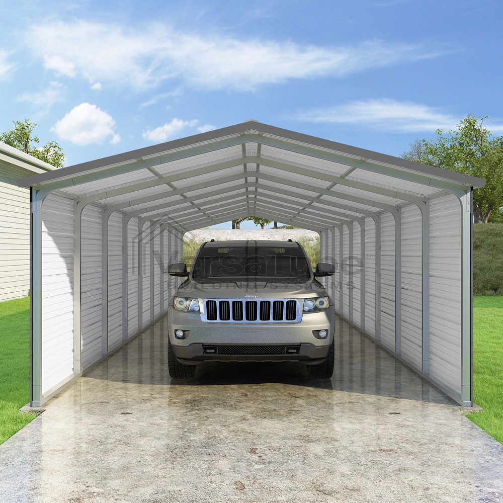 Pinnacle Series DIY carport kit features vertical sheet metal roof panels with ridge cap, gable and eave trim for an A-frame roof style and extended coverage on both ends.