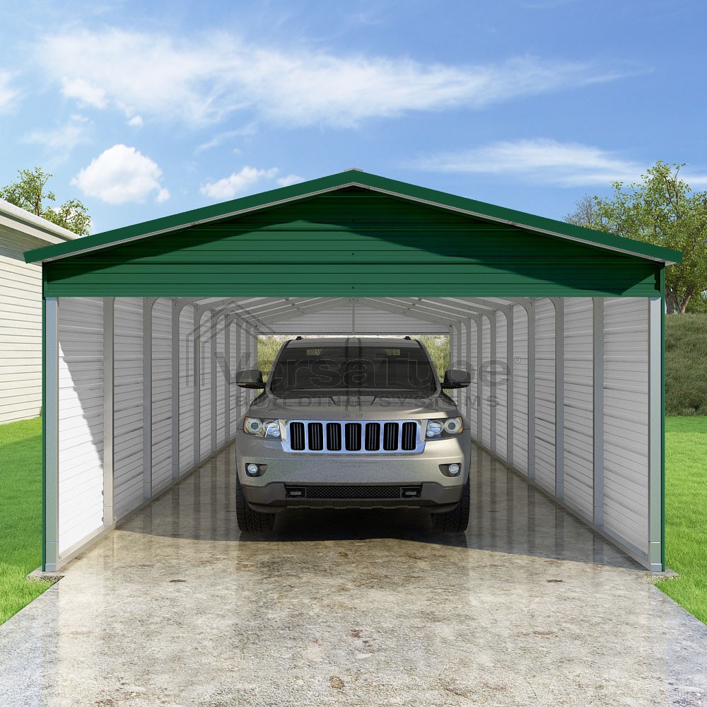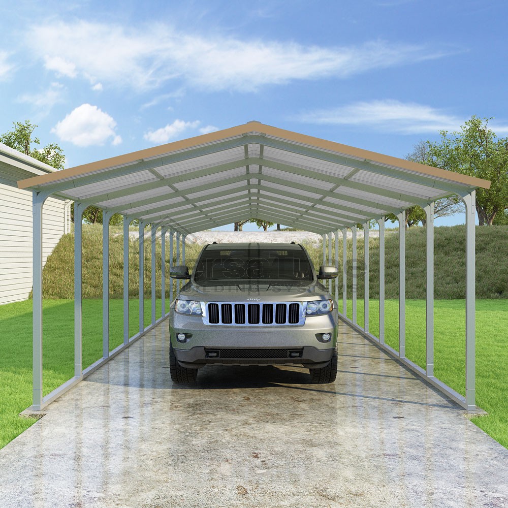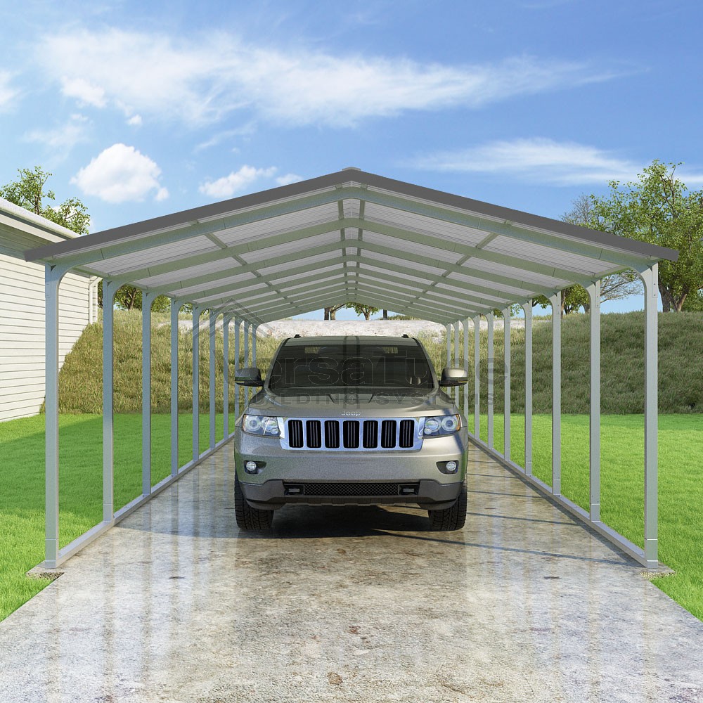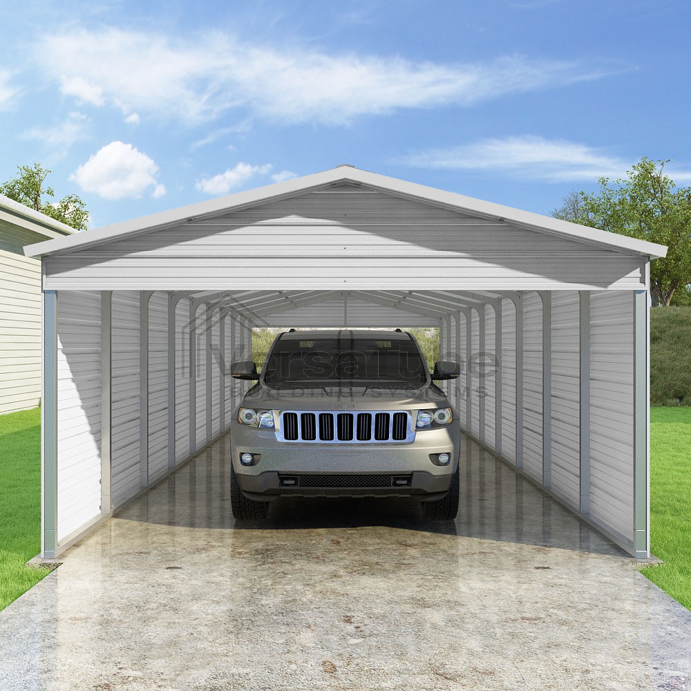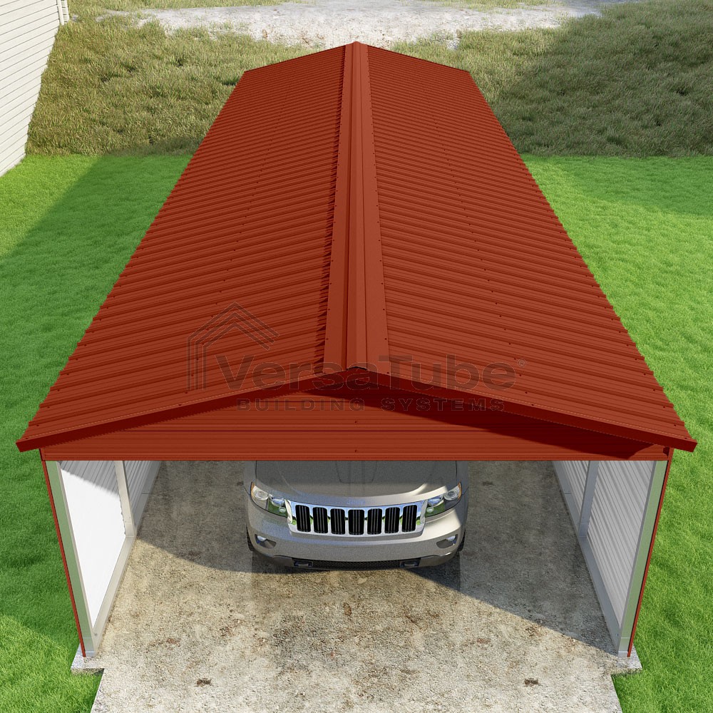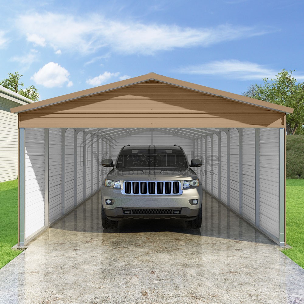 Pinnacle Series DIY carport kit features vertical sheet metal roof panels with ridge cap, gable and eave trim for an A-frame roof style and extended coverage on both ends.