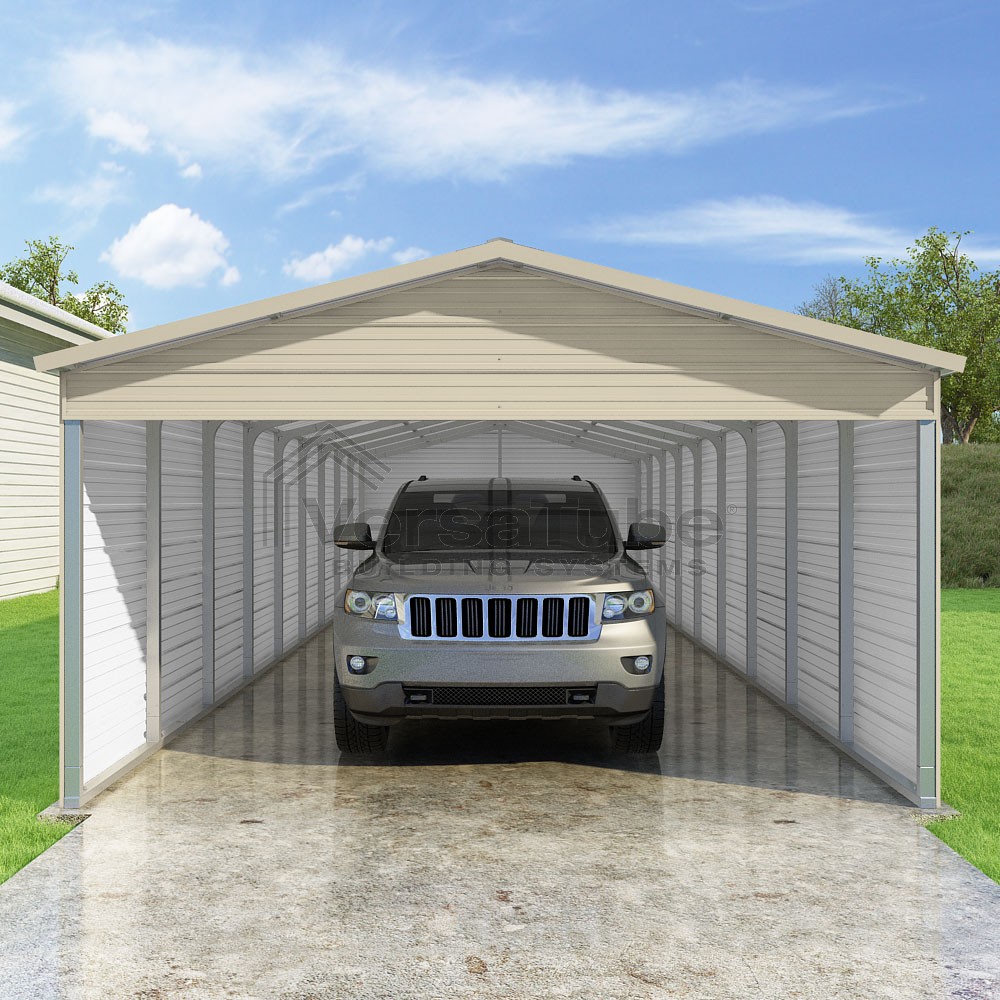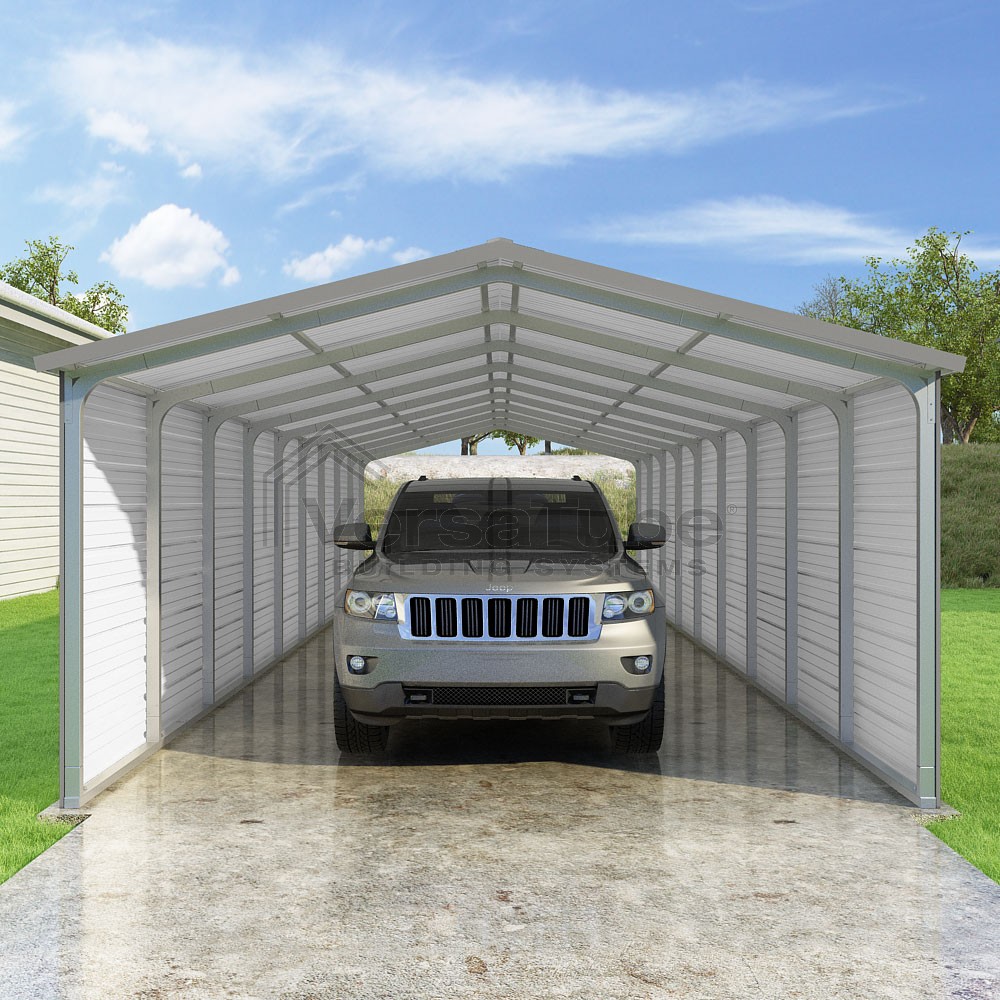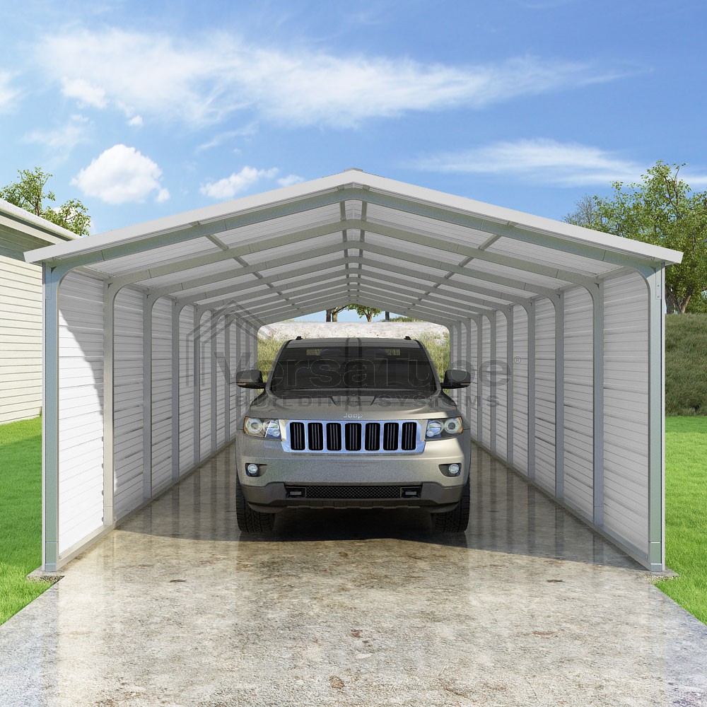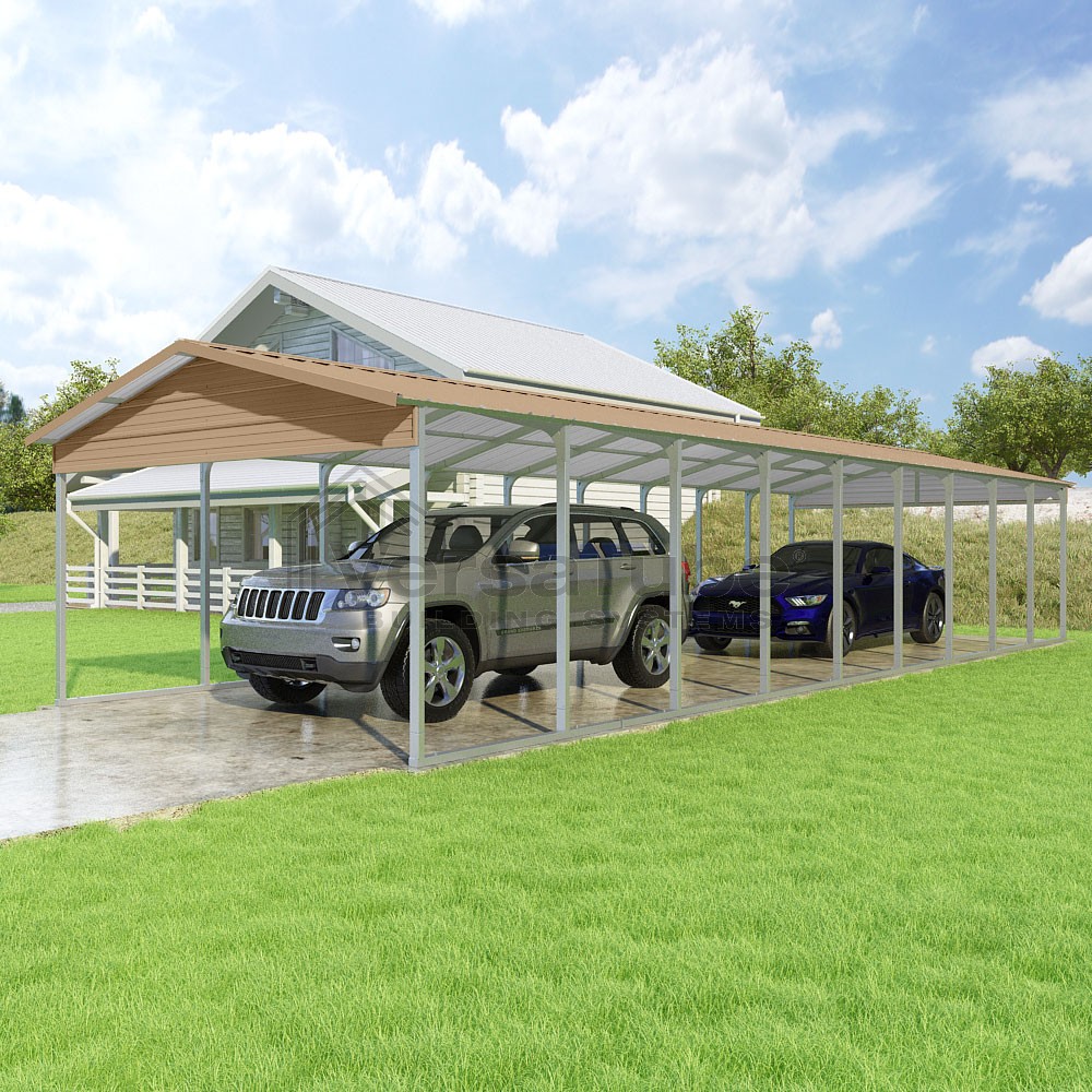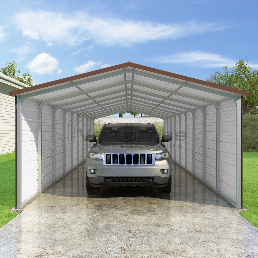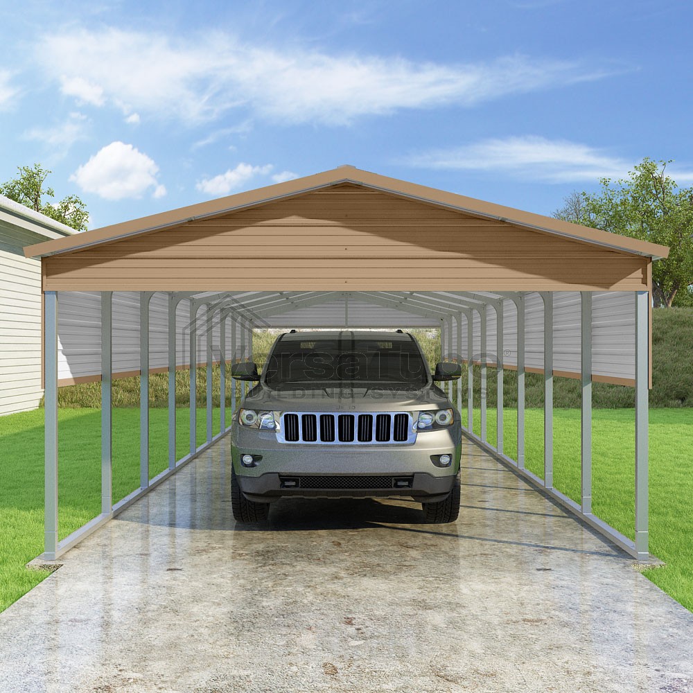 Pinnacle Series DIY carport kit features vertical sheet metal roof panels with ridge cap, gable and eave trim for an A-frame roof style and extended coverage on both ends.