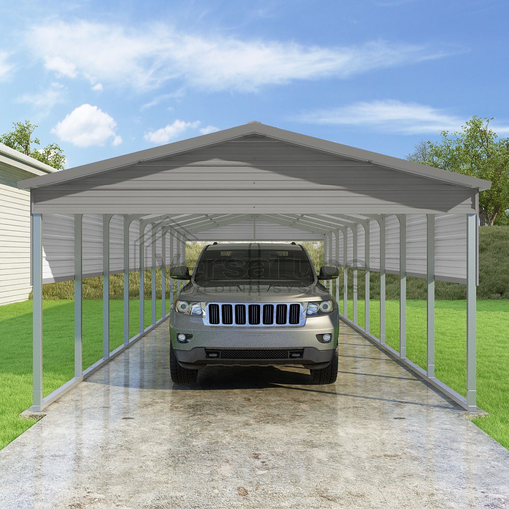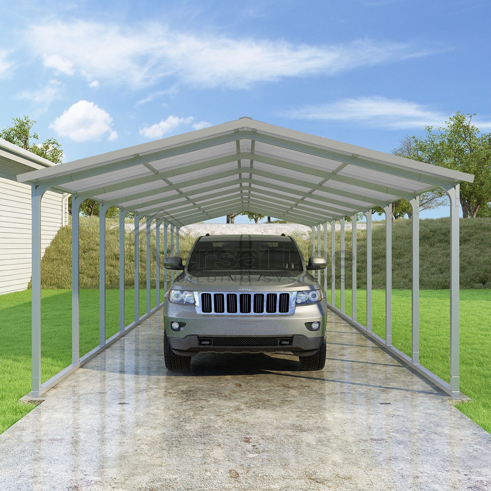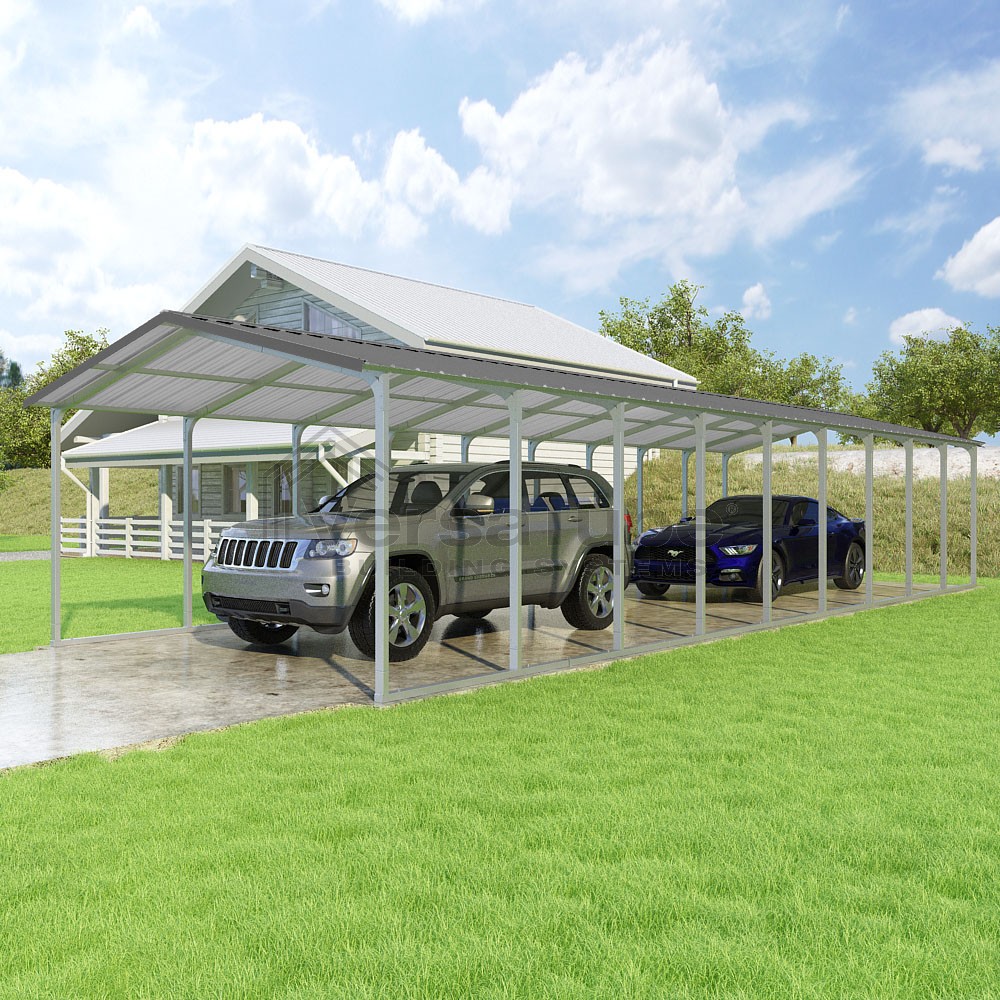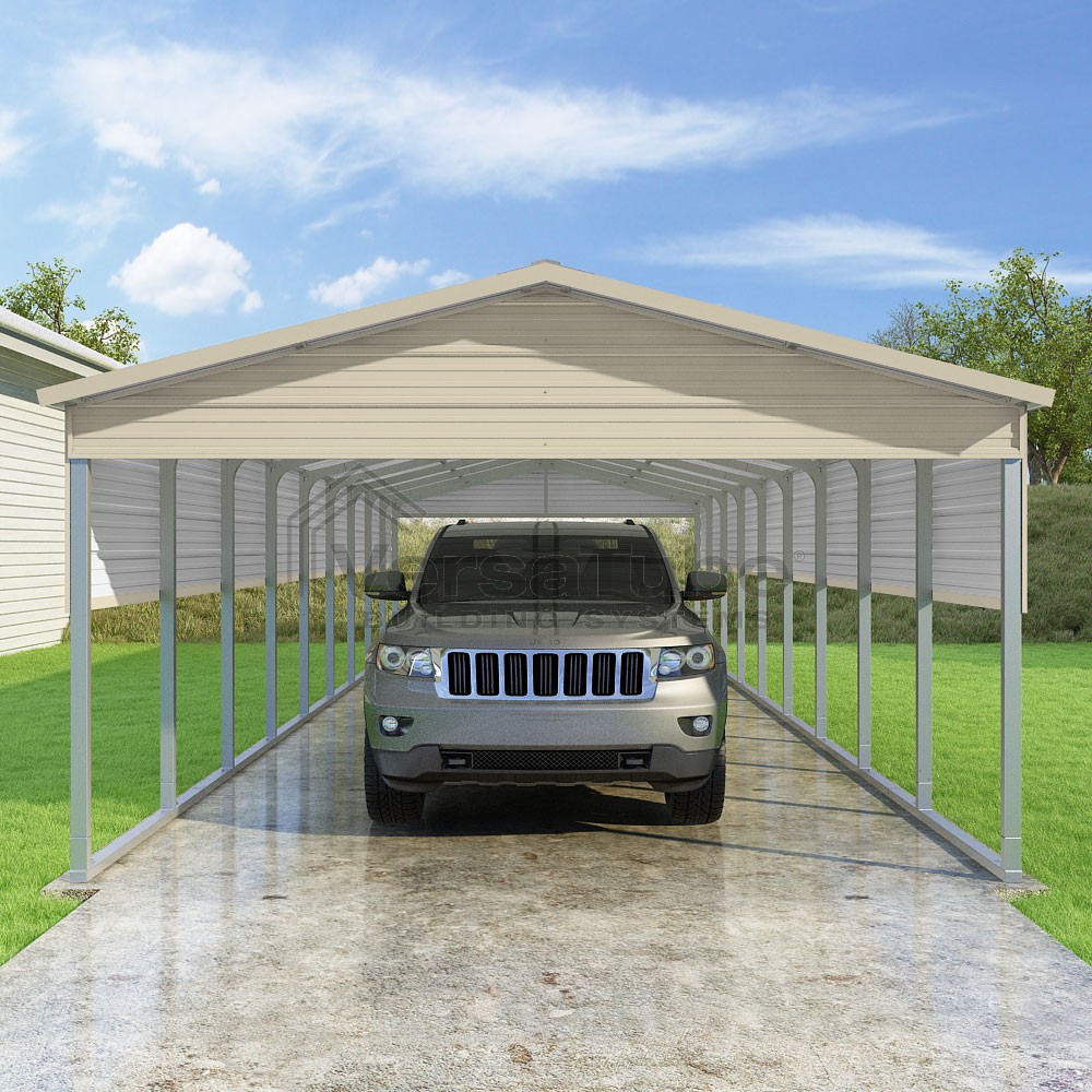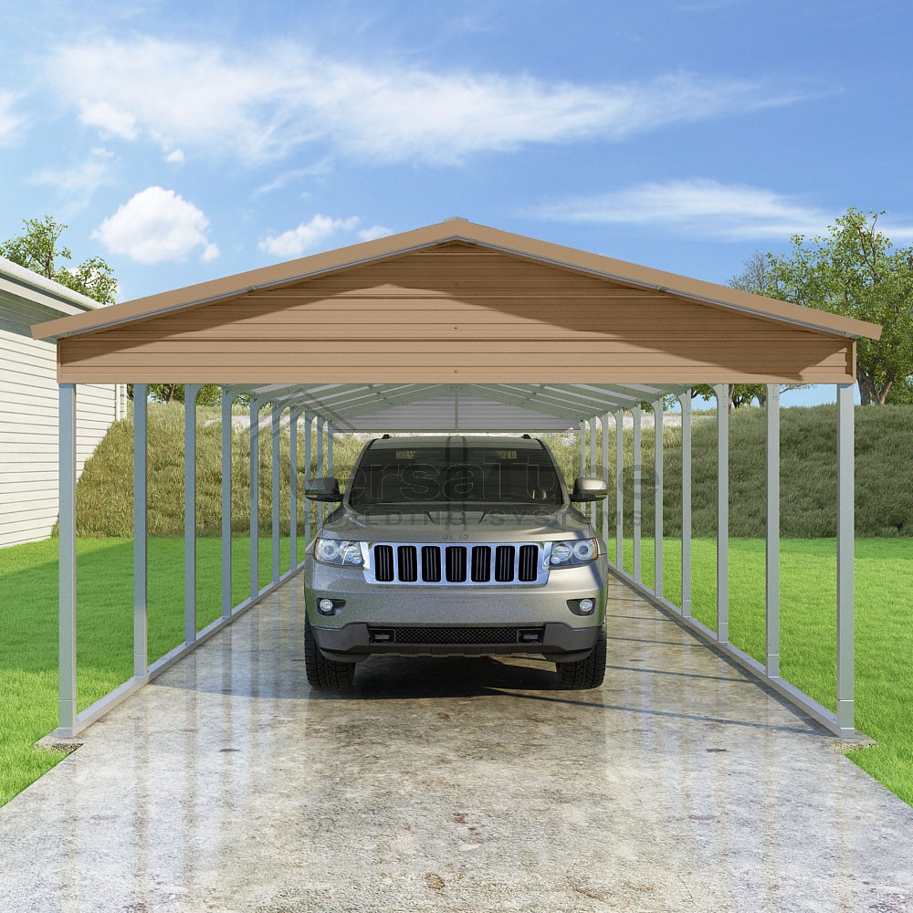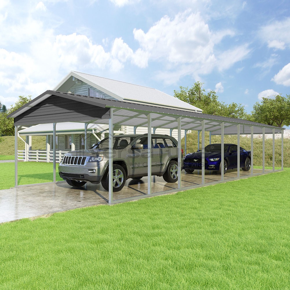 Pinnacle Series DIY carport kit features vertical sheet metal roof panels with ridge cap, gable and eave trim for an A-frame roof style and extended coverage on both ends.