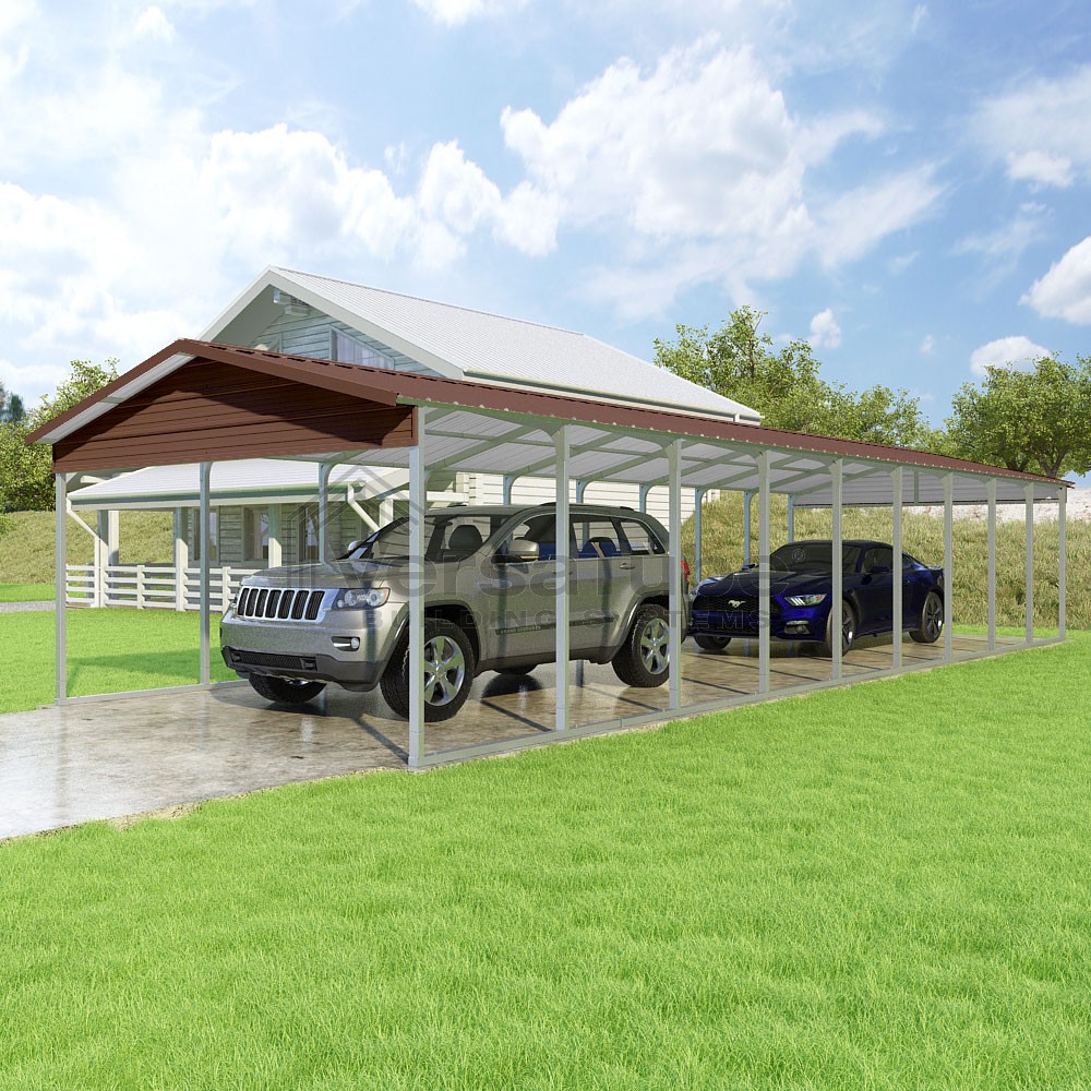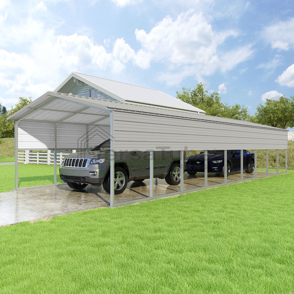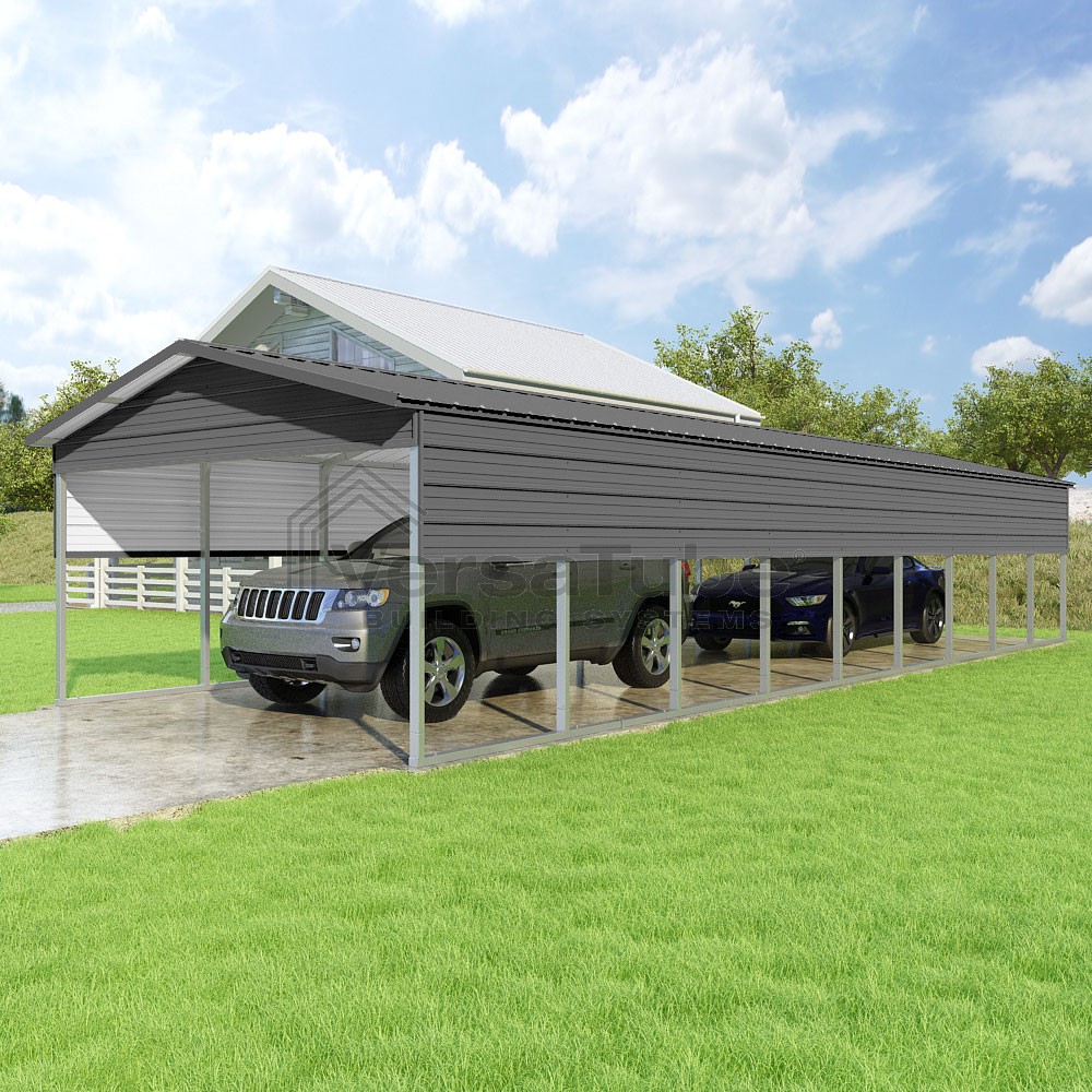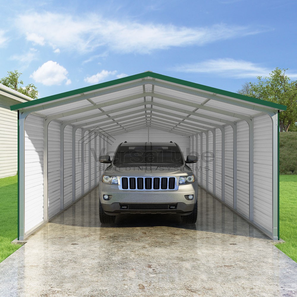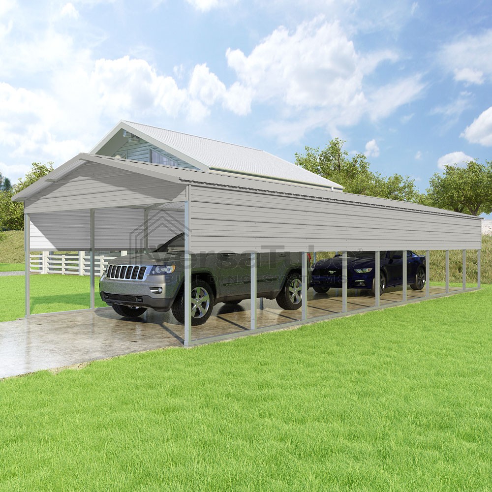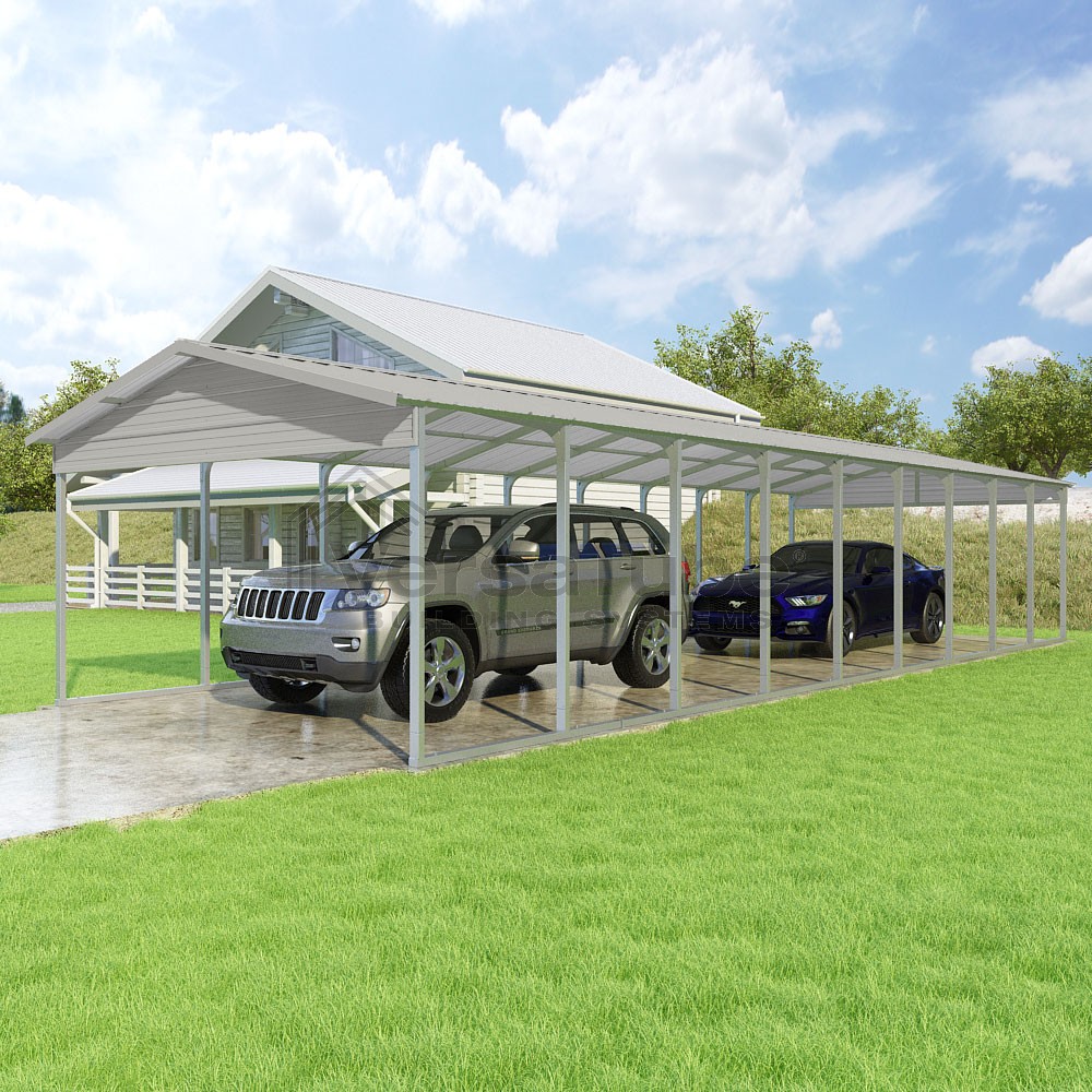 Pinnacle Series DIY carport kit features vertical sheet metal roof panels with ridge cap, gable and eave trim for an A-frame roof style and extended coverage on both ends.