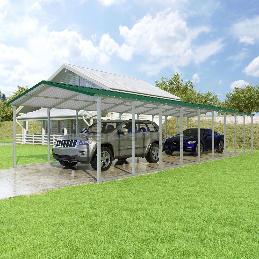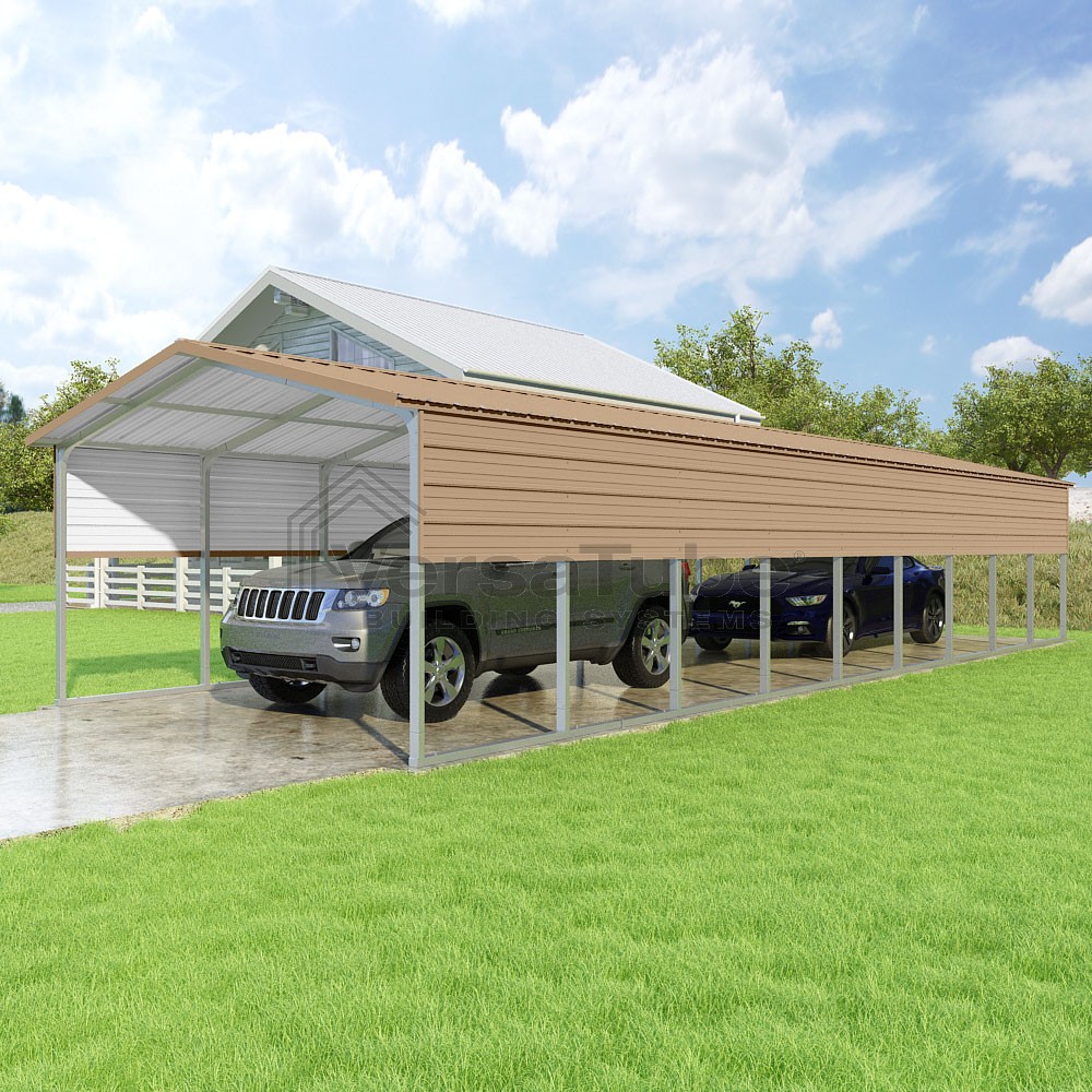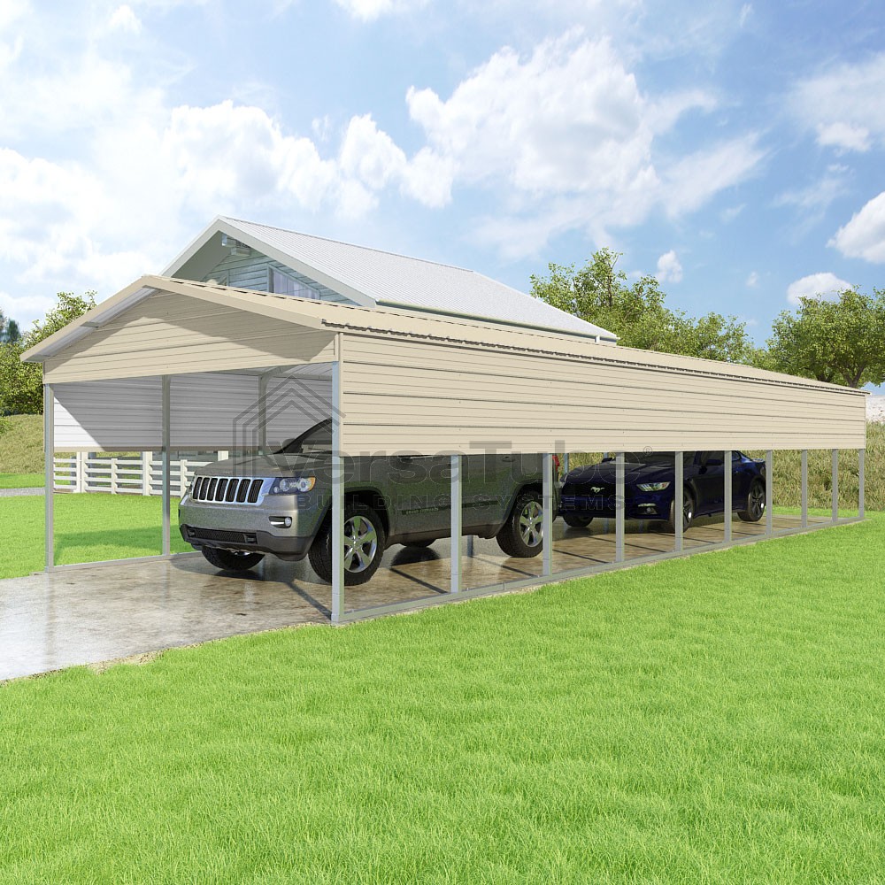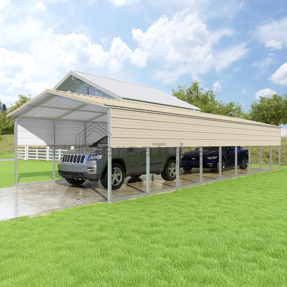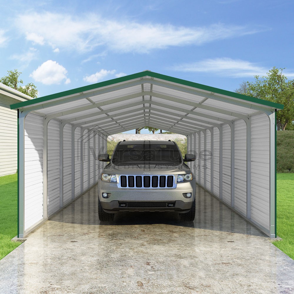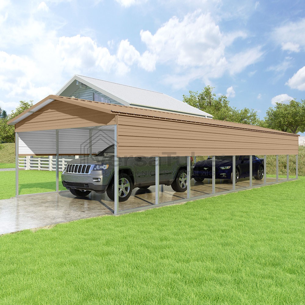Pinnacle Series DIY carport kit features vertical sheet metal roof panels with ridge cap, gable and eave trim for an A-frame roof style and extended coverage on both ends.