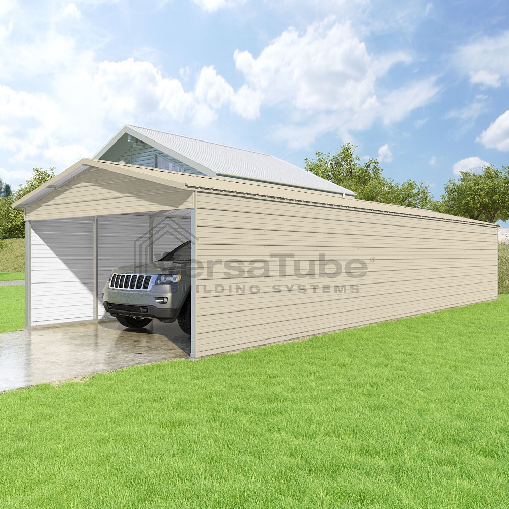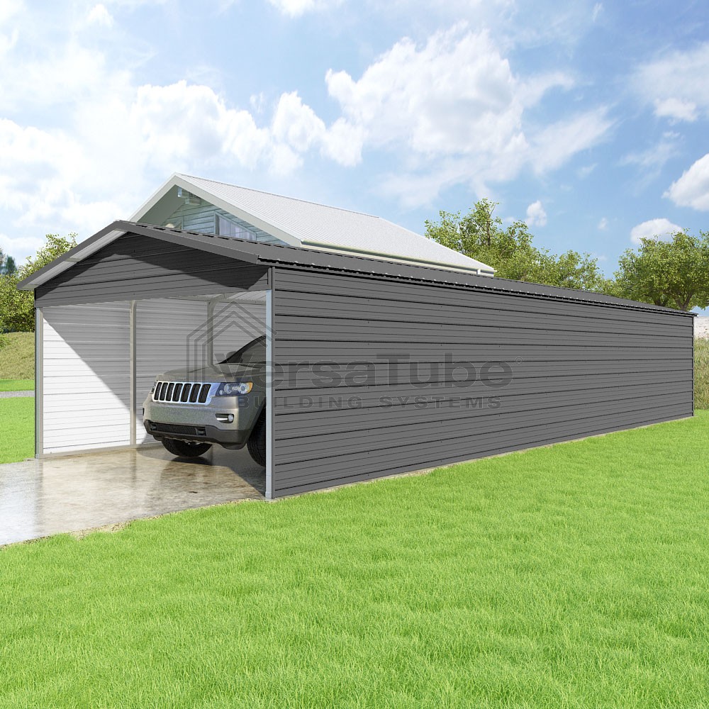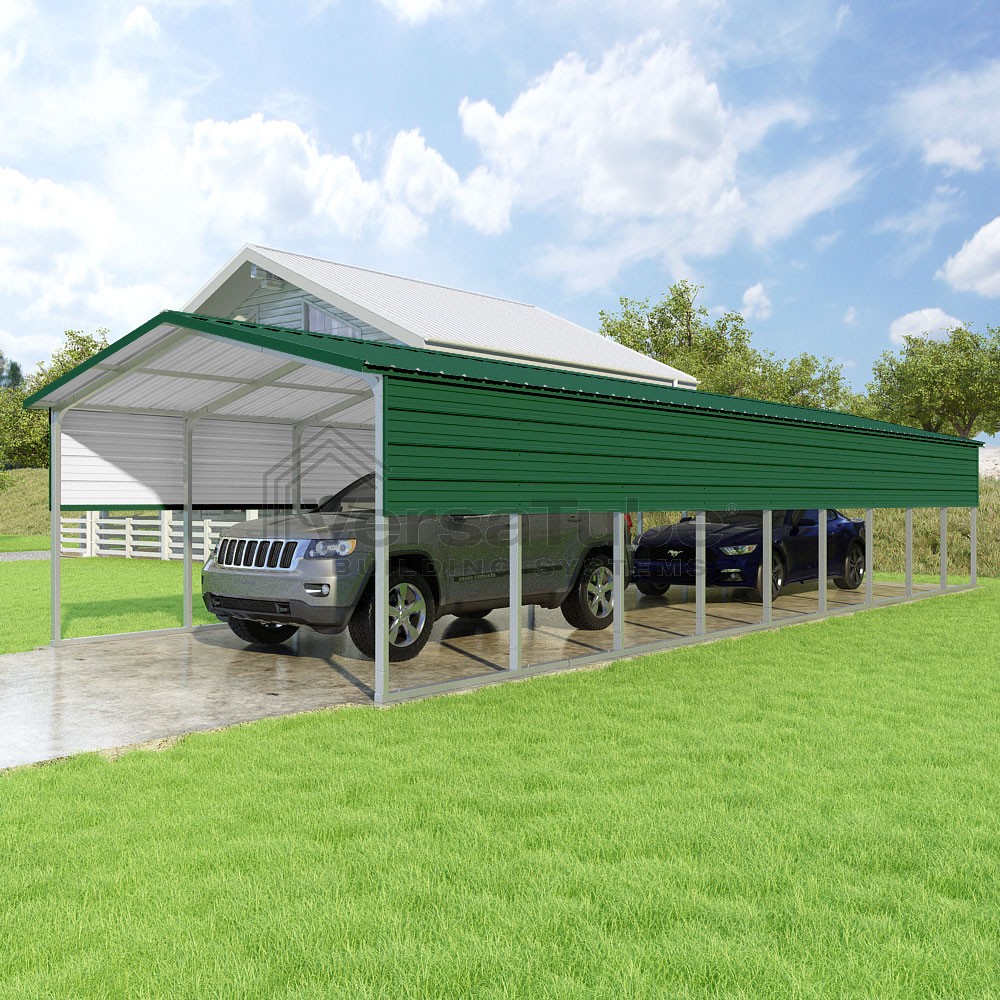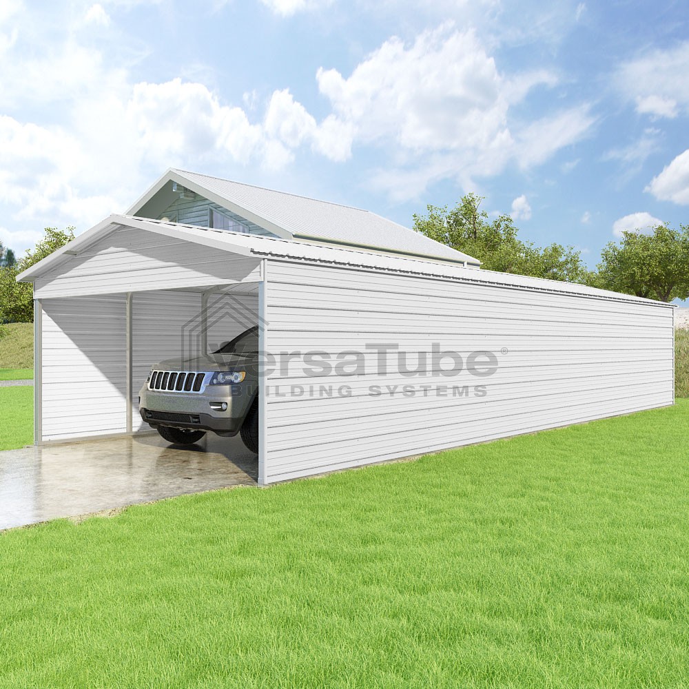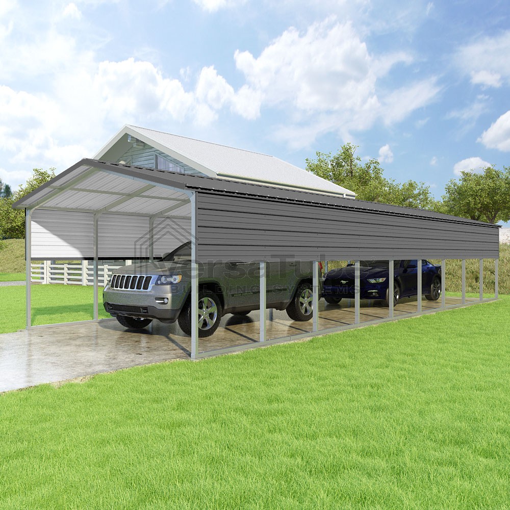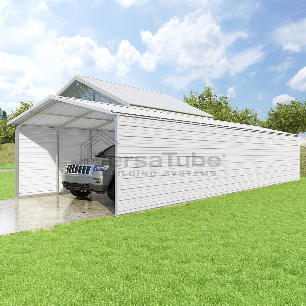 Pinnacle Series DIY carport kit features vertical sheet metal roof panels with ridge cap, gable and eave trim for an A-frame roof style and extended coverage on both ends.