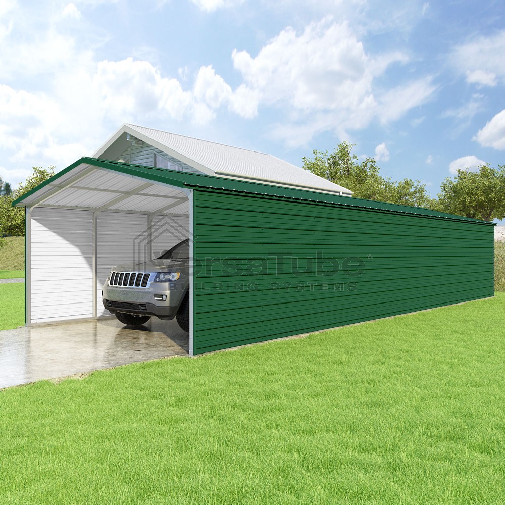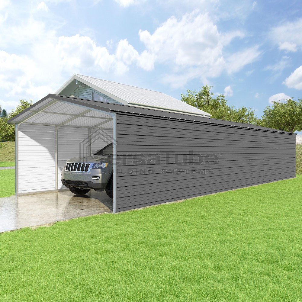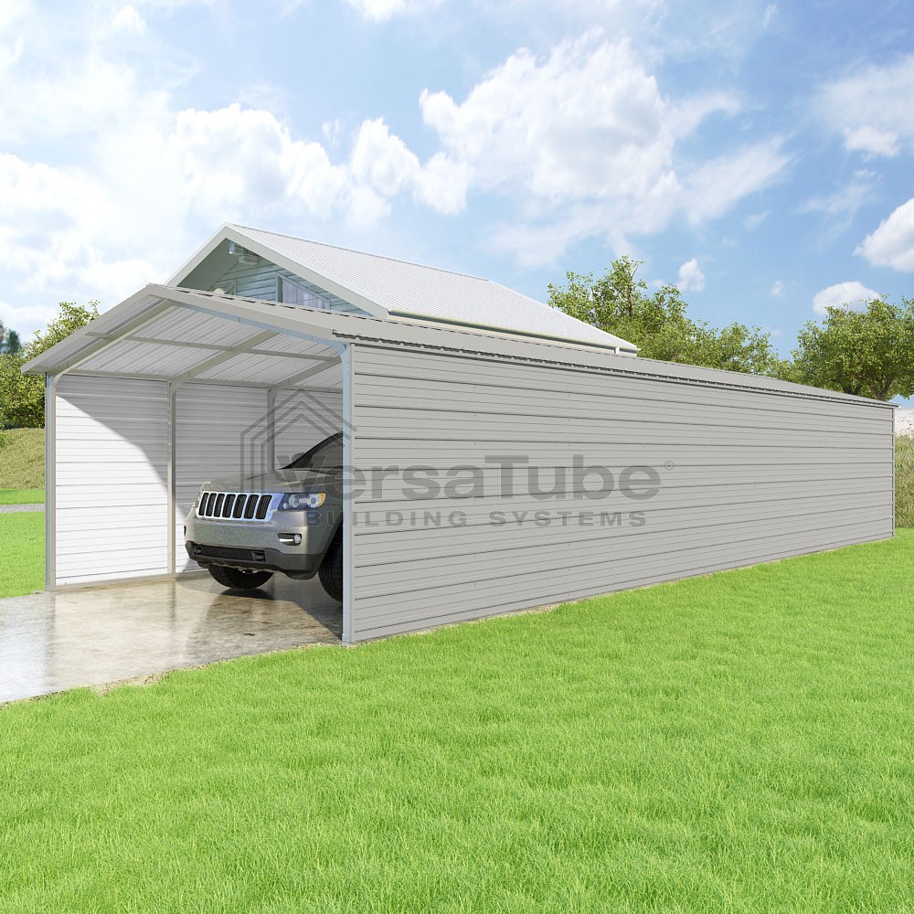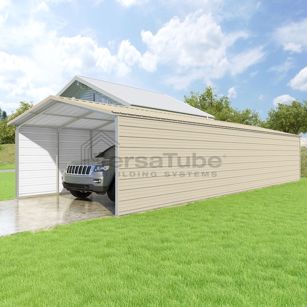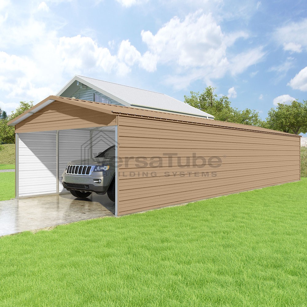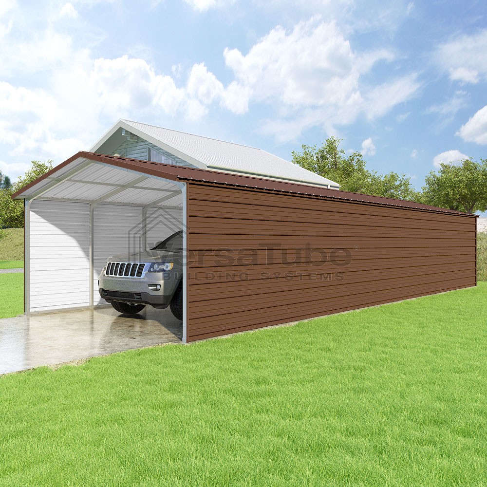 Pinnacle Series DIY carport kit features vertical sheet metal roof panels with ridge cap, gable and eave trim for an A-frame roof style and extended coverage on both ends.