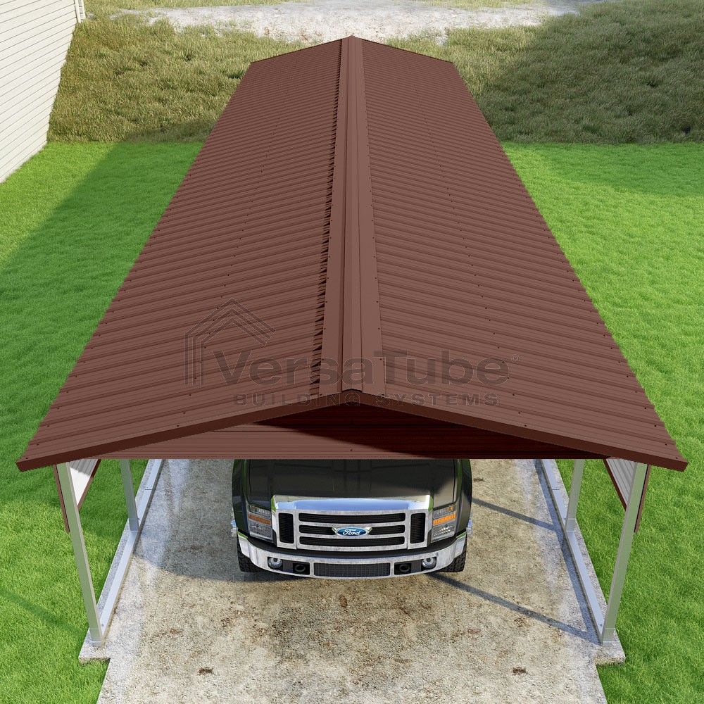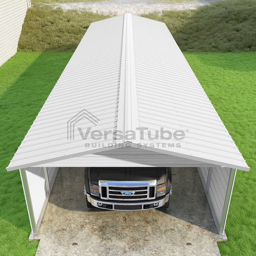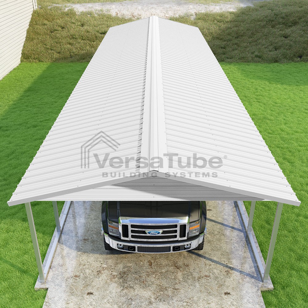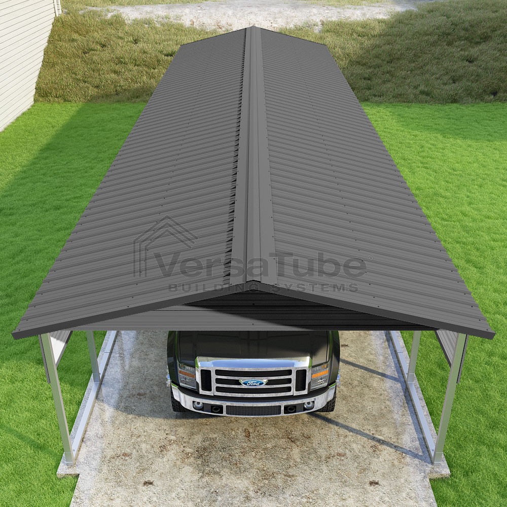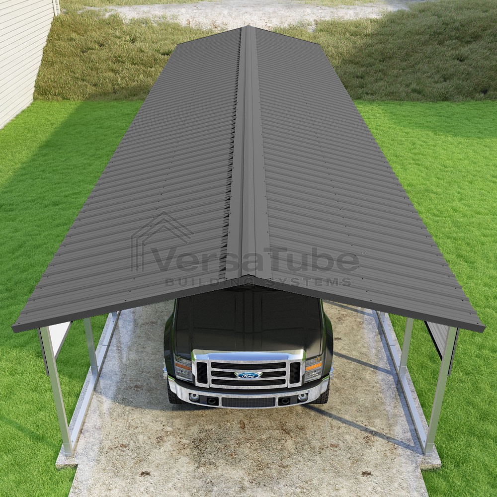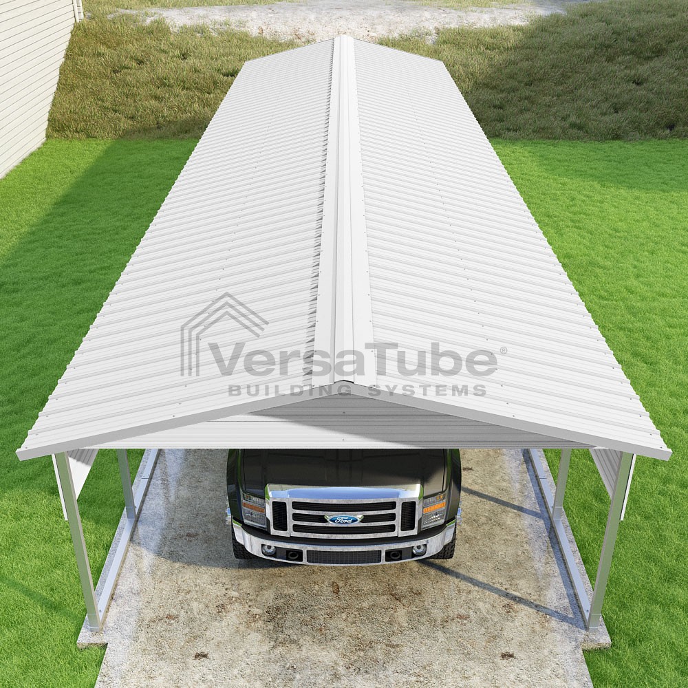 Pinnacle Series DIY carport kit features vertical sheet metal roof panels with ridge cap, gable and eave trim for an A-frame roof style and extended coverage on both ends.