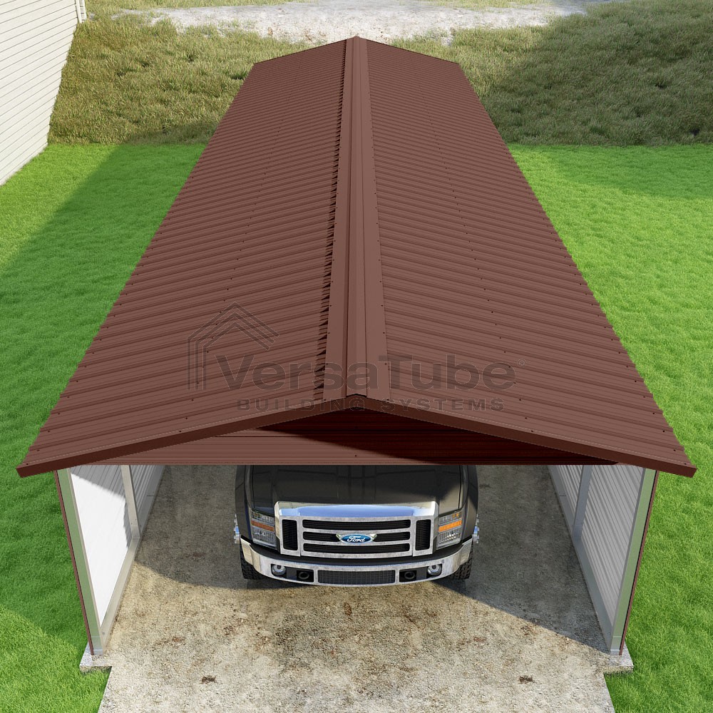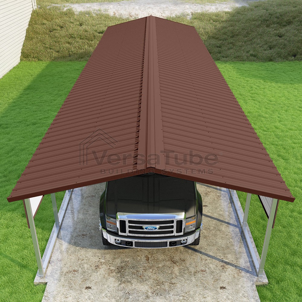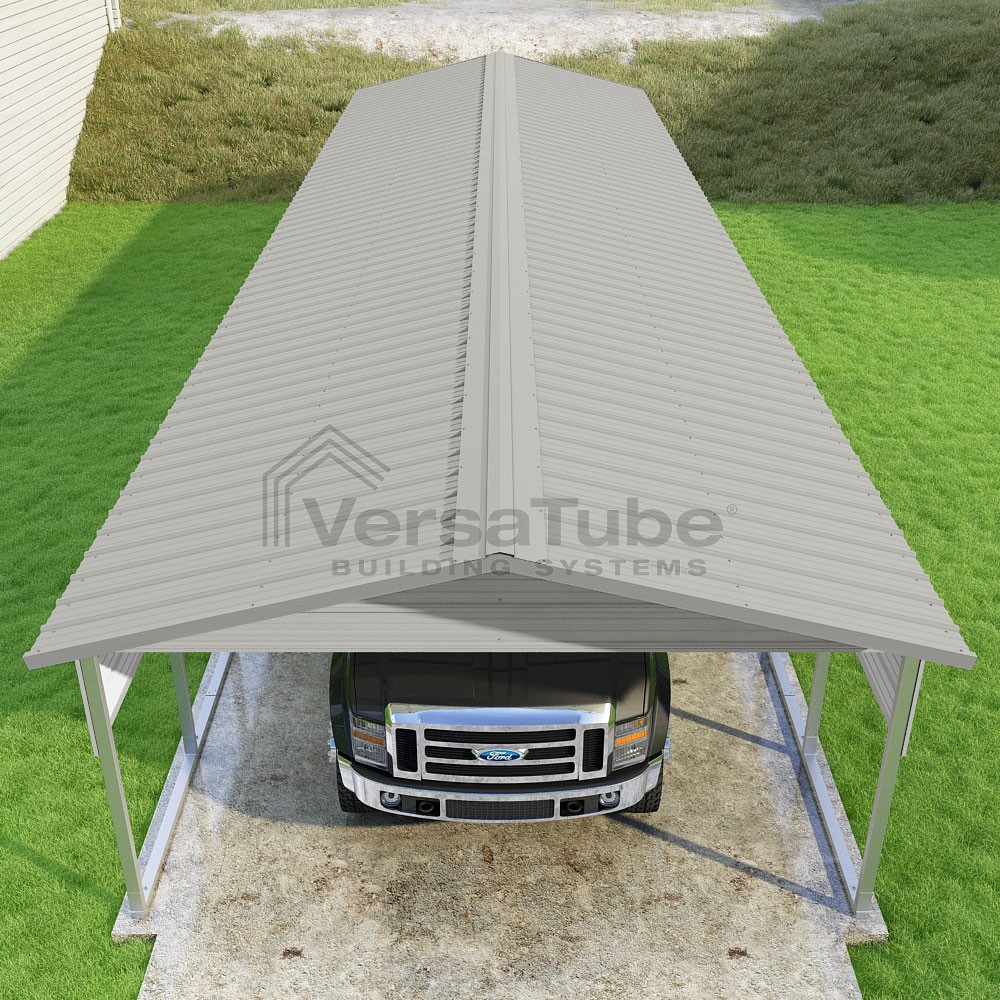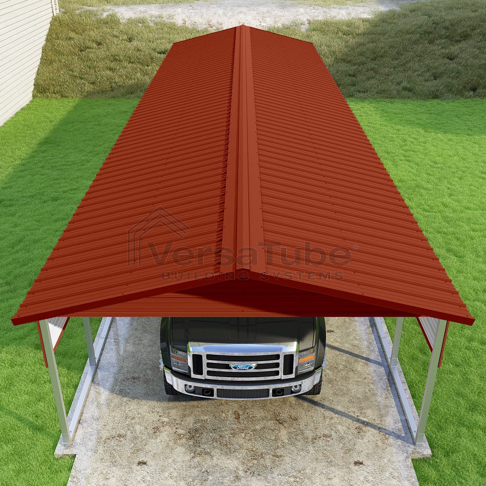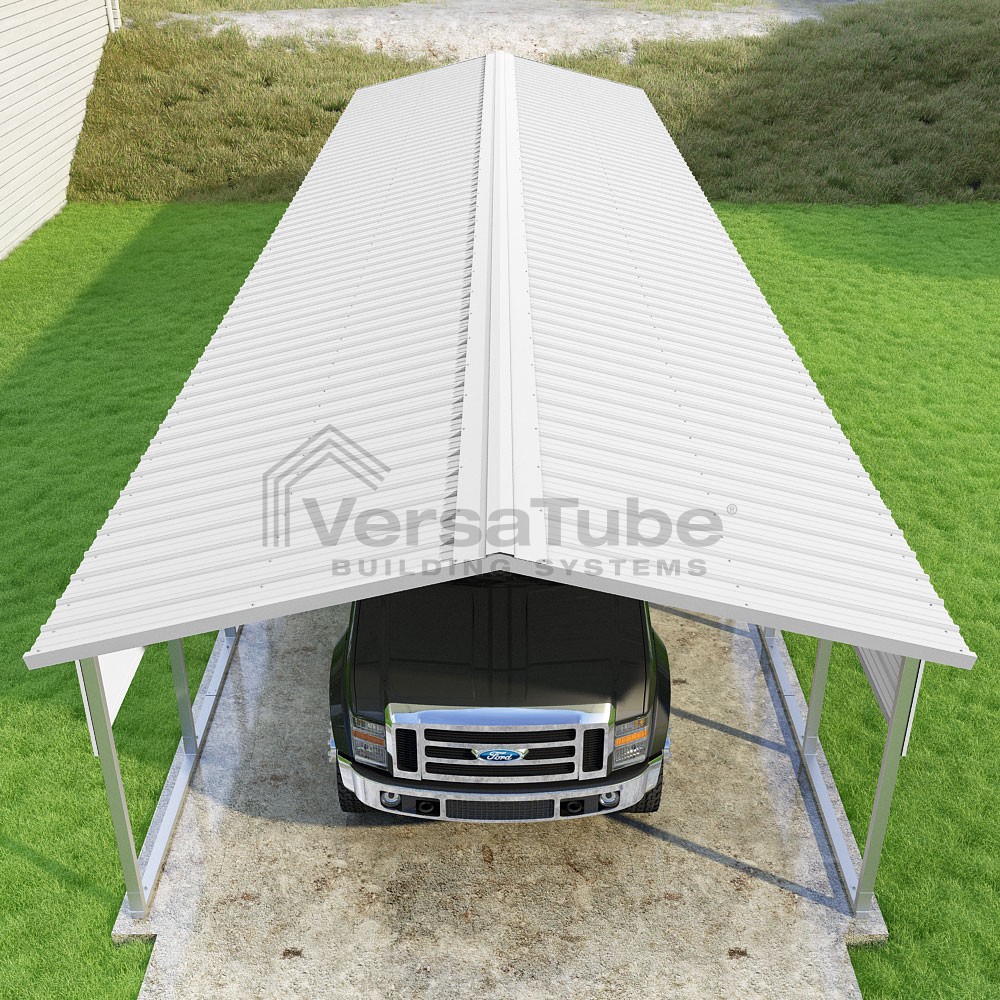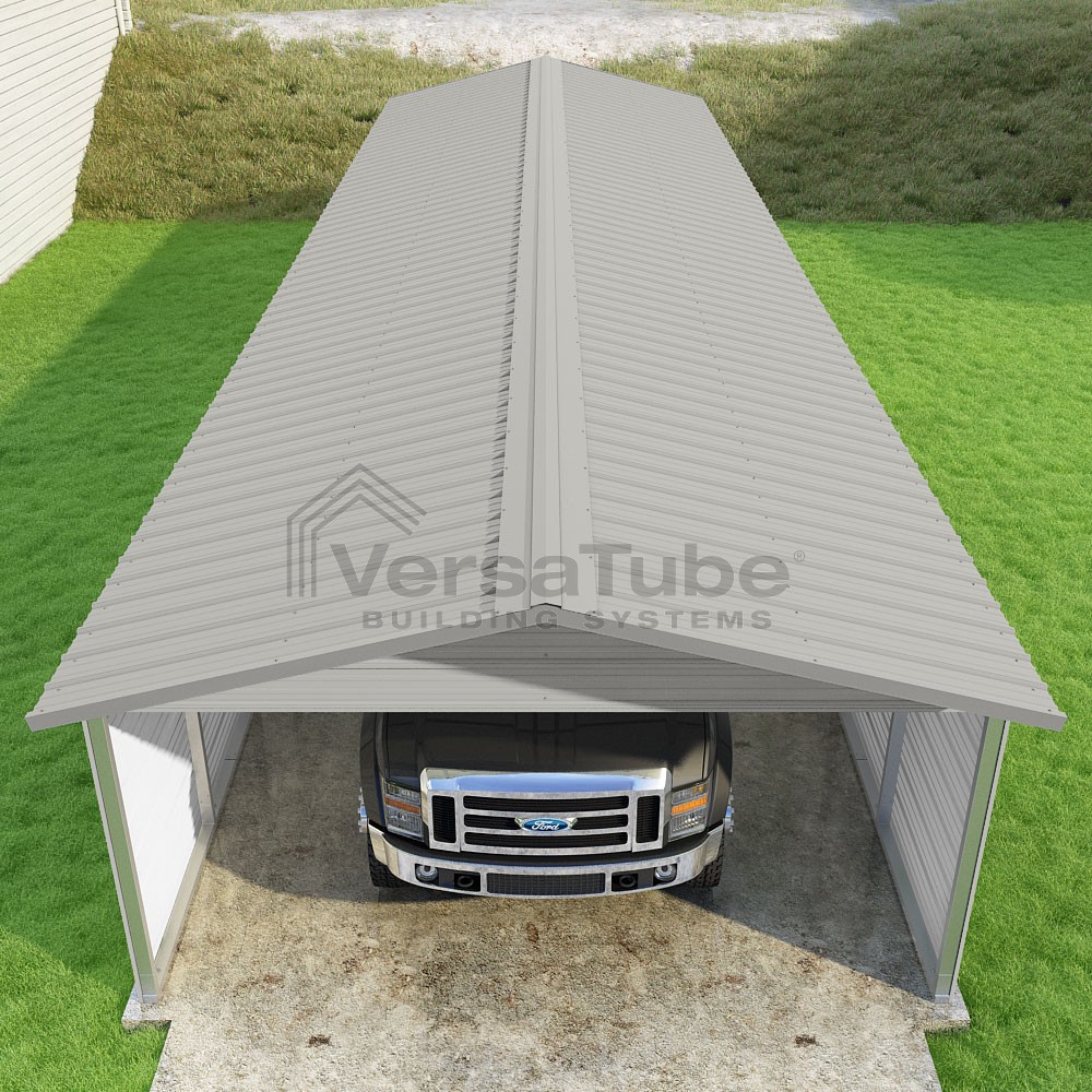 Pinnacle Series DIY carport kit features vertical sheet metal roof panels with ridge cap, gable and eave trim for an A-frame roof style and extended coverage on both ends.
