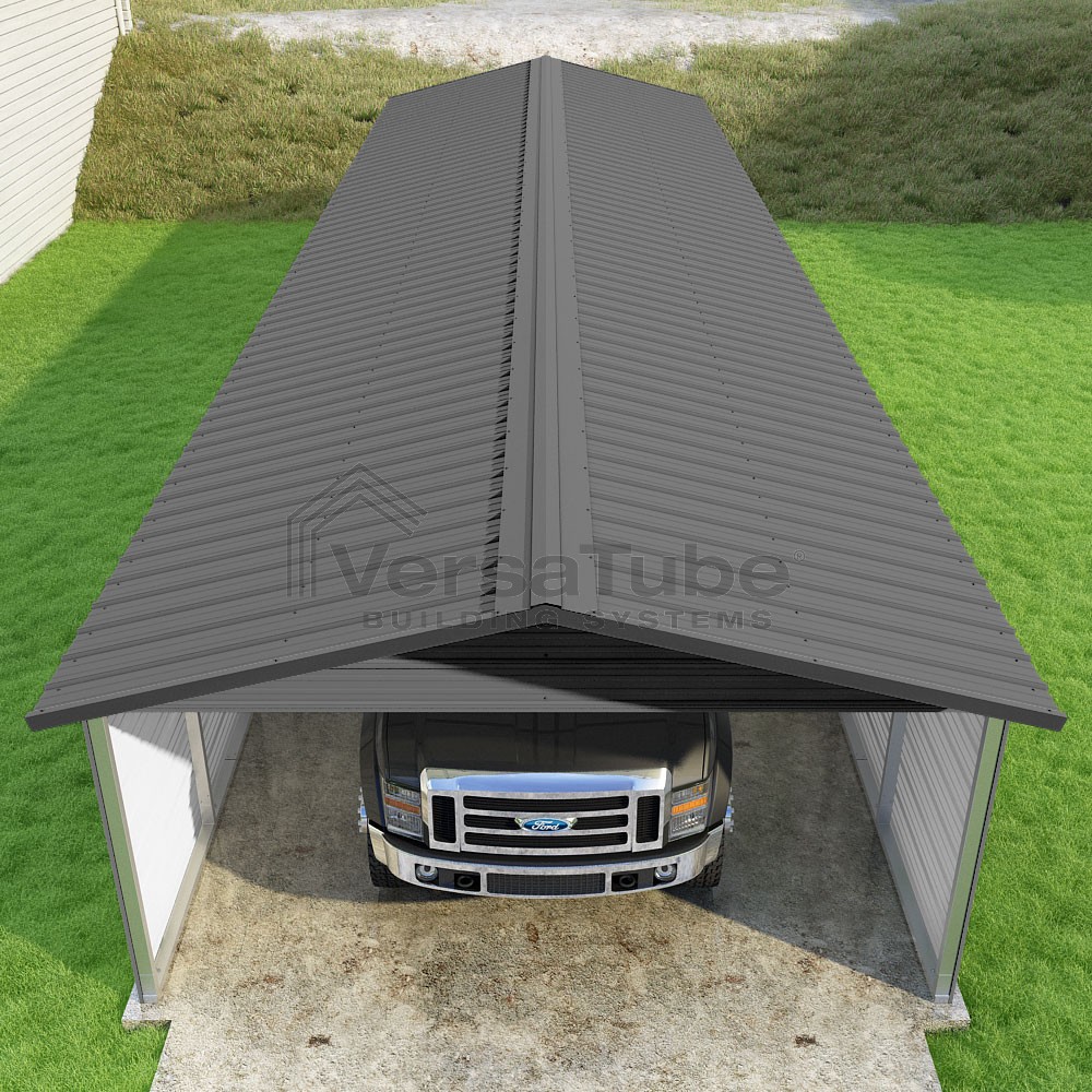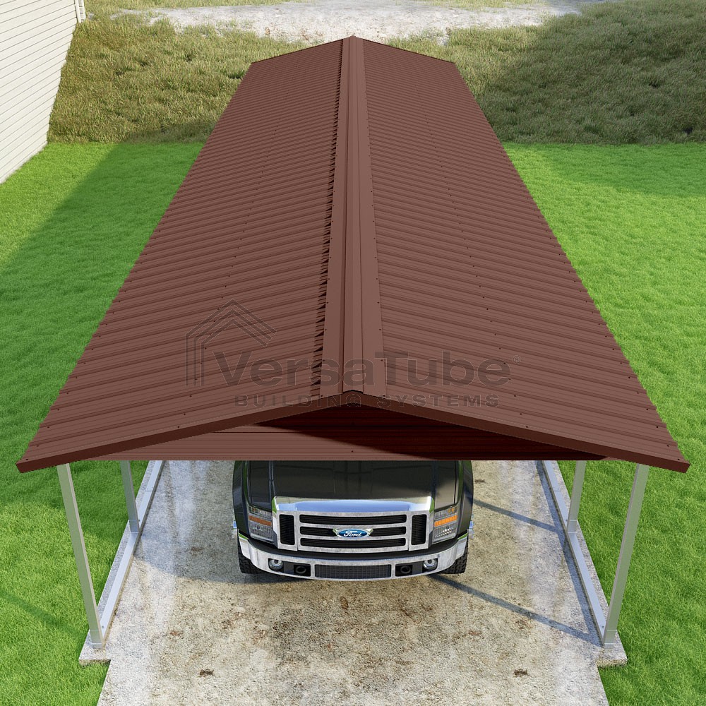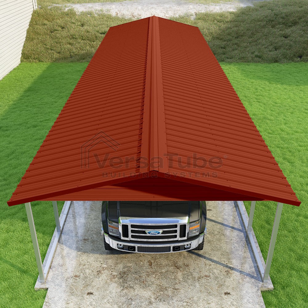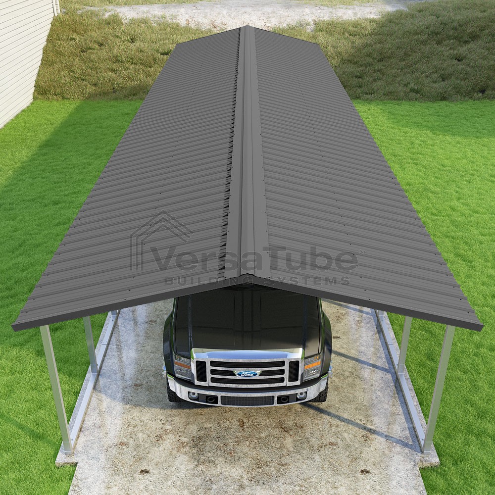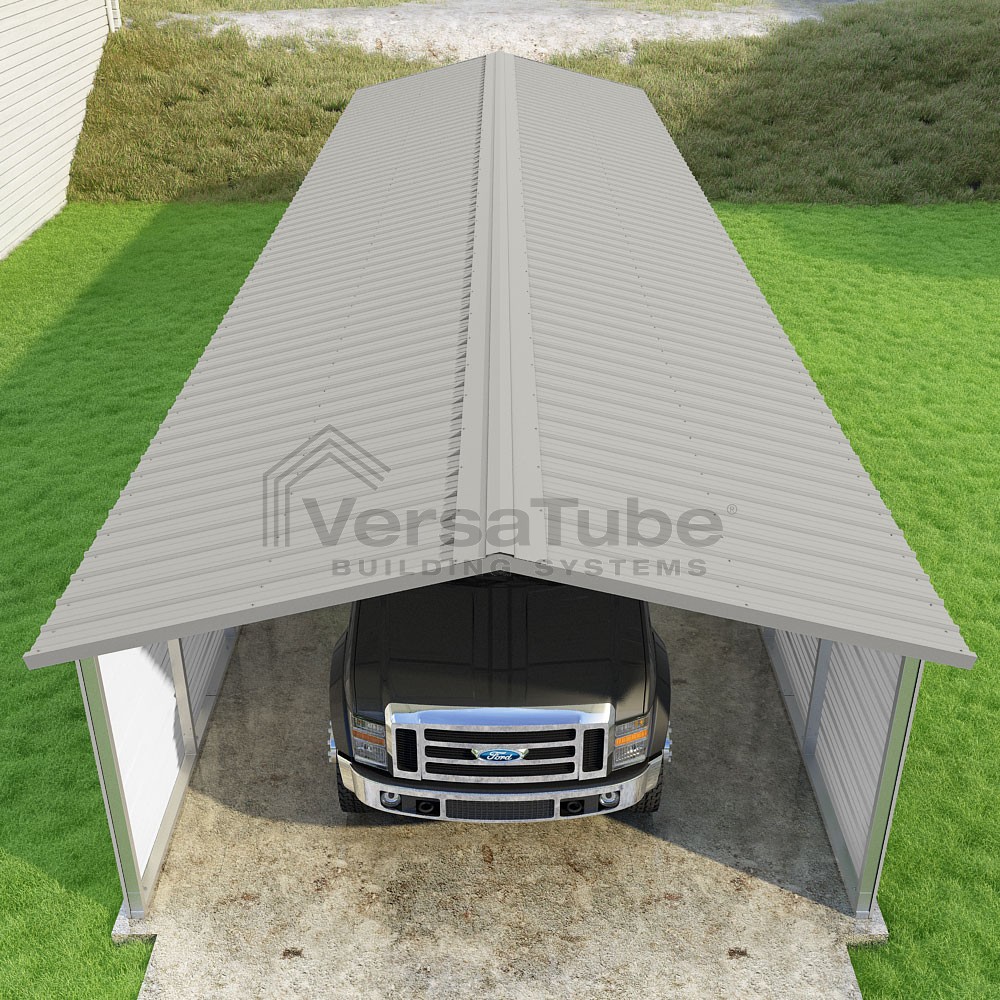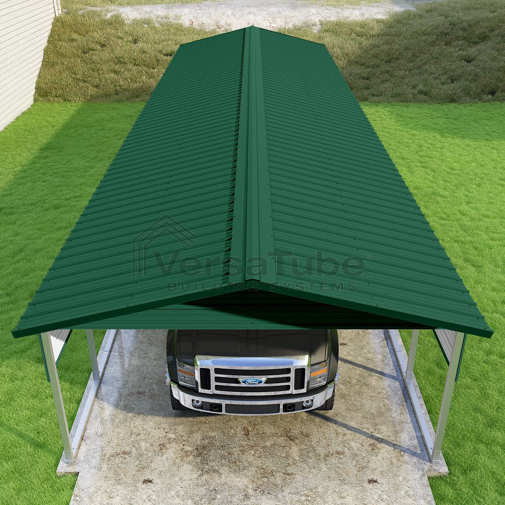 Pinnacle Series DIY carport kit features vertical sheet metal roof panels with ridge cap, gable and eave trim for an A-frame roof style and extended coverage on both ends.