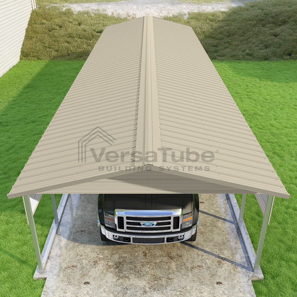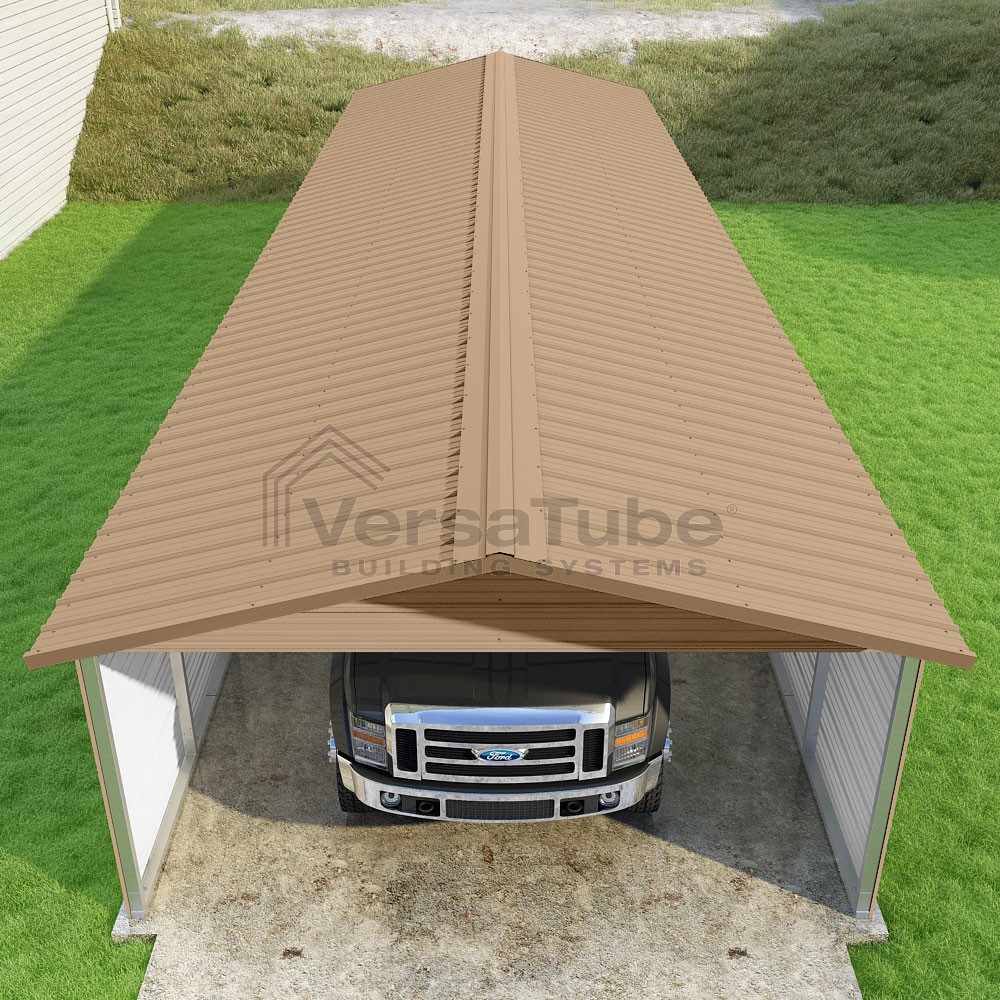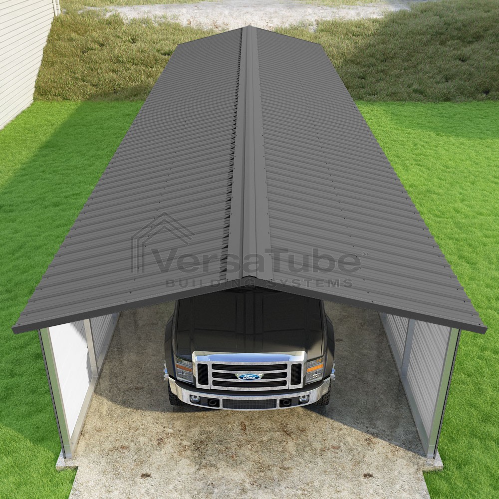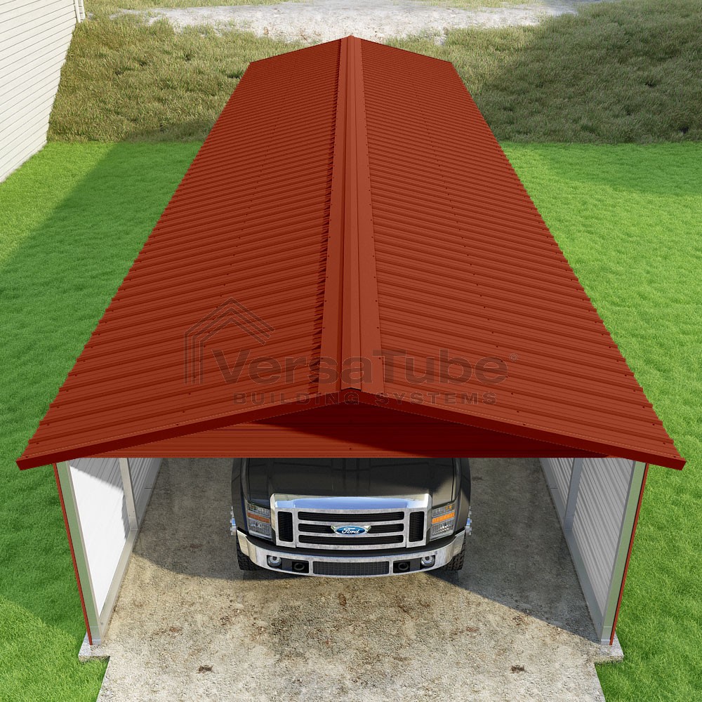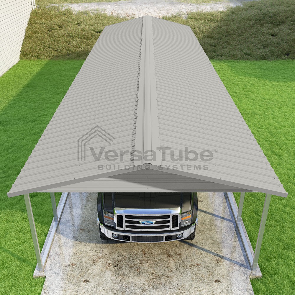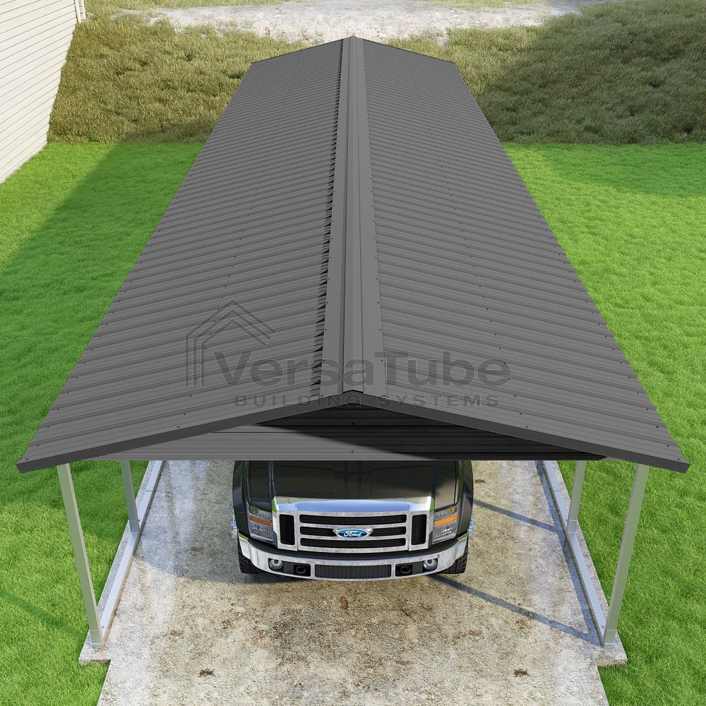 Pinnacle Series DIY carport kit features vertical sheet metal roof panels with ridge cap, gable and eave trim for an A-frame roof style and extended coverage on both ends.