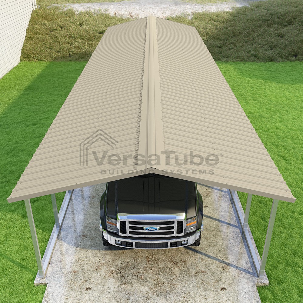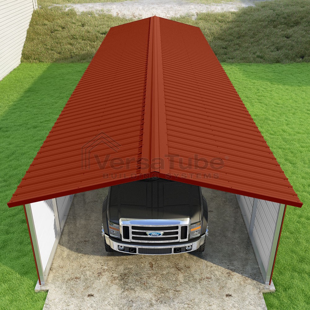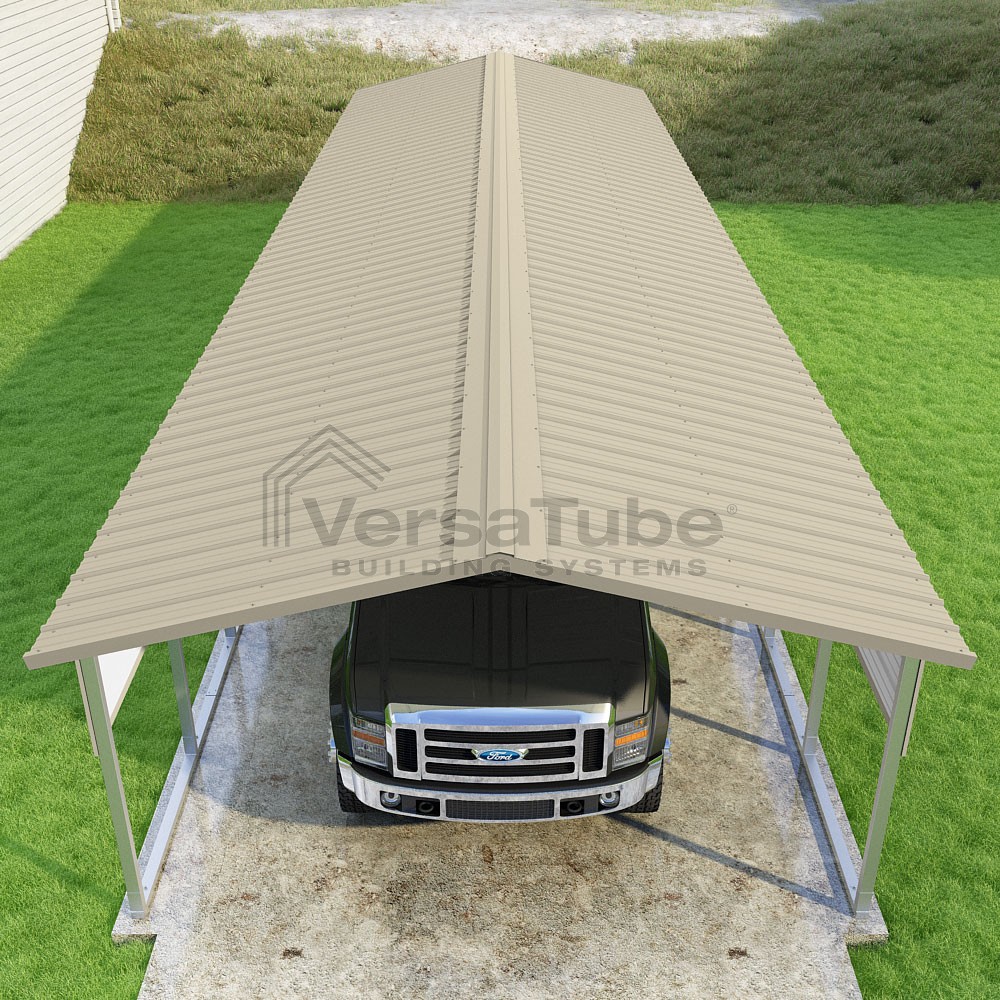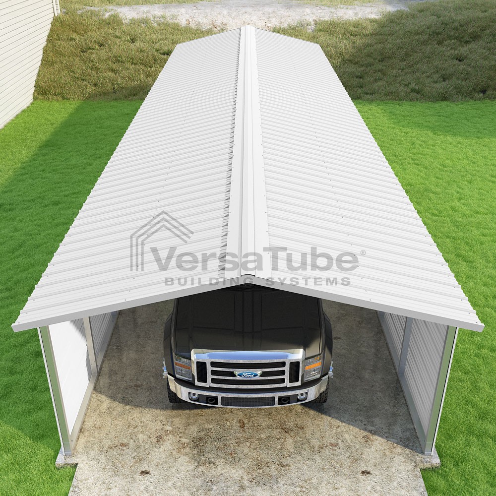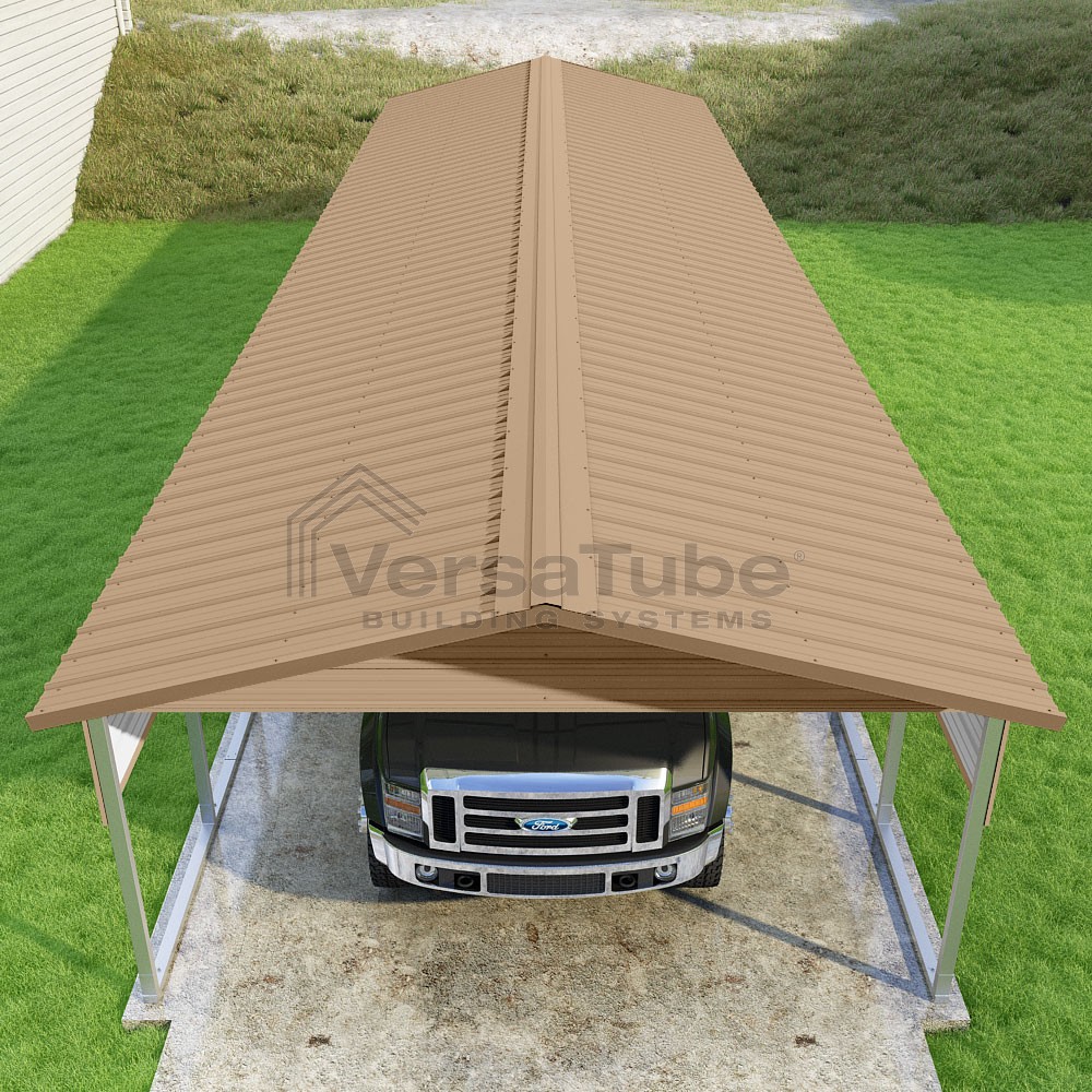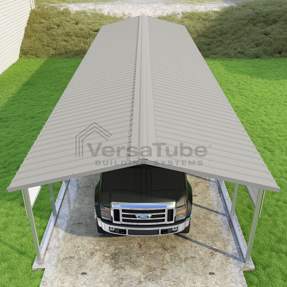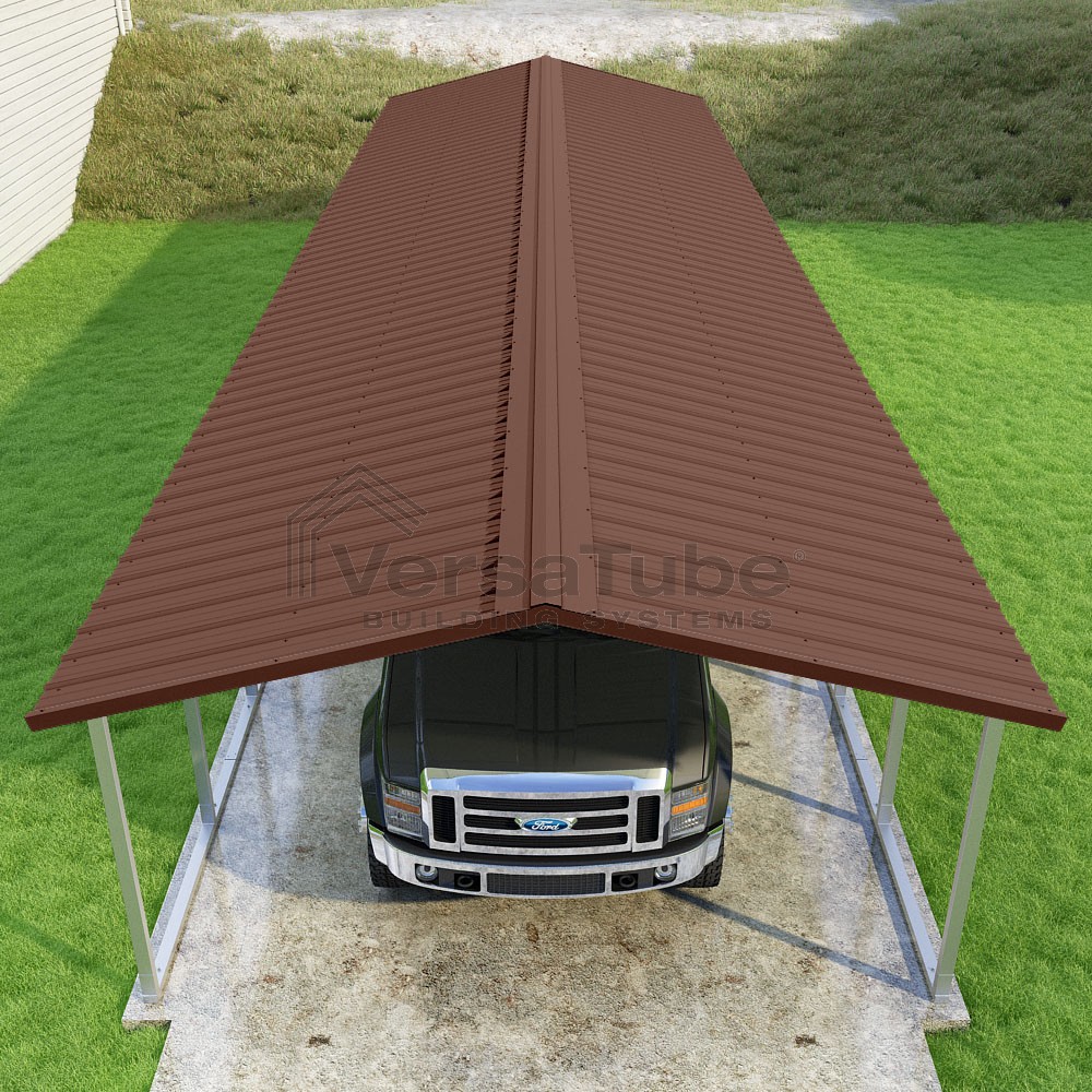 Pinnacle Series DIY carport kit features vertical sheet metal roof panels with ridge cap, gable and eave trim for an A-frame roof style and extended coverage on both ends.