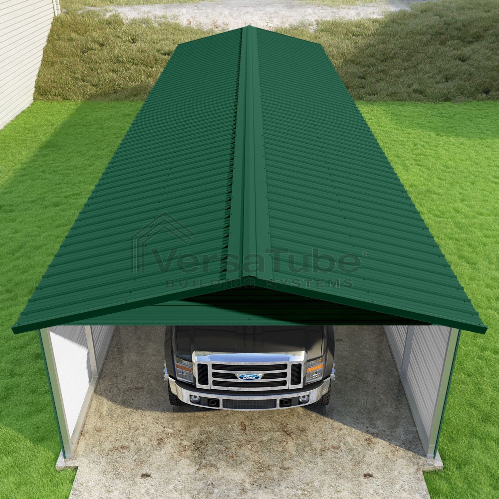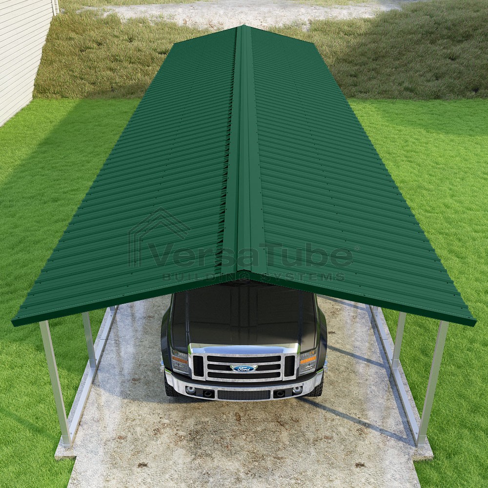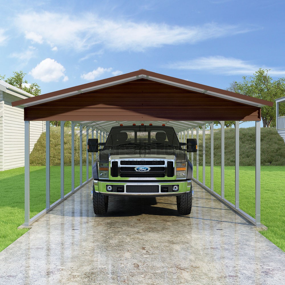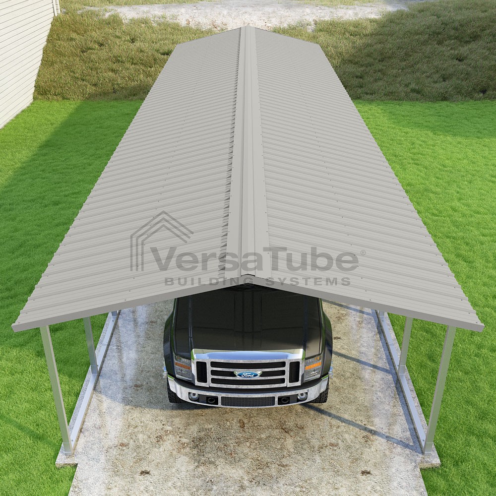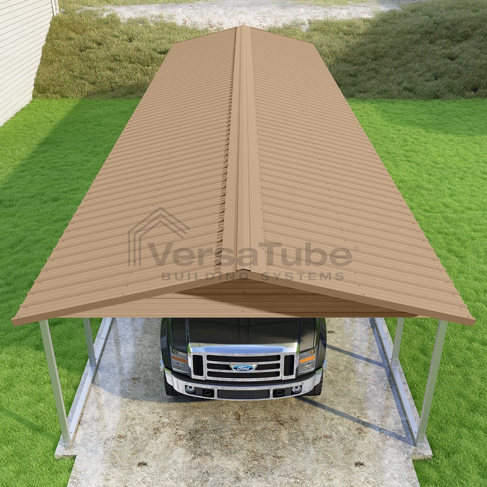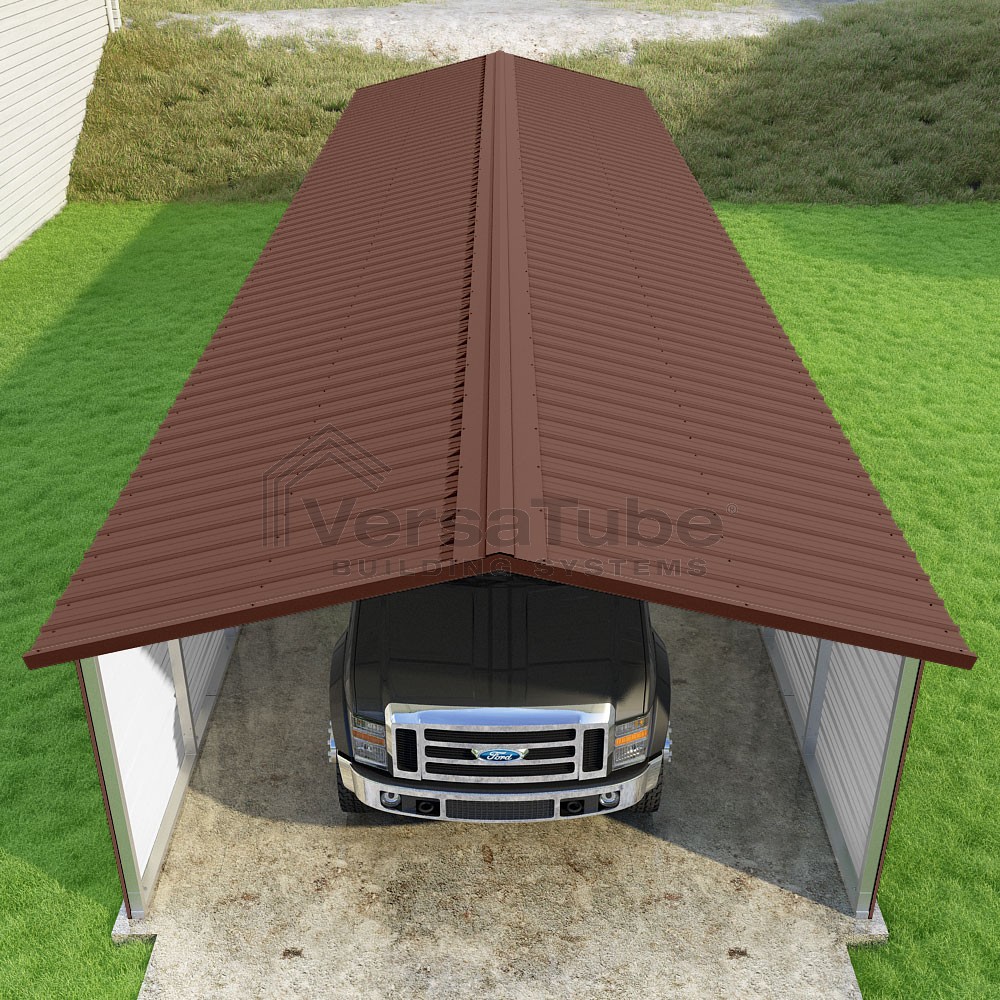 Pinnacle Series DIY carport kit features vertical sheet metal roof panels with ridge cap, gable and eave trim for an A-frame roof style and extended coverage on both ends.